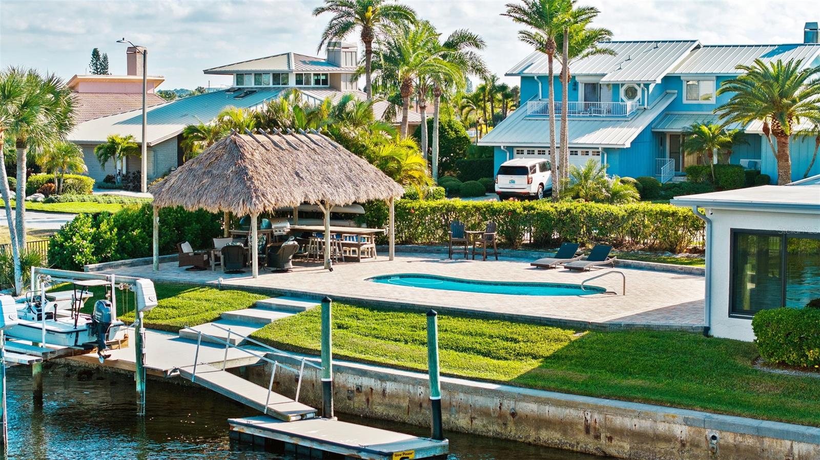 This Single-Story WATERFRONT Home Sits on an Oversize Lot with 150 feet of Water Frontage with 180 degrees BREATHTAKING VIEWS of the Gulf of Mexico from Sunrise to Sunsets and Nights with Full Moon. Welcome Home to this POOL Home with 5 Bedrooms, 3 Bathrooms and a 2-Car Garage PLUS a DOCK with Electric and a 12,000 lb. BOAT LIFT. From there you have a HUGE Pool Deck with a Custom Tiki Hut made with Brazilian Ipe Wood for durability that includes outdoor Grilling Area with both a Gas Grill and Green Egg ~ Ready for anything from a Bar-BQ to pool parties or Lazy Days indulging in Vit-D Therapy! Whether Boating, Fishing or Paddle boarding this Home is Ready to Accommodate All Your Water/Outdoor Activities! PLUS, Access to the Private Beach Area with Pavilions whether a Relaxing Beach Day or Throwing a Celebration for Many! Every Inch of this 3308 Heated Sq. Ft. Home was Beautifully Designed with Meticulous Attention to details from the Metal Roof with Hurricane Clips (Installed 2023) to the Cambria Quartz Countertops in the Kitchen. As you drive up to the home you are greeted with a driveway done with decorative pavers, walking up to the entrance you have Courtyard Sitting Area featuring a WATER FOUNTAIN. The Double Door Entry features Glass detailing with British Style Door Knobs. As you walk in the home has a Split Style open floor-plan to allow water views from all the Hurricane Impact Windows Surrounding the front of the home from multiple areas in the home especially from the heart of the home ~ the Kitchen. No expense was spared with the kitchen remodel to make it a Chef’s dream ~ from the spacious Cambria Quartz Countertops to the abundant soft closed cabinets and drawers to the Thermador Pro Gas Range along with the other Bosch Appliances PLUS Reverse Osmosis Water Filtration System. Off the Kitchen there is Gathering Lounge with Wine Wall and BAR area for Entertaining. The Large Living Room has a Gas Fireplace for those Chilly evenings. From the Living Room you have the “Sun-room” Area surrounded by Hurricane Impact Windows where you have the dining room area and the informal sitting area. From the Sun-room Area you have the Master Bedroom En Suite with Double Barn Doors attached to a Custom California Style Walk-in Closet with its own Island console ~ The Bath features his and hers vanities ~ a glass-less walk-in Shower PLUS an Oversized Tub made for Luxurious soaks. On the other side of the “Sun-room” there is a Guest En Suite Bedroom with its own bathroom. There are 3 MORE OVERSIZED Bedrooms with a Third Bathroom to Share. A Large Indoor Laundry Room with Washer & Dryer with a Utility Sink. Home has Alarm System with Camera and DVR System~ Fenced in Backyard and Side yard~ Roof Replaced 2023 PLUS Gutters ~ Water Heater 2024 ~ A/C 2021 ~Seawall and walkway to Dock 2017 ~ This Home is conveniently close to Shopping & Dining. US-19 is less than 10 minutes PLUS conveniently close to SR54.