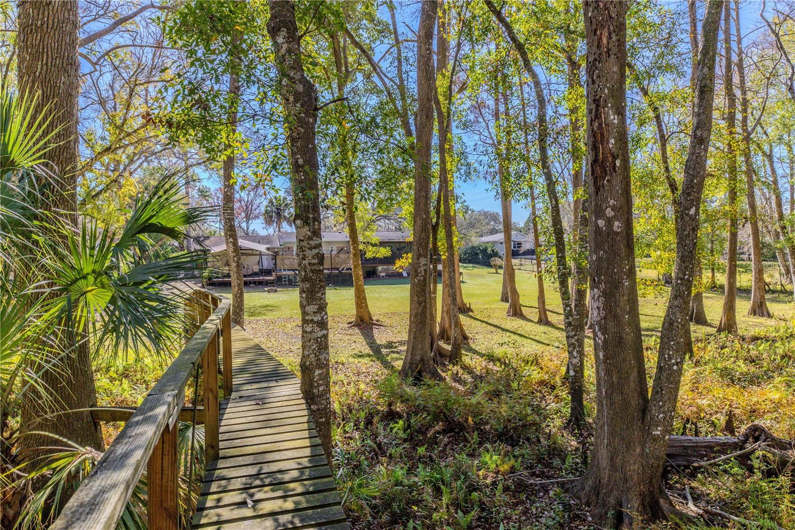 Set on a spacious, tree-lined property, this 3-bedroom, 2-bath single-story ranch home offers a blend of comfortable interior living and exceptional outdoor space. A long private driveway creates a quiet sense of arrival, while mature trees and natural surroundings provide privacy and a peaceful backdrop. Inside, the home features a bright, open layout with wood-look laminate flooring throughout the main living areas, creating a cohesive, welcoming feel. The living and dining spaces flow into the kitchen, allowing for comfortable daily living and easy connection between rooms. Natural light fills the living areas, with views across the surrounding property. The kitchen features warm wood cabinetry, granite like countertops, stainless steel appliances, a tiled backsplash, with ample counter space and storage. A dining area just off the kitchen provides a defined yet open space for meals, making the layout functional and inviting with french doors opening to the deck allowing a lot of natural light to flow in. In addition to the main living room, a separate family room provides flexible space for gatherings, media, or a relaxed lounge. Generously sized and well-lit, this room adds versatility to the floor plan. Sliding glass doors exit to the spacious deck. The home includes well-sized bedrooms, each offering good natural light and flexibility for guest rooms, home offices, or family living. A desirable split floor plan places the primary bedroom in a private wing of the home, while the additional bedrooms are thoughtfully positioned to provide separation and flexibility. The primary bedroom features an en-suite bath, while the second bathroom is conveniently located for guests and the secondary bedrooms. Both bathrooms feature updated vanities with granite countertops, neutral finishes, and clean, functional layouts. Overall, the interior presents as move-in ready, offering a practical floor plan with timeless finishes and comfortable everyday living. Outside, the expansive backyard feels park-like and serene, with wide stretches of lawn ideal for recreation, gatherings, or quiet outdoor enjoyment. A 90’ wooden boardwalk path winds through the property, connecting the open yard to a wooded area and creating a peaceful retreat rarely found in residential settings. A tucked-away seating area along the boardwalk provides the perfect place to relax and take in the surrounding nature. Outdoor living continues with a spacious deck and screened areas overlooking the backyard, offering multiple options for dining, entertaining, or unwinding outdoors. A dedicated fire pit area adds warmth and ambiance, extending the enjoyment of the space into cooler evenings. For summer enjoyment, the property includes a 14-foot by 48-inch above-ground swimming pool featuring a durable steel frame and DuraPlus enhanced 3-ply liner for added strength and stability. The pool holds approximately 4,231 gallons at 90 per cent capacity and offers a simple seasonal setup and drainage system, making it ideal for casual swimming and warm-weather fun. Surrounded by mature trees, open lawn, and natural woodland, this property offers privacy, flexibility, and a strong connection to nature. Enjoy easy access to the Suncoast Parkway for daily commuting, with shopping, schools, bike trails, and the area’s beautiful beaches all within convenient reach.