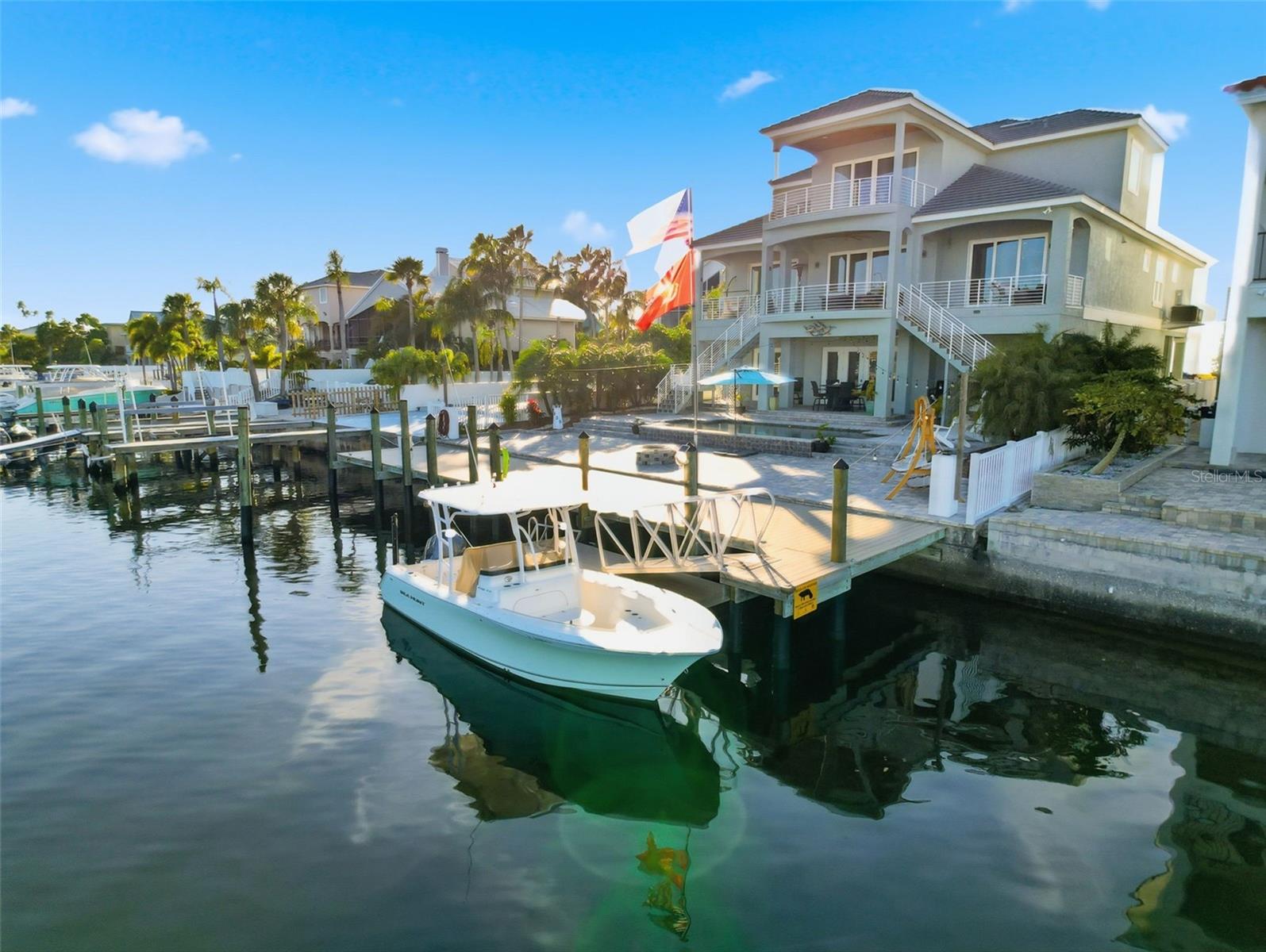 Experience exceptional waterfront living in this stunning custom-built, three-story residence offering breathtaking sunrise and sunset views over a WIDE, DEEP-WATER CANAL WITH DIRECT GULF ACCESS. This beautifully designed home features four bedrooms plus an office/den and bonus room, a THREE-FLOOR ELEVATOR, and thoughtfully curated indoor–outdoor living spaces on every level. A grand, open foyer welcomes you with immediate water views, setting the tone for the light-filled, open-concept design. The main living level showcases walls of windows, soaring ceilings, and seamless access to multiple balconies overlooking the canal, pool, and dock. The gourmet kitchen features premium cabinetry, quartz countertops, a massive island with Blue Lemurian stone, Sub-Zero appliances, gas cooking, pot filler, walk-in pantry, and custom finishes throughout. The second floor offers two front bedrooms with a Jack-and-Jill bath, a private guest suite with balcony access, a beautifully appointed office/den with Gulf views, and a spacious laundry room. The third-floor owner’s retreat features a generous primary suite with cathedral ceilings, electric fireplace, and a serene balcony with panoramic water views. The spa-inspired primary bath includes Italian marble, steam shower, soaking tub with multicolor lighting, dual vanities, and an oversized custom walk-in closet filled with natural light. An additional sitting room or bonus space opens to a front balcony showcasing sunset views over the Gulf. Outdoor living is exceptional with multiple balconies on each level, a SALTWATER POOL WITH PEBBLE TECH FINISH, fire pit, pavered lanai and deck, and a 75’ DOCK WITH FLOATING DOCK, WATER, AND 50-AMP ELECTRIC SERVICE—ideal for boating enthusiasts. The deep-water canal offers NO TIDE RESTRICTIONS and quick access to Anclote Island and sandbars. Additional highlights include HURRICANE IMPACT WINDOWS AND DOORS, plantation shutters, epoxy-sealed balconies, cedar ceilings, generator transfer switch, propane system, two Carrier AC systems, spray foam insulation, a large multi-car garage, extended driveway parking, and TRANSFERABLE LOW-PRICE FLOOD INSURANCE. Located in a golf-cart-friendly waterfront community with private beach, yacht club, and civic center. A rare opportunity to own a luxury Gulf-access home offering remarkable views, quality construction, and an exceptional coastal lifestyle.