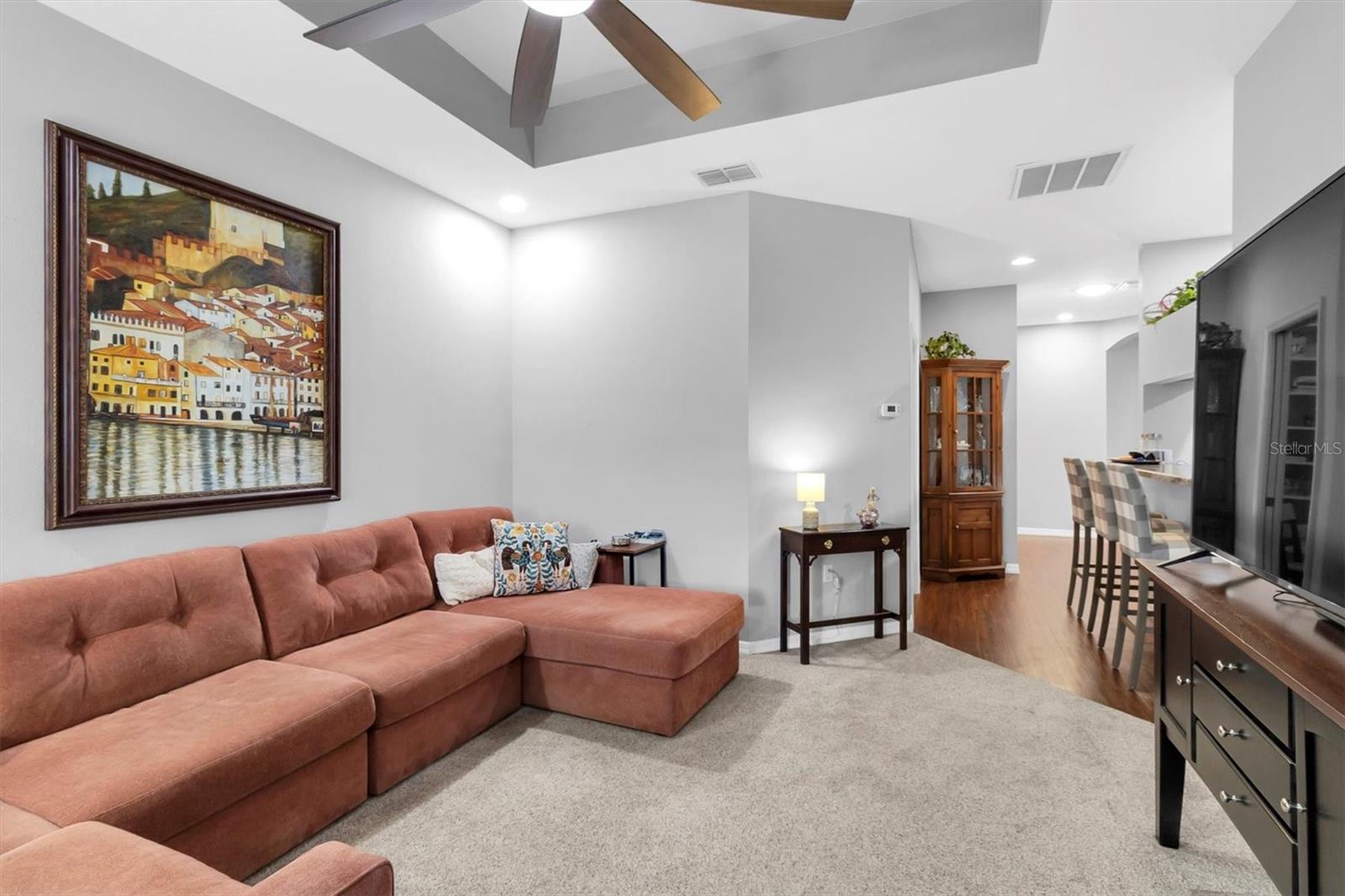 Experience exceptional privacy and comfort in this former model villa located in the gated community of Hampton Village at River Ridge. With no rear neighbors and serene conservation views, this home offers a peaceful retreat in a highly desirable setting. This thoughtfully designed residence features 2 bedrooms, 2 bathrooms, and a versatile bonus room ideal for a home office or flex space. As a former model home, it showcases numerous upgrades, including elegant tray ceilings in both the living room and the primary suite. Another added upgrade is Impact windows . No having to put up cumbersome shutters here ! The kitchen is well-appointed with matching stainless steel appliances, including a refrigerator and microwave that are only three years old. Solid wood cabinetry provides ample storage, complemented by generous counter space and a convenient breakfast bar—perfect for casual dining and entertaining. The spacious primary suite overlooks the tranquil conservation area and easily accommodates a king-sized bed. It includes a walk-in closet and a private en-suite bath with dual vanities. Additional highlights include an interior laundry room and an attached two-car garage for added convenience. Residents enjoy low HOA fees and no CDD fees. The low-maintenance lifestyle includes lawn care, irrigation, trash service, grounds maintenance, and exterior building maintenance, including the roof. Hampton Village also offers a gated entrance, community pool and cabana, and guest parking. Ideally situated near the new Moffitt Cancer Center, VA facilities, Publix, CVS, local restaurants, Pasco-Hernando State College, Starkey Park, and more, this home combines privacy, convenience, and effortless Florida living.