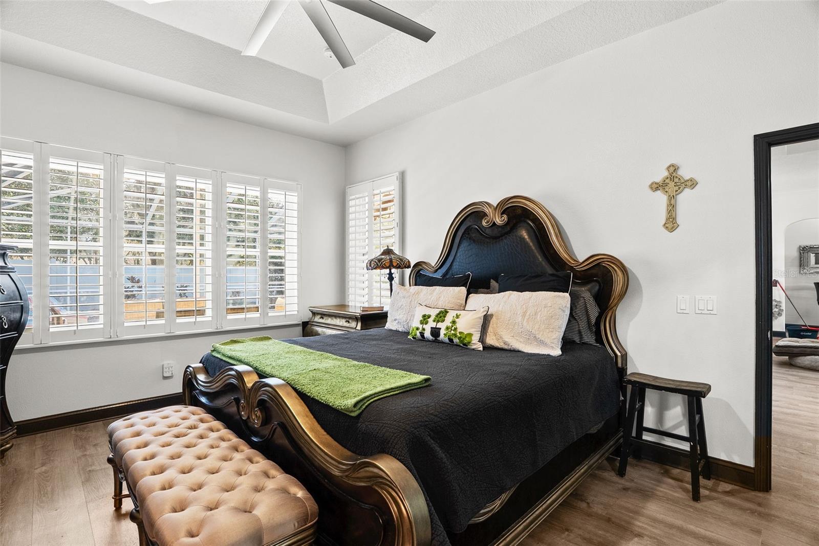 Welcome to 6568 Millstone Drive, where space, flexibility, and country-style living come together on just over one acre in the highly sought-after neighborhood of Oak Ridge. Set beneath mature oaks on a corner homesite, this custom residence invites you in with a long pavered walkway, timeless architecture, and a sense of privacy that feels rare while still being close to everything Trinity has to offer. Step through the double entry doors into a light-filled interior where soaring tray and vaulted ceilings, crown molding, and brand-new luxury vinyl flooring create a seamless flow throughout the home. The formal living and dining spaces offer versatility, currently serving as both an entertaining area and a game room, while plantation shutters and arched windows frame views of the surrounding property. At the heart of the home, the updated kitchen features solid wood cabinetry, stone counters, and fresh finishes that blend warmth with functionality. Just beyond, the spacious family room opens toward the lanai and pool, making everyday living and entertaining feel effortless. A thoughtfully designed split-bedroom layout provides privacy, including a generous primary suite with plantation shutters, a large walk-in closet with built-ins, a garden tub, and a spacious walk-in shower designed for relaxation. Each guest bedroom offers comfortable proportions, including one with its own en-suite bathroom, creating flexibility for visitors or multi-generational living. Three fully renovated bathrooms and dark interior doors add a modern contrast to the bright, open design. Step outside and the property truly shines. A PebbleTec saltwater pool sits beneath a screened enclosure and expansive lanai, surrounded by paver decking that creates a true outdoor retreat. Beyond the pool area, the fully usable acreage offers space for animals, hobbies, or future possibilities. Horses are welcome here, with a large barn and additional run-in shed already in place, along with fenced areas and a secondary driveway leading to the outbuilding and oversized parking areas. Car enthusiasts, hobbyists, and tradespeople will appreciate the 24x30 outbuilding with power, dedicated motorhome hookups with electric and septic access, and an extended driveway designed to accommodate multiple vehicles. Additional features include a tankless water heater, updated flooring throughout, irrigation across the property, and thoughtful drainage enhancements for peace of mind. Located within Oak Ridge with no HOA fees, this home blends acreage living with convenience to schools, shopping, medical facilities, and major roadways. Whether you envision quiet mornings by the pool, evenings under the oaks, or a property designed for animals, hobbies, and entertaining, 6568 Millstone Drive offers a lifestyle that is both refined and uniquely versatile. Schedule your private showing and experience the possibilities of Oak Ridge living.