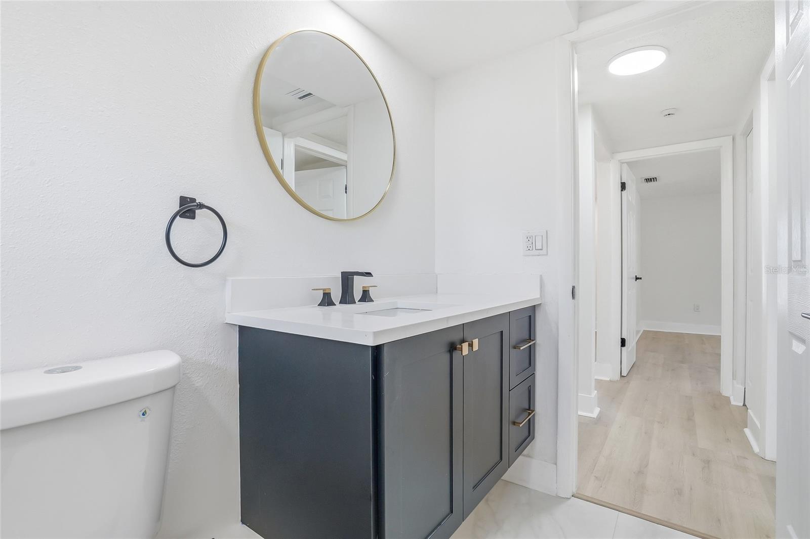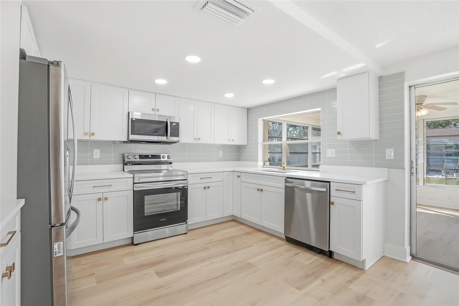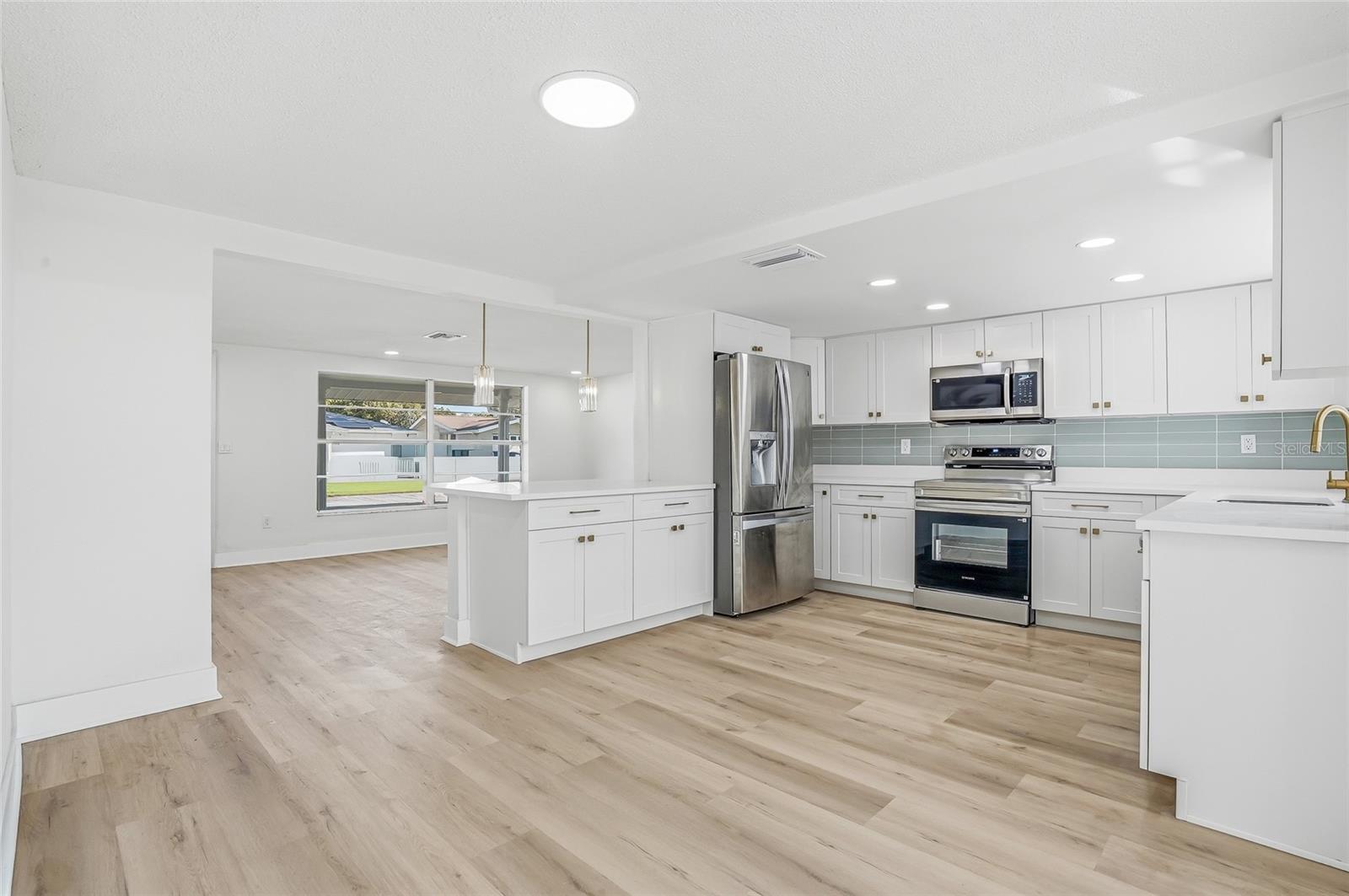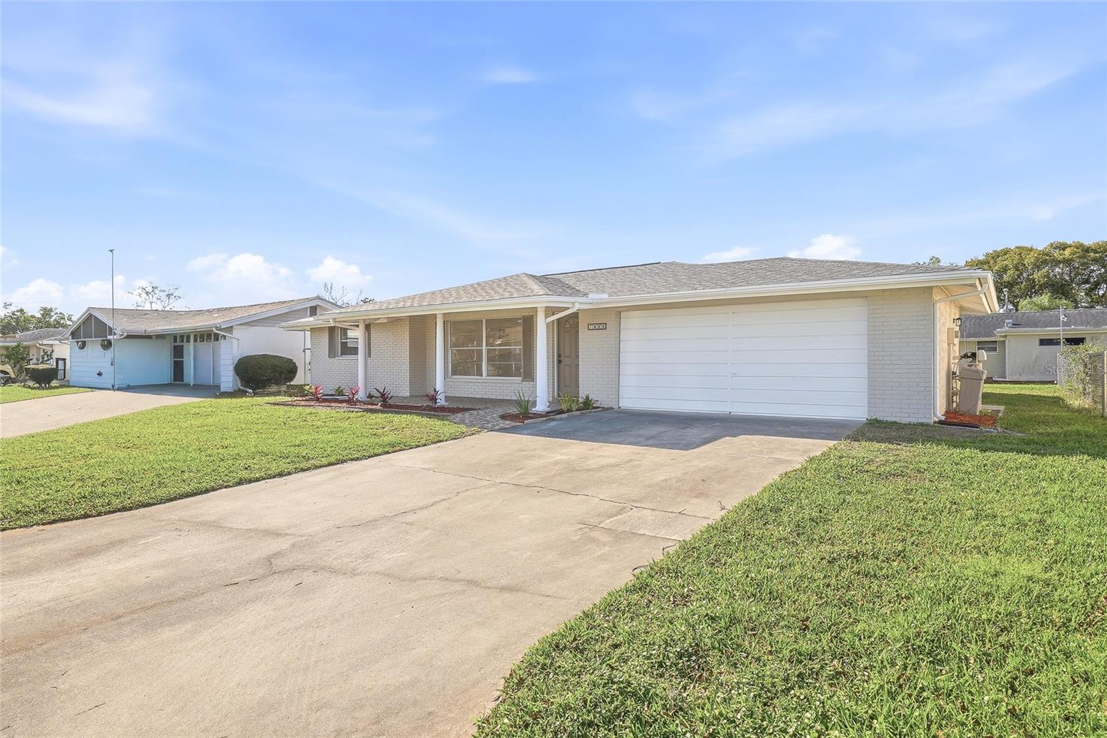 Welcome to this beautifully updated 3-bedroom, 2-bathroom home with a 2-car garage located in the heart of New Port Richey. From the moment you arrive, you’ll be greeted by a charming covered front porch, the perfect spot to enjoy your morning coffee or relax in the evenings. Step inside to an inviting layout where the living room flows seamlessly into the dining area and kitchen, creating a bright and open space ideal for both everyday living and entertaining. The kitchen has been thoughtfully done with brand-new cabinetry, quartz countertops, stainless steel appliances, and a convenient breakfast bar perfect for casual dining. Throughout the home, you’ll find new luxury vinyl flooring, giving the space a modern and cohesive feel. The primary suite offers a private retreat featuring a beautiful en suite bathroom and sliding glass doors that lead directly to the sunroom, creating a peaceful extension of your living space. Down the hall, you’ll find two additional guest bedrooms and a sleek guest bathroom, providing comfortable accommodations for family or visitors. Step outside through the glass door to the sunroom, a versatile space ideal for relaxing, entertaining, or enjoying the Florida lifestyle year-round. For added peace of mind, this home features a brand-new roof and HVAC system. Conveniently located less than 10 minutes from Downtown New Port Richey and Sims Park, and under 35 minutes to Raymond James Stadium, you’ll enjoy easy access to local restaurants, shopping, and entertainment. This move-in-ready home blends modern updates, comfortable living, and an excellent location — making it a wonderful opportunity to call New Port Richey home.