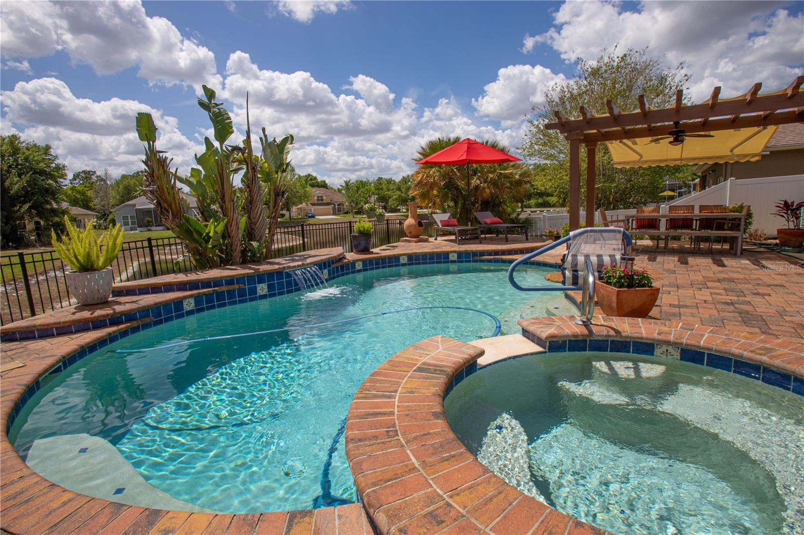 Welcome to Water’s Edge at Moon Lake! Finally, a fantastic split floorplan four bedroom, two bath home with zero projects! Simply move in and enjoy. The current owners are meticulous and left no details for you to worry about. Welcome your guests with a true foyer, entering through a new contemporary front door. This open floor plan is designed for upscale casual living and entertaining. Featuring a large great room adjacent to a dining area that easily seats eight guests. The cooks’ kitchen is modern and functional with stainless appliances and plenty of granite counter space. You can enjoy breakfast at the kitchen counter or the breakfast nook overlooking the pool and the pond beyond the back yard. Flooring is oversized honed tile throughout the living area except the bedrooms and the 9’4” ceilings provide a light airy feeling. The primary bedroom has an ensuite full bath and sliding door access to the lanai. An adjacent bedroom is currently set up as a home office. Two other large bedrooms are across the hall and share the second full bath. The backyard steals the show with a custom-built heated saltwater pool and spa. Other lanai access points are a single door from the breakfast nook and a sliding door from the family room. 2026 improvements include a new pool heater, ceiling fan and awning on the pergola, freshly sodded front yard and a landscaping refresh. Moon lake is just a few streets over and there is access for residents along with the community center, exercise fitness room, huge community resort style pool. HOA fees also include Cable, Internet, Trash removal and reclaimed water for irrigation.