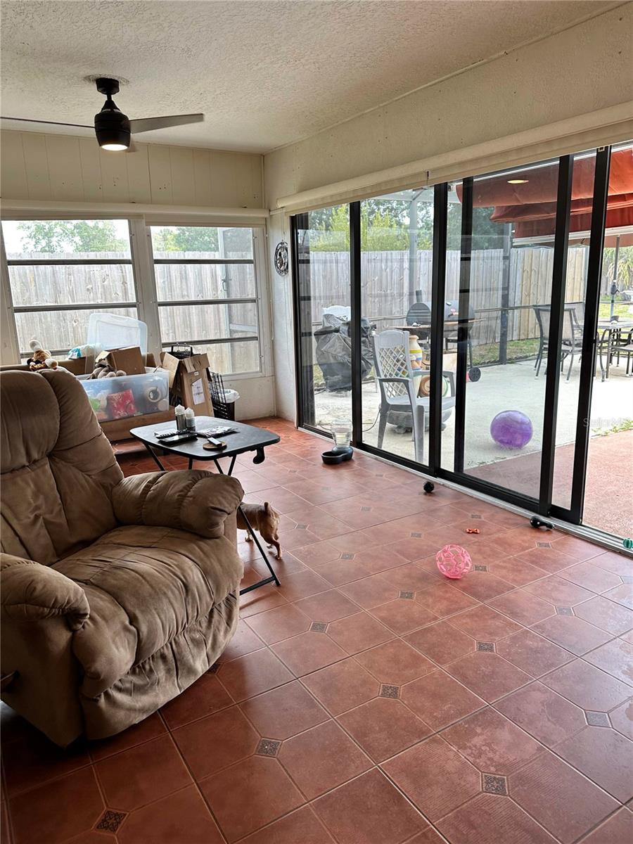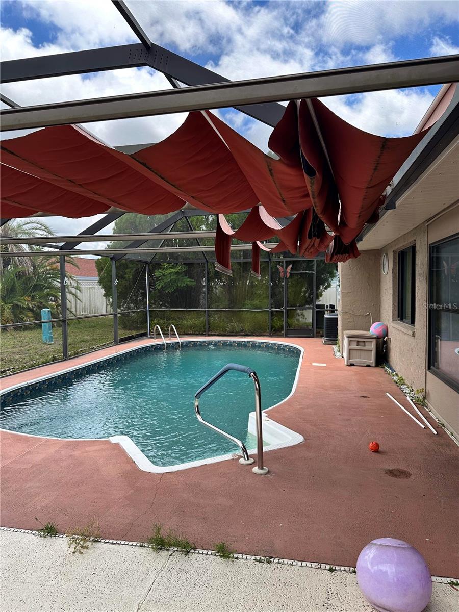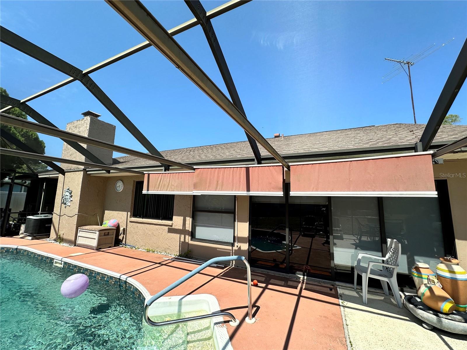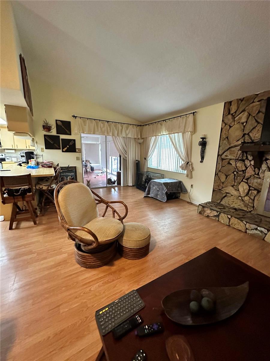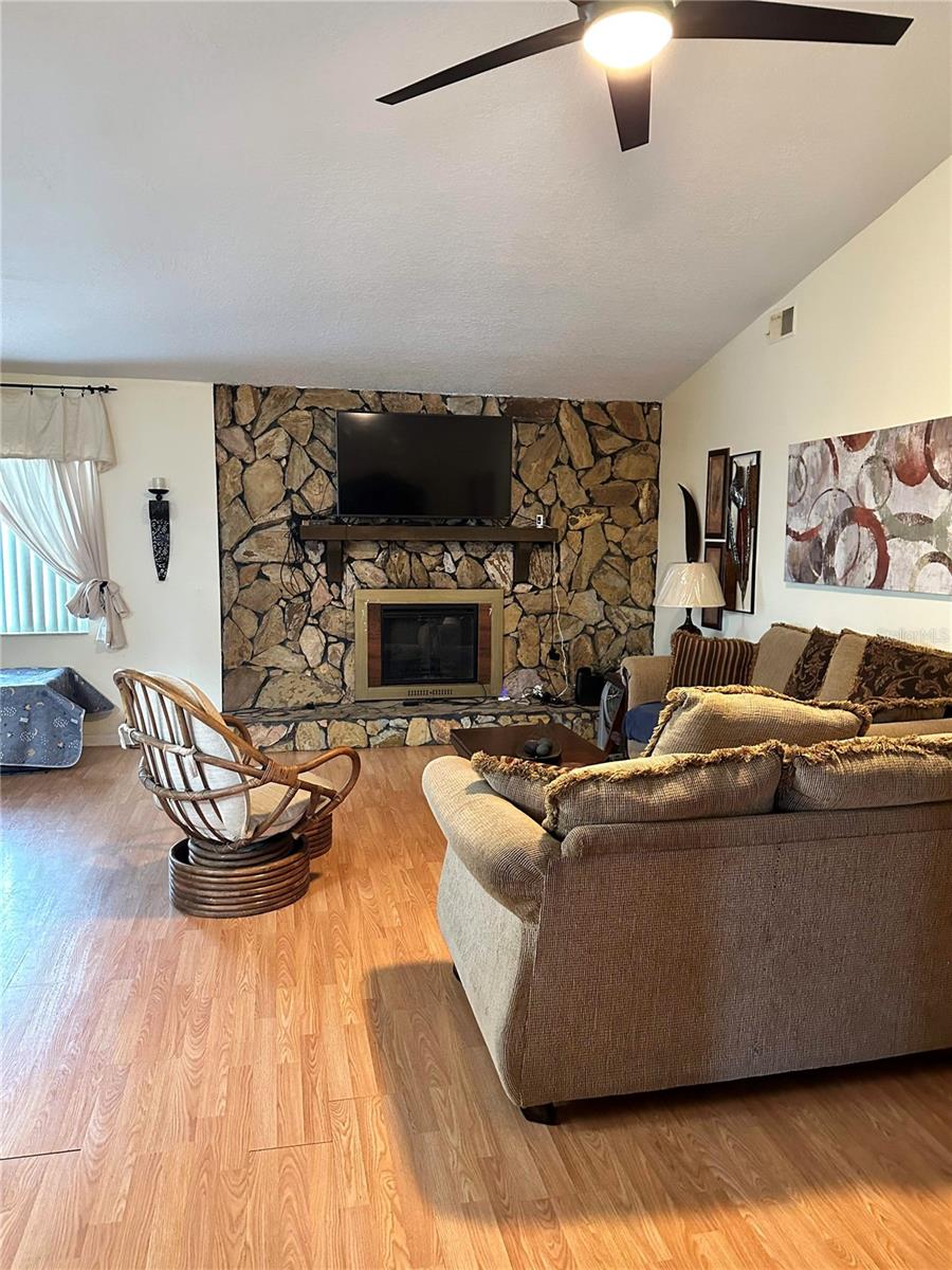 Great Open Floor Plan - Den with French Doors - Laminate & Tile Flooring, Split Bedrooms + Den / Study could be 3rd Bedroom & Beautiful newly refinished In-ground Pool too! Spacious family room with Stone Wood Burning Fireplace with an electro flame insert for cozy/chilly nights. Stainless steel energy star appliances in the spacious kitchen, lots of room to create. This home has a nice size breakfast bar in the kitchen and room for dining set. A few updates include Roof in 2014, Fans in 2019, AC in 2016 and hurricane proof tinted picture window in 2017, 15 x 30 Pool Updated in 2024 and has sliding canopies for shade on large screened in lanai. Air conditioned porch between kitchen & lanai. Quiet community with bike trails leading into Starkey Park. Call for apt to view. OWNER Motivated