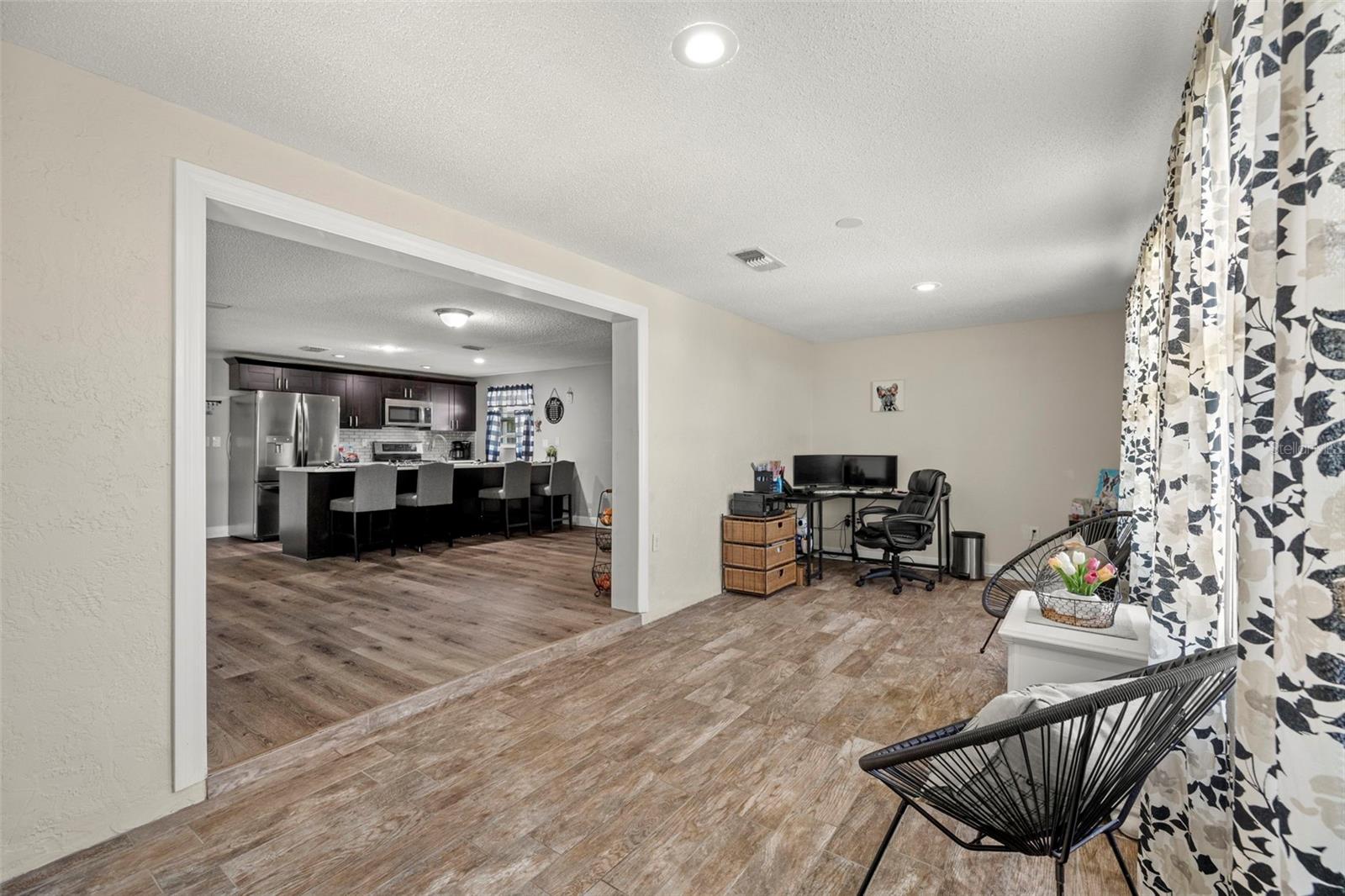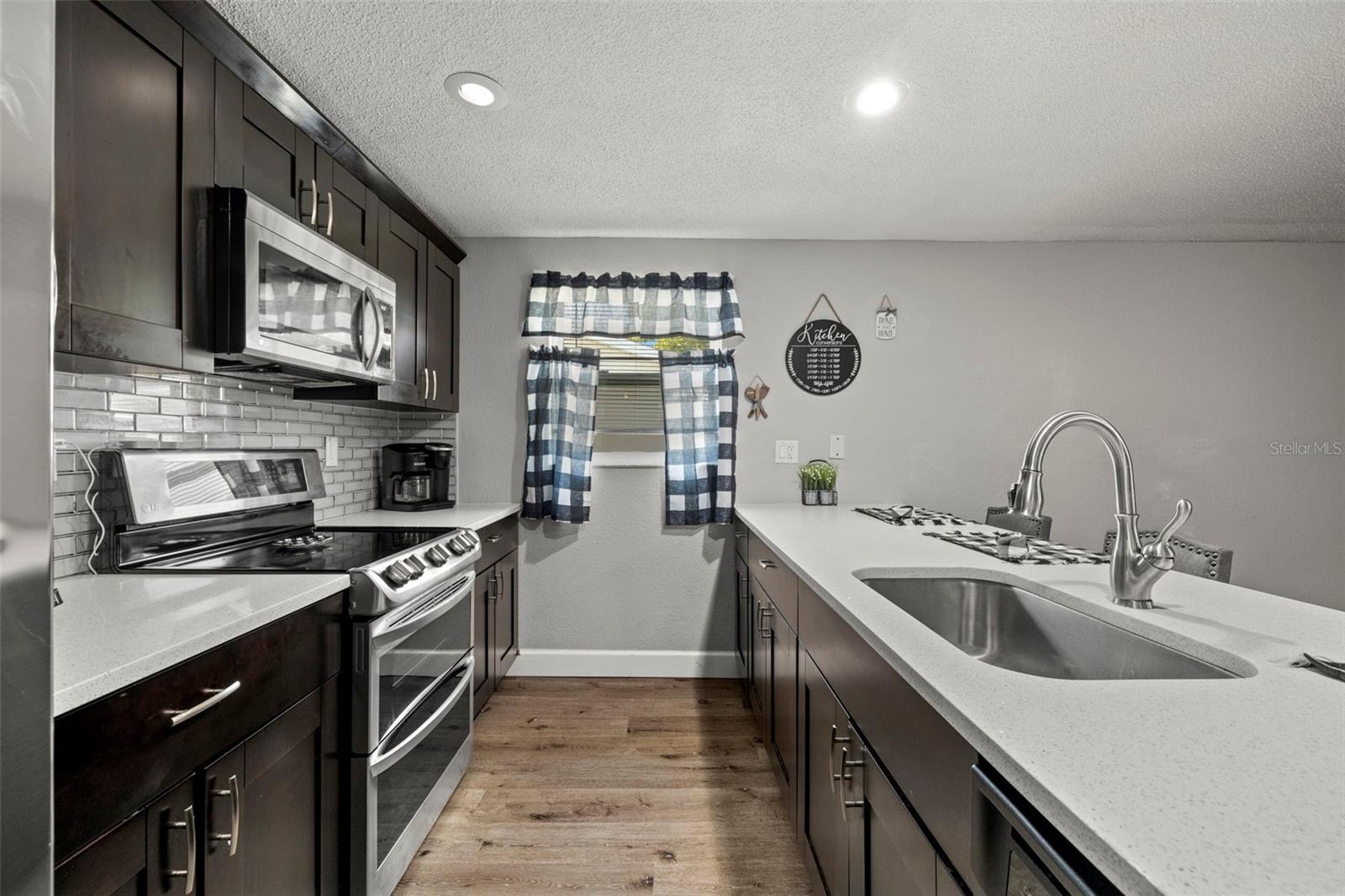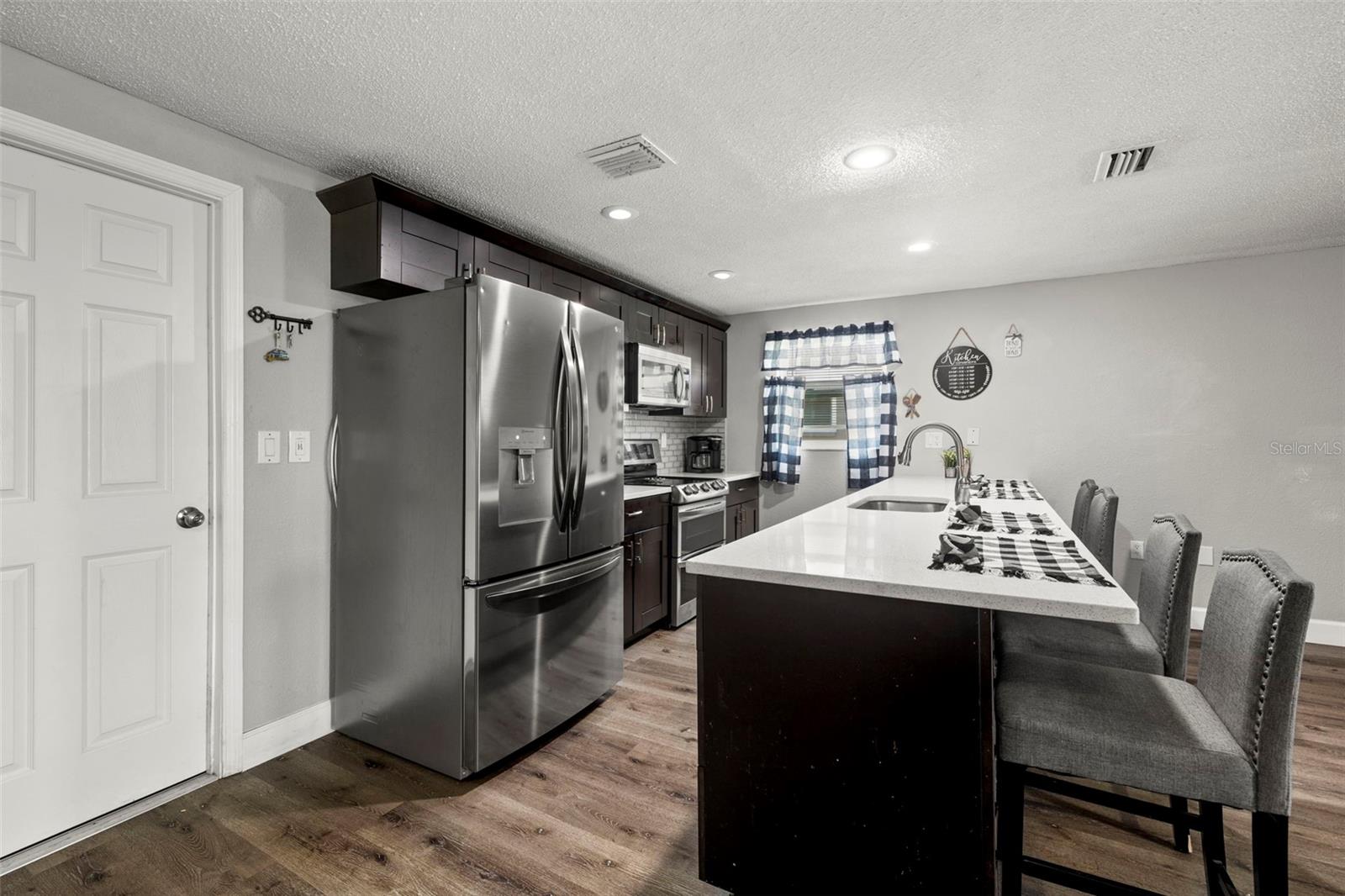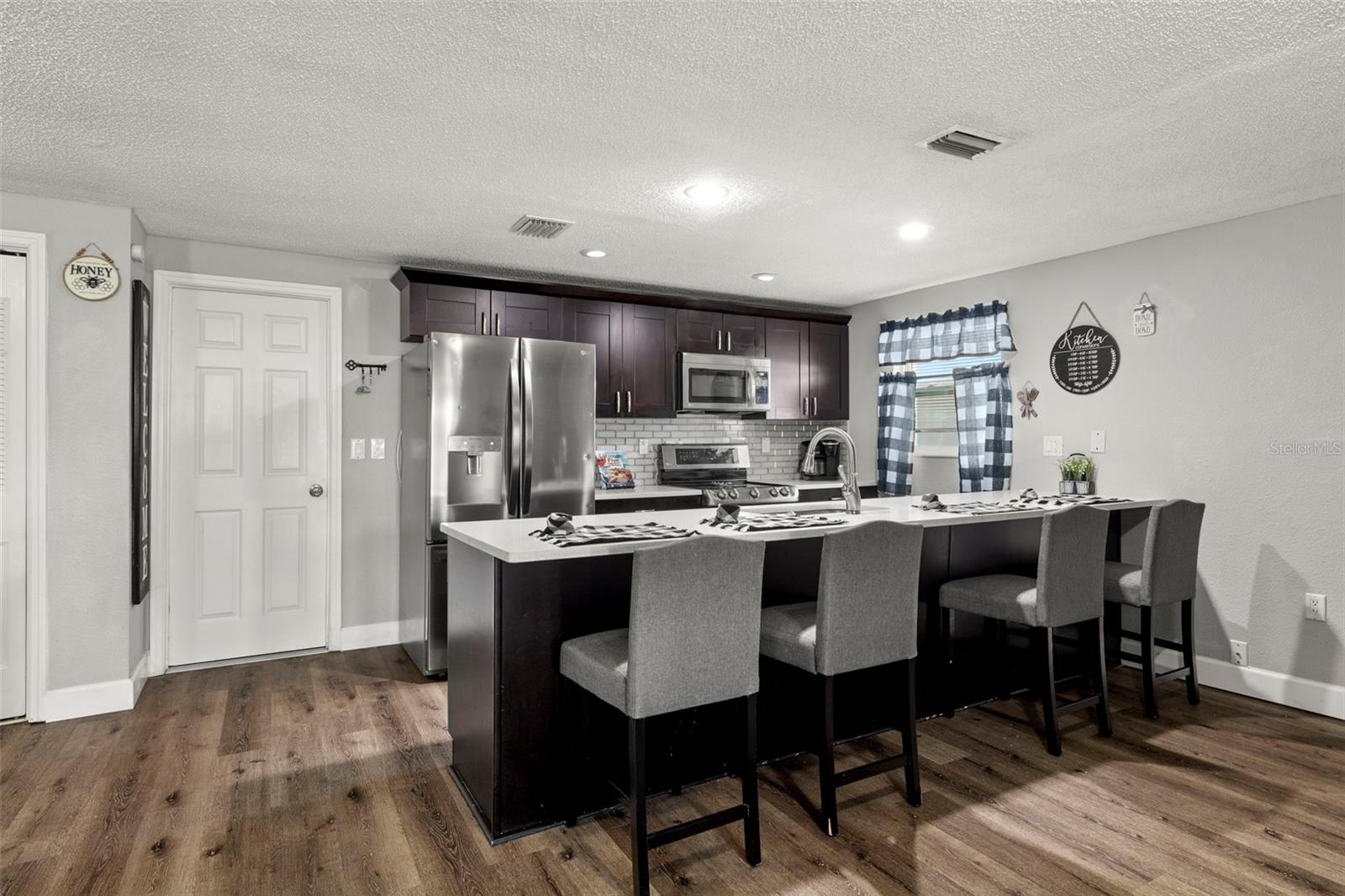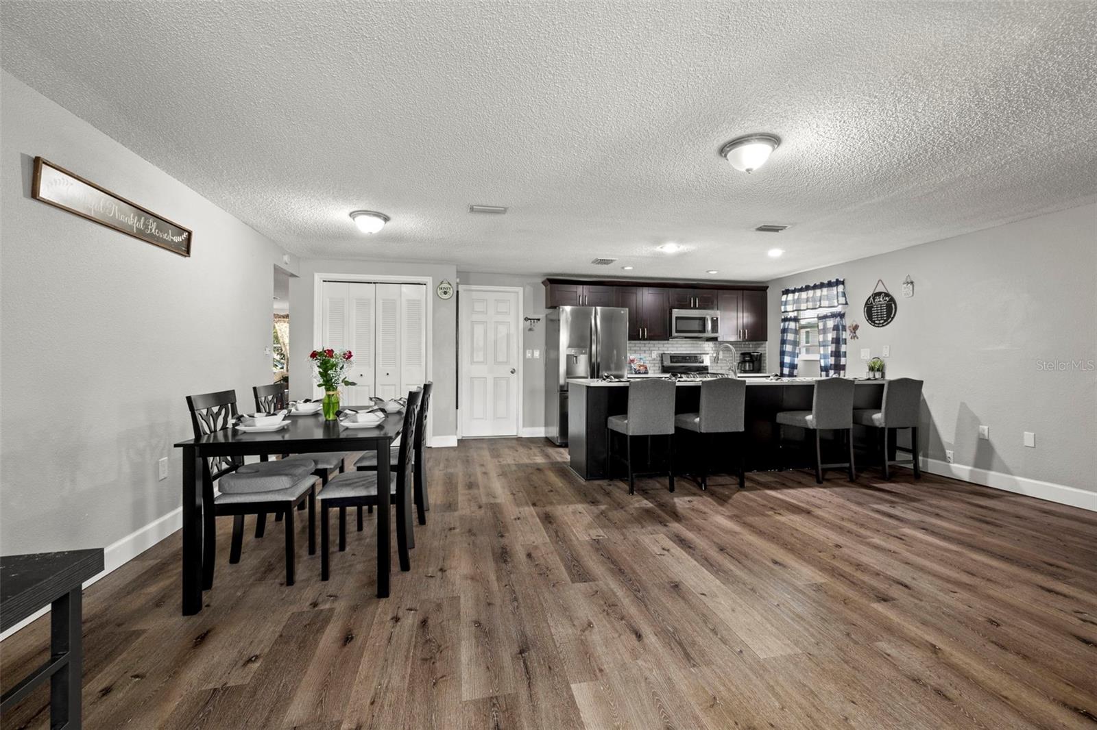 Nestled in the charming town of New Port Richey, just a quick 5-minute drive from the vibrant downtown area, this beautifully updated 3-bedroom, 2-bathroom home offers nearly 2,000 square feet of well-designed living space. This solid block home provides lasting peace of mind with no flood insurance required. Step inside to discover vinyl plank flooring that flows seamlessly through the main living areas, enhancing the thoughtfully designed layout. The kitchen, fully renovated in 2021, is a chef's dream, featuring espresso soft-close wood cabinetry, classic white subway tile backsplash, and stainless steel appliances, including a double oven. Quartz countertops and a spacious kitchen island with seating for 4-5 people add to the kitchen's appeal. The open-concept design connects the kitchen to the dining room and a bonus room, which is adorned with wood-like ceramic tile flooring—ideal for hosting gatherings. The oversized owner’s suite is a tranquil retreat, boasting ample storage and a beautifully updated ensuite bathroom with a stand-up shower featuring modern tilework. The additional two bedrooms are generously sized and share an updated bathroom. Recent upgrades include a new water heater (2021), as well as updated electrical and windows. The attached garage houses a washer, dryer, and utility sink, adding to the home's practicality. Outside, the fully fenced backyard offers the perfect setting for barbecues and outdoor enjoyment. New Port Richey’s downtown Main Street, just minutes away, is a hub of activity with annual parades, festivals, and boat parades along the Cotee River. Sims Park provides something for everyone, from concerts at the amphitheater to a splash pad, kayak launches, and walking paths. Whether you're catching a show at the historic Richey Suncoast Theatre or exploring local boutiques and eateries, this town's small-town charm offers a slower pace of life, while easy access to US-19 keeps you connected to Gulf Coast beaches. This home combines affordability with an enviable lifestyle. Don’t miss your chance—schedule your showing today!