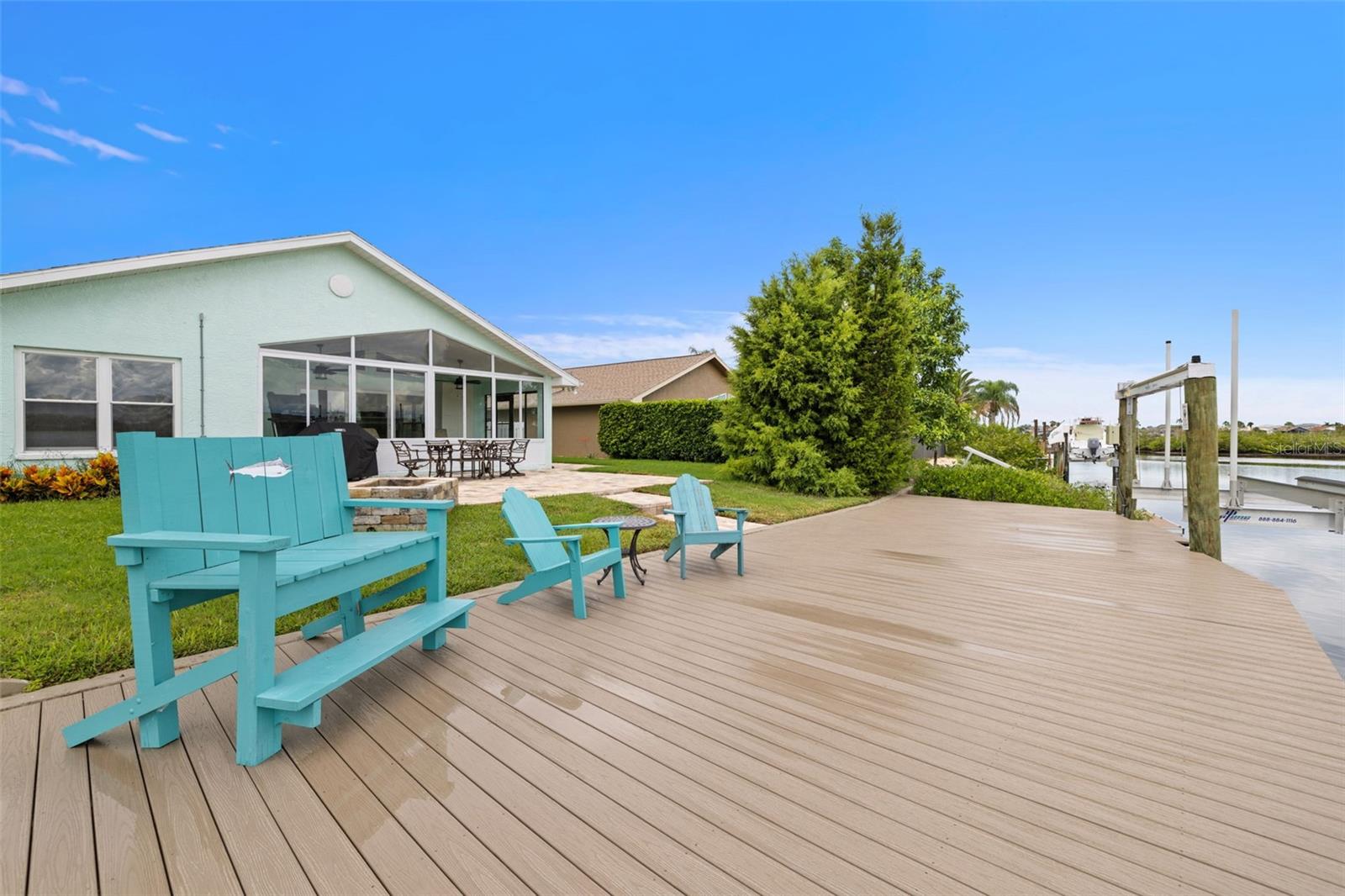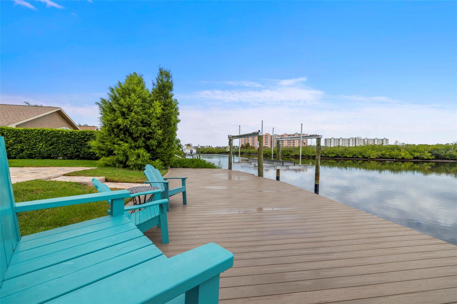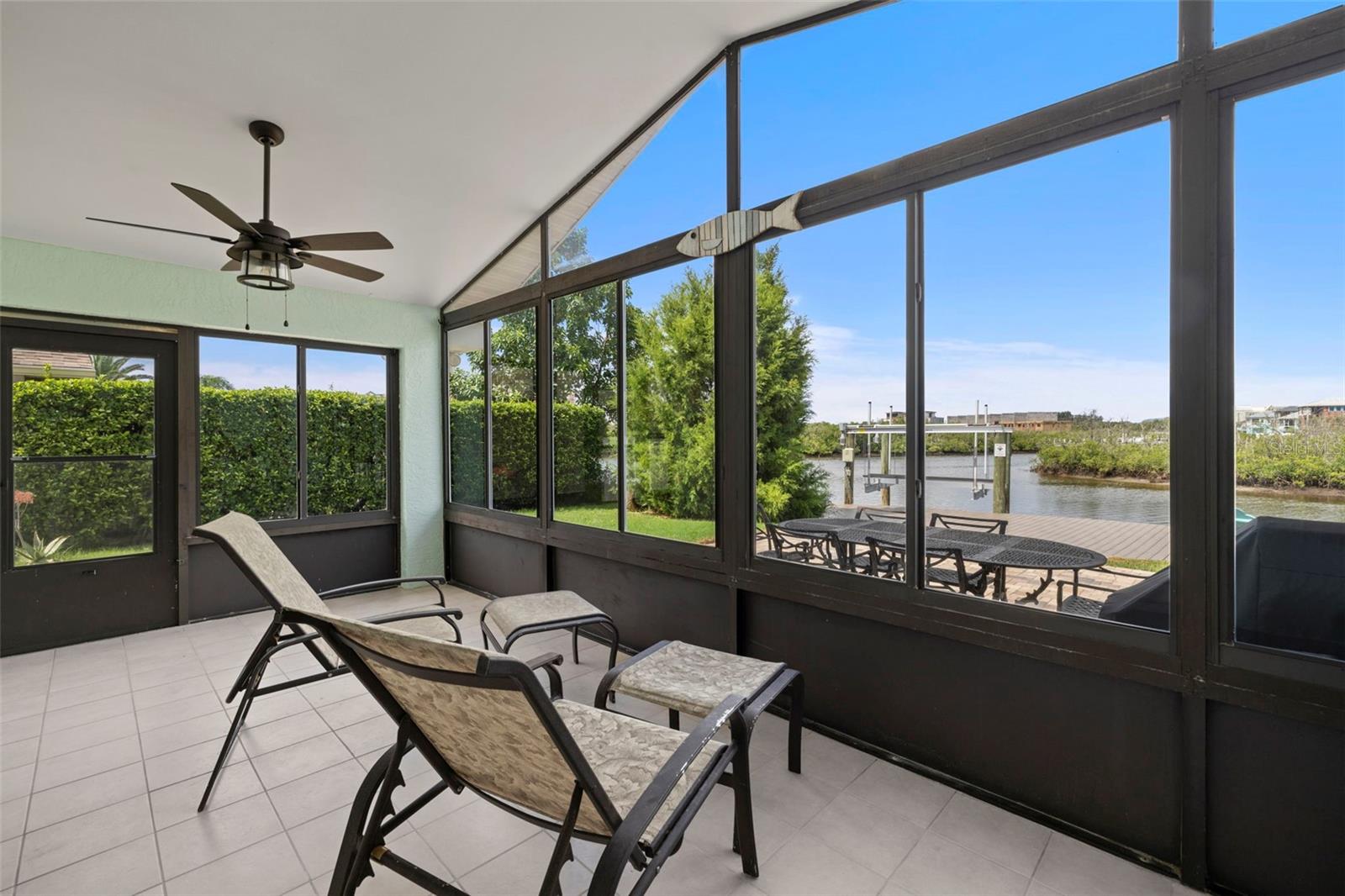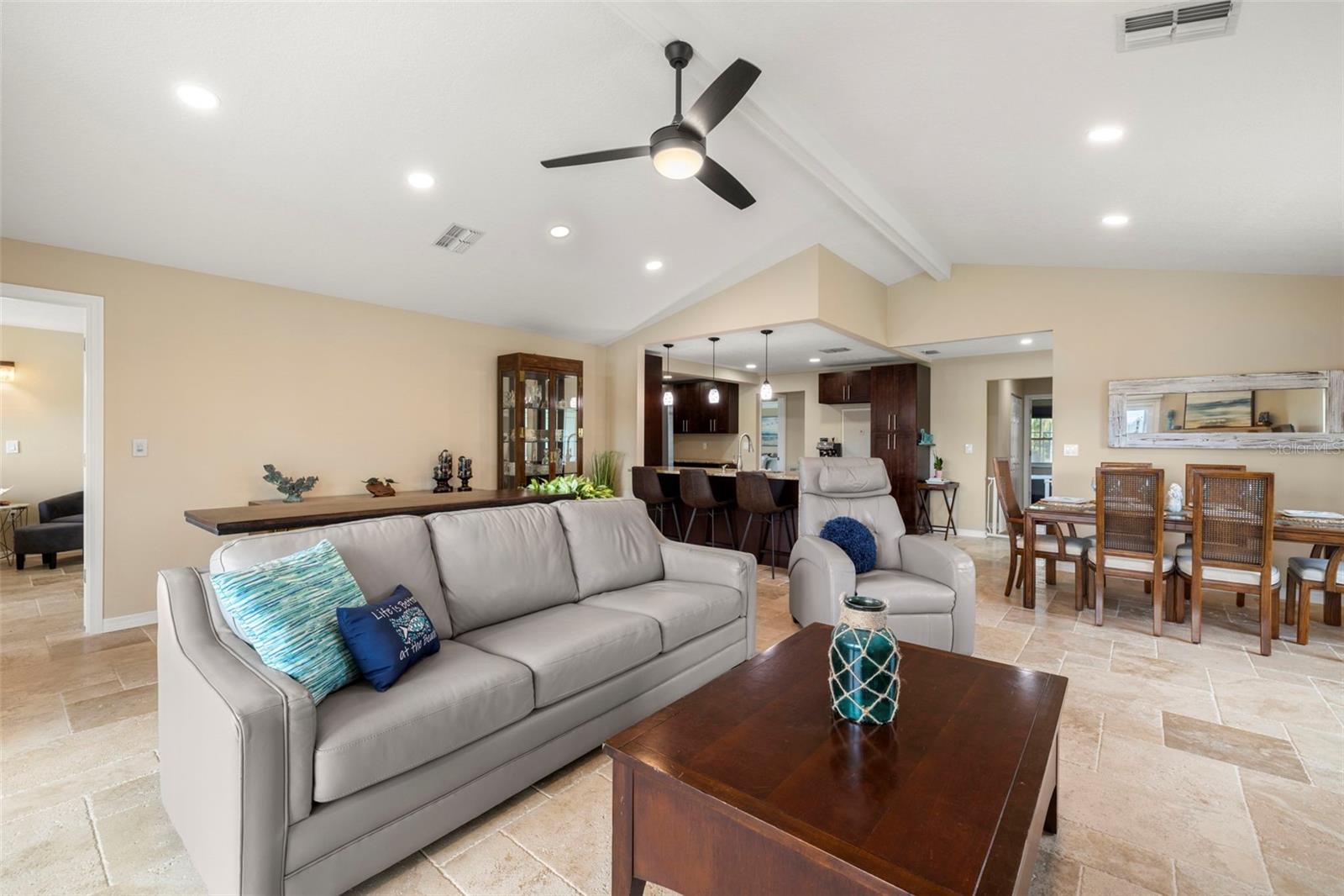 Nestled in the serene Gulf Harbors community, this stunning 3-bedroom, 2-bathroom waterfront home offers nearly 1,700 sqft of meticulously renovated living space. As you arrive, notice the beautiful pavered driveway and walkway replaced in 2022, leading you through the charming wrought-iron gated front porch. The home’s exterior shines with fresh, low-maintenance landscaping, a new roof installed in 2021, and recent exterior paint. Step inside to find an inviting atmosphere filled with natural light where travertine tile floors, replaced in 2021, meet sophisticated window treatments and contemporary lighting fixtures. The heart of this home is the designer kitchen, completely remodeled in 2021, featuring a stunning waterfall granite countertop at the breakfast bar, espresso wood soft-close cabinets, granite countertops, and stainless steel appliances. This open-concept space is anchored by a cozy white brick fireplace, creating the perfect setting for family gatherings and holiday celebrations. The owner’s suite is a true retreat, offering a private exit to the patio, a spacious walk-in closet with a custom closet system, and an ensuite bathroom with dual sinks, a stand-up shower, and additional closet space. The split bedroom floor plan ensures privacy, with an updated guest bathroom nearby, featuring granite countertops, new cabinets, and all-new plumbing fixtures, also updated in 2021.Convenience is key with an indoor laundry room that includes added cabinetry and a utility sink. The water heater and entire home was re-plumbed in 2021 providing peace of mind for years to come. Step outside through hurricane-impact triple sliding glass doors to your screened-in lanai, overlooking a waterfront oasis. The outdoor pavered patio with built in fire pit leads to your private dock with a newly installed (2023) 10,000 lb boat lift, perfect for quick access to the Gulf of Mexico. Whether you’re fishing off the dock or kayaking through the nearby Robert Crown Wilderness Area, outdoor adventures await right in your backyard. Residents of Gulf Harbors may also enjoy a private beach access for members only. To ensure your comfort in Florida’s climate, a sprinkler system with mosquito/noseeum control was installed, making outdoor living a pleasure year-round. Perfectly located with easy access to US-19, this home is just minutes away from shopping, dining, and offers a straightforward commute. Don't miss out on the chance to own this exceptional waterfront property, where you can create memories for years to come!