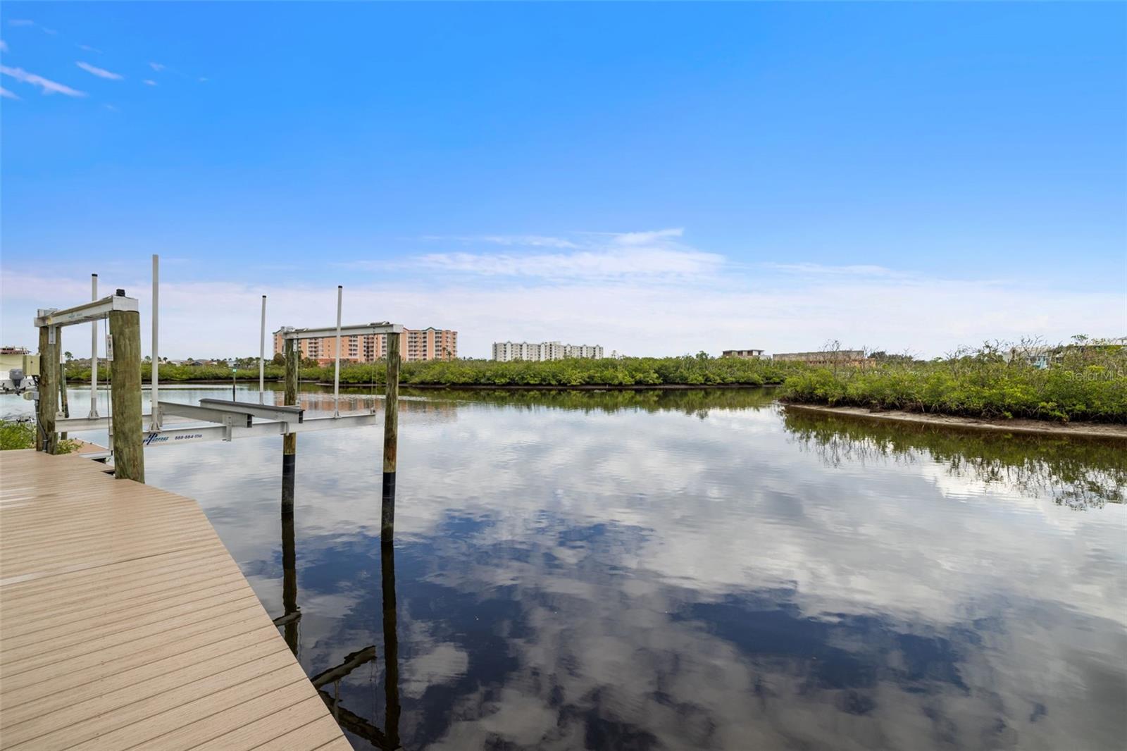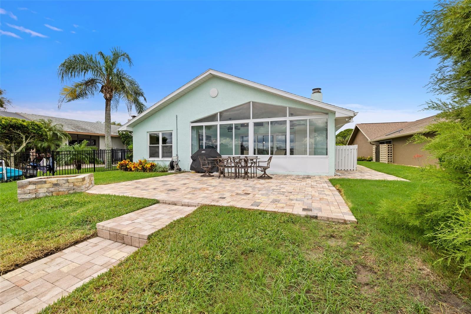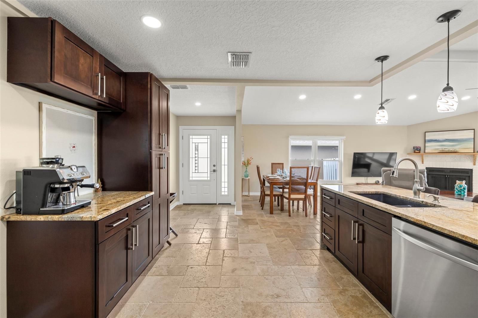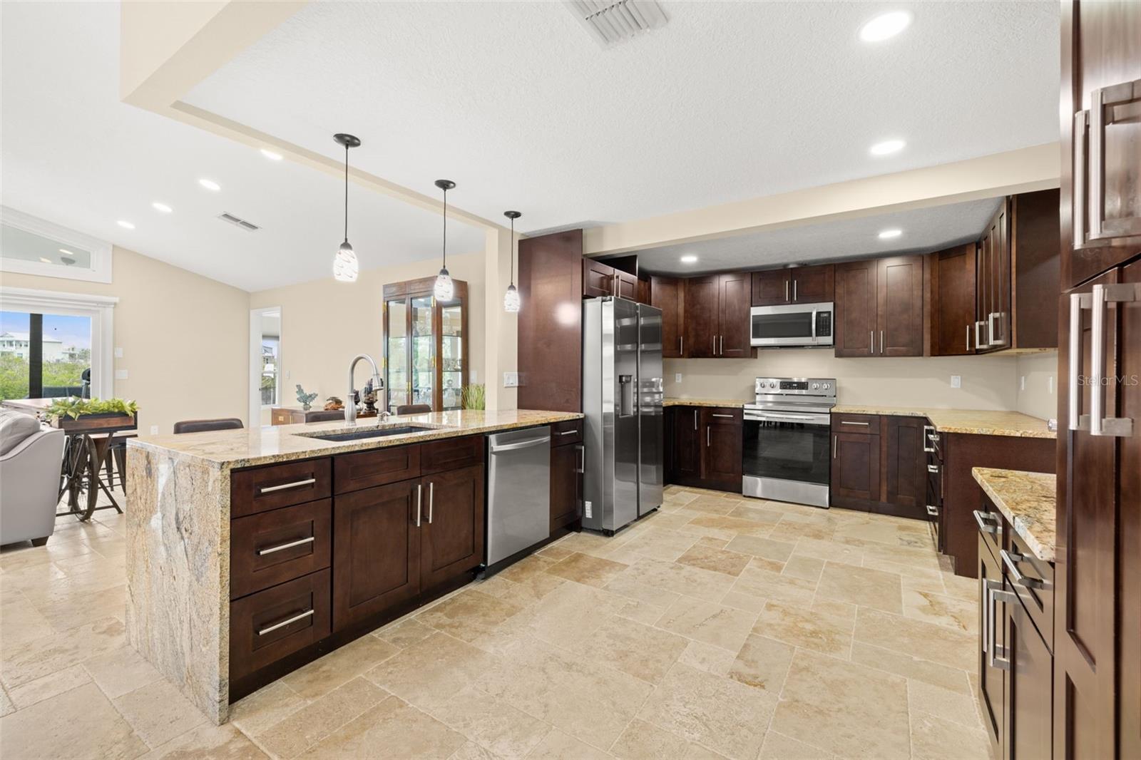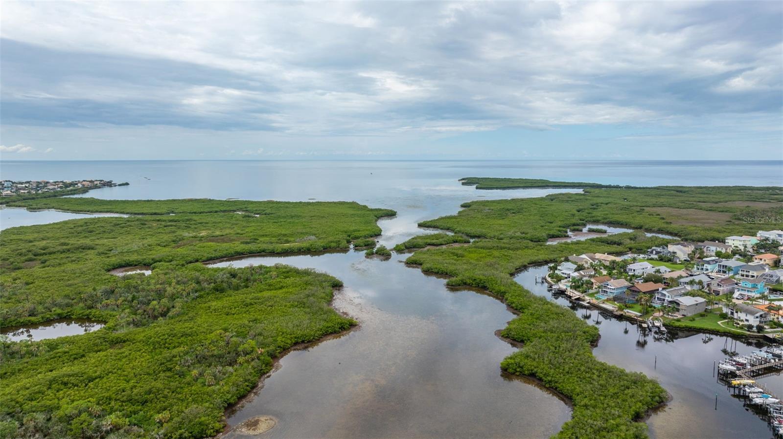 Nestled in the serene Gulf Harbors community, this stunning 3-bedroom, 2-bathroom waterfront home offers nearly 1,700 sqft of meticulously renovated living space. As you arrive, notice the beautiful pavered driveway and walkway replaced in 2022, leading you through the charming wrought-iron gated front porch. The home’s exterior shines with fresh, low-maintenance landscaping, a new roof installed in 2021, and recent exterior paint. Step inside to find an inviting atmosphere filled with natural light where travertine tile floors, replaced in 2021, meet sophisticated window treatments and contemporary lighting fixtures. The heart of this home is the designer kitchen, completely remodeled in 2021, featuring a stunning waterfall granite countertop at the breakfast bar, espresso wood soft-close cabinets, granite countertops, and stainless steel appliances. This open-concept space is anchored by a cozy white brick fireplace, creating the perfect setting for family gatherings and holiday celebrations. The owner’s suite is a true retreat, offering a private exit to the patio, a spacious walk-in closet with a custom closet system, and an ensuite bathroom with dual sinks, a stand-up shower, and additional closet space. The split bedroom floor plan ensures privacy, with an updated guest bathroom nearby, featuring granite countertops, new cabinets, and all-new plumbing fixtures, also updated in 2021.Convenience is key with an indoor laundry room that includes added cabinetry and a utility sink. The water heater and entire home was re-plumbed in 2021 providing peace of mind for years to come. Step outside through hurricane-impact triple sliding glass doors to your screened-in lanai, overlooking a waterfront oasis. The outdoor pavered patio with built in fire pit leads to your private dock with a newly installed (2023) 10,000 lb boat lift, perfect for quick access to the Gulf of Mexico. Whether you’re fishing off the dock or kayaking through the nearby Robert Crown Wilderness Area, outdoor adventures await right in your backyard. Residents of Gulf Harbors may also enjoy a private beach access for members only. To ensure your comfort in Florida’s climate, a sprinkler system with mosquito/noseeum control was installed, making outdoor living a pleasure year-round. Perfectly located with easy access to US-19, this home is just minutes away from shopping, dining, and offers a straightforward commute. Don't miss out on the chance to own this exceptional waterfront property, where you can create memories for years to come!