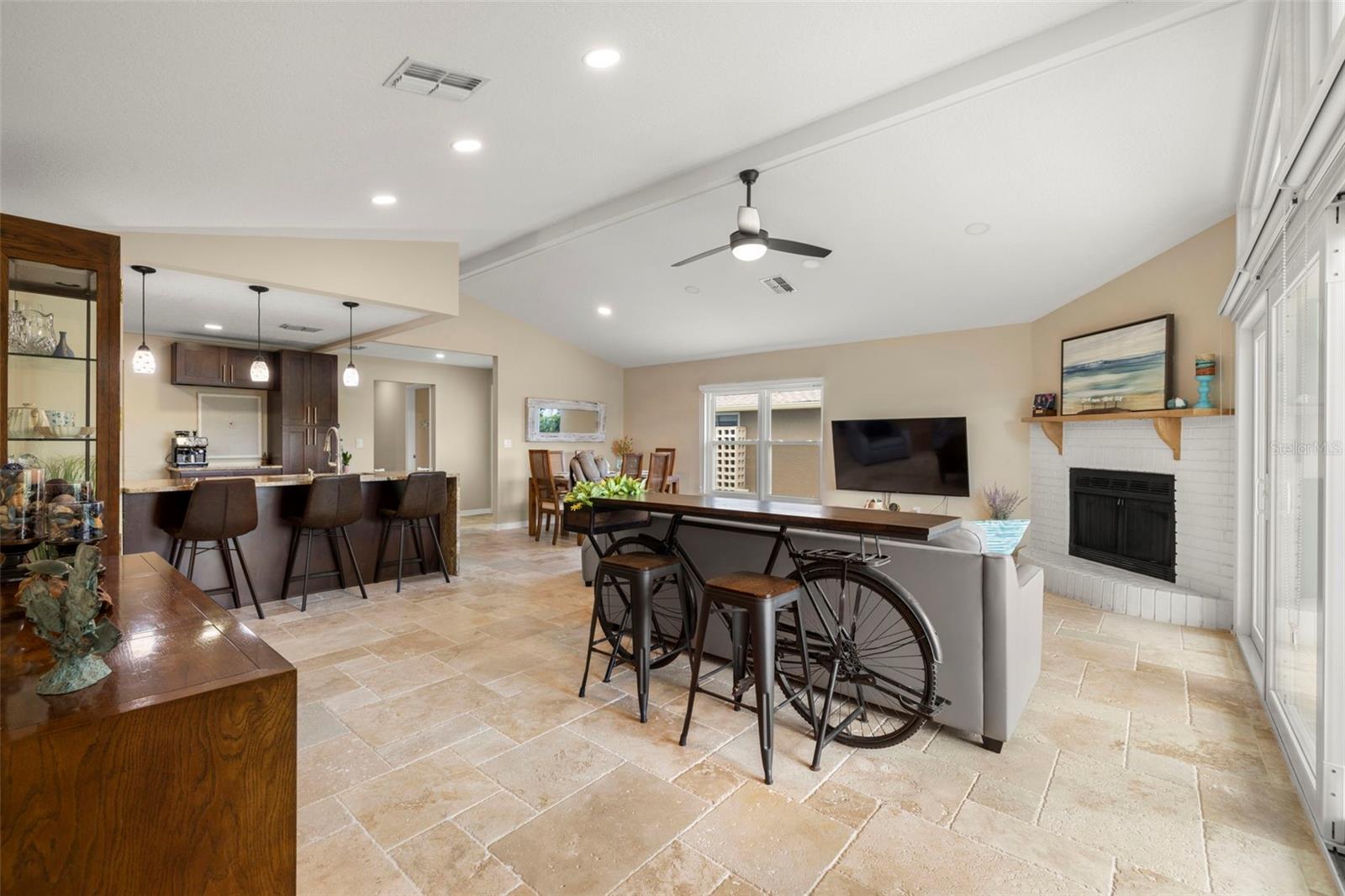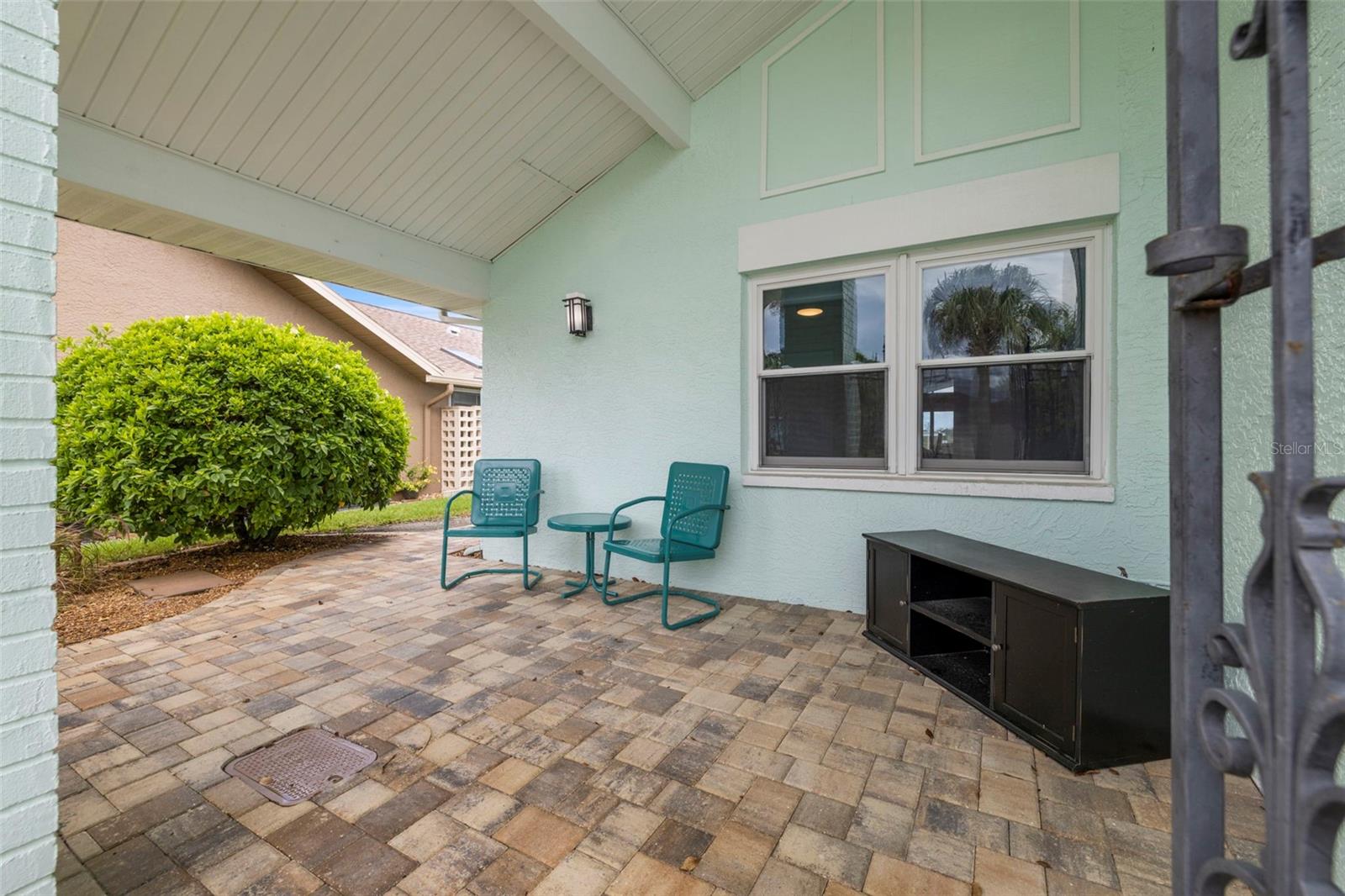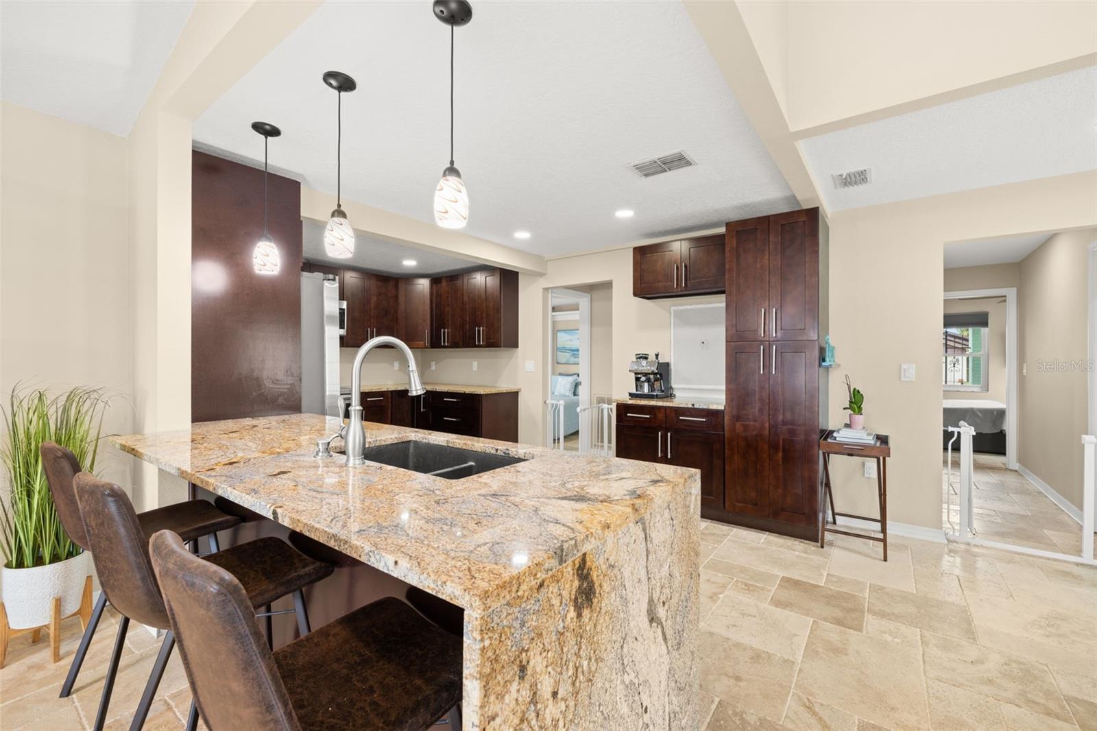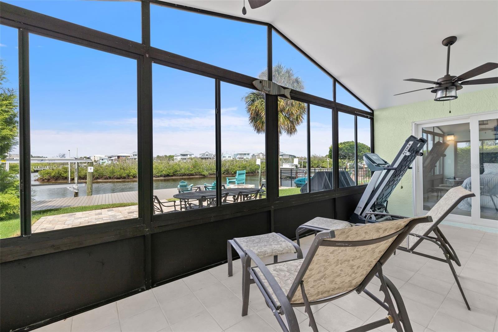 Nestled in the serene Gulf Harbors community, this stunning 3-bedroom, 2-bathroom waterfront home offers nearly 1,700 sqft of meticulously renovated living space. As you arrive, notice the beautiful pavered driveway and walkway replaced in 2022, leading you through the charming wrought-iron gated front porch. The home’s exterior shines with fresh, low-maintenance landscaping, a new roof installed in 2021, and recent exterior paint. Step inside to find an inviting atmosphere filled with natural light where travertine tile floors, replaced in 2021, meet sophisticated window treatments and contemporary lighting fixtures. The heart of this home is the designer kitchen, completely remodeled in 2021, featuring a stunning waterfall granite countertop at the breakfast bar, espresso wood soft-close cabinets, granite countertops, and stainless steel appliances. This open-concept space is anchored by a cozy white brick fireplace, creating the perfect setting for family gatherings and holiday celebrations. The owner’s suite is a true retreat, offering a private exit to the patio, a spacious walk-in closet with a custom closet system, and an ensuite bathroom with dual sinks, a stand-up shower, and additional closet space. The split bedroom floor plan ensures privacy, with an updated guest bathroom nearby, featuring granite countertops, new cabinets, and all-new plumbing fixtures, also updated in 2021.Convenience is key with an indoor laundry room that includes added cabinetry and a utility sink. The water heater and entire home was re-plumbed in 2021 providing peace of mind for years to come. Step outside through hurricane-impact triple sliding glass doors to your screened-in lanai, overlooking a waterfront oasis. The outdoor pavered patio with built in fire pit leads to your private dock with a newly installed (2023) 10,000 lb boat lift, perfect for quick access to the Gulf of Mexico. Whether you’re fishing off the dock or kayaking through the nearby Robert Crown Wilderness Area, outdoor adventures await right in your backyard. Residents of Gulf Harbors may also enjoy a private beach access for members only. To ensure your comfort in Florida’s climate, a sprinkler system with mosquito/noseeum control was installed, making outdoor living a pleasure year-round. Perfectly located with easy access to US-19, this home is just minutes away from shopping, dining, and offers a straightforward commute. Don't miss out on the chance to own this exceptional waterfront property, where you can create memories for years to come!