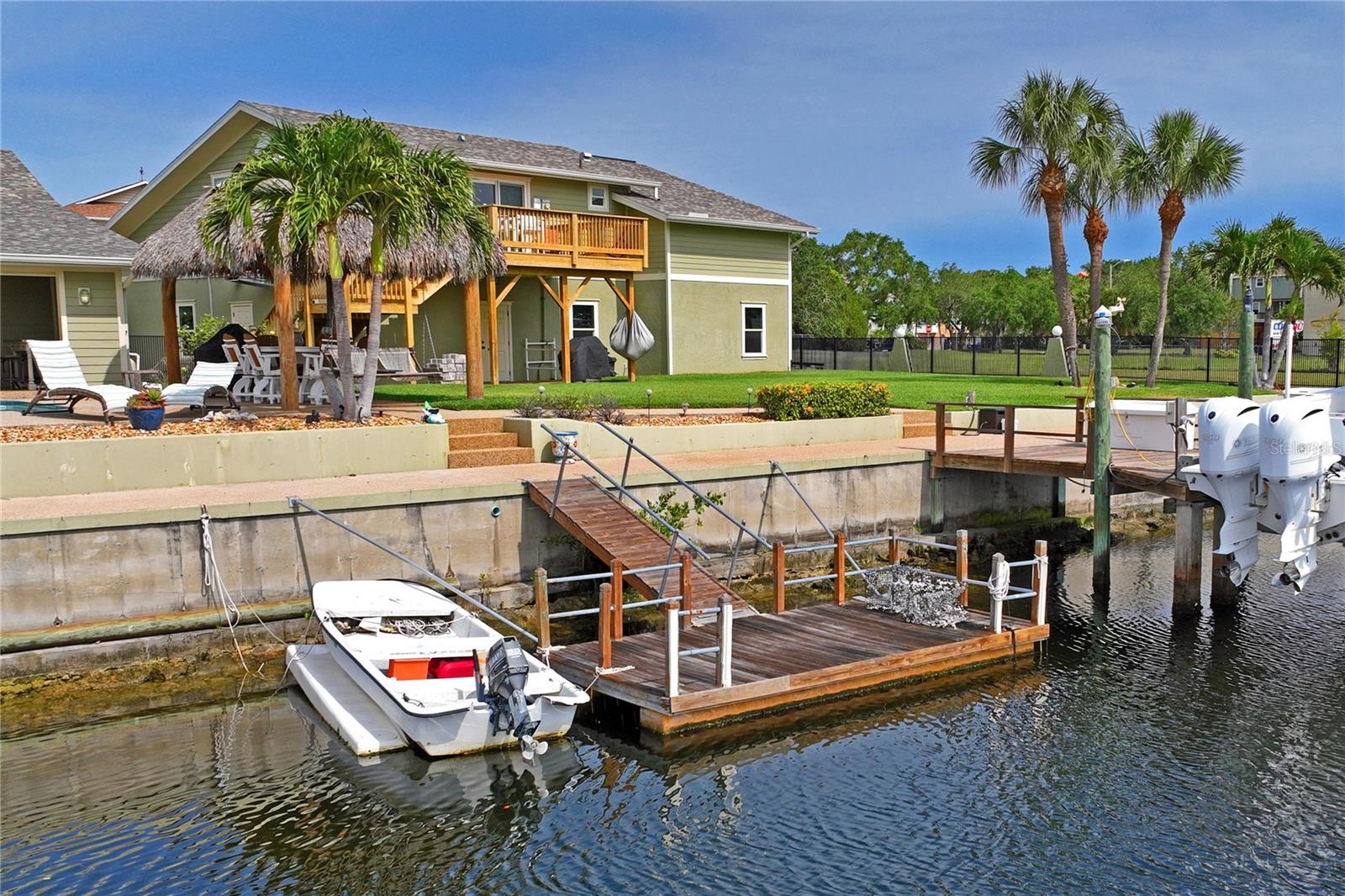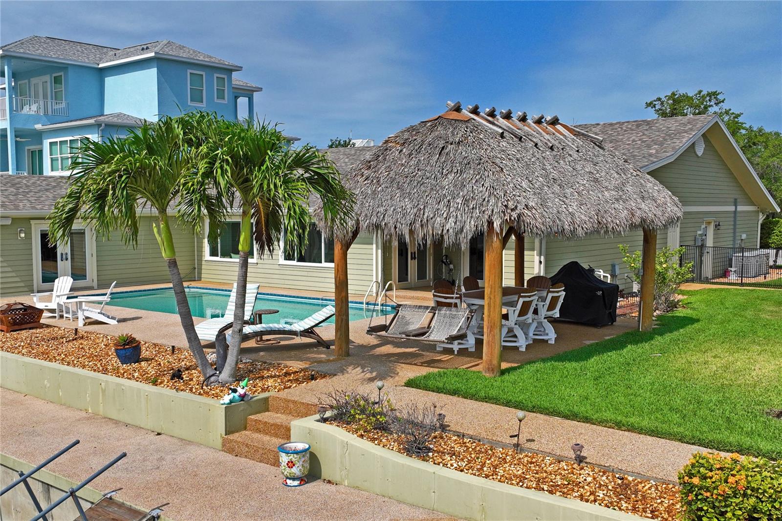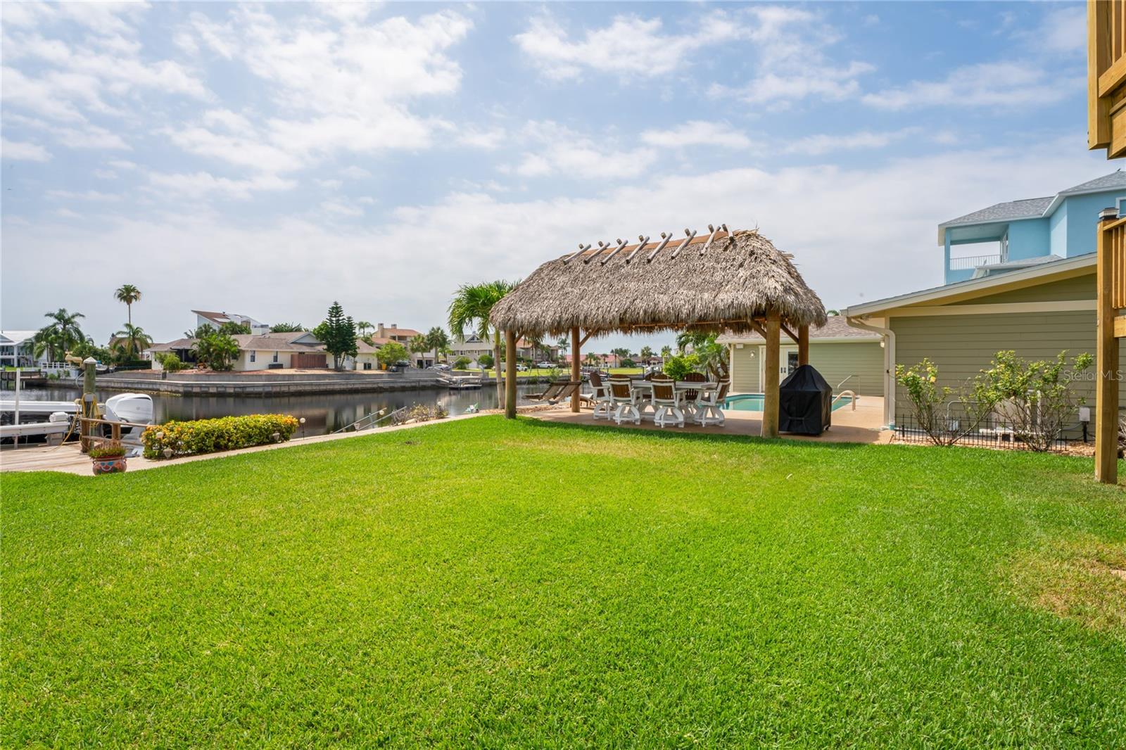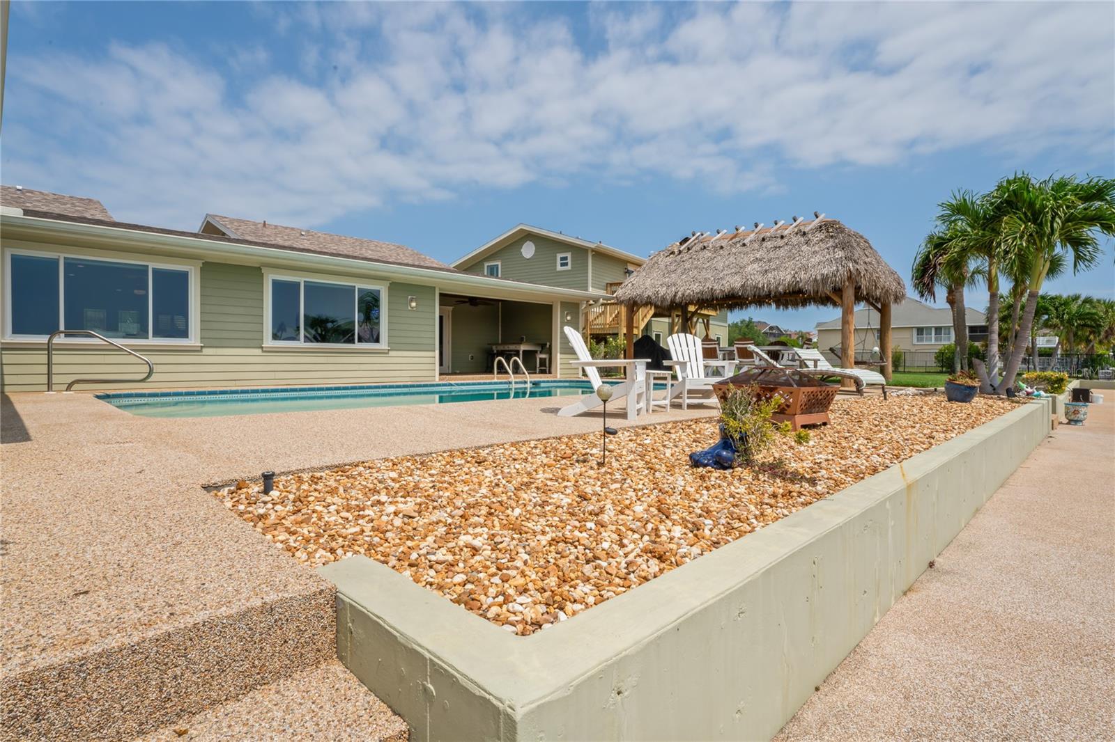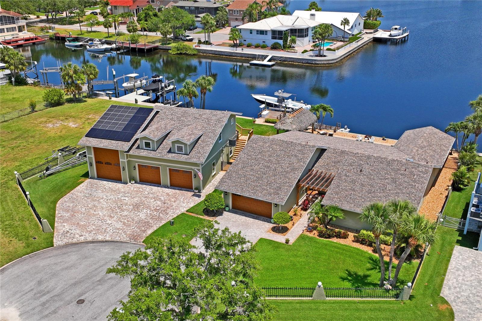 Your paradise awaits! And this lovely home stands proudly after two hurricanes and no damage or flooding..well built, well insulated!! This exceptional waterfront home, fully restored in 2017, offers the perfect blend of luxury and comfort. The Main house features 3 bedrooms, 2 full bathrooms, and one half-bath, all meticulously designed for style and convenience. A pergola with a seating area leads to the glass double-door entrance. Inside, the expansive great room greets you with breathtaking water views. The chef's kitchen stands out with its vaulted ceiling and beams, granite counters, wood cabinets, stainless steel appliances, pantry closet, and double ovens. French doors open to a lanai and outside oasis. The primary suite, accessed through French doors, includes an attached bonus room currently used as a gym. The spa-like en-suite bathroom features double sinks, granite counters, a stand-alone soaking tub, a glass-enclosed shower, a wet closet, an impressive walk-in closet, and a solar tube for natural lighting. The double waterfront lot is a paradise for outdoor enthusiasts. It includes a 16,000-pound boat lift and a 14x30 open-air saltwater pool. The Tiki Hut with power and outdoor lighting creates an ideal setting for evening gatherings. The property is eco-friendly, with a solar water heater and 20 owned solar panels providing energy-efficient hot water heating. Inside laundry/mud room. All closets designed by California Closets. Plantation shutters add a touch of elegance to the windows. The main house has a two-car attached garage. Above the expansive detached 45'x38' garage, built in 2017, is a charming carriage house. This additional living space includes a full kitchen with stainless steel appliances, 2 bedrooms, a bathroom with a tub/shower combo and double sinks, a bonus room, a storage room, and a balcony offering stunning water views. The garage itself accommodates RV parking and space for 4-6 cars, providing ample room for all your vehicles and storage needs. The property is partially fenced and beautifully landscaped, featuring an open covered lanai with a Roll-a-guard door for added convenience and security. This waterfront gem offers everything you need for luxurious living and more. Don’t miss this opportunity to own a slice of paradise designed with every detail in mind.
