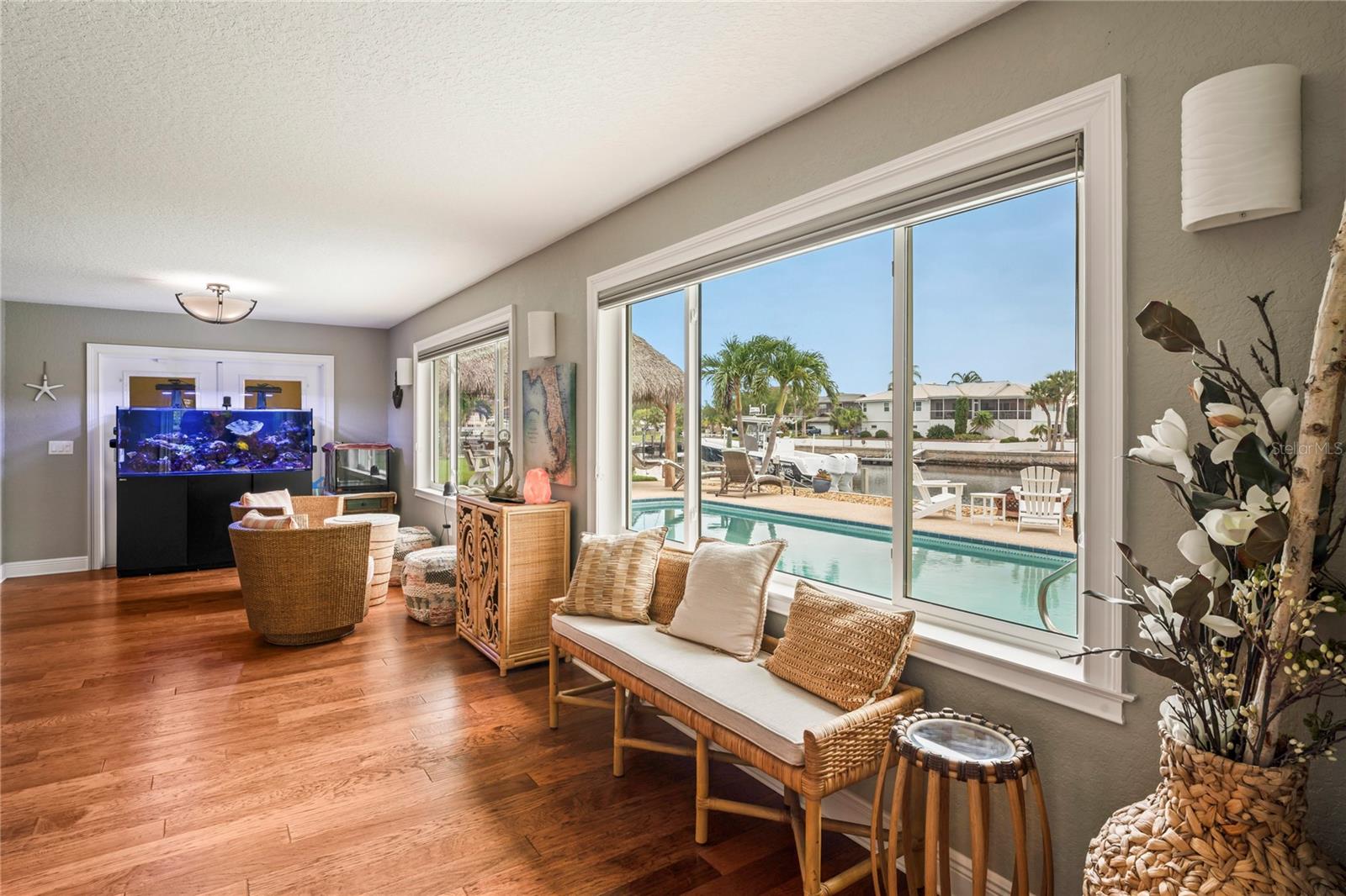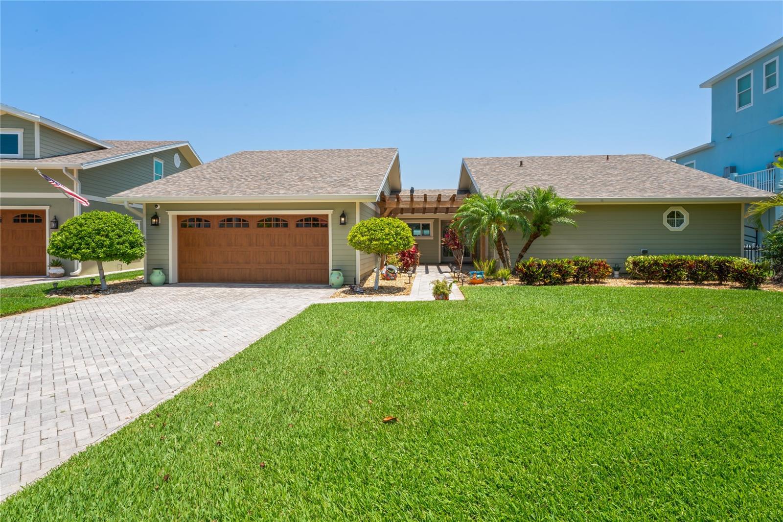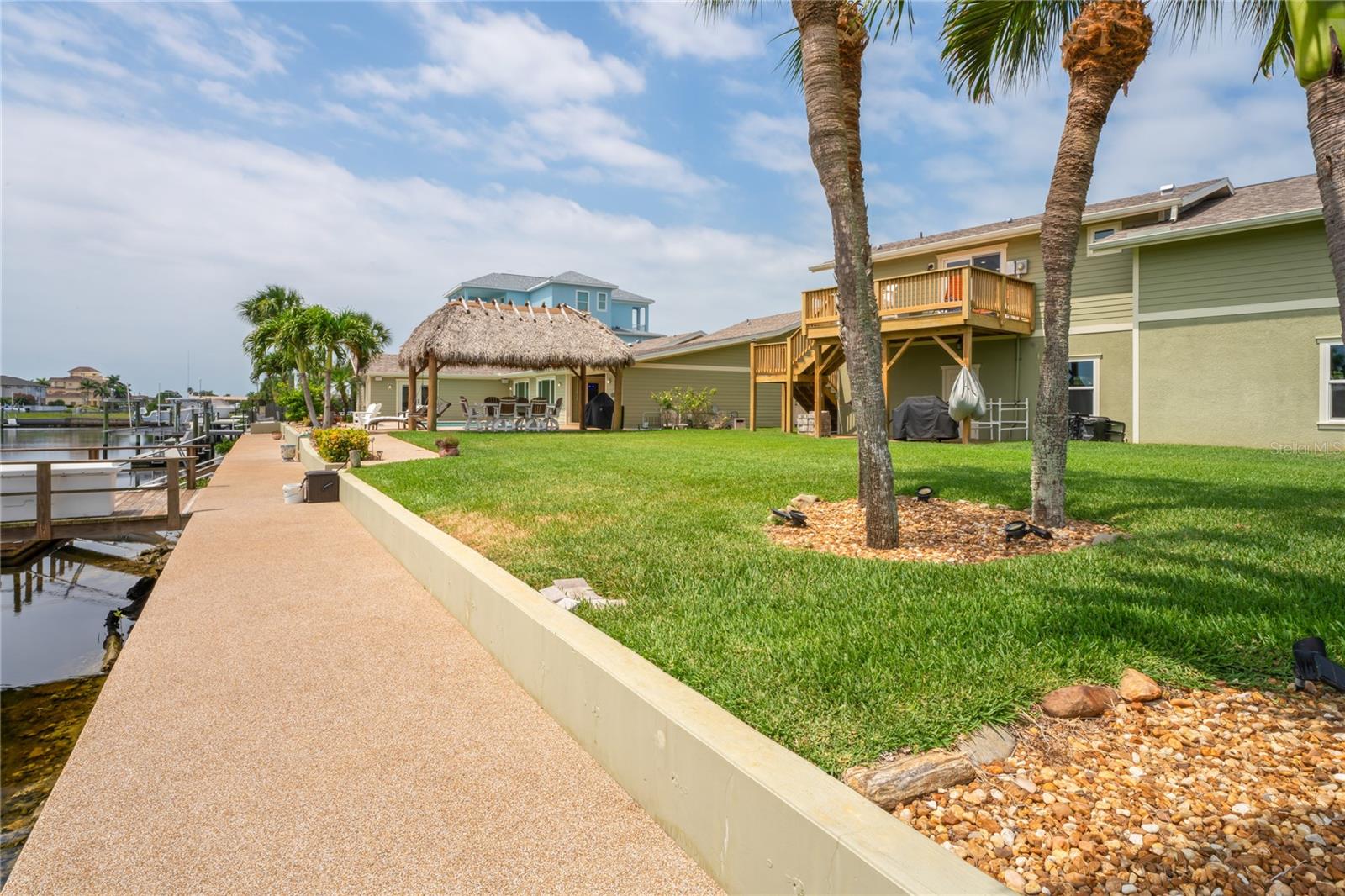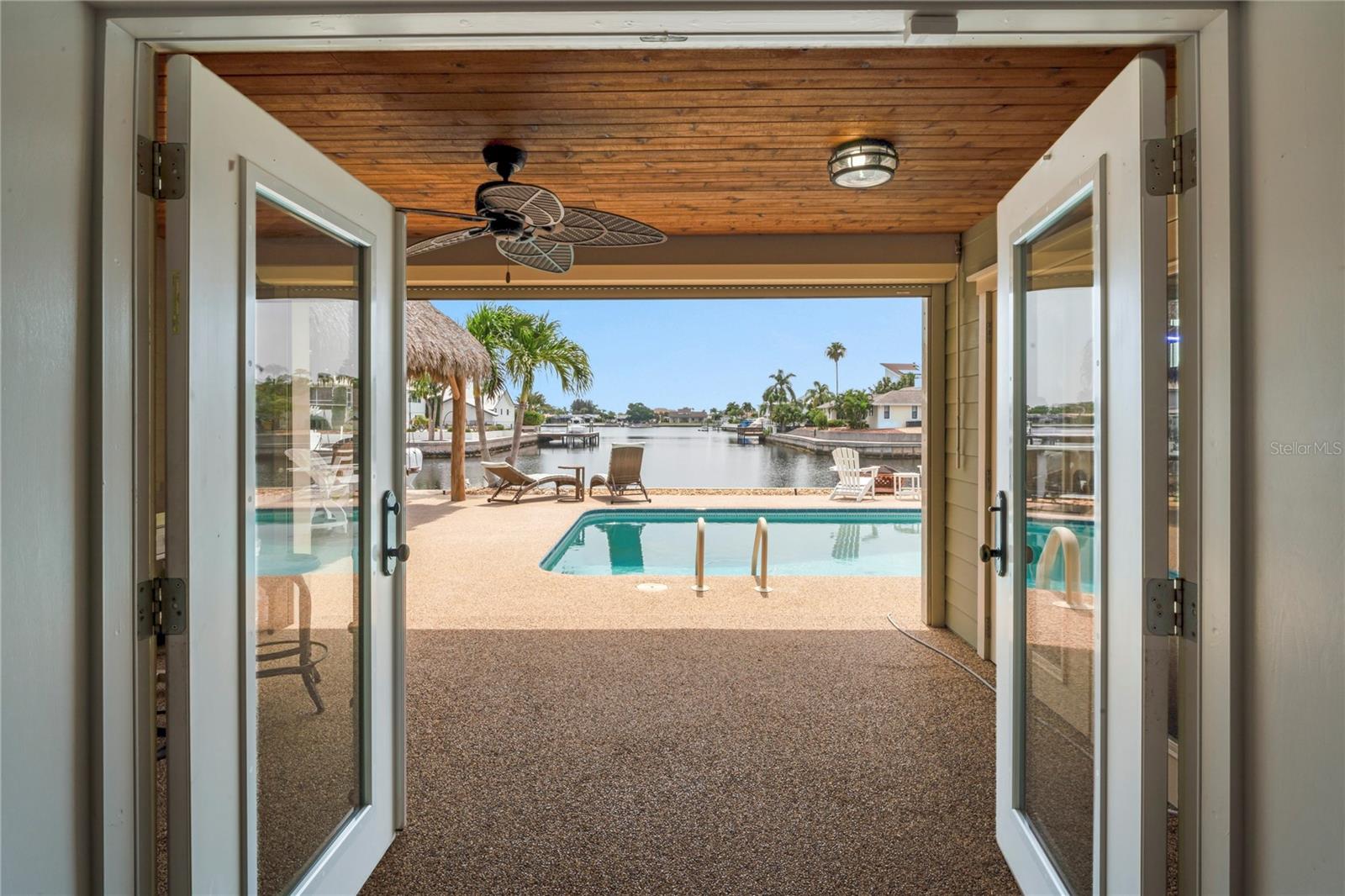 Your paradise awaits! And this lovely home stands proudly after two hurricanes and no damage or flooding..well built, well insulated!! This exceptional waterfront home, fully restored in 2017, offers the perfect blend of luxury and comfort. The Main house features 3 bedrooms, 2 full bathrooms, and one half-bath, all meticulously designed for style and convenience. A pergola with a seating area leads to the glass double-door entrance. Inside, the expansive great room greets you with breathtaking water views. The chef's kitchen stands out with its vaulted ceiling and beams, granite counters, wood cabinets, stainless steel appliances, pantry closet, and double ovens. French doors open to a lanai and outside oasis. The primary suite, accessed through French doors, includes an attached bonus room currently used as a gym. The spa-like en-suite bathroom features double sinks, granite counters, a stand-alone soaking tub, a glass-enclosed shower, a wet closet, an impressive walk-in closet, and a solar tube for natural lighting. The double waterfront lot is a paradise for outdoor enthusiasts. It includes a 16,000-pound boat lift and a 14x30 open-air saltwater pool. The Tiki Hut with power and outdoor lighting creates an ideal setting for evening gatherings. The property is eco-friendly, with a solar water heater and 20 owned solar panels providing energy-efficient hot water heating. Inside laundry/mud room. All closets designed by California Closets. Plantation shutters add a touch of elegance to the windows. The main house has a two-car attached garage. Above the expansive detached 45'x38' garage, built in 2017, is a charming carriage house. This additional living space includes a full kitchen with stainless steel appliances, 2 bedrooms, a bathroom with a tub/shower combo and double sinks, a bonus room, a storage room, and a balcony offering stunning water views. The garage itself accommodates RV parking and space for 4-6 cars, providing ample room for all your vehicles and storage needs. The property is partially fenced and beautifully landscaped, featuring an open covered lanai with a Roll-a-guard door for added convenience and security. This waterfront gem offers everything you need for luxurious living and more. Don’t miss this opportunity to own a slice of paradise designed with every detail in mind.