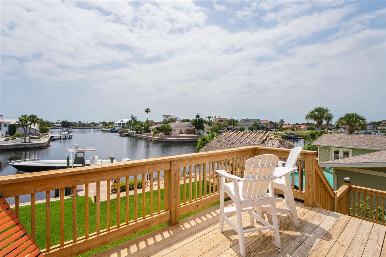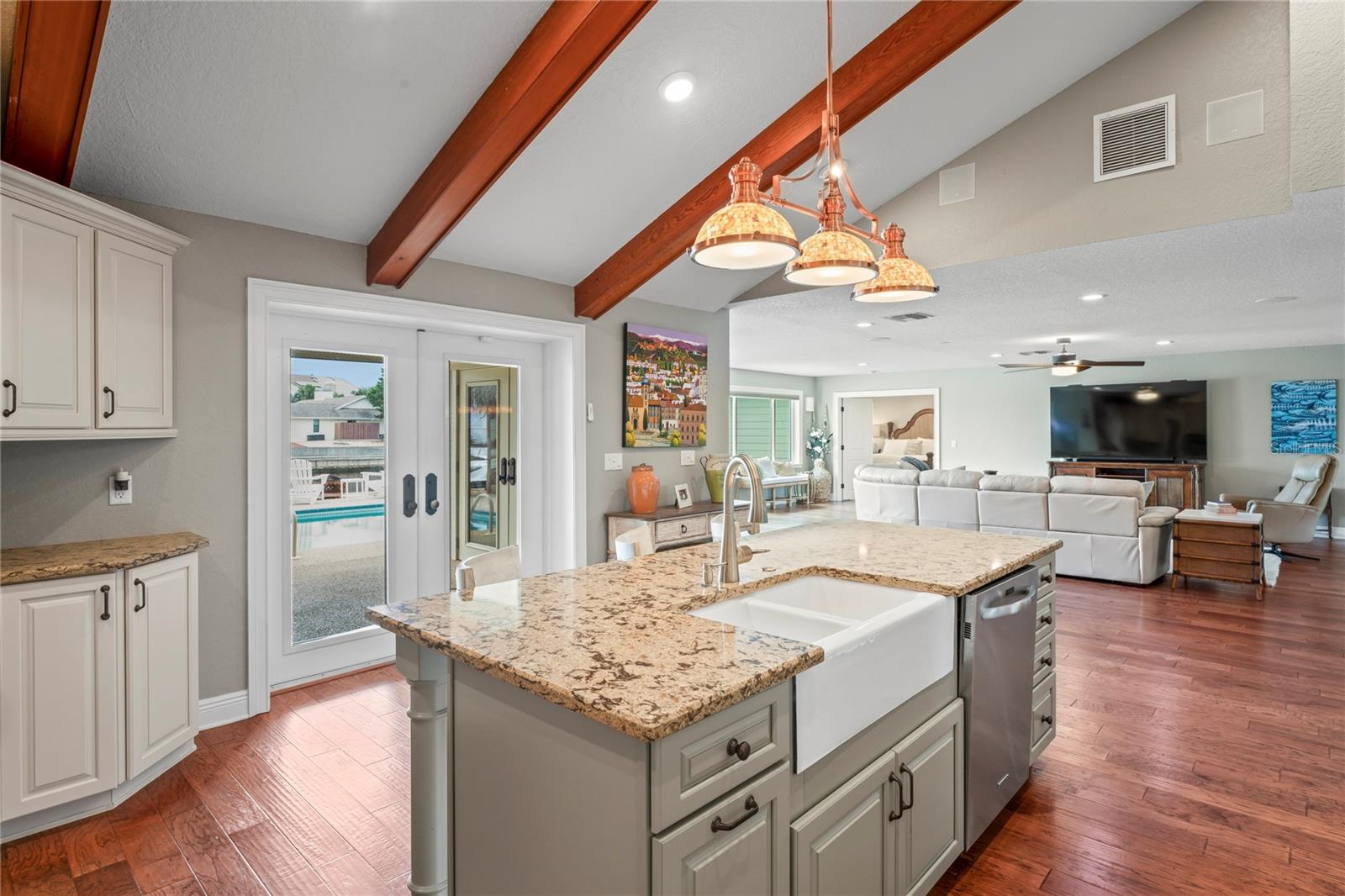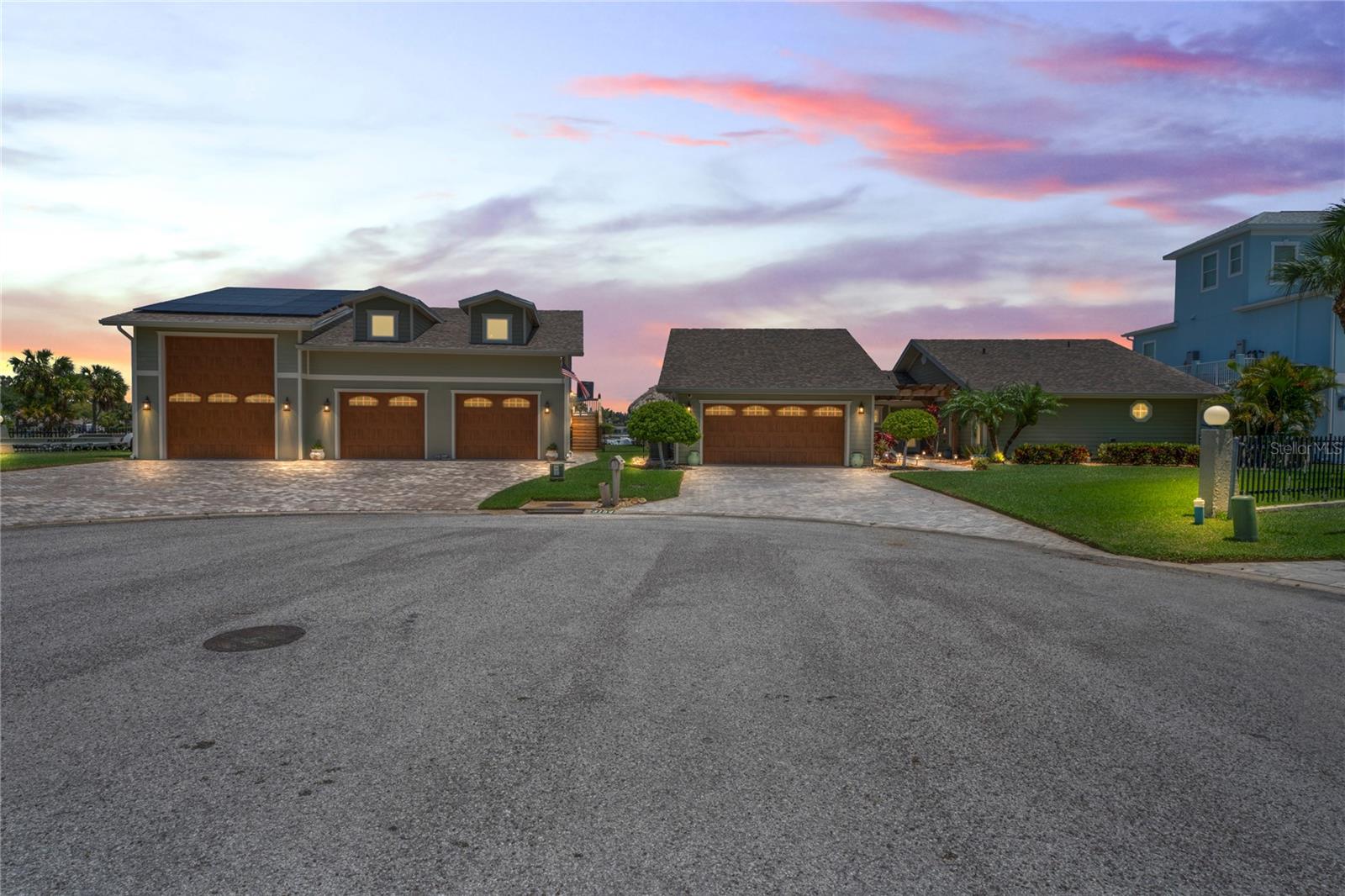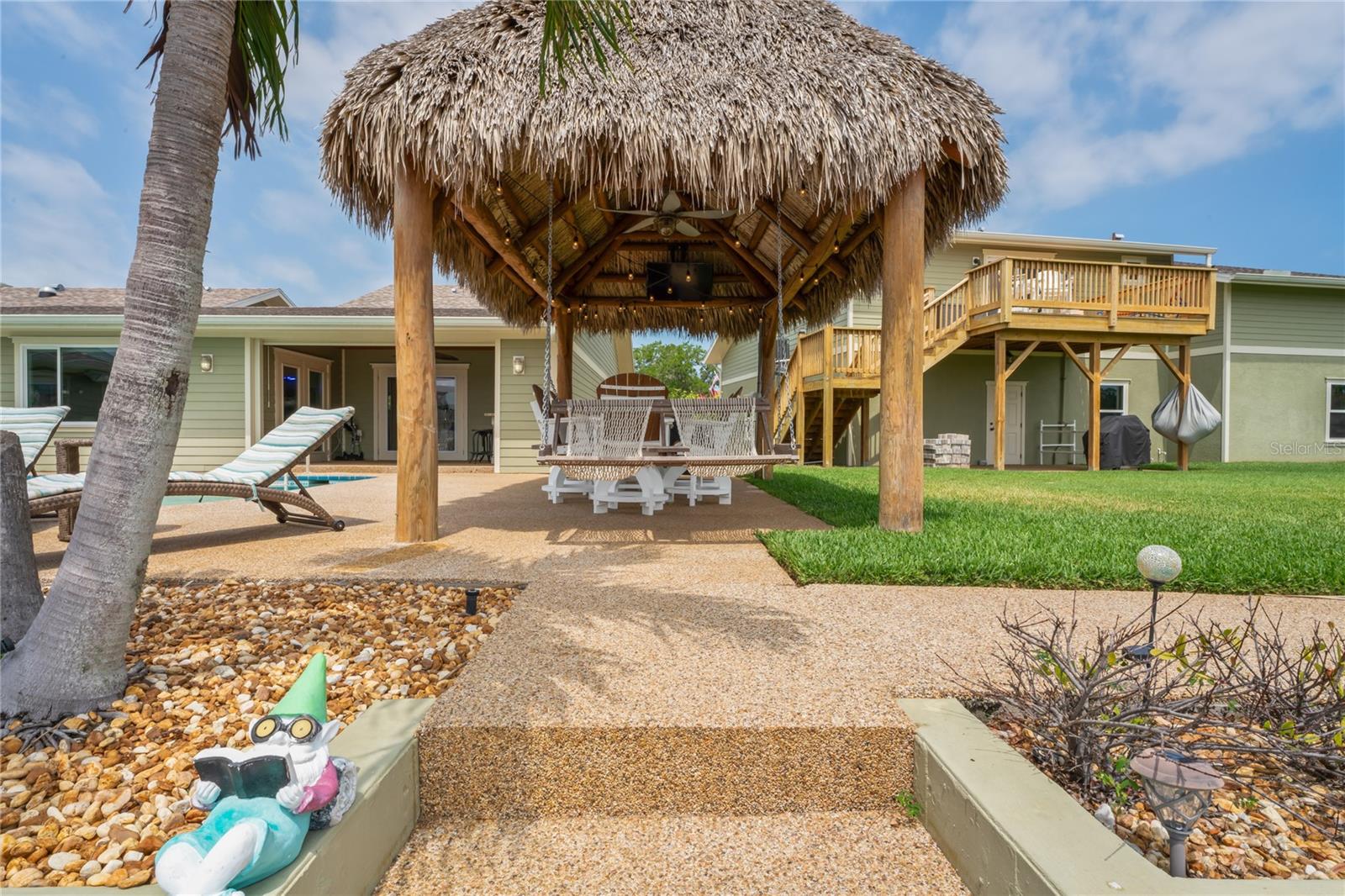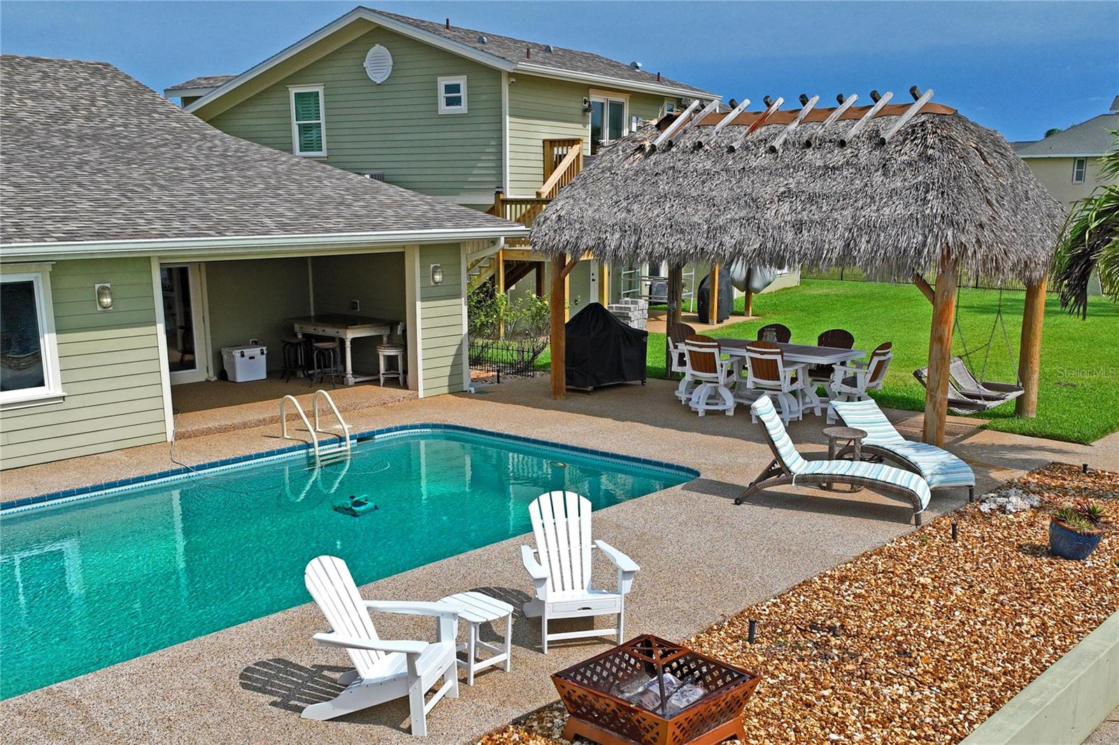 Your paradise awaits! And this lovely home stands proudly after two hurricanes and no damage or flooding..well built, well insulated!! This exceptional waterfront home, fully restored in 2017, offers the perfect blend of luxury and comfort. The Main house features 3 bedrooms, 2 full bathrooms, and one half-bath, all meticulously designed for style and convenience. A pergola with a seating area leads to the glass double-door entrance. Inside, the expansive great room greets you with breathtaking water views. The chef's kitchen stands out with its vaulted ceiling and beams, granite counters, wood cabinets, stainless steel appliances, pantry closet, and double ovens. French doors open to a lanai and outside oasis. The primary suite, accessed through French doors, includes an attached bonus room currently used as a gym. The spa-like en-suite bathroom features double sinks, granite counters, a stand-alone soaking tub, a glass-enclosed shower, a wet closet, an impressive walk-in closet, and a solar tube for natural lighting. The double waterfront lot is a paradise for outdoor enthusiasts. It includes a 16,000-pound boat lift and a 14x30 open-air saltwater pool. The Tiki Hut with power and outdoor lighting creates an ideal setting for evening gatherings. The property is eco-friendly, with a solar water heater and 20 owned solar panels providing energy-efficient hot water heating. Inside laundry/mud room. All closets designed by California Closets. Plantation shutters add a touch of elegance to the windows. The main house has a two-car attached garage. Above the expansive detached 45'x38' garage, built in 2017, is a charming carriage house. This additional living space includes a full kitchen with stainless steel appliances, 2 bedrooms, a bathroom with a tub/shower combo and double sinks, a bonus room, a storage room, and a balcony offering stunning water views. The garage itself accommodates RV parking and space for 4-6 cars, providing ample room for all your vehicles and storage needs. The property is partially fenced and beautifully landscaped, featuring an open covered lanai with a Roll-a-guard door for added convenience and security. This waterfront gem offers everything you need for luxurious living and more. Don’t miss this opportunity to own a slice of paradise designed with every detail in mind.