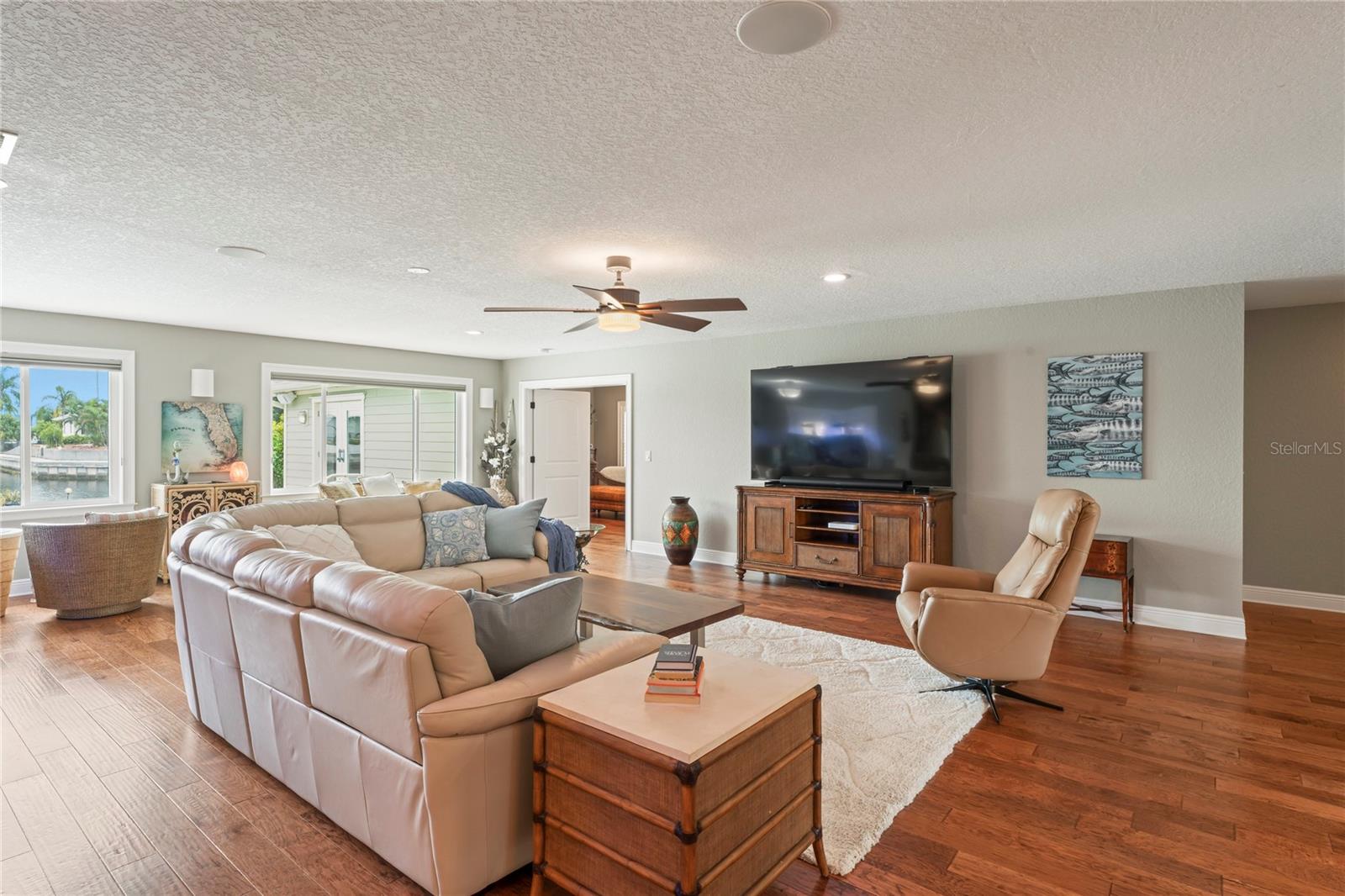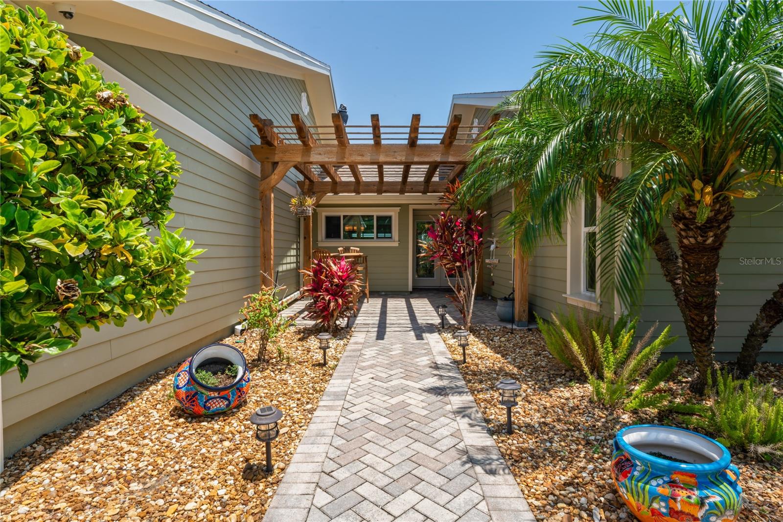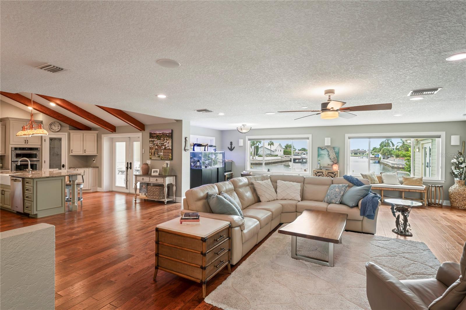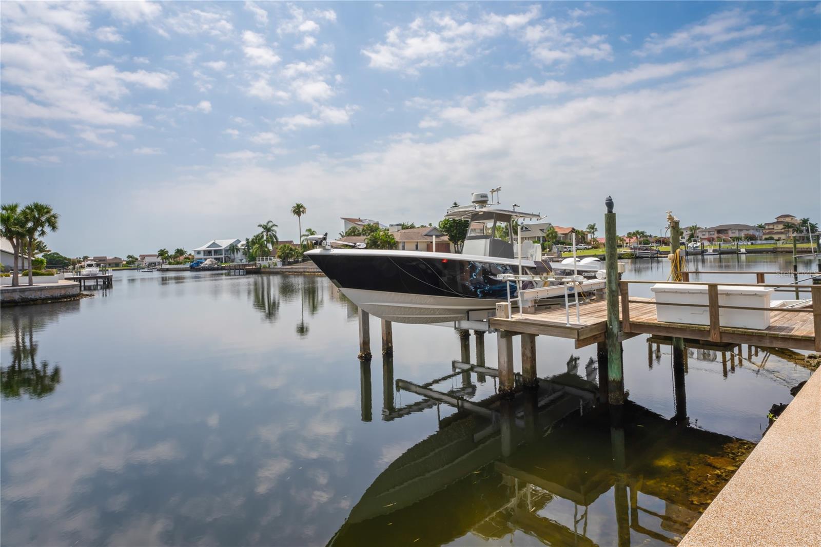 Your paradise awaits! And this lovely home stands proudly after two hurricanes and no damage or flooding..well built, well insulated!! This exceptional waterfront home, fully restored in 2017, offers the perfect blend of luxury and comfort. The Main house features 3 bedrooms, 2 full bathrooms, and one half-bath, all meticulously designed for style and convenience. A pergola with a seating area leads to the glass double-door entrance. Inside, the expansive great room greets you with breathtaking water views. The chef's kitchen stands out with its vaulted ceiling and beams, granite counters, wood cabinets, stainless steel appliances, pantry closet, and double ovens. French doors open to a lanai and outside oasis. The primary suite, accessed through French doors, includes an attached bonus room currently used as a gym. The spa-like en-suite bathroom features double sinks, granite counters, a stand-alone soaking tub, a glass-enclosed shower, a wet closet, an impressive walk-in closet, and a solar tube for natural lighting. The double waterfront lot is a paradise for outdoor enthusiasts. It includes a 16,000-pound boat lift and a 14x30 open-air saltwater pool. The Tiki Hut with power and outdoor lighting creates an ideal setting for evening gatherings. The property is eco-friendly, with a solar water heater and 20 owned solar panels providing energy-efficient hot water heating. Inside laundry/mud room. All closets designed by California Closets. Plantation shutters add a touch of elegance to the windows. The main house has a two-car attached garage. Above the expansive detached 45'x38' garage, built in 2017, is a charming carriage house. This additional living space includes a full kitchen with stainless steel appliances, 2 bedrooms, a bathroom with a tub/shower combo and double sinks, a bonus room, a storage room, and a balcony offering stunning water views. The garage itself accommodates RV parking and space for 4-6 cars, providing ample room for all your vehicles and storage needs. The property is partially fenced and beautifully landscaped, featuring an open covered lanai with a Roll-a-guard door for added convenience and security. This waterfront gem offers everything you need for luxurious living and more. Don’t miss this opportunity to own a slice of paradise designed with every detail in mind.