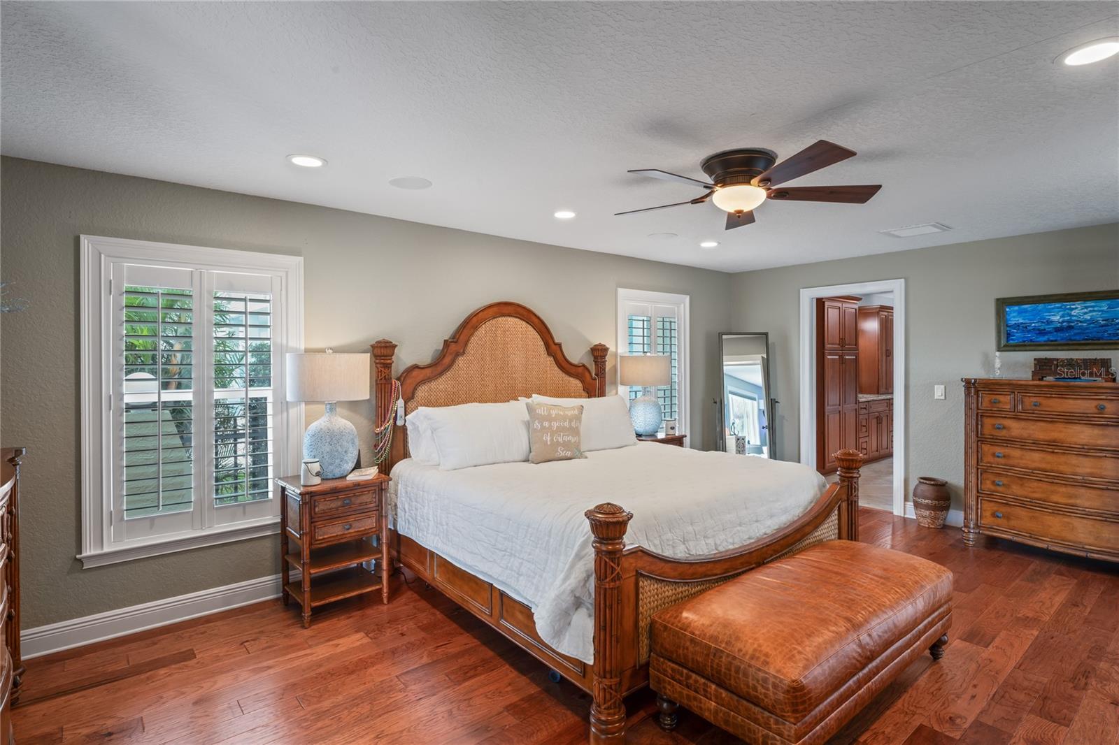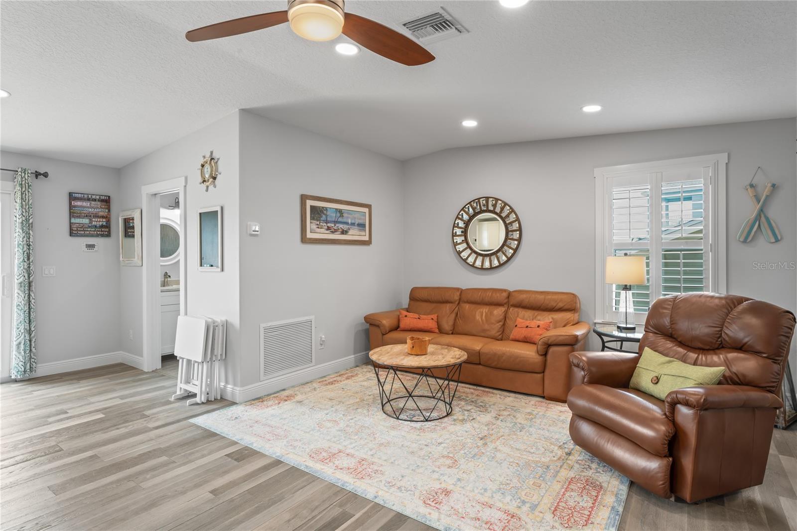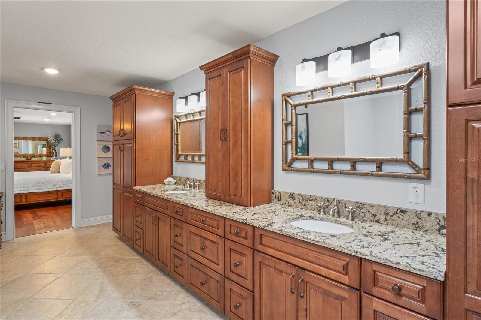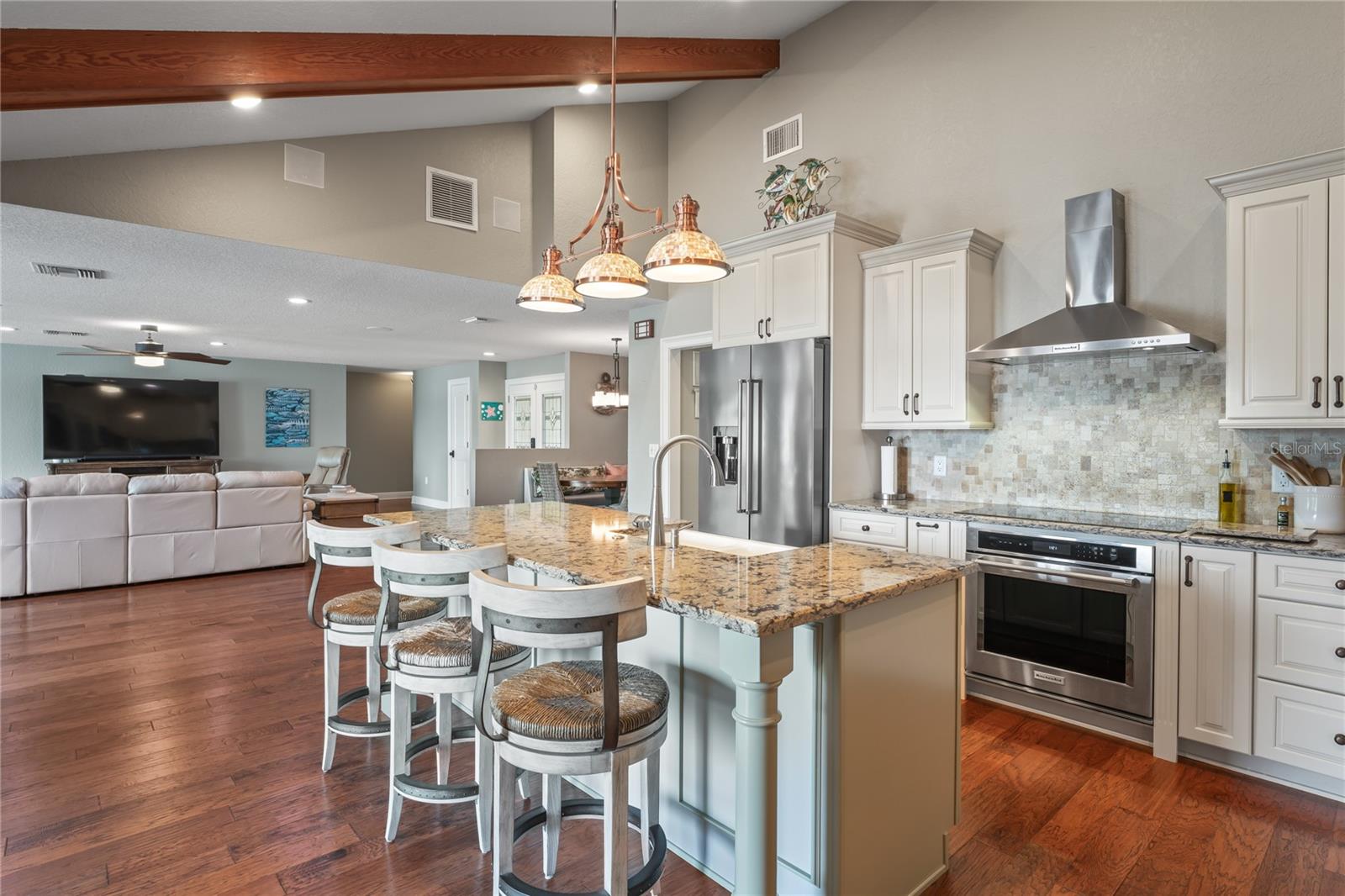 Your paradise awaits! And this lovely home stands proudly after two hurricanes and no damage or flooding..well built, well insulated!! This exceptional waterfront home, fully restored in 2017, offers the perfect blend of luxury and comfort. The Main house features 3 bedrooms, 2 full bathrooms, and one half-bath, all meticulously designed for style and convenience. A pergola with a seating area leads to the glass double-door entrance. Inside, the expansive great room greets you with breathtaking water views. The chef's kitchen stands out with its vaulted ceiling and beams, granite counters, wood cabinets, stainless steel appliances, pantry closet, and double ovens. French doors open to a lanai and outside oasis. The primary suite, accessed through French doors, includes an attached bonus room currently used as a gym. The spa-like en-suite bathroom features double sinks, granite counters, a stand-alone soaking tub, a glass-enclosed shower, a wet closet, an impressive walk-in closet, and a solar tube for natural lighting. The double waterfront lot is a paradise for outdoor enthusiasts. It includes a 16,000-pound boat lift and a 14x30 open-air saltwater pool. The Tiki Hut with power and outdoor lighting creates an ideal setting for evening gatherings. The property is eco-friendly, with a solar water heater and 20 owned solar panels providing energy-efficient hot water heating. Inside laundry/mud room. All closets designed by California Closets. Plantation shutters add a touch of elegance to the windows. The main house has a two-car attached garage. Above the expansive detached 45'x38' garage, built in 2017, is a charming carriage house. This additional living space includes a full kitchen with stainless steel appliances, 2 bedrooms, a bathroom with a tub/shower combo and double sinks, a bonus room, a storage room, and a balcony offering stunning water views. The garage itself accommodates RV parking and space for 4-6 cars, providing ample room for all your vehicles and storage needs. The property is partially fenced and beautifully landscaped, featuring an open covered lanai with a Roll-a-guard door for added convenience and security. This waterfront gem offers everything you need for luxurious living and more. Don’t miss this opportunity to own a slice of paradise designed with every detail in mind.