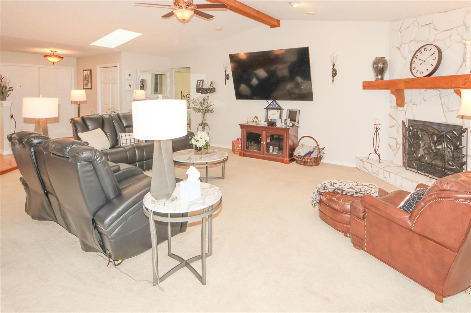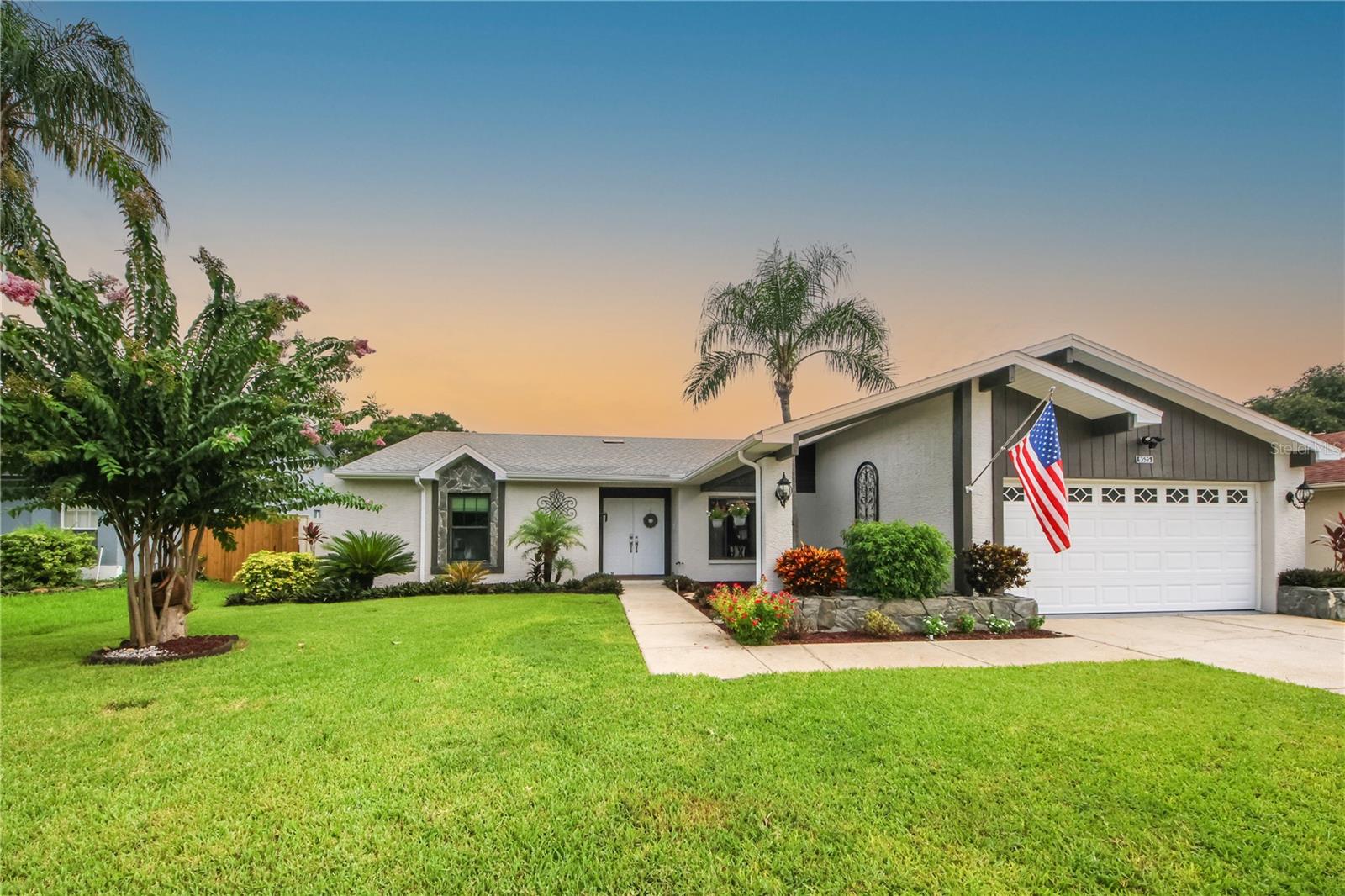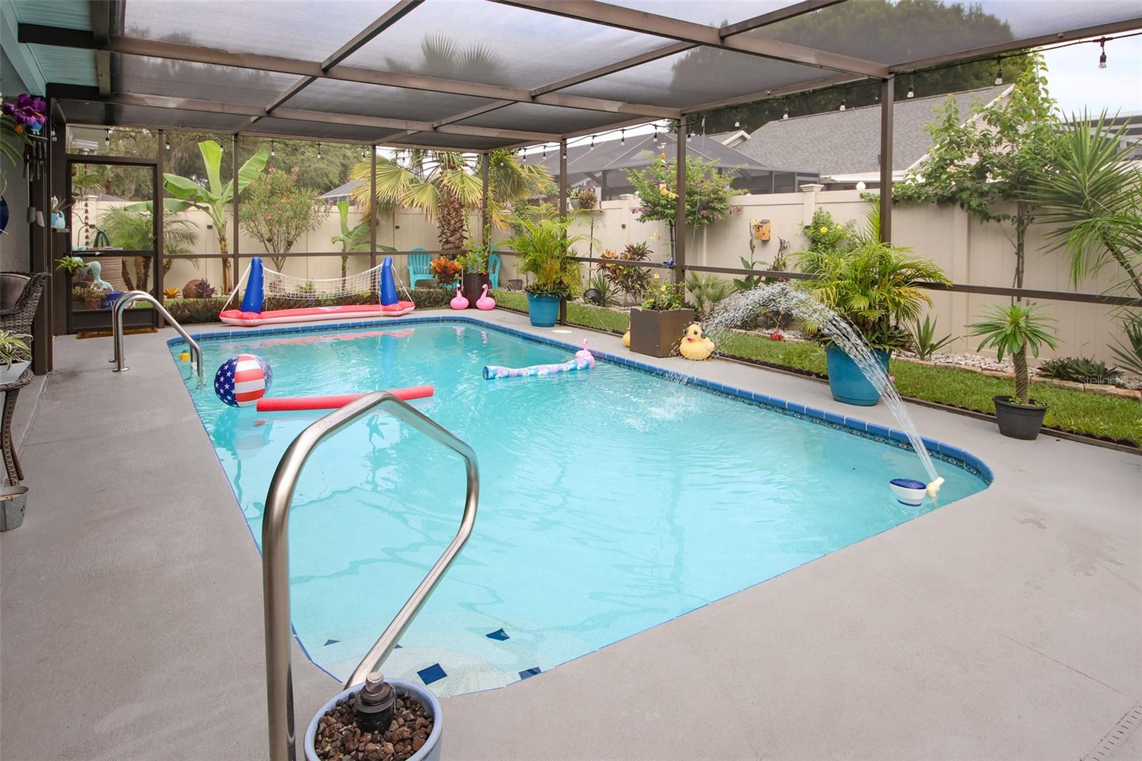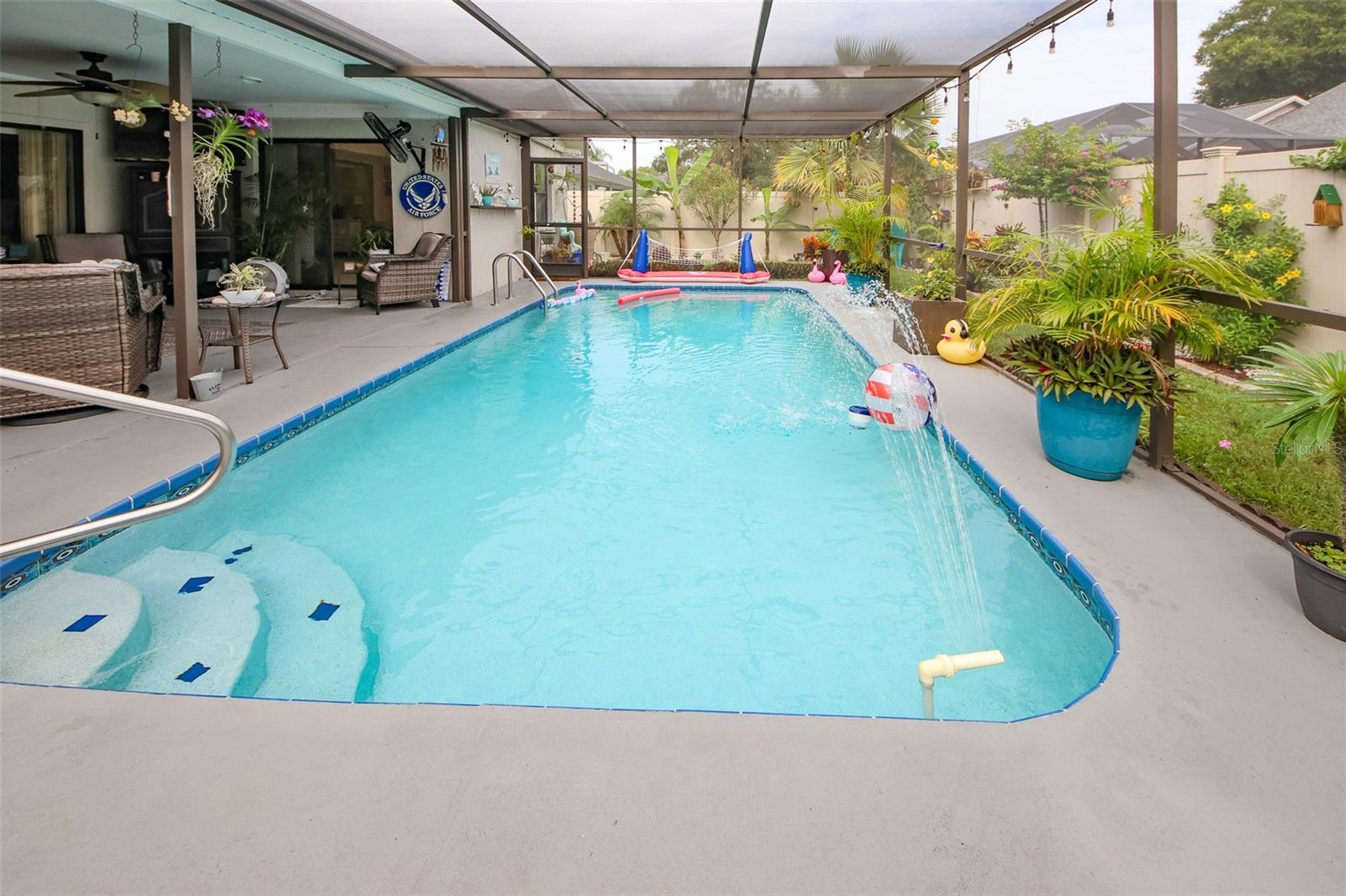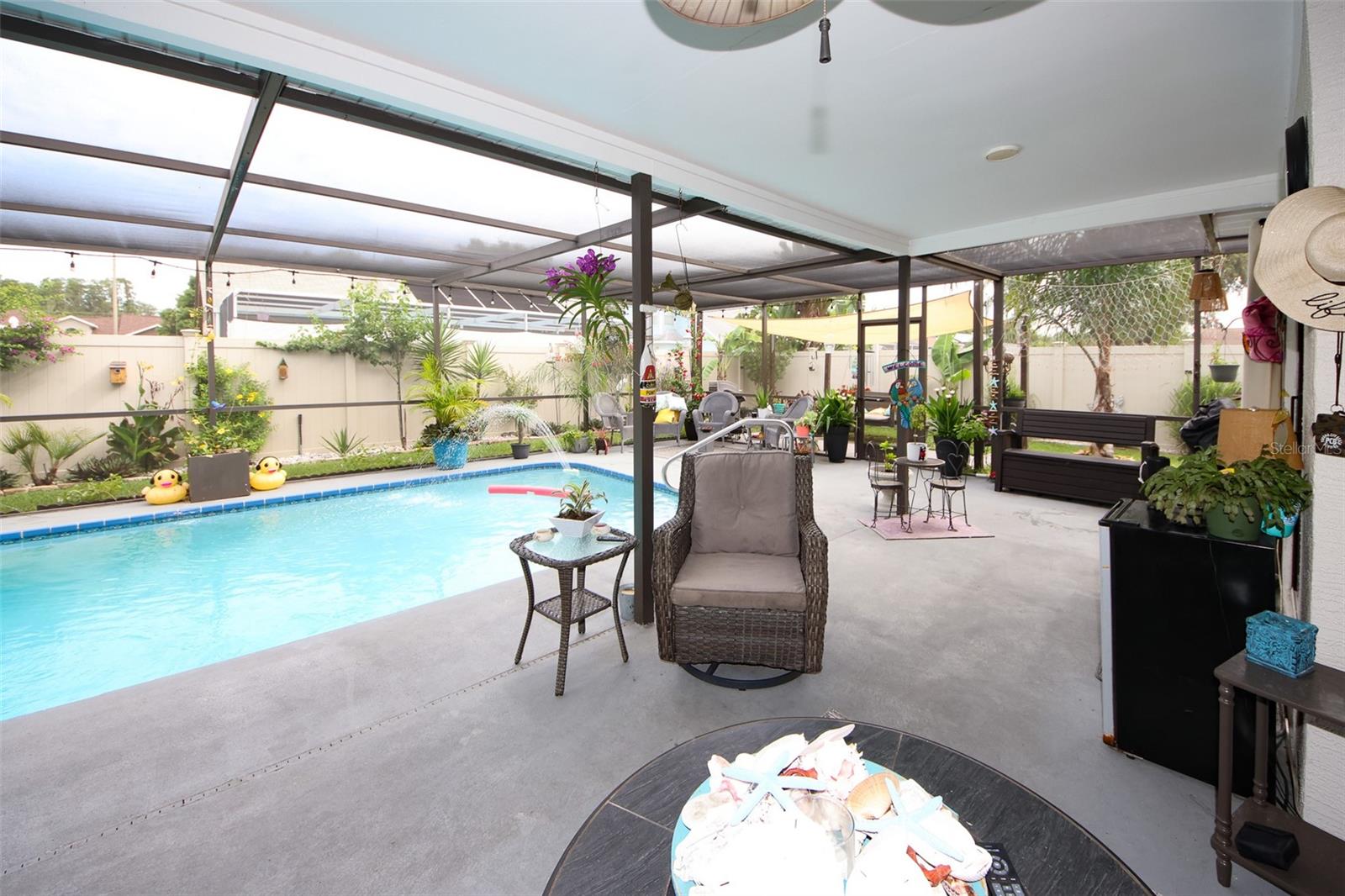 This beautifully maintained pool home features a double-door entryway, an open floor plan with a wood-burning fireplace and skylights. The dining room has real wood floors, overlooking the open floor plan, cathedral ceilings, and fireplace. Unique features include an outside pool shower, a large pool deck, and a grill area. In addition, one of the bedrooms has a connected bonus room attached that opens to the pool deck (the bonus room is 15x11). The fenced yard features private seating areas and a grill patio area next to the pool deck. The roof was replaced in 2022, and the AC in 2016. The hot water tank was also replaced in 2022, and there's a whole house water purification system, irrigation, and updated windows throughout. Attic storage accessible by stair pull down in garage. Ring system present and will convey with sale. Additionally, the home's interior and exterior were painted within the past two years. The pool equipment, rain barrel, outside television, dry bar, and outside fridge all convey with the house. This is a must-see property, offering the best of Florida living, and it's conveniently located close to shopping, county parks, golf courses, and beaches, with easy access for Tampa commuters.
