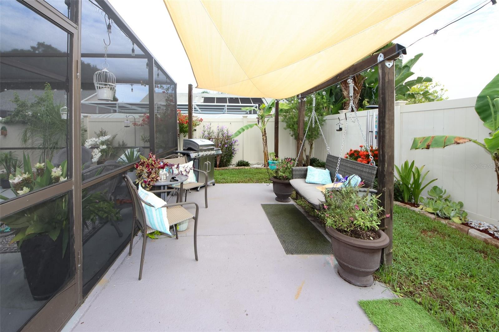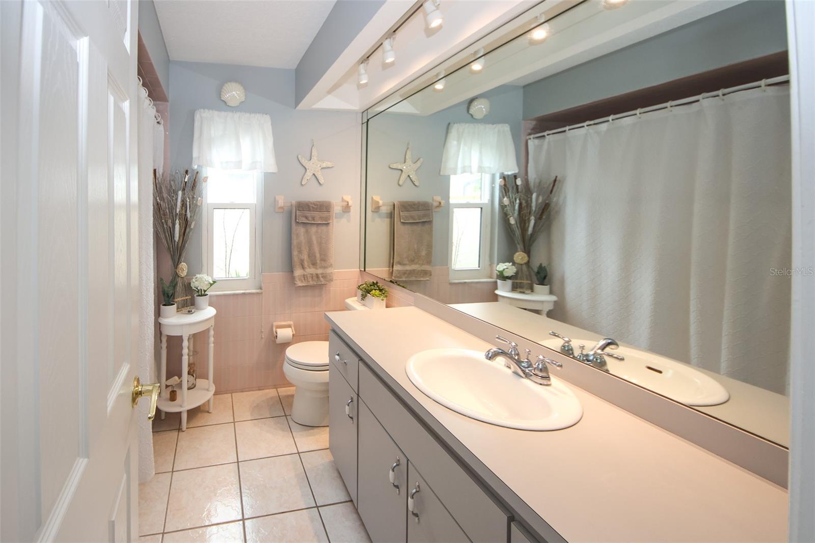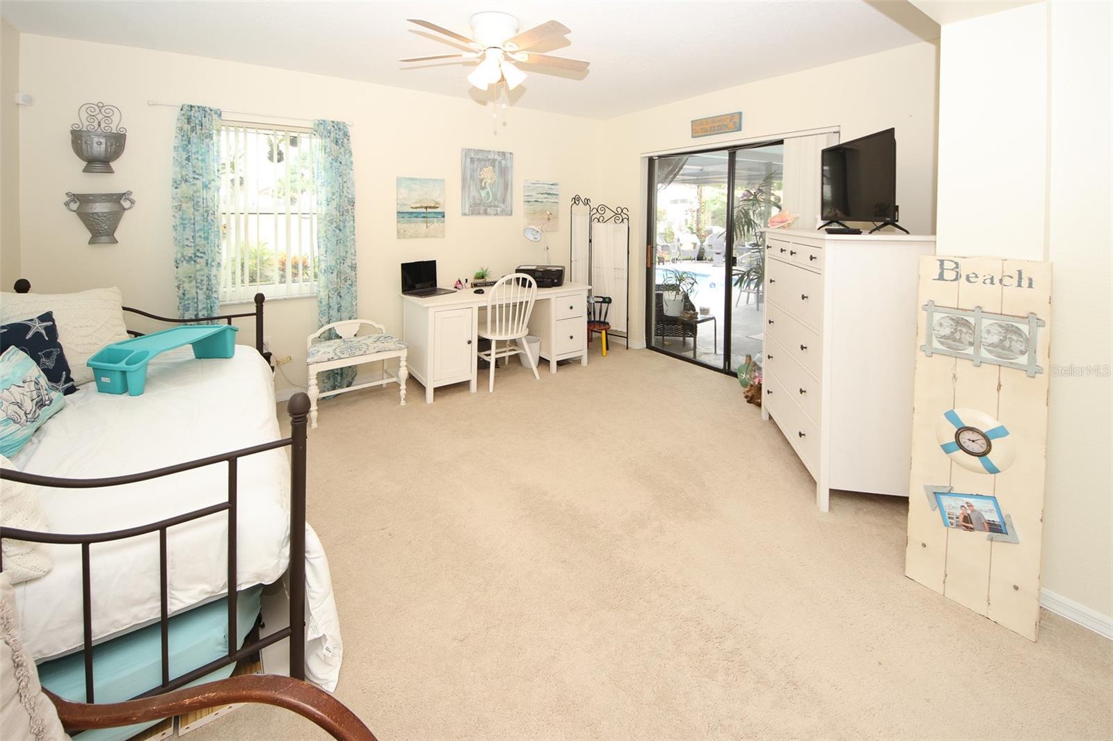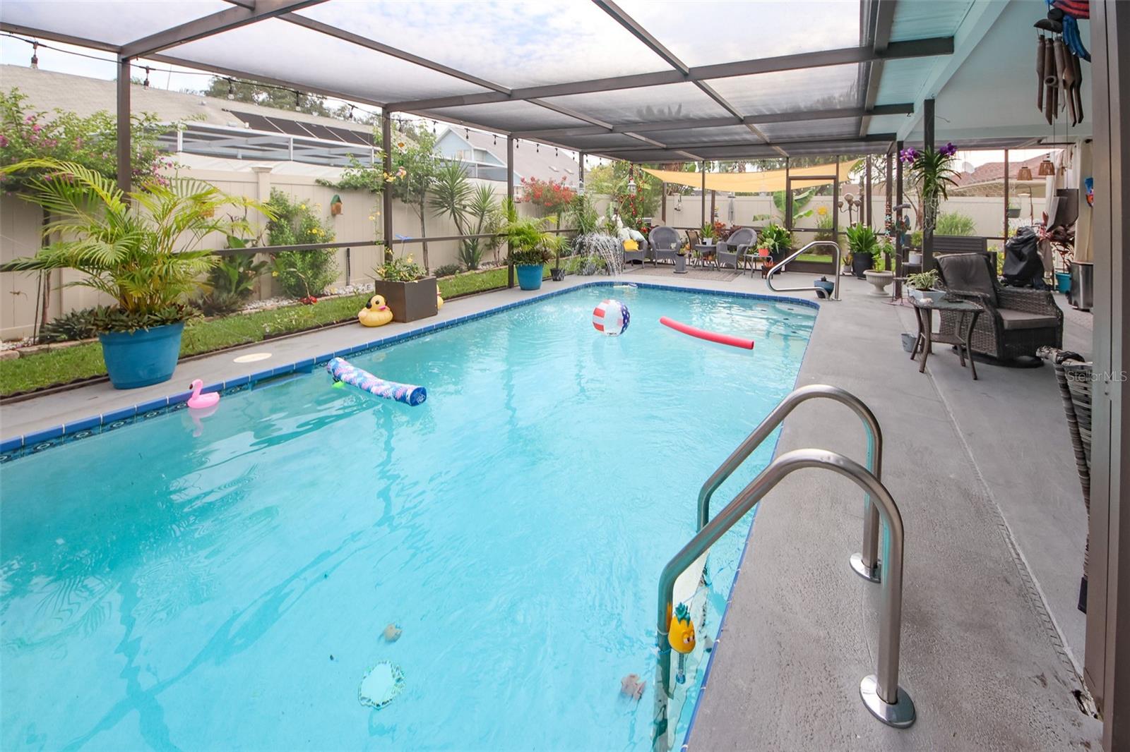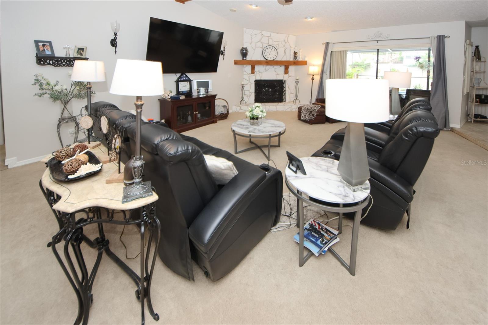 This beautifully maintained pool home features a double-door entryway, an open floor plan with a wood-burning fireplace and skylights. The dining room has real wood floors, overlooking the open floor plan, cathedral ceilings, and fireplace. Unique features include an outside pool shower, a large pool deck, and a grill area. In addition, one of the bedrooms has a connected bonus room attached that opens to the pool deck (the bonus room is 15x11). The fenced yard features private seating areas and a grill patio area next to the pool deck. The roof was replaced in 2022, and the AC in 2016. The hot water tank was also replaced in 2022, and there's a whole house water purification system, irrigation, and updated windows throughout. Attic storage accessible by stair pull down in garage. Ring system present and will convey with sale. Additionally, the home's interior and exterior were painted within the past two years. The pool equipment, rain barrel, outside television, dry bar, and outside fridge all convey with the house. This is a must-see property, offering the best of Florida living, and it's conveniently located close to shopping, county parks, golf courses, and beaches, with easy access for Tampa commuters.