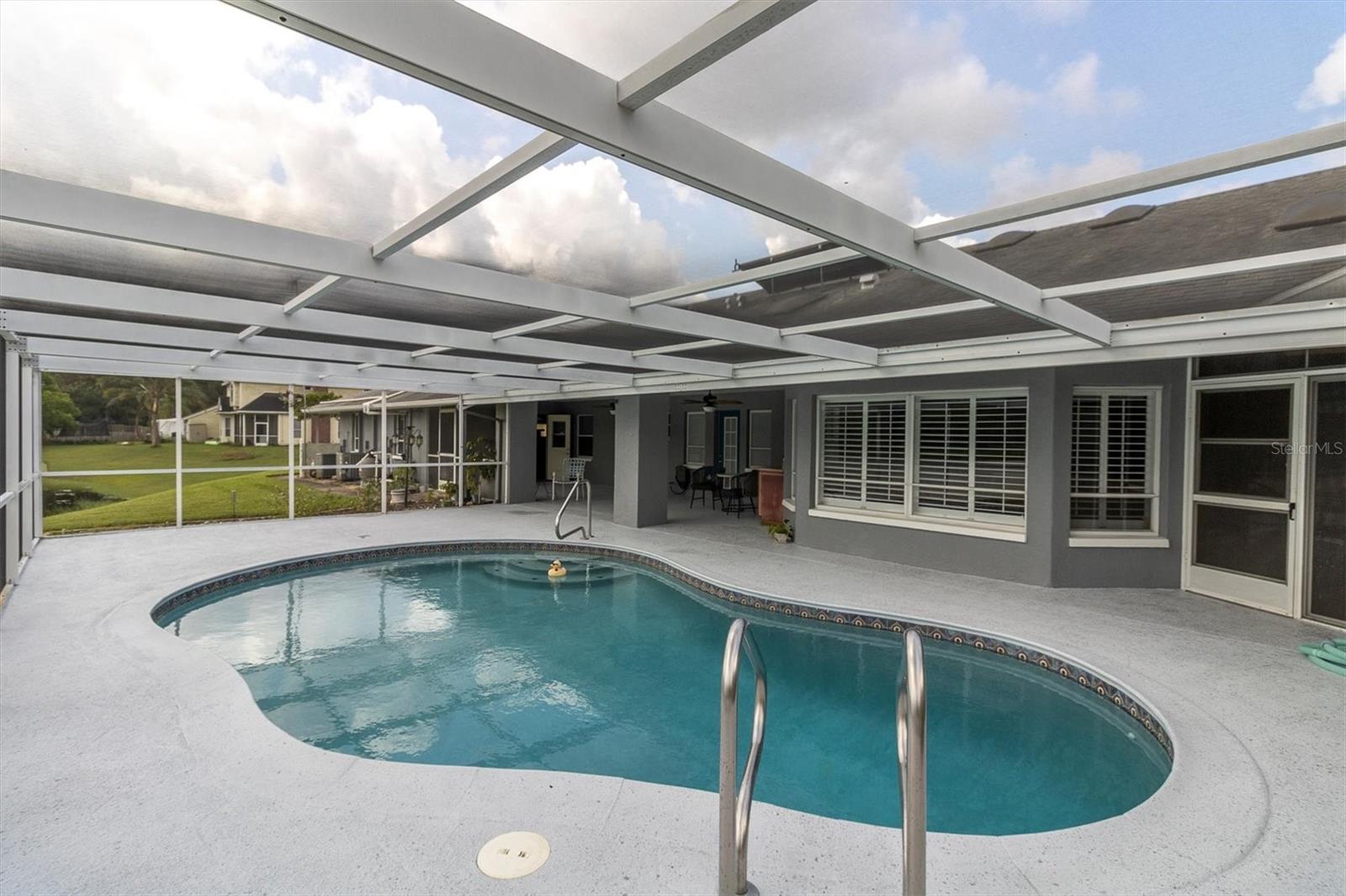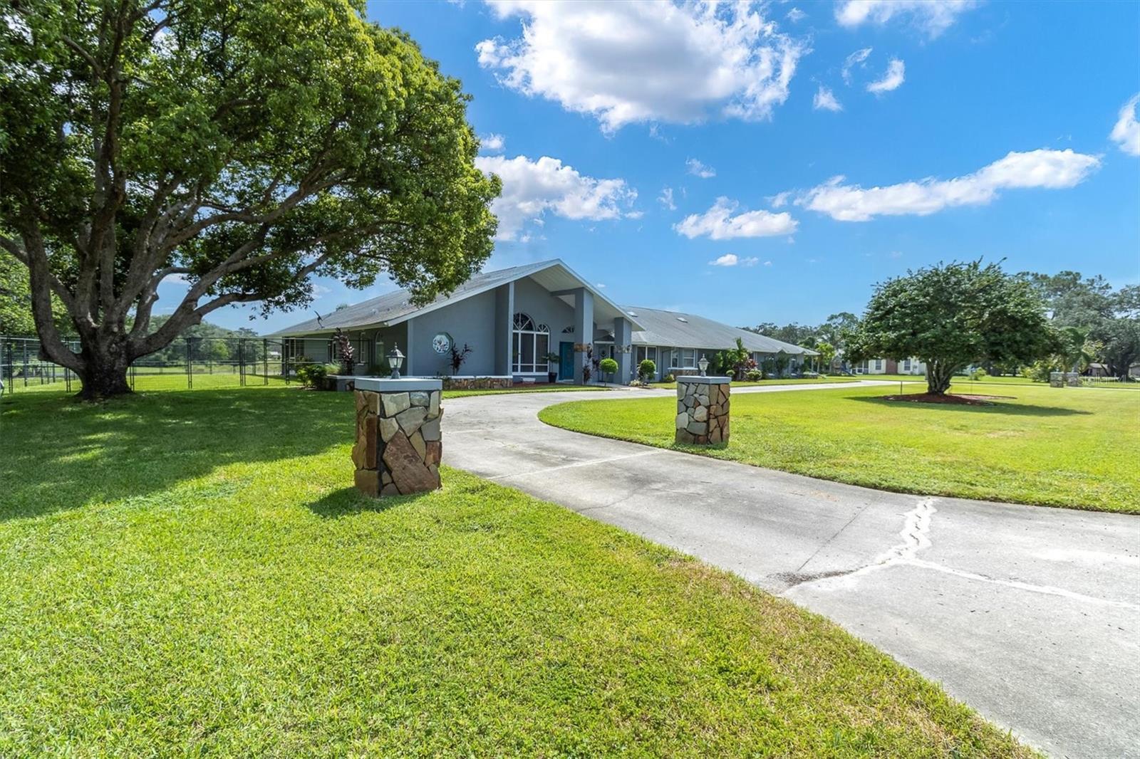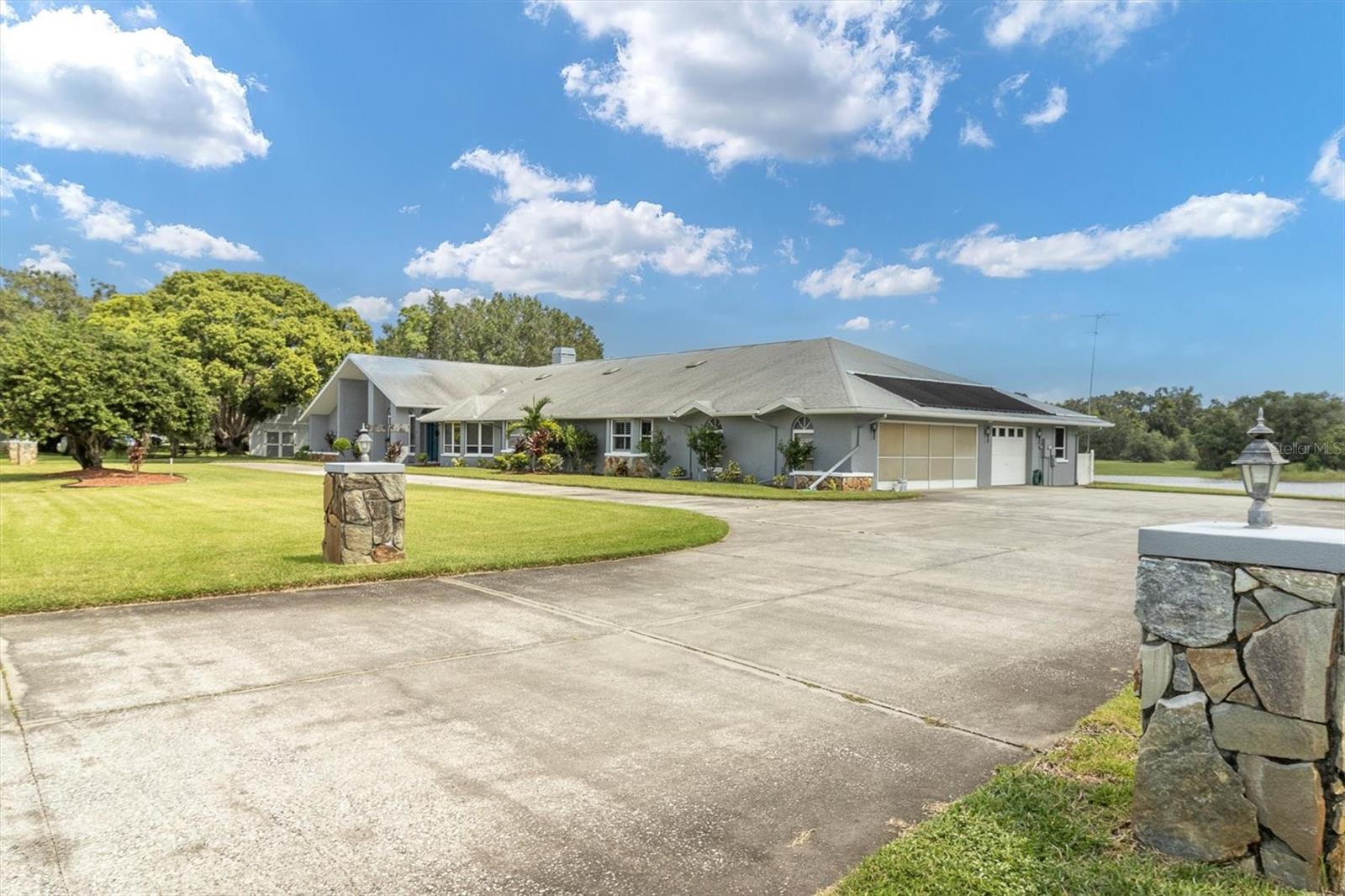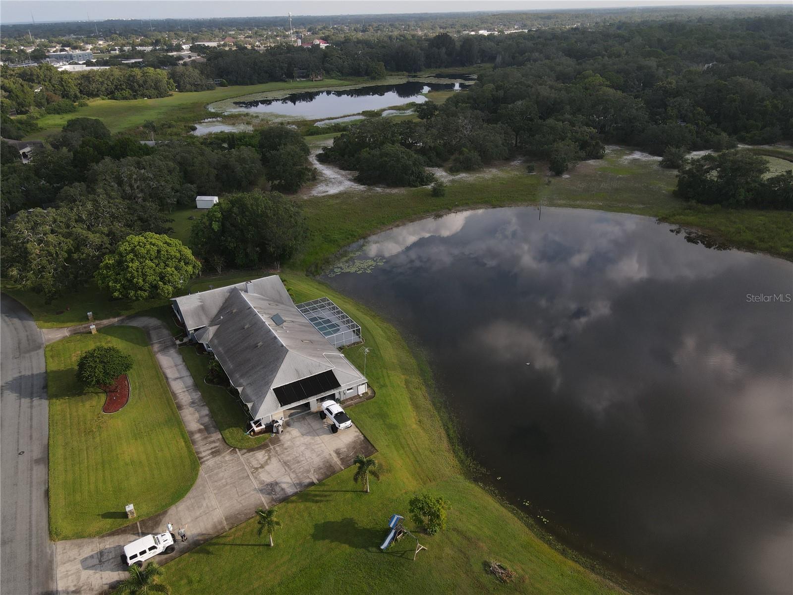 Welcome to 8607 Cranes Roost Dr, New Port Richey! Nestled on a picturesque 1.23-acre estate with serene lake views, this expansive 3,611 sq ft home is designed to accommodate multigenerational living with ease. The morning sunrises on your back deck are breathtaking and the sunsets from the front porch are incredible as well. Each bedroom is thoughtfully equipped with a walk-in closet, providing ample storage for all. The heart of the home features a large, open-concept kitchen that seamlessly flows into the breakfast nook and family room, where a cozy fireplace invites relaxation. Entertain in style with the spacious formal dining room and living room, both offering elegant settings for gatherings. Step outside to the screened-in pool area and lanai, where you can enjoy tranquil lake views year-round. A separate screened porch provides additional outdoor living space that runs the entire length of the rear of the home. The property also boasts a versatile craft/hobby/workroom, a generous utility room, and a 4+ car garage, making this home the ultimate home! There is a fenced dog run area and separate outdoor storage shed area as well. Perfect home to add upgrades and improvements as plenty of room for interior expansion and reconfiguration. The seller has the ORIGINAL blueprints from the home as well!