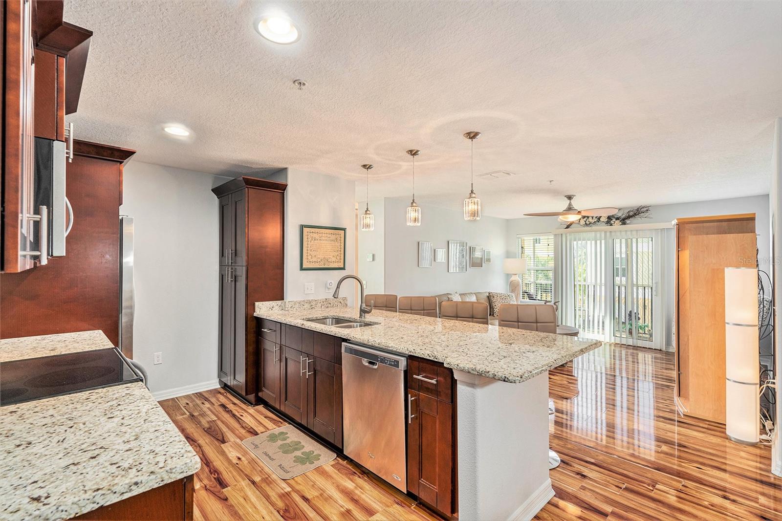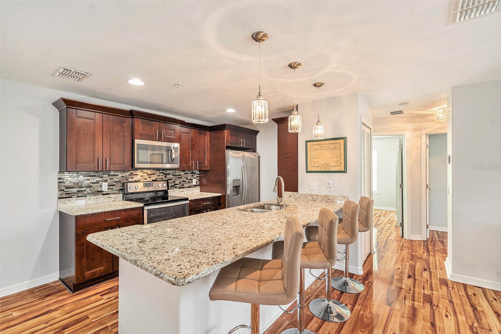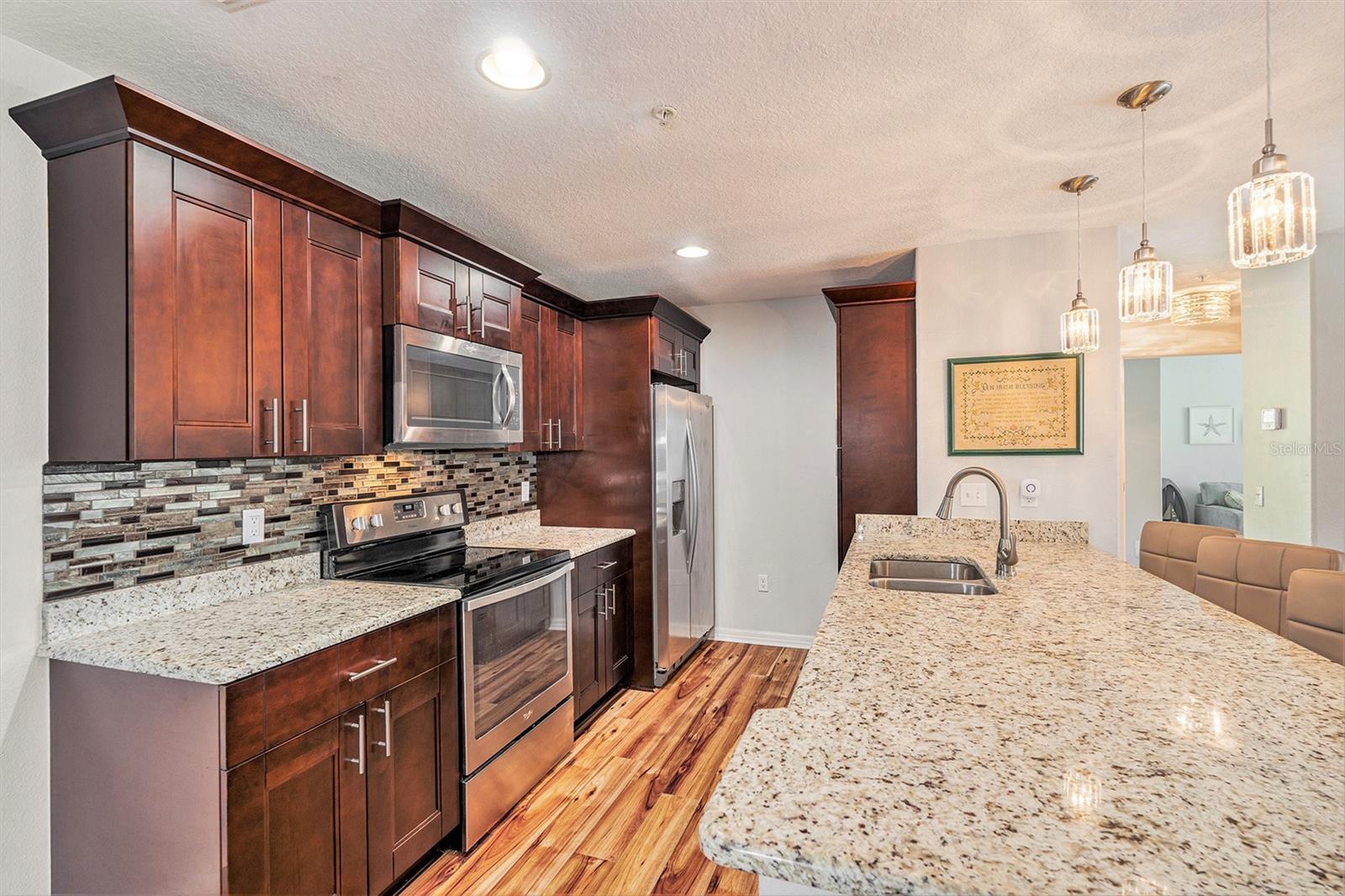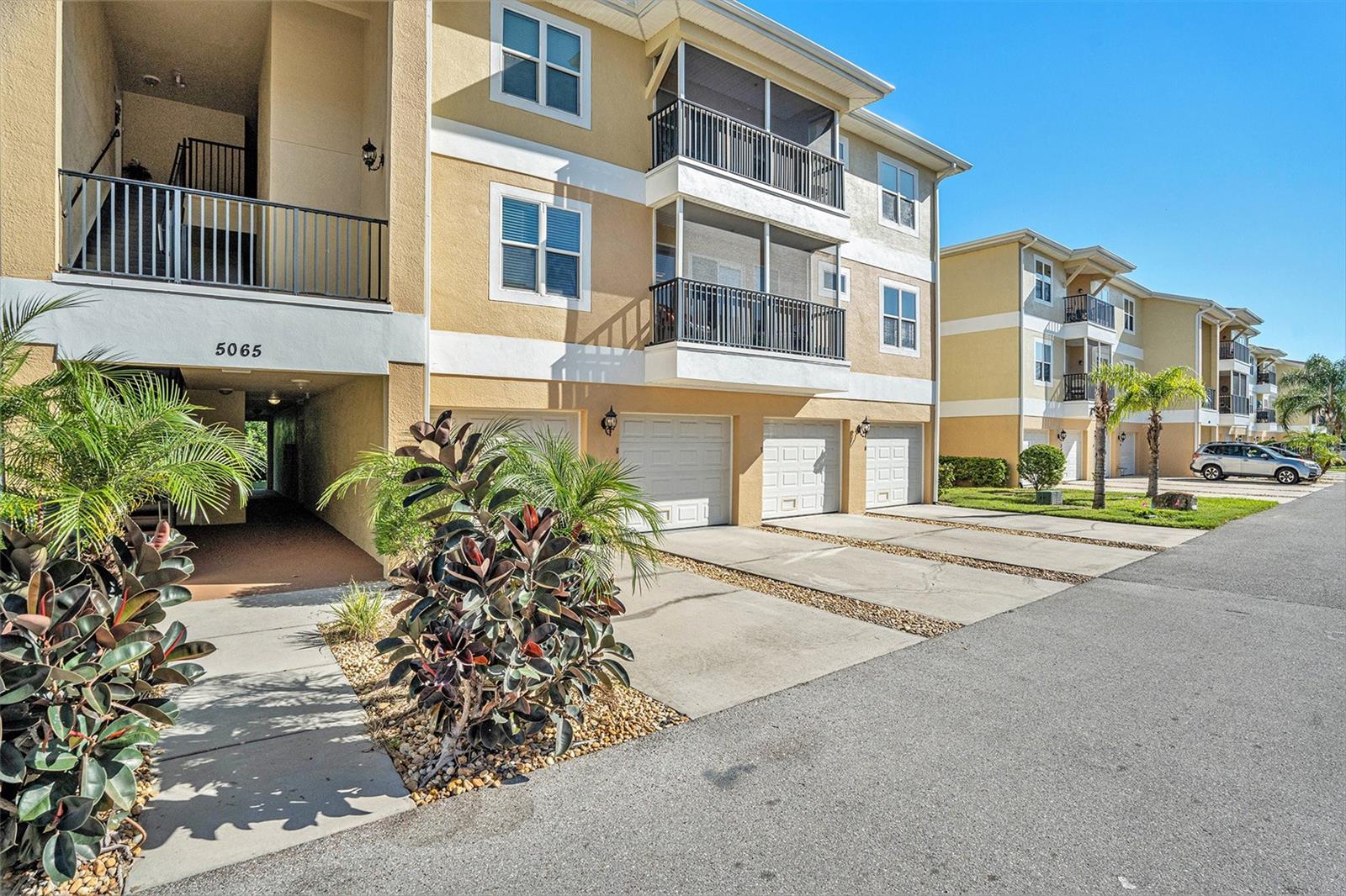 This is a must see! Price reflects owner’s willingness to sell this newer condo with only three stories (garage and storage on first floor). Regency Palms is conveniently located close to downtown New Port Richey. Open floor plan with split was bedrooms. Master bedroom offers walk in closet and ensuite bathroom. Spacious living area has plenty of windows and sliding glass door leading to screened in balcony. Shining laminate flooring through-out offers easy care. Kitchen has beautiful espresso cabinets with granite countertops, pantry, glass tile backsplash, stainless steel appliances, large island that can accommodate four bar stools. Laundry in-unit includes front load washer/dryer, bar to hang clothes and shelf for supplies. Storage area next to front door houses large hot water tank and new water softener system. Take your elevator down to garage with auto opener and your storage area with separate A/C. The pool area has covered table area, grills, hot tub and bathroom. Two small pets are permitted and there is a fenced in dog park. Association fee covers your cable TV, internet, water/sewer, trash, escrow reserves fund, community insurance, and exterior building and ground maintenance, and has not been raised for 2025. Owners in Regency Palms have the option to join private Gulf Harbor Beach Club. Come and see this amazing Regency Palms condo today at this amazing low price.