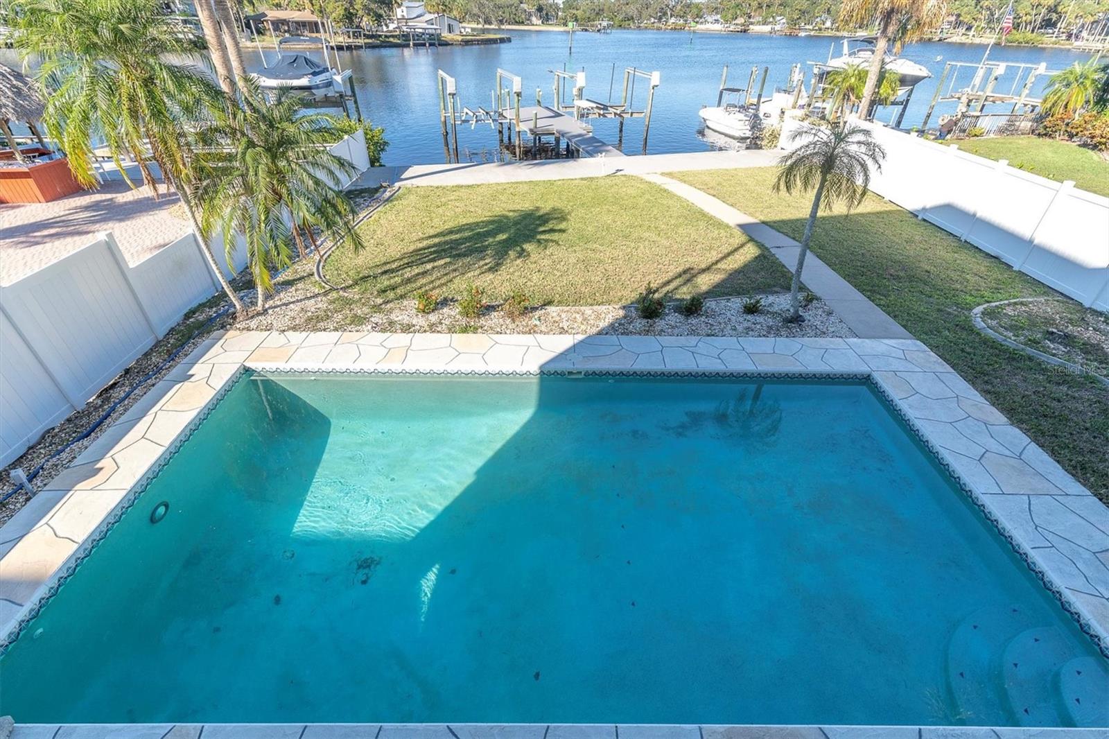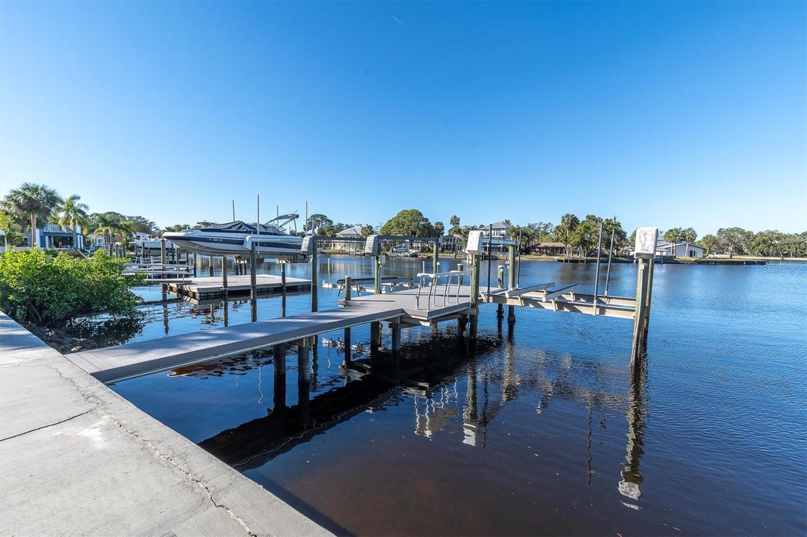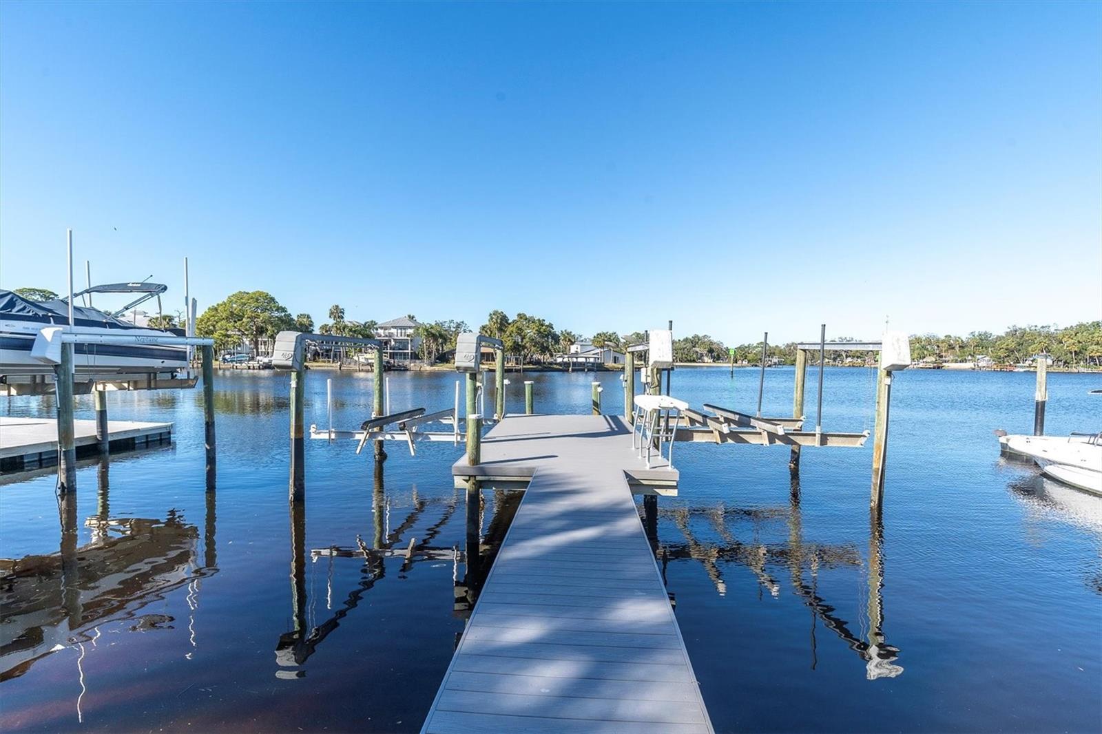 One or more photo(s) has been virtually staged. *****IMPROVED PRICE PLUS A NEW ROOF REPLACEMENT IN THE WORKS****** Fully renovated with tastefully done finishments to please all. 4 Bedroom 3 Bath home located on a wide river front canal located under just past the US HWY 19 bridge away from the Gulf of Mexico. New composite dock with two electric boat lifts. One lift rated for 16,000lbs and the second lift rated for 7000lb boat lift. Dock has water and electric. Open floor plan to include the oversize kitchen, dining room off the kitchen and Great Room with large balcony overlooking the inground pool and large water views. This home was carefully designed, luxury though out the entire spaces. Kitchen/Great Room is separated by a large breakfast bar. Kitchen accommodates a large center butcher block island, gas cooktop range with pot filler, double ovens with ball bearing slides, beverage refrigerator, built in microwave, shaker wood cabinets with lots of storage, high end granite countertops. All new appliances to include washer and dryer. All flooring is new travertine. Ground level offers plenty of parking, storage and work shop combination, newly installed vinyl fenced in yard. Bring you water toys, golf cart friendly community. City of New Port Richey offers great community living with shopping, restaurants, waterfront parks with boat tie ups, playgrounds, amphitheater, lots of free concerts and Friday evening movies for the family, fireworks...there is always something going on in the town. This luxury home certainly checks all the boxes, please see for yourself!