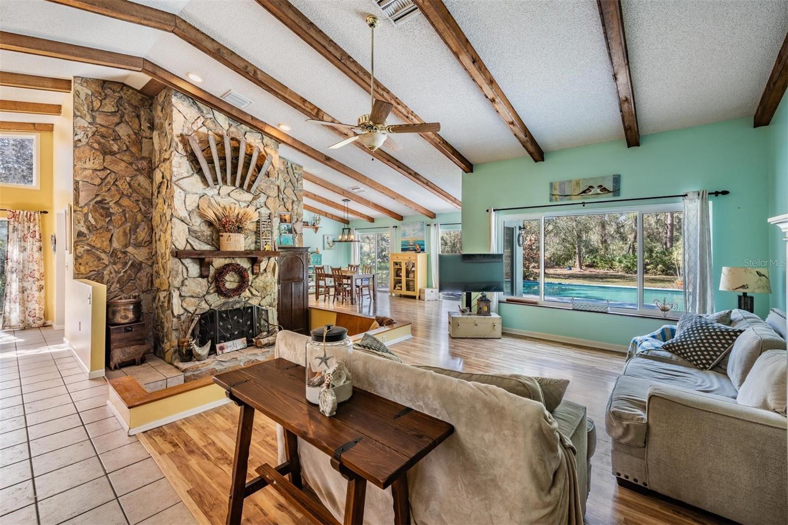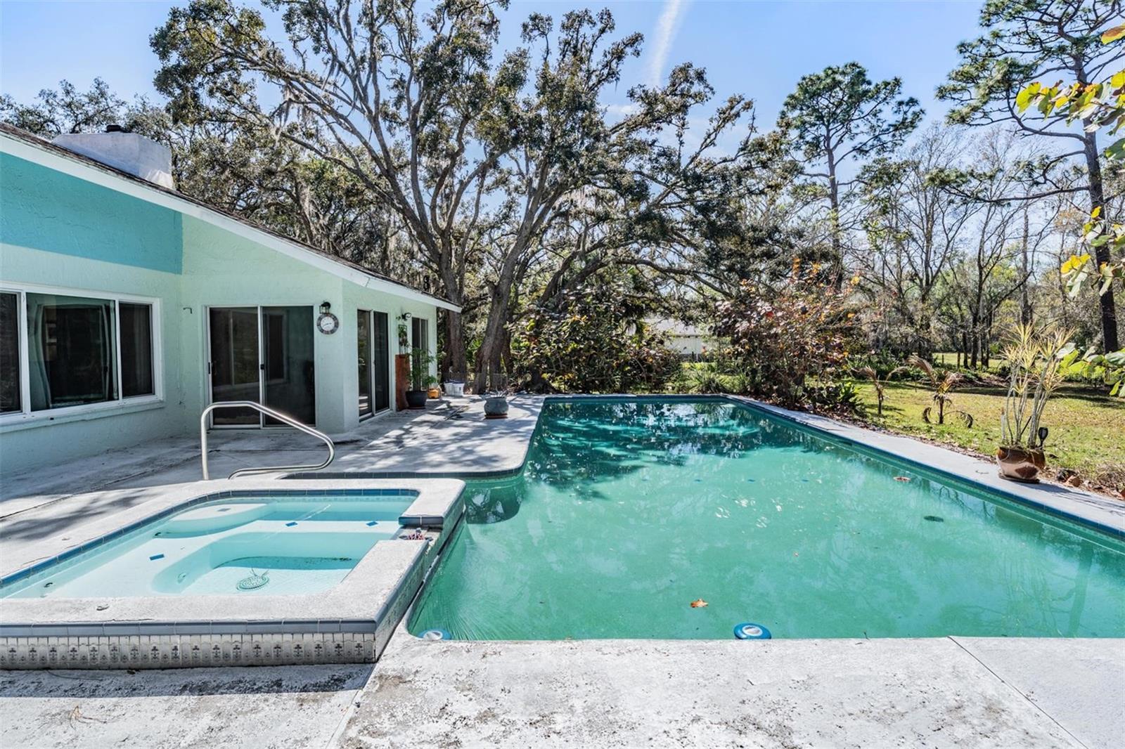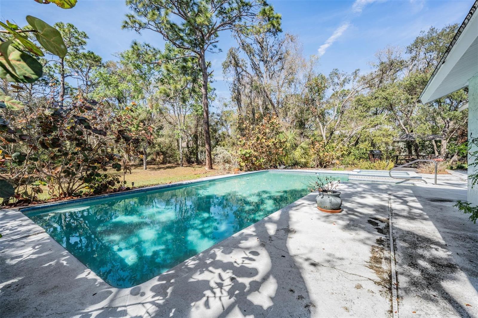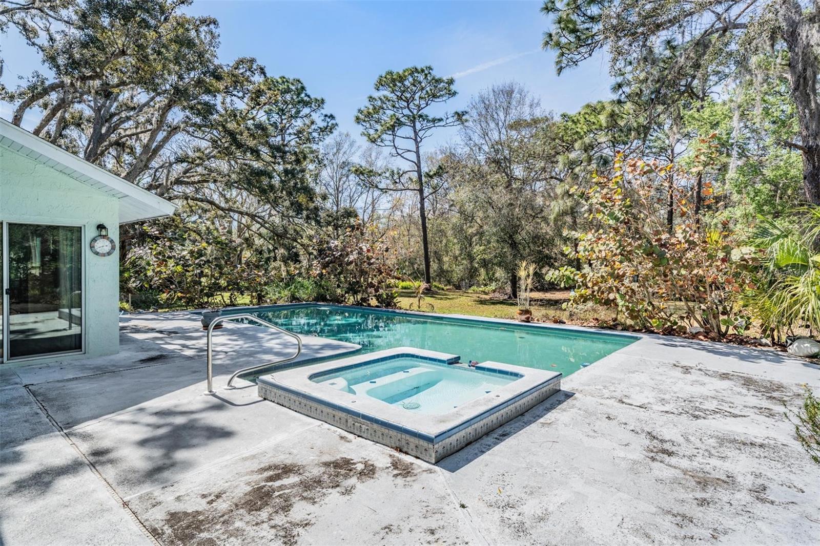 THIS HOME IS SPECIAL! 3 BEDROOM OPEN FLOOR PLAN WITH AN OFFICE, POOL, AND 2.33 ACRES! Bring your horses, goats, and chickens as you are allowed 3 grazing animals per acre! Boats and RV's allowed as well! Heading inside, this kitchen boasts brand new cabinets, Corian counter top, Stainless Steel Appliances, and Sun window! The wide open living space features high vaulted ceilings with wooden beams and a cozy wood burning fireplace encased in stone! The Primary Bed/Bathroom is spacious and holds a walk-in closet and sliders out to the pool and back yard! Relax out back in total privacy around the pool/spa which is surrounded by beautiful Florida Wildlife! Other great features of this home include its oversized 2nd bathroom, huge dining space, office, and brand new A/C! All of this in the Tanglewood community which is close to Starkey Park, Restaurants, Medical facilities, and so much more!
