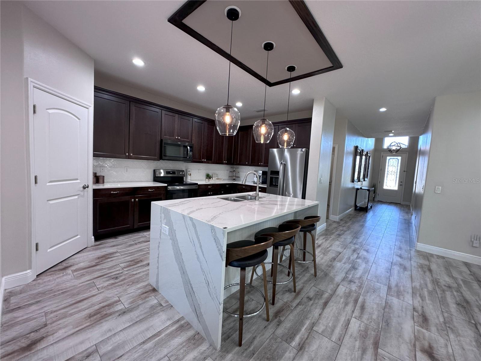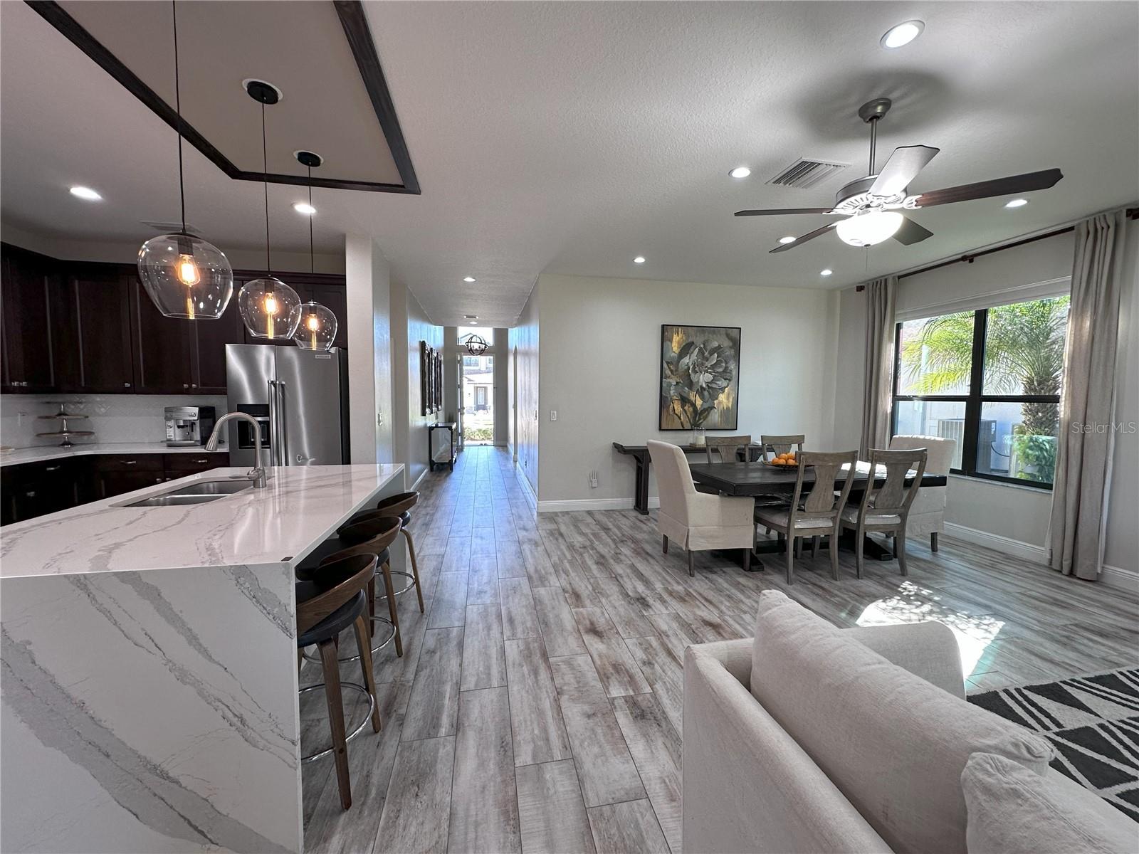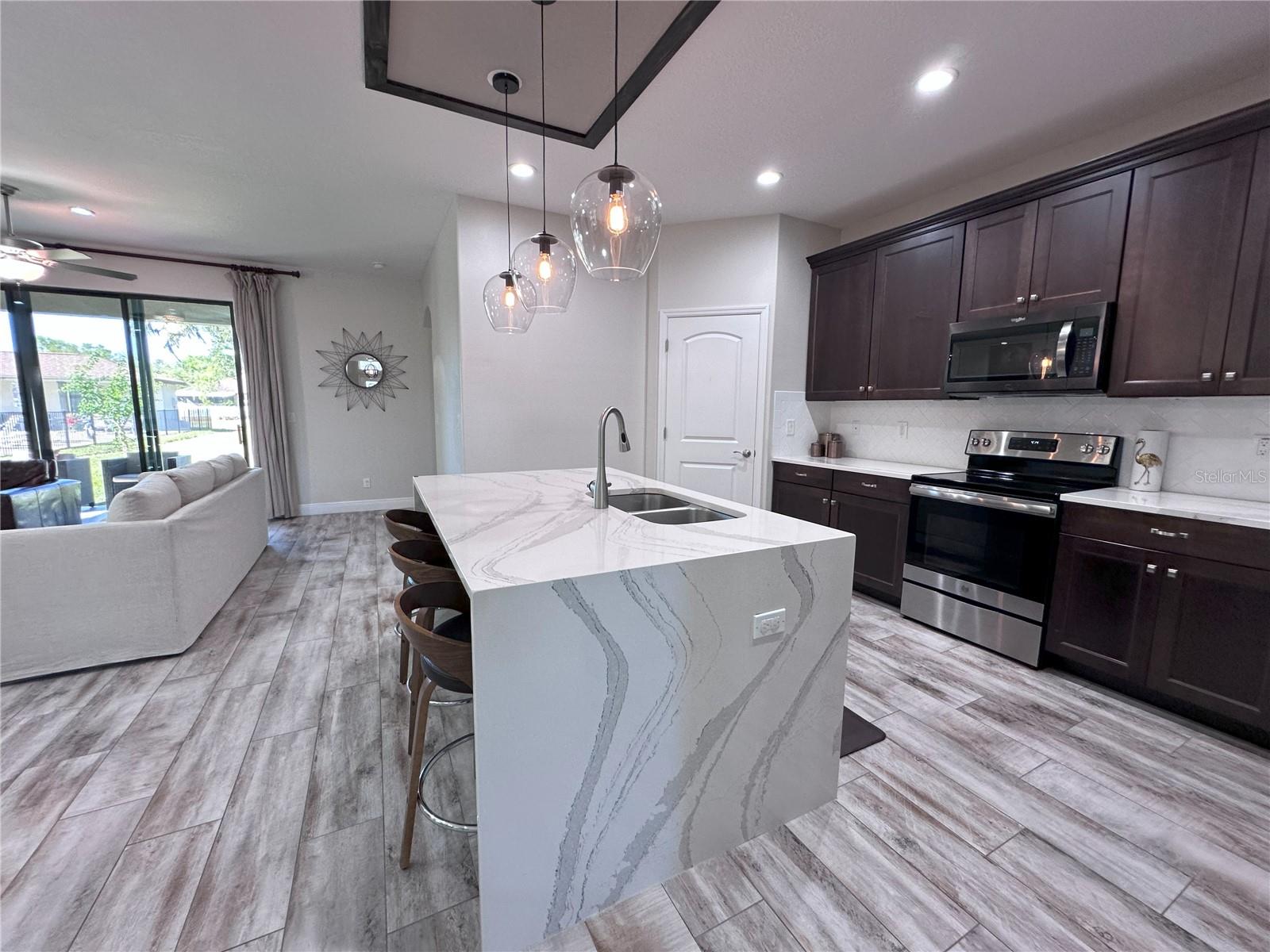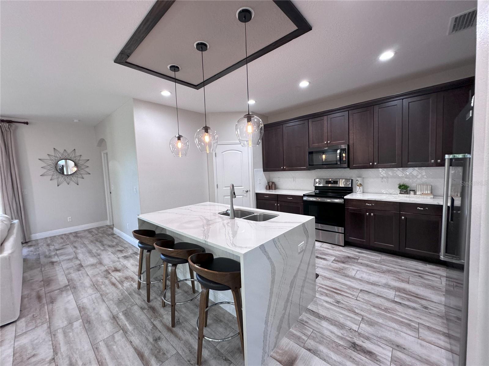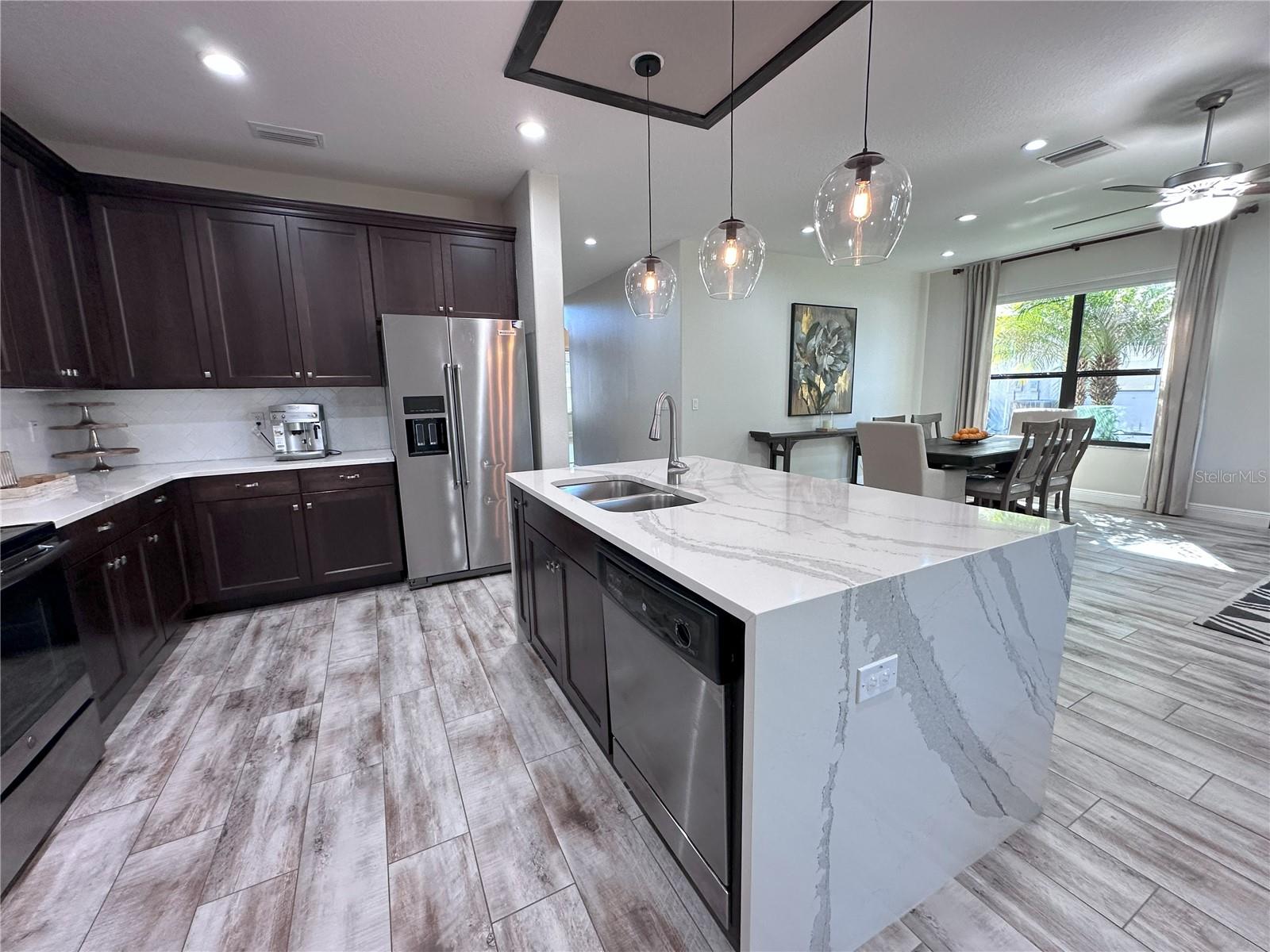 Motivated seller -bring your offers! Dont miss your c hance to see this Wonderful modern home, located at Rose Haven, a gated community with NO CDD FEE. The exterior has fantastic curb appeal, including a bay window, soaring arched front porch, stone accents, and and 8 foot fiberglass door with satin glass insert. You'll fall in love with your first step inside. The foyer is stunning, with upgraded tile that runs throughout the great room and kitchen. The kitchen features an island bar with dual sinks, and a beautiful quartz countertop that "waterfalls" on both sides. 42 inch upper cabinets with crown molding, GE Energystar appliances, a Moen® Arbor Brushed Nickel single-lever faucet with pull out sprayer, and a closet pantry all included. The kitchen opens to the spacious great room with sliders overlooking the green space and community pool. The master suite features dual walk-in closets, and the master bath has a walk in shower with full, seamless glass walls and upgraded wall pebble detail in the tile. There are three additional bedrooms, including one with it's own en suite bathroom ideal for an "in-law" suite. Lots of extra lighting in this model, puck can lights, pendant lights, and under cabinet lights in the kitchen. The kitchen cabinets and all bathroom cabinets have been upgraded, and all the bathrooms have granite countertops. You even get a ceiling rainfall shower head in the Master Suite. All bedrooms have waterproof luxury vinyl. The Rose Haven community has a gated entry, with a beautiful lakeside boardwalk, and community pool and cabana. As mentioned above there is NO CDD FEE, and a low HOA fee of $128 a month. This fee not only covers the pool, cabana, boardwalk, and entry gate, but also covers your trash pick up and basic cable. Conveniently located just a few miles from the Suncoast Parkway for quick commute to Tampa, it is also close to shopping, parks, restaurants, and beaches. So make sure this home is on your list to see, and come today!! please check the video tour