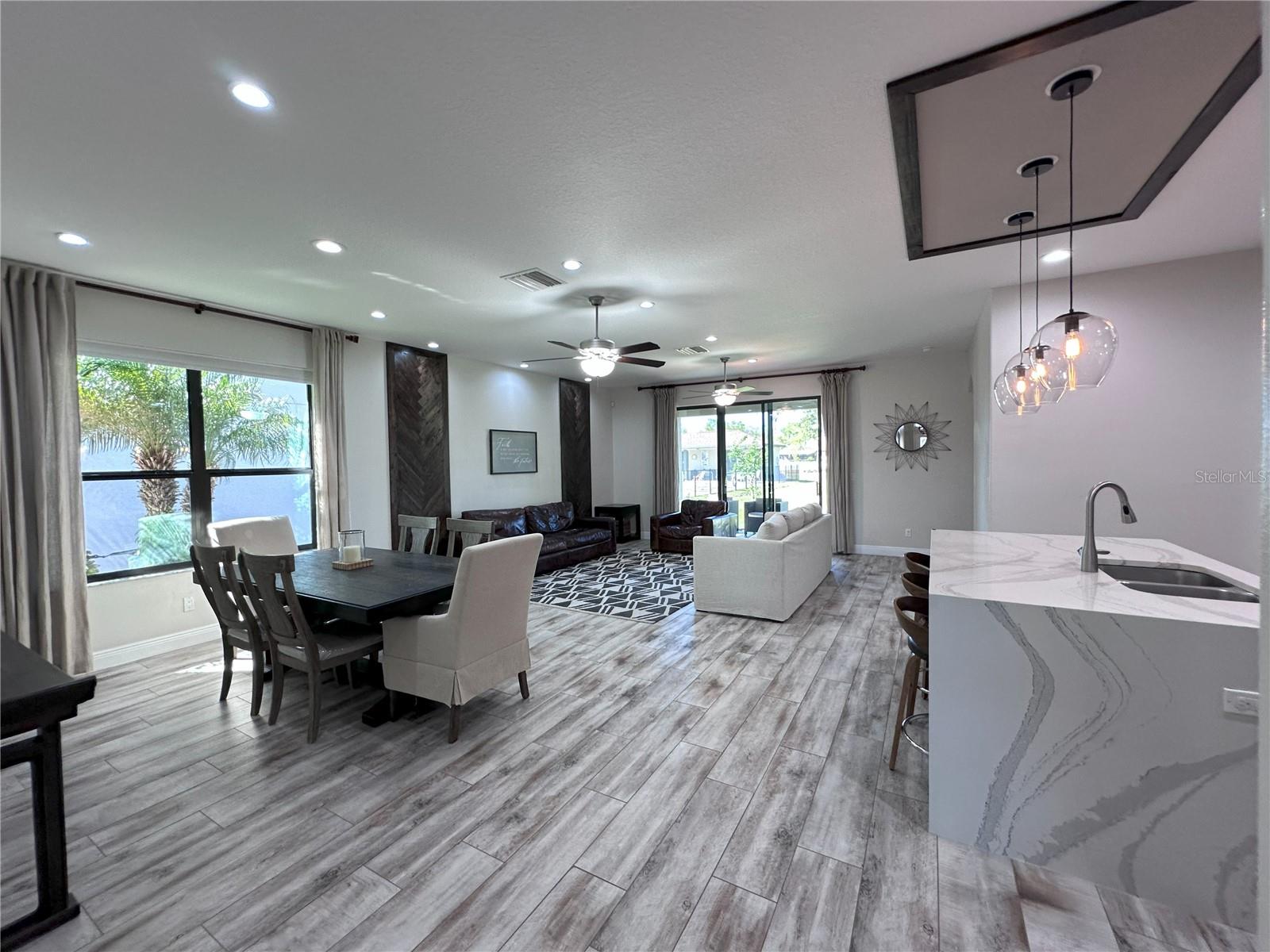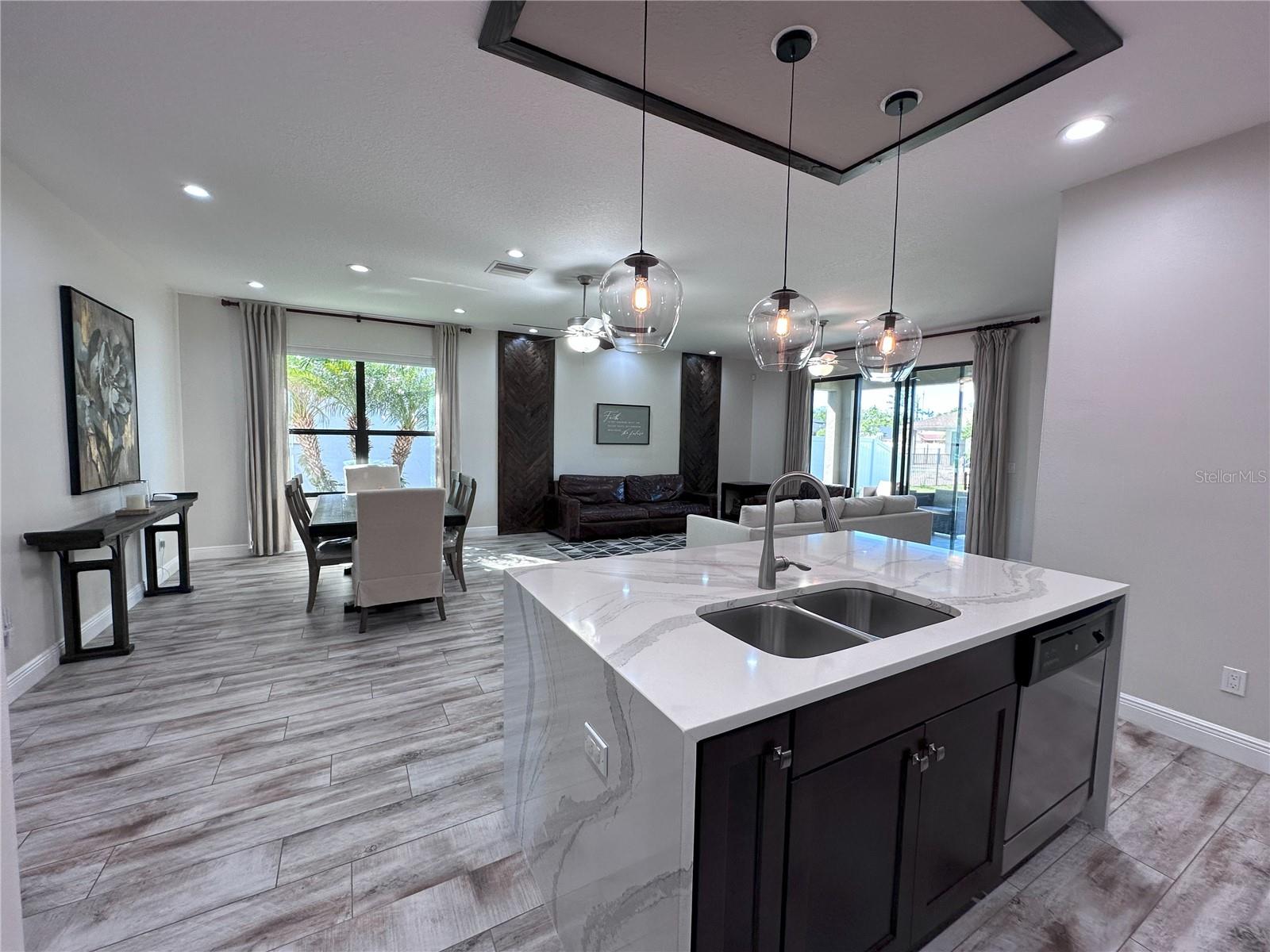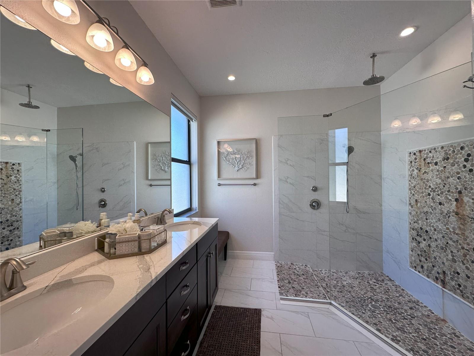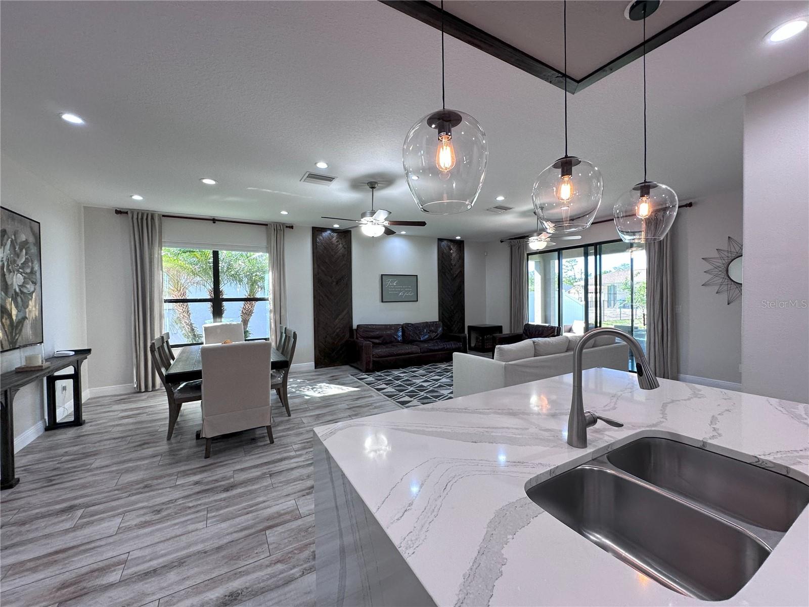 Motivated seller -bring your offers! Dont miss your c hance to see this Wonderful modern home, located at Rose Haven, a gated community with NO CDD FEE. The exterior has fantastic curb appeal, including a bay window, soaring arched front porch, stone accents, and and 8 foot fiberglass door with satin glass insert. You'll fall in love with your first step inside. The foyer is stunning, with upgraded tile that runs throughout the great room and kitchen. The kitchen features an island bar with dual sinks, and a beautiful quartz countertop that "waterfalls" on both sides. 42 inch upper cabinets with crown molding, GE Energystar appliances, a Moen® Arbor Brushed Nickel single-lever faucet with pull out sprayer, and a closet pantry all included. The kitchen opens to the spacious great room with sliders overlooking the green space and community pool. The master suite features dual walk-in closets, and the master bath has a walk in shower with full, seamless glass walls and upgraded wall pebble detail in the tile. There are three additional bedrooms, including one with it's own en suite bathroom ideal for an "in-law" suite. Lots of extra lighting in this model, puck can lights, pendant lights, and under cabinet lights in the kitchen. The kitchen cabinets and all bathroom cabinets have been upgraded, and all the bathrooms have granite countertops. You even get a ceiling rainfall shower head in the Master Suite. All bedrooms have waterproof luxury vinyl. The Rose Haven community has a gated entry, with a beautiful lakeside boardwalk, and community pool and cabana. As mentioned above there is NO CDD FEE, and a low HOA fee of $128 a month. This fee not only covers the pool, cabana, boardwalk, and entry gate, but also covers your trash pick up and basic cable. Conveniently located just a few miles from the Suncoast Parkway for quick commute to Tampa, it is also close to shopping, parks, restaurants, and beaches. So make sure this home is on your list to see, and come today!! please check the video tour