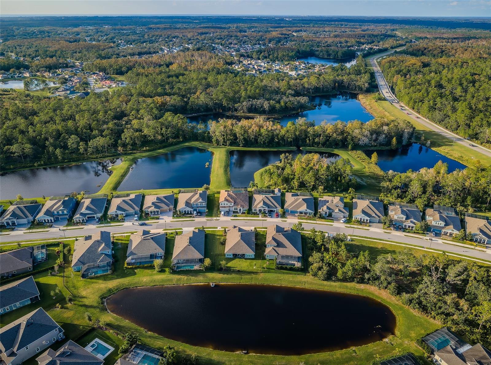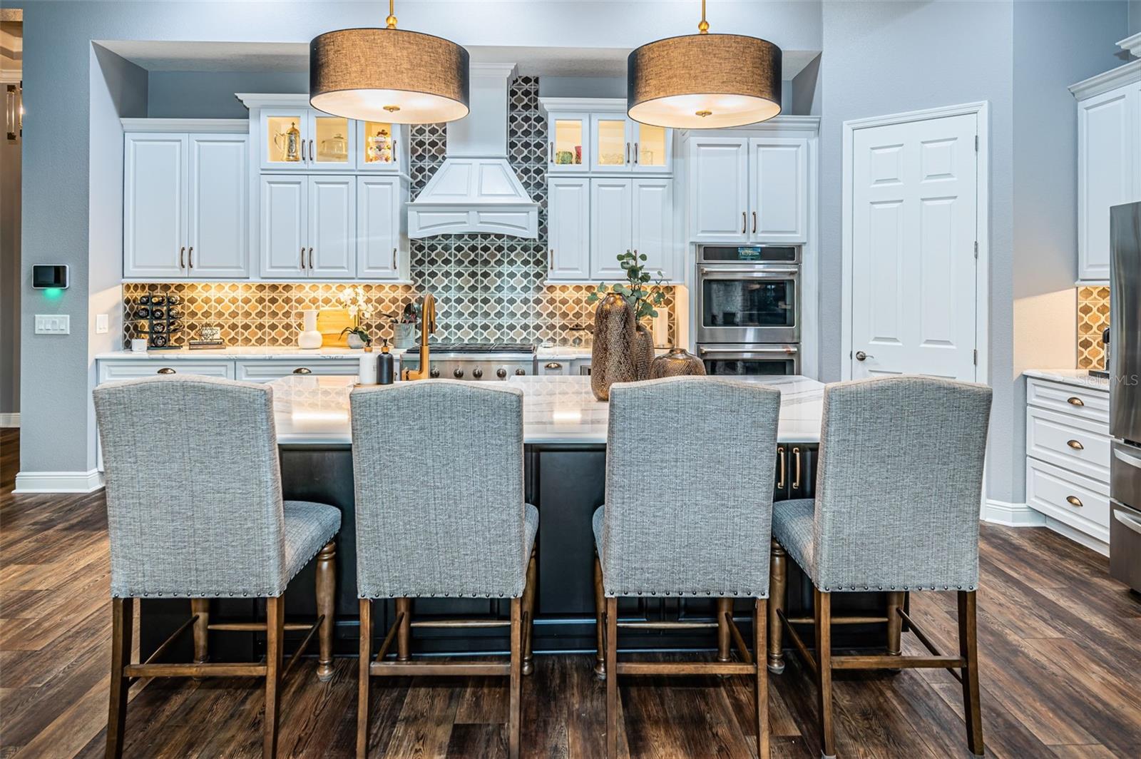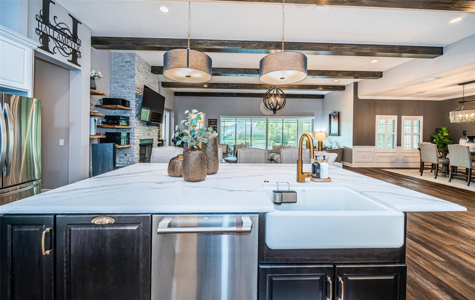 Welcome to your dream home, a stunning 4 BR, 3 bath luxury residence built in 2020, offering almost 3,200 sq. ft. of exquisite living space. The home has solar and current electric bill is $30 per month. Nestled in the desirable Woodlands/Longleaf community, this exceptional property features a 3-car garage and a serene pond in the backyard, perfect for tranquil evenings. As you approach, you’ll be greeted by a beautiful paver driveway and a charming front porch. Step inside to discover an open floor plan adorned with wood-look LVP flooring, crown molding, and ceiling beams that elevates the appeal of the great room and kitchen. The striking stone gas fireplace reaches the ceiling, creating a warm and inviting focal point. Sliding doors seamlessly connect the interior to the outdoor oasis, where a sparkling saltwater pool and spa await. The gourmet kitchen is a chef's delight, boasting upgraded Cambria Britannicca quartz countertops, a farmhouse sink, and stainless GE Cafe appliances, including a double oven and professional gas cooktop. The custom paneled range hood and lighted cabinetry add elegance, while the center island features ample storage with deep cupboards. Enjoy meals in the separate dining room or al fresco on the pavered lanai. Retreat to the spacious primary suite, featuring a luxurious ensuite bath with separate vanities, a free-standing soaking tub, and a large walk-in tile shower with a rain showerhead. The custom closet offers built-ins for all your storage needs. Three generous guest bedrooms also feature custom closets, ensuring everyone has their own space. This home is not just about luxury; it also boasts significant upgrades. The large laundry room offers practicality with ample cabinets and storage, upgraded custom lighting throughout the home. Outside, entertain in style with outdoor speakers, TV wiring, and a natural gas line for your grill or future outdoor kitchen. Enjoy the extensive community amenities, including Longleaf Elementary, community pool, playgrounds, sports fields, and walking trails. With easy access to shopping, medical facilities, golf courses, and the Suncoast Expressway, this home truly offers the best of Florida living. Don’t miss your chance to own this remarkable property in one of Trinity's most sought-after neighborhoods! Schedule your private showing today!
