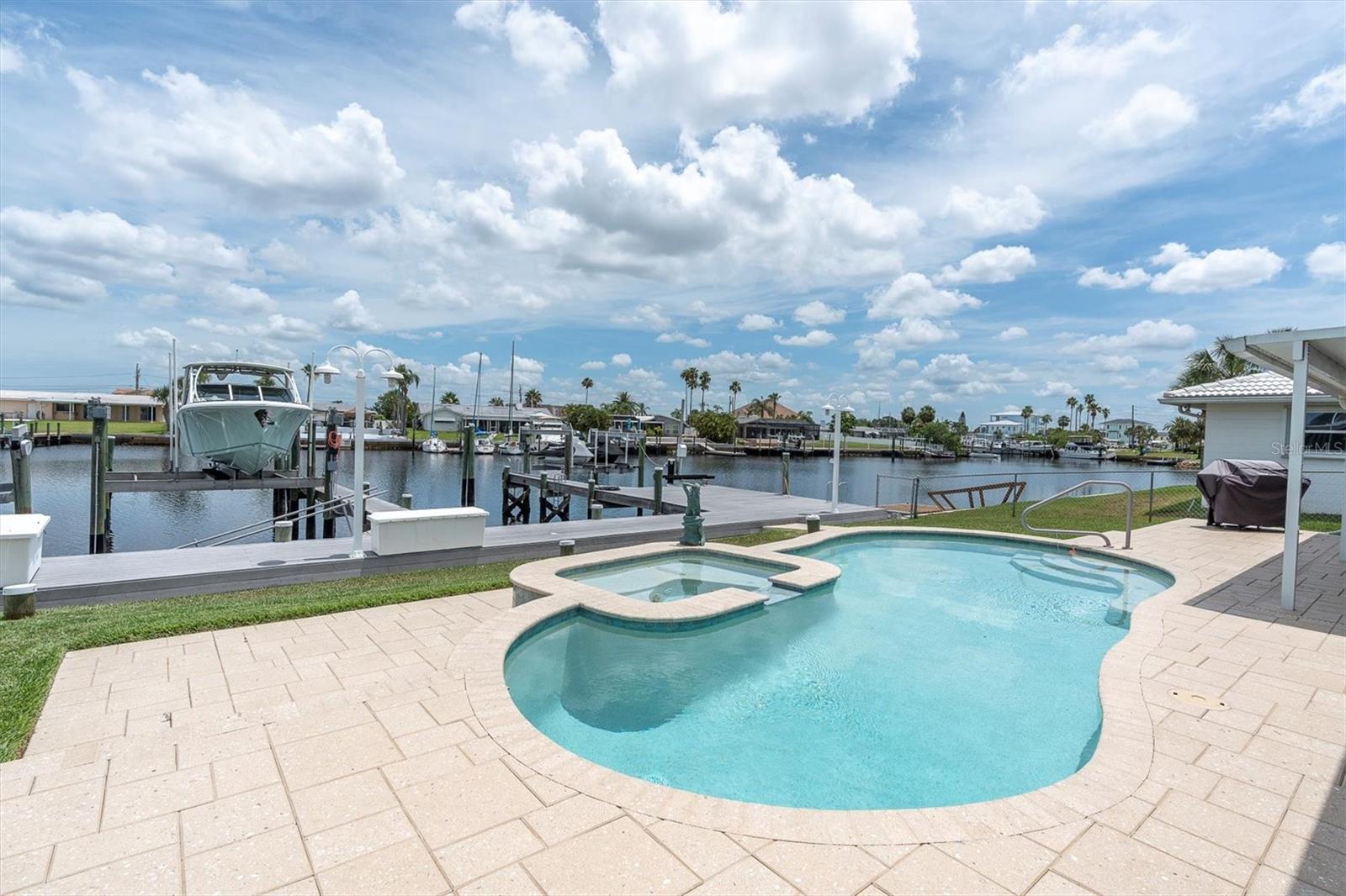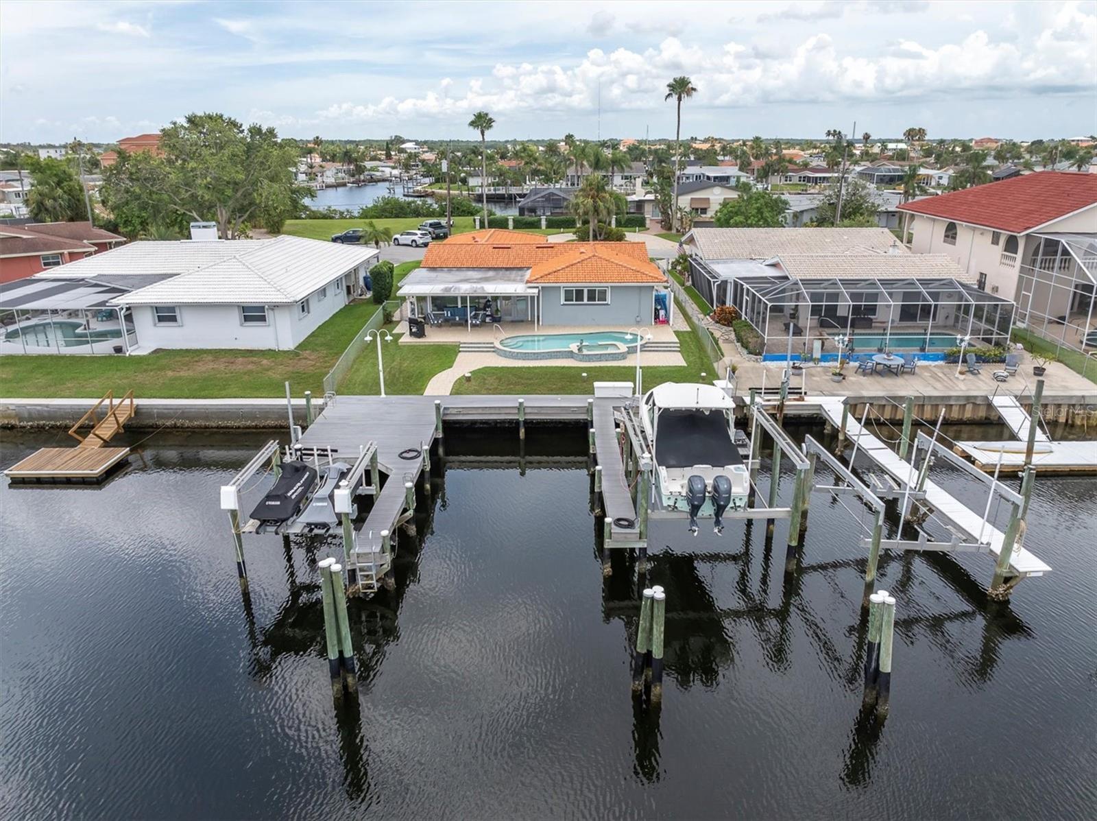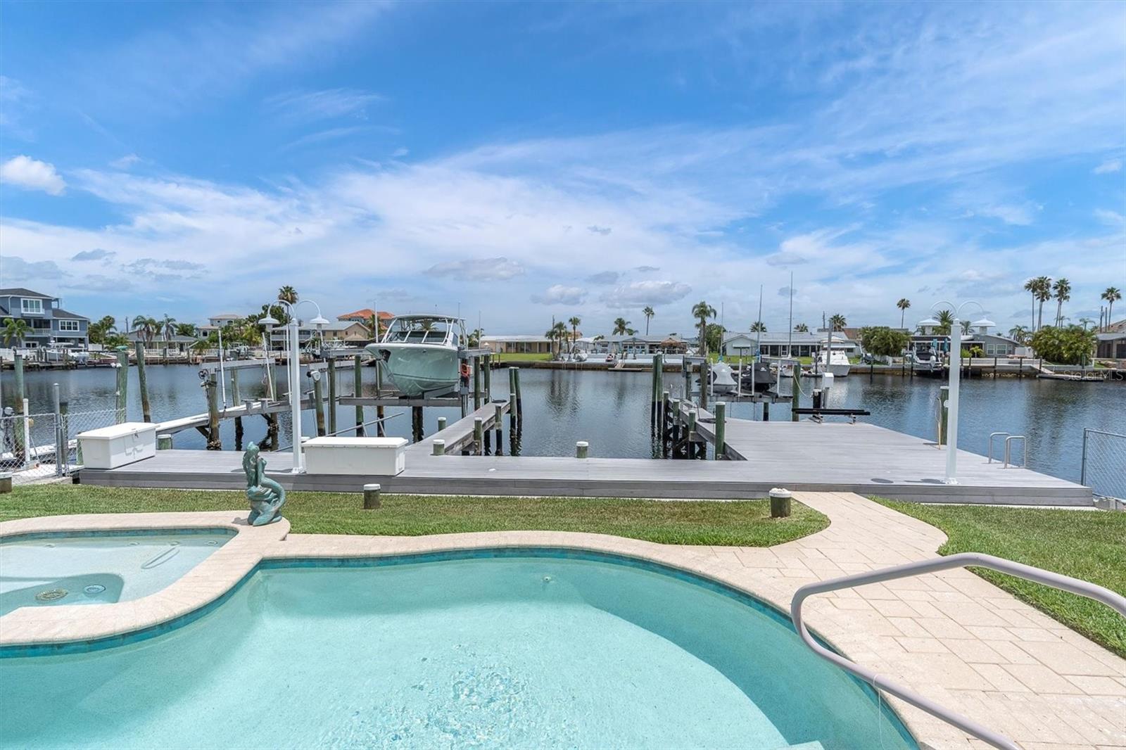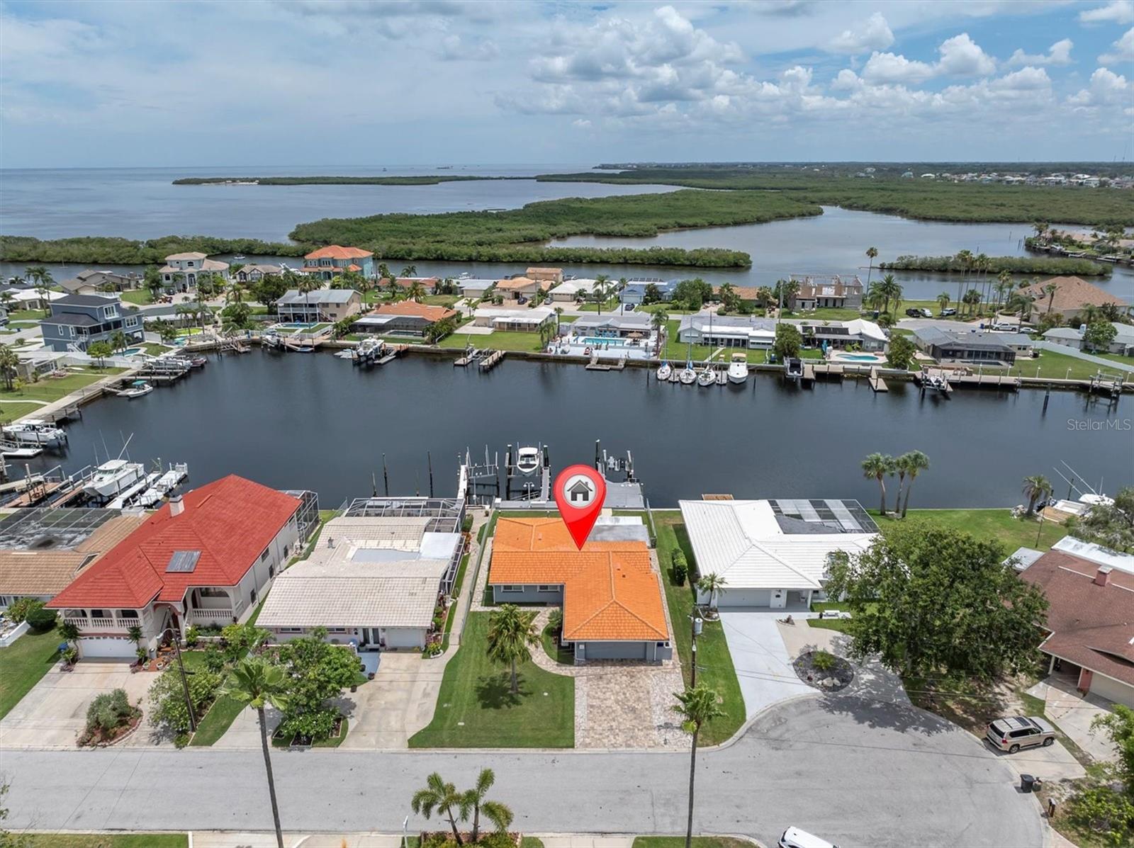 Calling all boating enthusiasts – this is a boater’s dream come true. Located on one of the widest and deepest canals in Flor-A-Mar/Gulf Harbors, this beautifully updated 3-bedroom, 2-bath, 2-car garage pool home offers direct access to the Gulf of Mexico in just minutes. Situated on a quiet cul-de-sac, this home is one of the few properties that can accommodate nearly any size vessel or sailboat with both a 16,000 lb and a 10,000 lb boat lift, as well as a 12x15 floating dock and large deck space. The dock is equipped with water and a new electric system for the lift (2020), fob-controlled operation, and two green underwater lights that create a stunning evening waterfront atmosphere. The backyard is a private retreat, featuring a 2019 saltwater pool with a spillover spa and a brick paver lanai. An outdoor shower adds convenience after a day on the water, and the entire yard is fenced for added privacy. The driveway has been widened and enhanced with pavers, providing additional space and curb appeal. Inside, the home boasts an open floor plan with expansive water views and travertine flooring throughout. The kitchen was refreshed in 2023 with freshly painted cabinets, new quartz countertops, stainless steel appliances, a large island, and a built-in coffee bar. A spacious laundry room is conveniently located off the kitchen. The master bathroom includes a walk-in shower and dual vanities with updated quartz countertops. The cabinets were painted in the master bathroom. The hall bath also received a full refresh in 2023, including painted cabinetry, quartz counters, and a shower update. Additional recent improvements include a new tile roof (2019), HVAC and all new ductwork (2019), tankless gas water heater (2019), whole-house Generac gas generator (2019), and electric hurricane roll shutters (2019) installed on hurricane-rated windows. In 2025, the home received a new front door and all new interior doors. This home is located in an active boating community with an optional membership to the exclusive Gulf Harbors Beach Club and Civic Center. With over 1,900 square feet of living space and every major system updated, this home offers the perfect blend of waterfront luxury and peace of mind. If you’re seeking true deep-water access and a home ready to enjoy from day one, welcome to Gulf Harbors. Schedule a showing today...must see to appreciate!