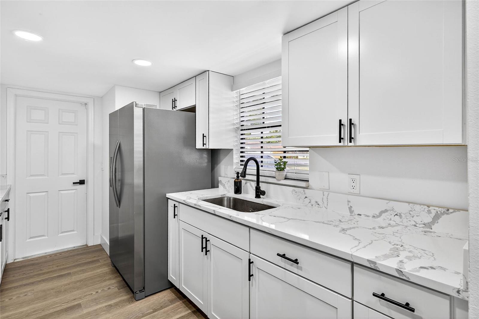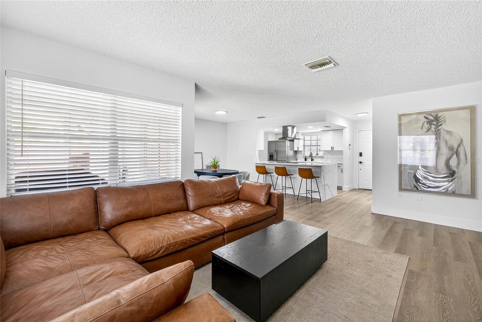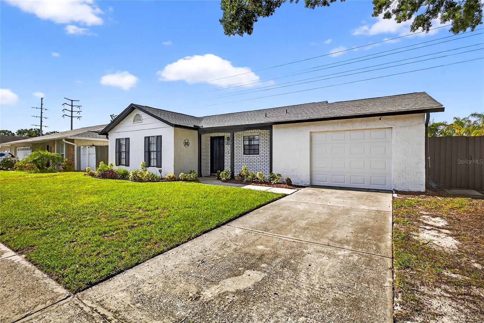 Welcome to your beautifully remodeled 2-bedroom, 2-bath home in the desirable Deer Park subdivision of New Port Richey! This home boasts major updates, including a new roof (2022), HVAC (2025) a new garage door, and fresh interior and exterior paint. Inside, you’ll find an open-concept layout with luxury vinyl flooring throughout, offering both durability and style. The modern kitchen features white cabinetry, stainless steel appliances, and a striking custom granite countertop with a waterfall edge—its natural grain flowing over the side like a work of art. A sleek glass cooktop and contemporary stainless steel hood vent seamlessly blend into the space, maintaining an open view to the dining and living areas. Step out to the screened-in back patio, perfect for relaxing or entertaining, with flexible space for a variety of furniture styles and layouts. The primary suite is generously sized, accommodating even your largest bedroom set, with space for a home office nook, exercise equipment, or a reading corner. The updated en-suite bath is a luxurious retreat, showcasing a marble tile shower, black fixtures, and a rain shower head, all complemented by an elegant white vanity and large black hexagon tile flooring. The second bedroom is also spacious—ideal as a guest room or office—and the hall bath continues the sophisticated design, with coordinating marble tile, matching vanity, and black hardware throughout. Step outside into the fully fenced backyard, a perfect canvas for your dream outdoor space. There’s plenty of room for family gatherings, a future pool, and lush green space with a privacy buffer between you and the rear neighbor. A spacious 1-car garage provides room for storage or a workshop area, and the laundry setup is conveniently located in the garage without compromising space. Located just minutes from downtown New Port Richey, you’ll enjoy the newly revitalized Main Street experience, full of shops, restaurants, and parks, including Sims Park and access to the Pithlachascotee River (Cotee River) via the public boat ramp. Schedule your private showing today and experience the charm and comfort of this thoughtfully renovated home!