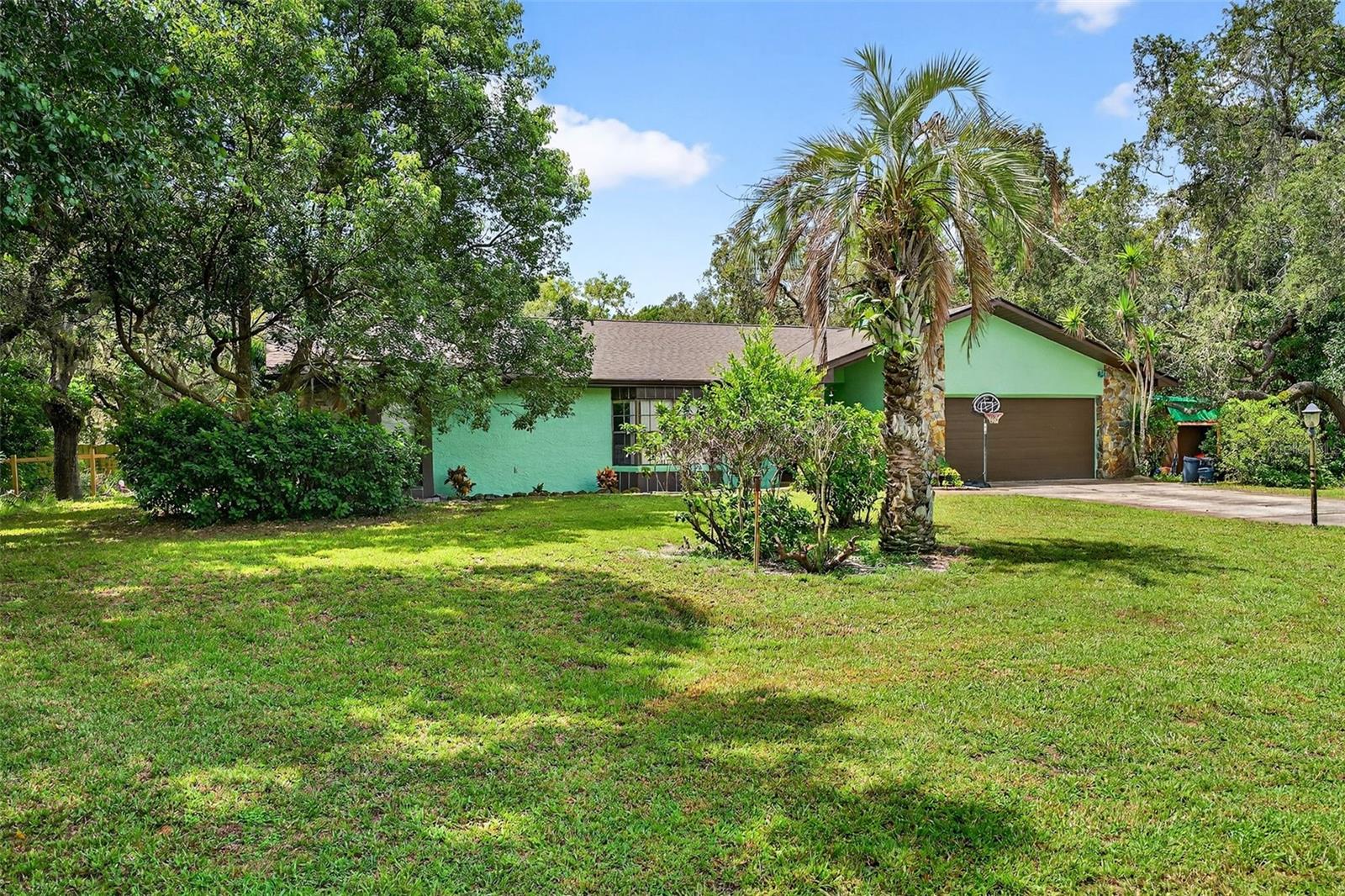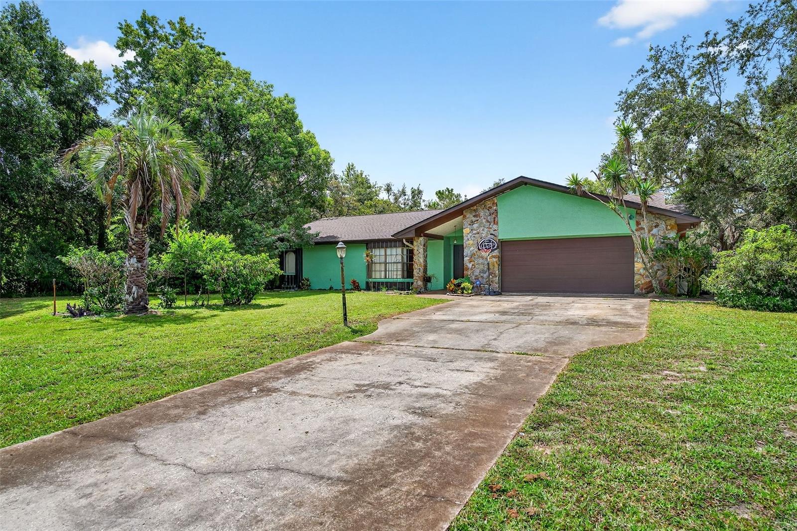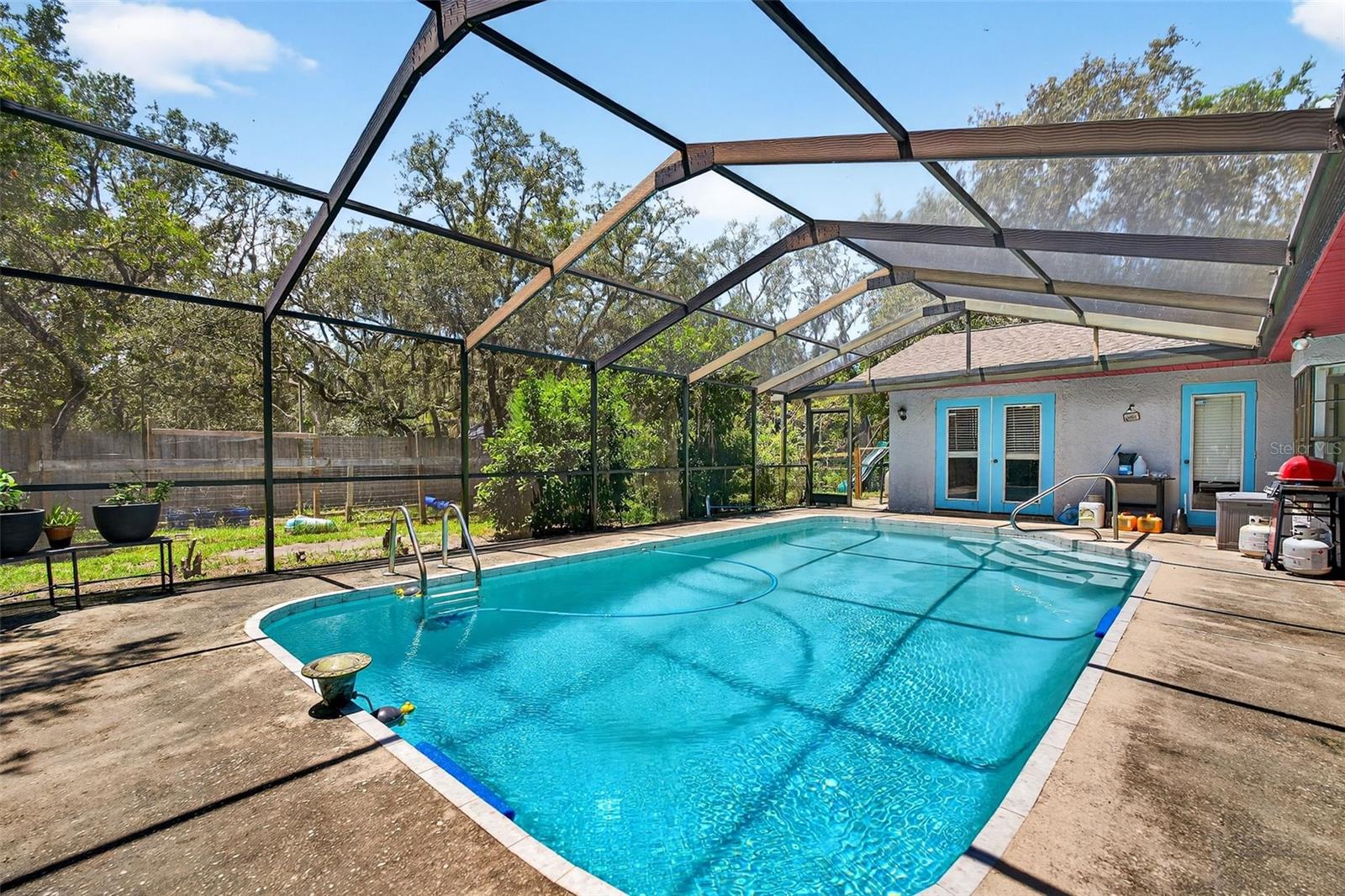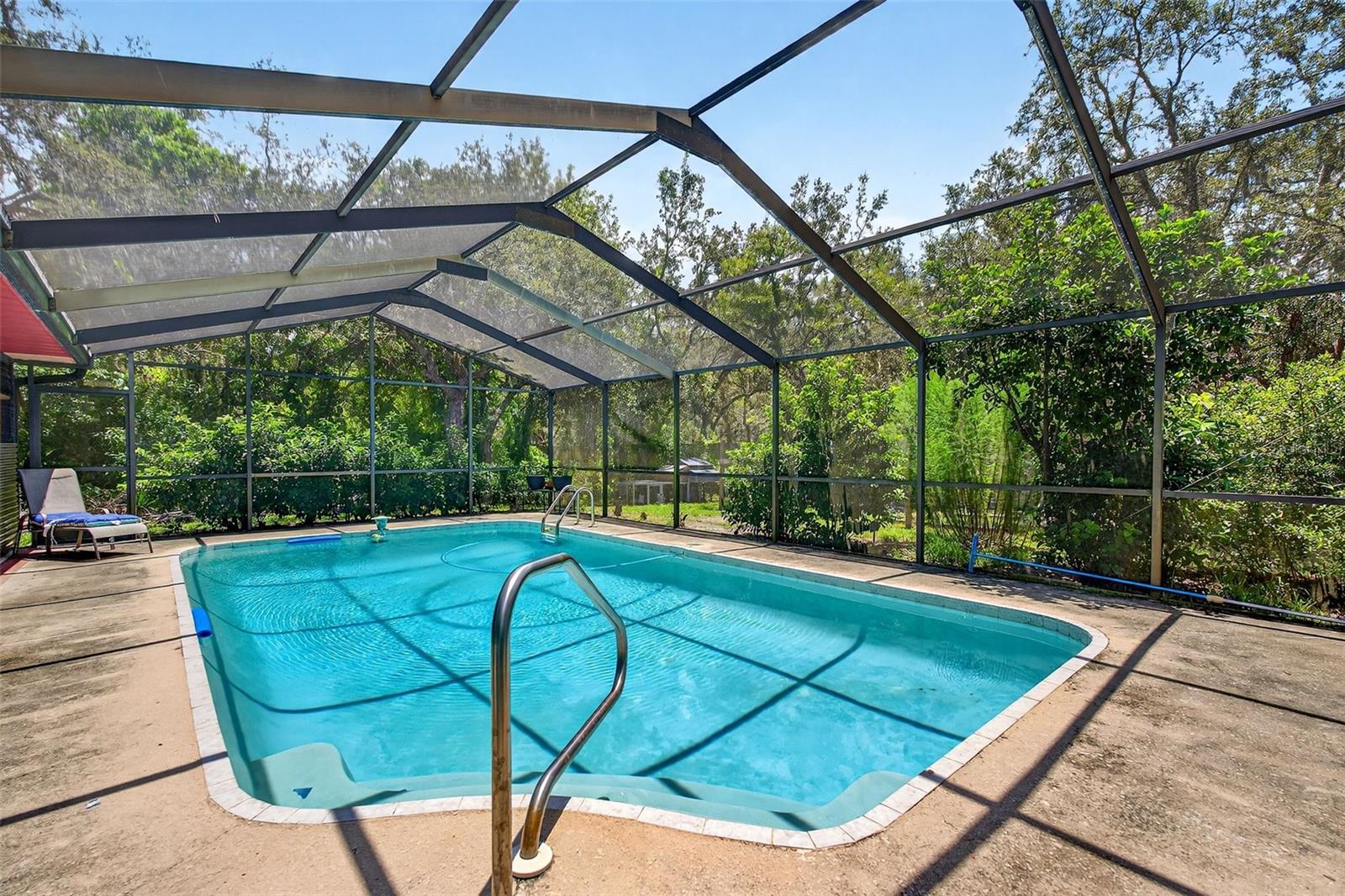 Welcome to this beautifully maintained 3-bedroom, 2-bathroom pool home with a 2-car garage, perfectly situated on a FULL ACRE of land with NO HOA and NO DEED RESTRICTIONS—giving you the freedom to park your boat, RV, or simply enjoy wide open space. Offering over 2,300 square feet of living space, this home blends comfort, functionality, and plenty of room to entertain both inside and out. Step into the inviting sunken living room, complete with a wood-burning fireplace, built-in shelving, and a wet bar—the perfect spot for gatherings with family and friends. The spacious primary suite is truly a retreat, featuring patio doors that open directly to the screened pool and lanai, a huge walk-in closet, and a luxurious ensuite bathroom with a double-sink vanity, relaxing Roman tub, and walk-in shower. The split-bedroom layout offers privacy for all. The second bedroom includes built-in desk and shelving, a large walk-in closet, and its own set of patio doors leading to the pool area—ideal for guests or a home office. The third bedroom also features a generous walk-in closet. The second bathroom is conveniently designed with an exterior door for direct pool access, making it easy to rinse off after a swim. The kitchen and dining areas offer plenty of cabinet and counter space for cooking and entertaining, while the inside laundry room adds convenience. Tile flooring runs throughout the home for easy maintenance. Additional upgrades include a whole-house water filtration system and a brand-new roof (2024), providing peace of mind for years to come. Step outside to your screened-in pool and lanai, perfect for relaxing or entertaining, all while enjoying the privacy and beauty of your 1-acre property. With no community restrictions, you have endless possibilities for gardening, storing recreational vehicles, or creating your own outdoor paradise. Don’t miss your chance to own this spacious, well-appointed home that combines indoor comfort with outdoor freedom—all just minutes from shopping, dining, and major highways. Schedule your private tour today!