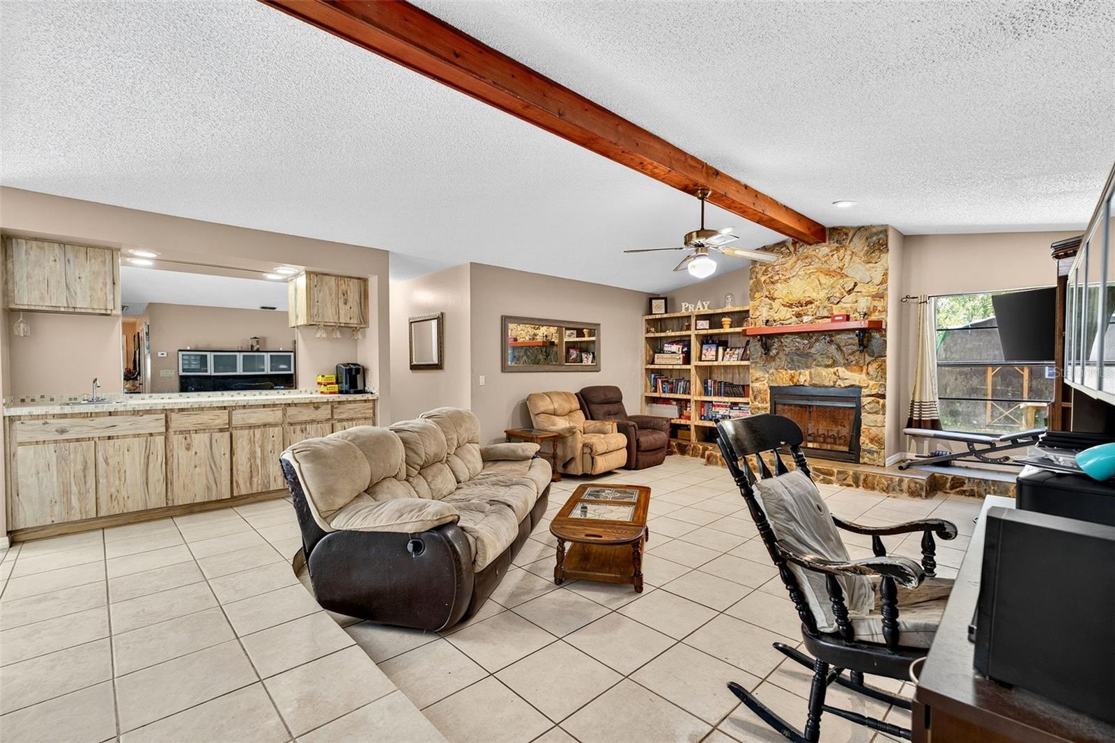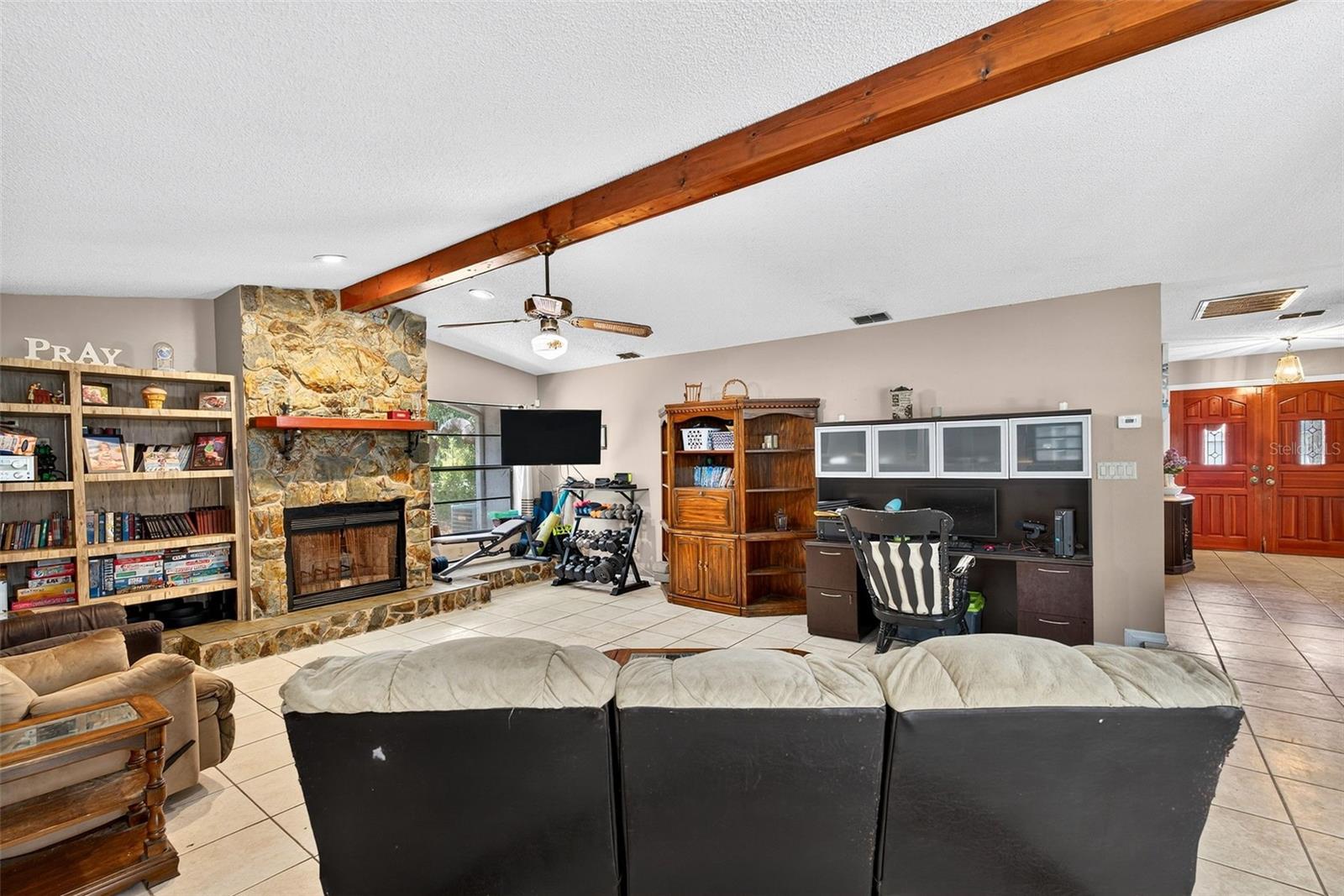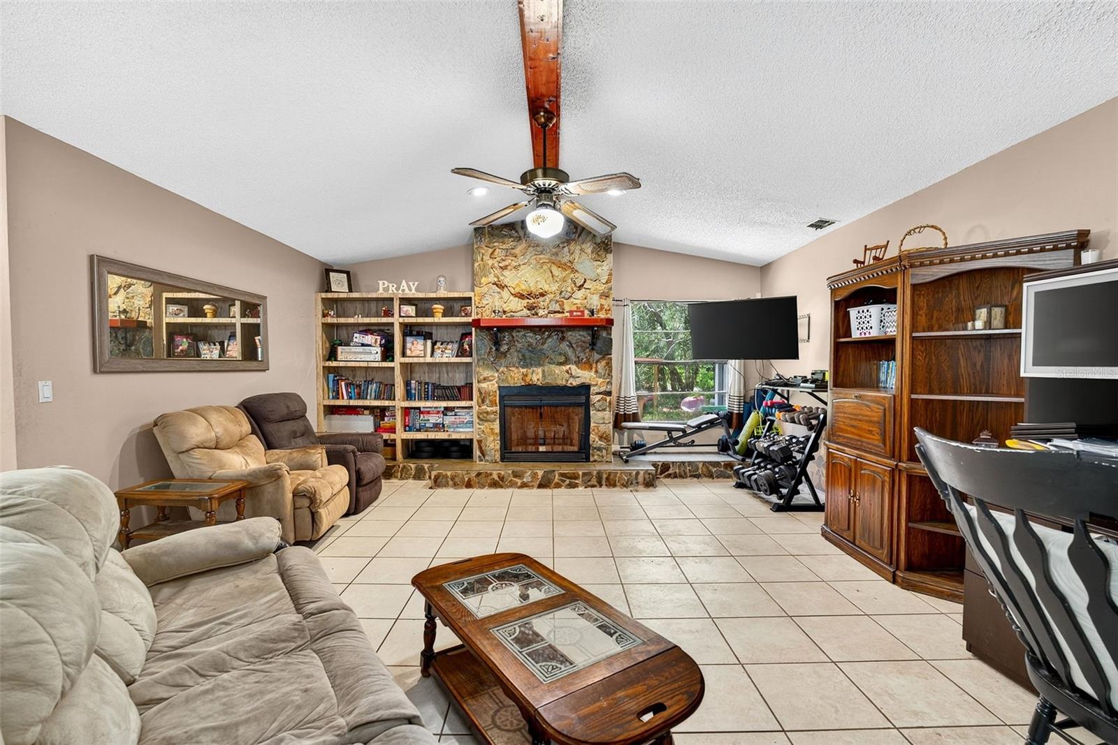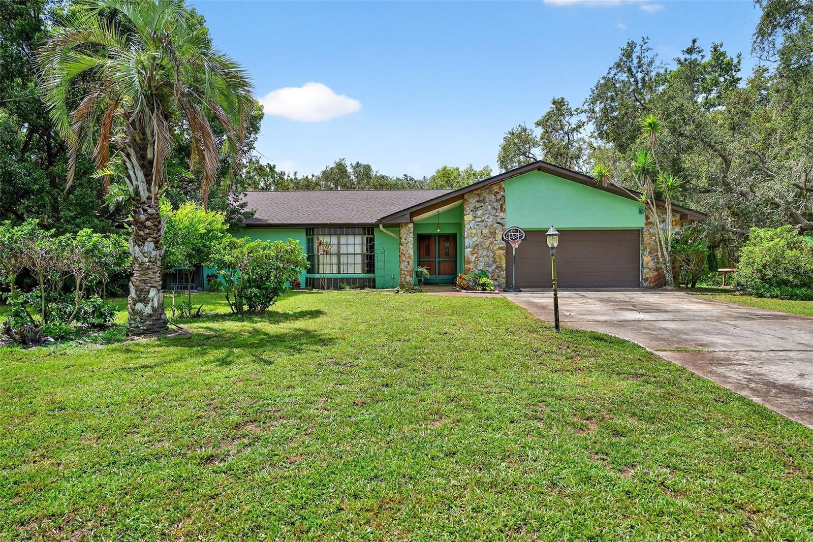 Welcome to this beautifully maintained 3-bedroom, 2-bathroom pool home with a 2-car garage, perfectly situated on a FULL ACRE of land with NO HOA and NO DEED RESTRICTIONS—giving you the freedom to park your boat, RV, or simply enjoy wide open space. Offering over 2,300 square feet of living space, this home blends comfort, functionality, and plenty of room to entertain both inside and out. Step into the inviting sunken living room, complete with a wood-burning fireplace, built-in shelving, and a wet bar—the perfect spot for gatherings with family and friends. The spacious primary suite is truly a retreat, featuring patio doors that open directly to the screened pool and lanai, a huge walk-in closet, and a luxurious ensuite bathroom with a double-sink vanity, relaxing Roman tub, and walk-in shower. The split-bedroom layout offers privacy for all. The second bedroom includes built-in desk and shelving, a large walk-in closet, and its own set of patio doors leading to the pool area—ideal for guests or a home office. The third bedroom also features a generous walk-in closet. The second bathroom is conveniently designed with an exterior door for direct pool access, making it easy to rinse off after a swim. The kitchen and dining areas offer plenty of cabinet and counter space for cooking and entertaining, while the inside laundry room adds convenience. Tile flooring runs throughout the home for easy maintenance. Additional upgrades include a whole-house water filtration system and a brand-new roof (2024), providing peace of mind for years to come. Step outside to your screened-in pool and lanai, perfect for relaxing or entertaining, all while enjoying the privacy and beauty of your 1-acre property. With no community restrictions, you have endless possibilities for gardening, storing recreational vehicles, or creating your own outdoor paradise. Don’t miss your chance to own this spacious, well-appointed home that combines indoor comfort with outdoor freedom—all just minutes from shopping, dining, and major highways. Schedule your private tour today!