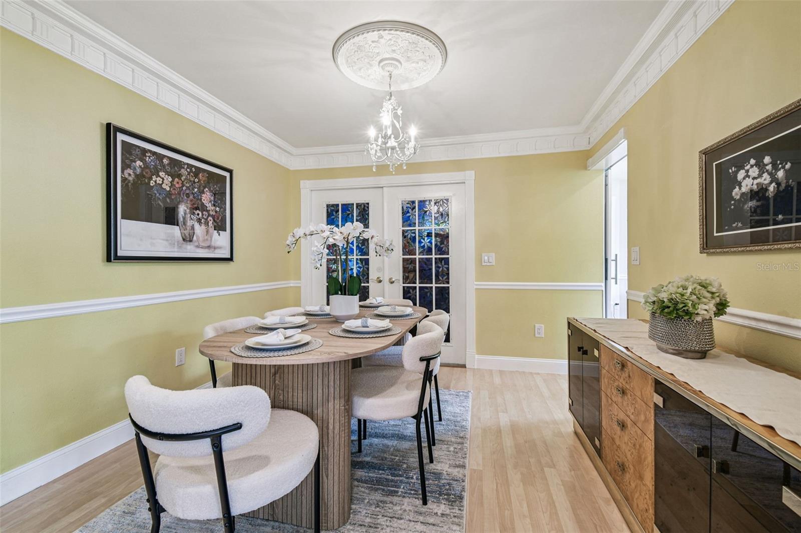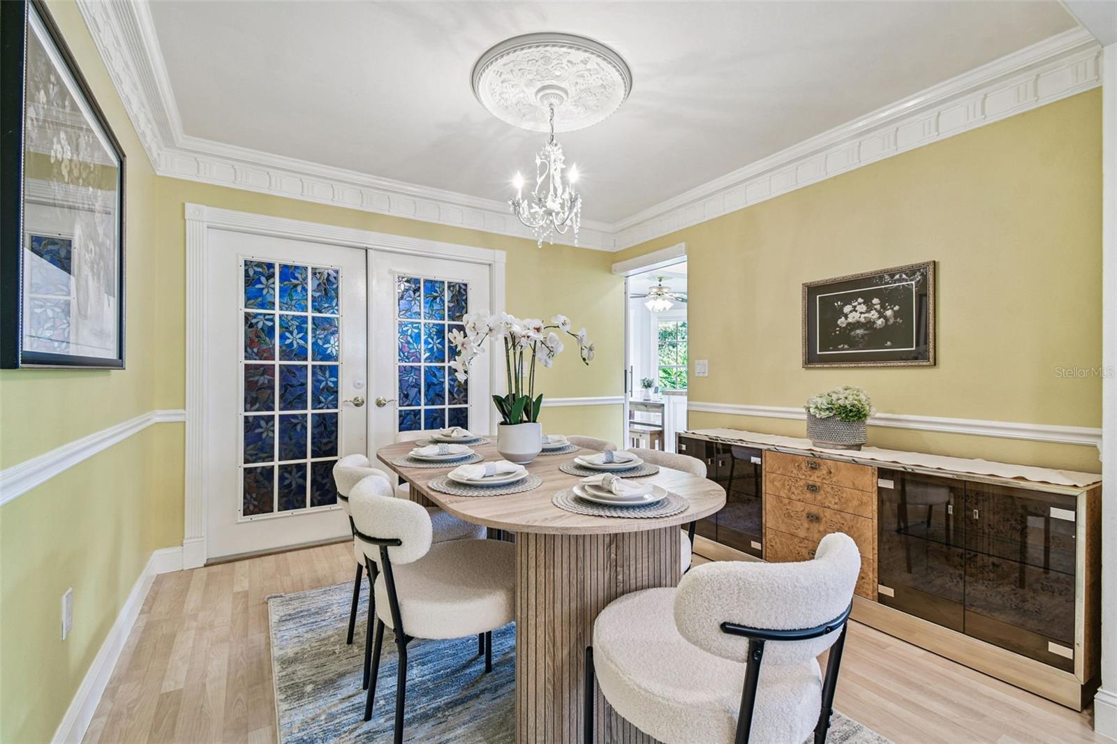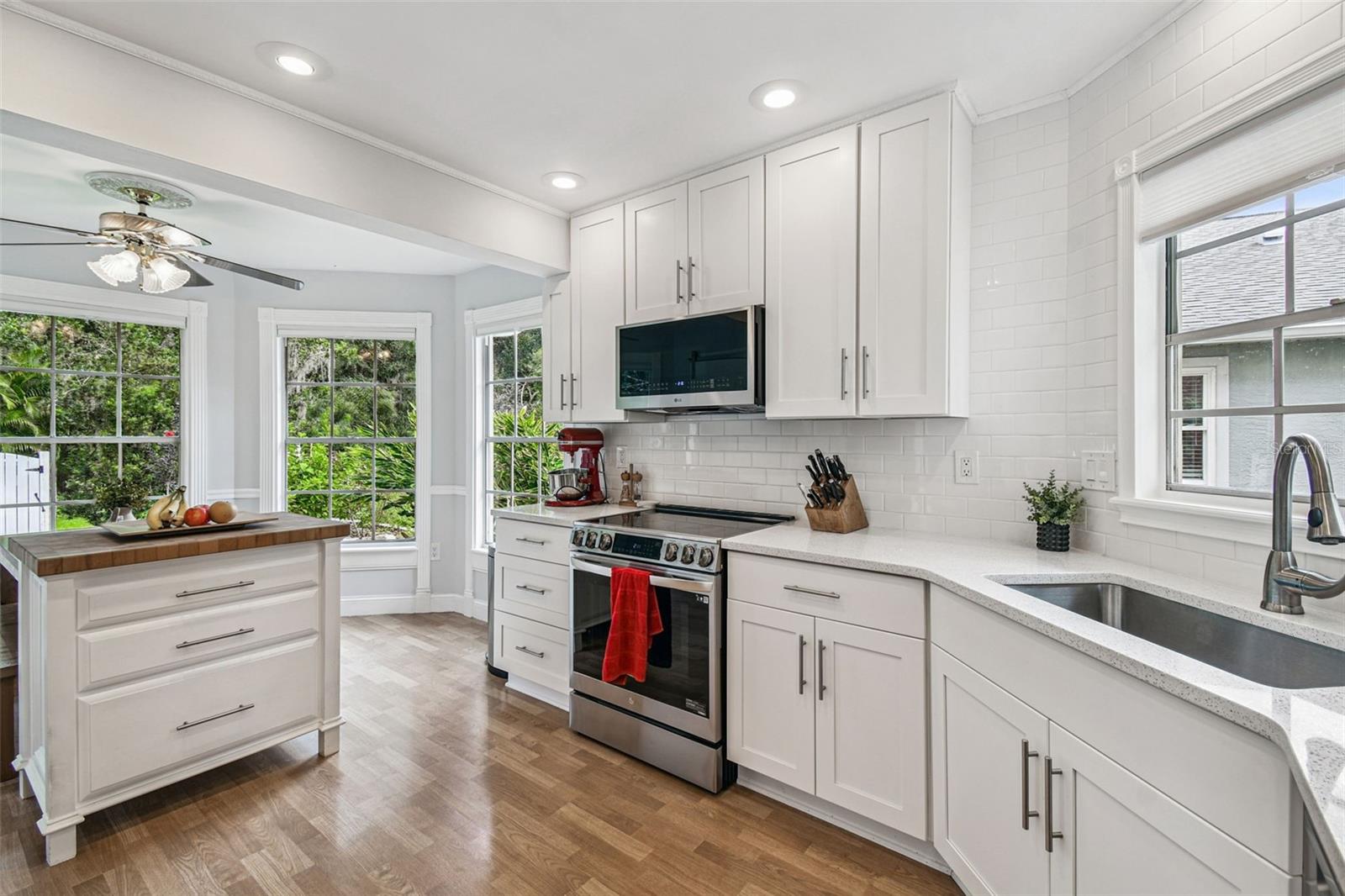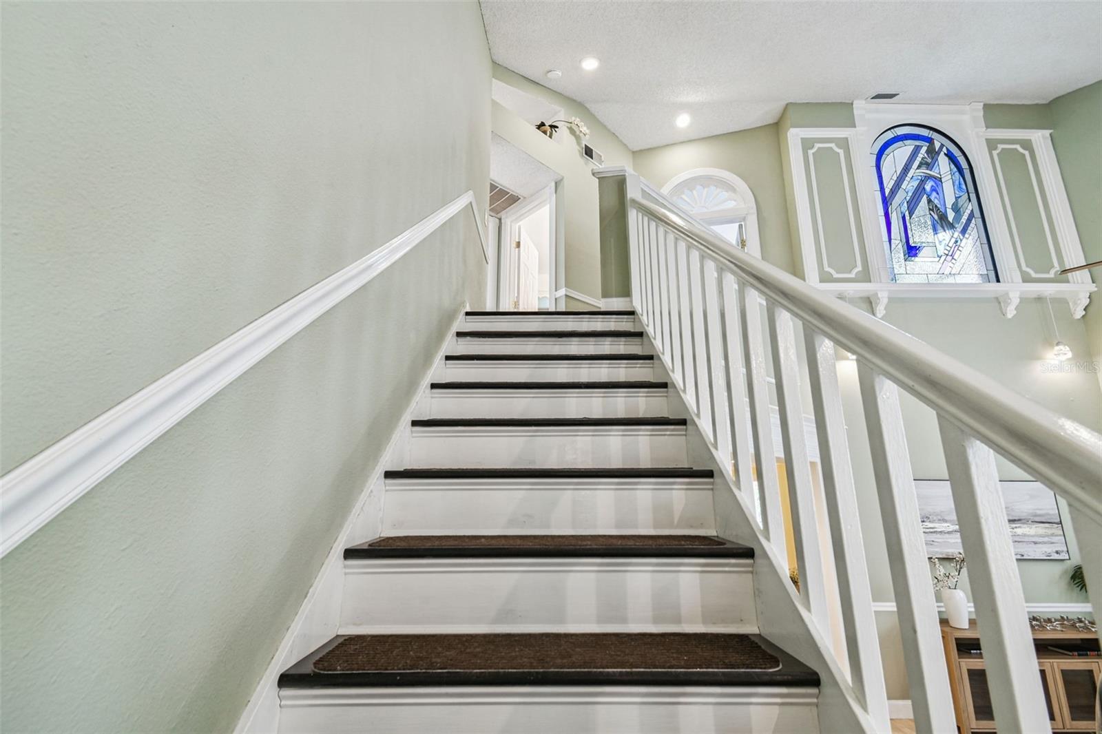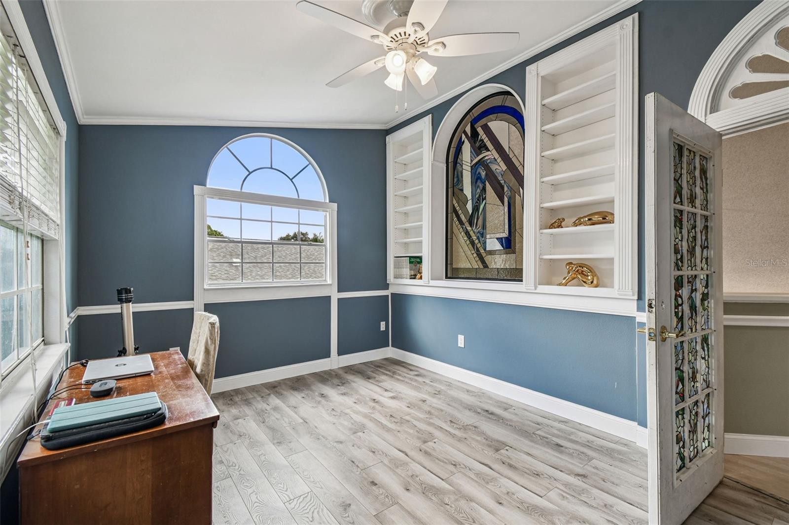 REMODELED! This distinctive 3 bedroom PLUS OFFICE or could be 4th bedroom, two-story home combines classical craftsmanship with modern luxury. Eye catching exterior is warm and inviting. Large lot with endless potential. Once inside you will appreciate the unique floor plan and design. The two-story great room features soaring 20-foot ceilings, abundant natural light, and an elegant hardwood staircase. Custom millwork throughout includes picture frame molding, chair rails, crown molding, decorative ceiling medallions, and arched doorways with decorative transoms. The living room centers around a wood-burning fireplace with custom mantle and eye-catching stained glass insert. The adjacent formal dining room flows into the completely remodeled kitchen featuring light 42-inch shaker cabinets, gleaming quartz countertops, subway tile backsplash, stainless steel appliances, stunning bay window breakfast nook, and walk-in pantry with barn door. The spacious primary suite on the main floor offers single-level living with beautiful French doors adding architectural elegance. The ensuite bathroom showcases dual vanities, tiled walk-in shower with Corian base, soaking tub, and generous walk-in closet. Upstairs, two generous bedrooms share a fully remodeled bathroom plus a versatile bonus room with vaulted ceilings and dramatic stained glass window set within custom built-in shelving—perfect as fourth bedroom, home office, or artist's studio. The 8x21-foot Florida room with ceramic tile flooring delivers 168 square feet of pure functionality: storing bikes without sacrificing garage space, beach gear accessible but organized, gardening supplies and potting area, holiday decorations properly stored, craft supplies and hobby projects that stay set up, seasonal sports equipment rotation, pet washing area, or workshop space where messes don't matter. This room keeps garages for cars, dining tables for dining, and spare bedrooms as bedrooms. No carpet throughout—luxury vinyl, tile, or plank flooring everywhere. 2024 roof, gutters, two-car garage, main floor half-bath, wired for surround sound, network cabling in 4 rooms, covered front porch, detached shed/workshop, partially fenced yard with established gardens. Within one mile of Nature's Hideaway: brand new fire station, major grocery, dining, shopping. Six major commuting routes nearby. Minutes to 20,000+ acres at Brooker Creek and Starkey Wilderness Preserves where Pinellas Trail connects to Suncoast Trail, world-class beaches at Honeymoon Island State Park, historic Tarpon Springs community, downtown New Port Richey's walkable riverfront with farmers markets and festivals, plus Caladesi Island, Anclote Key, and Werner-Boyce state parks. No CDD fees, low HOA, NO flood zone, all appliances included.
