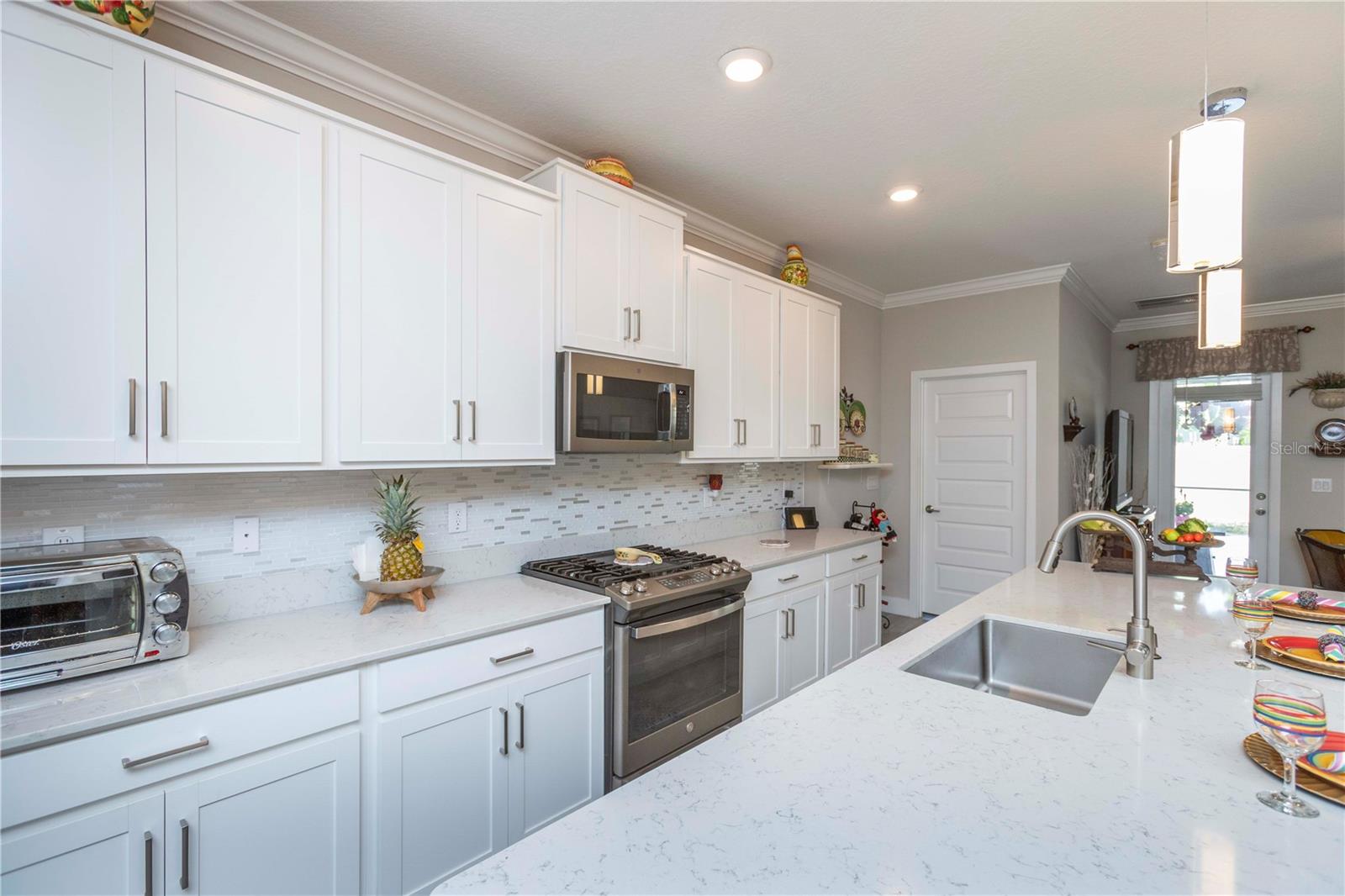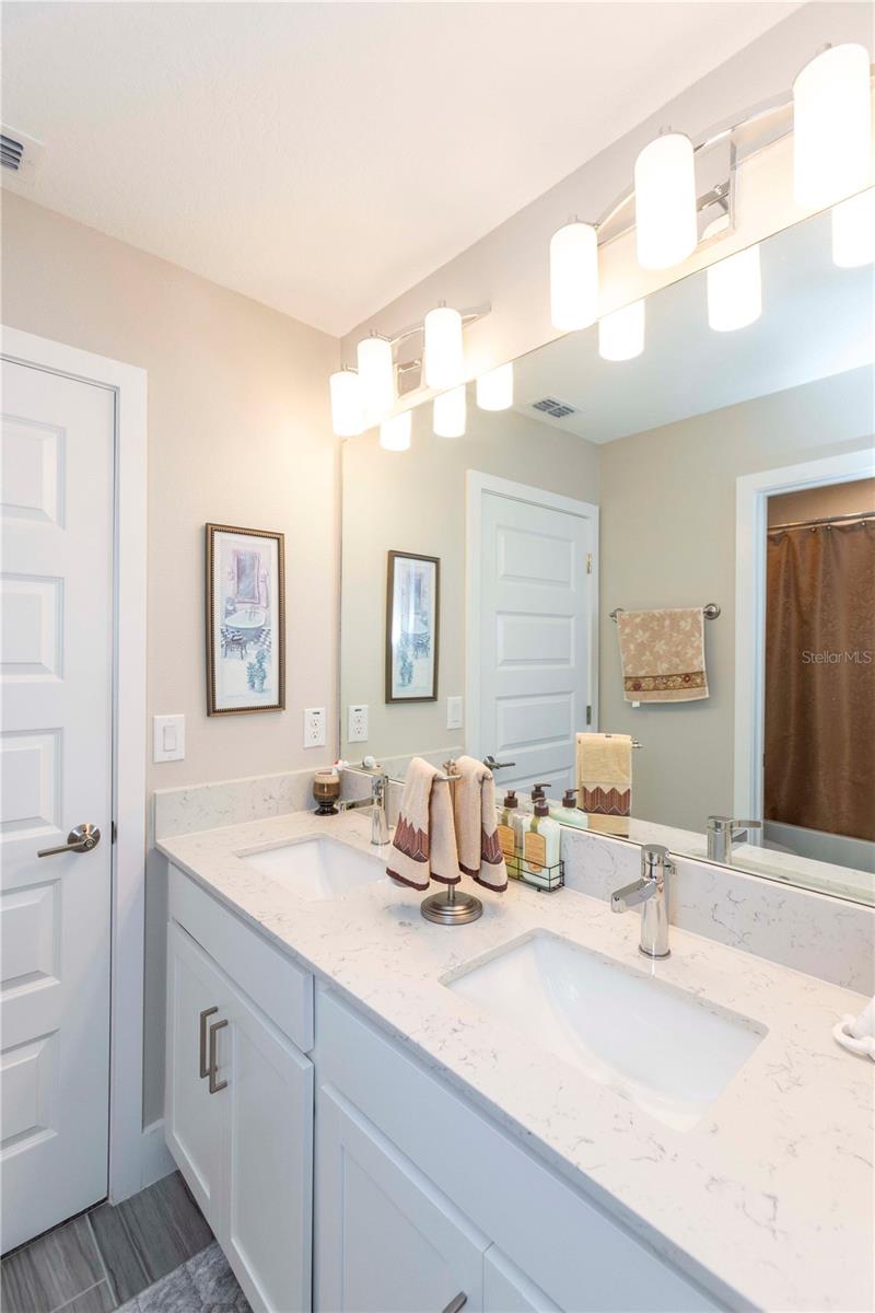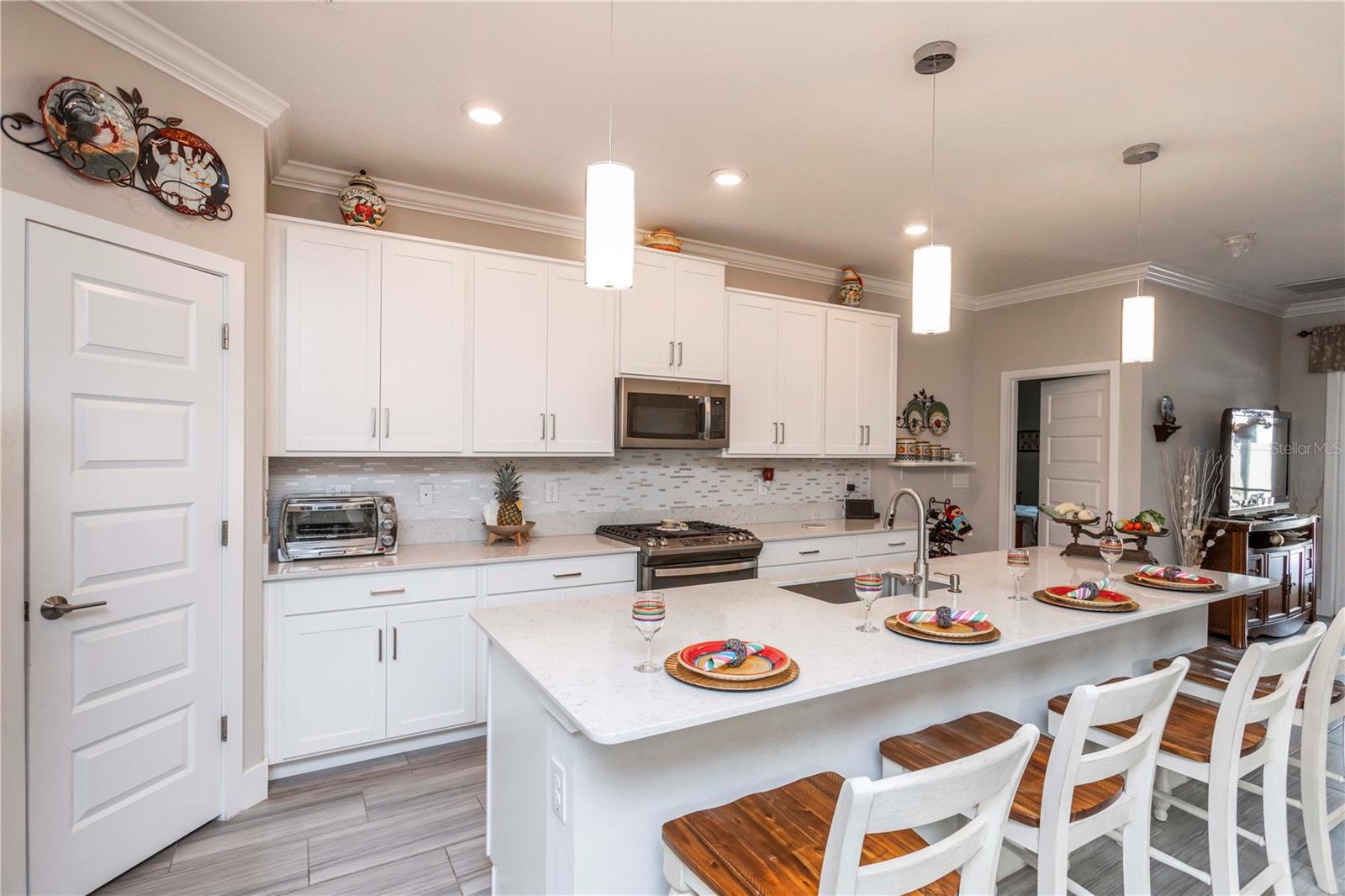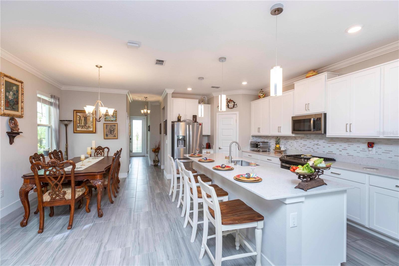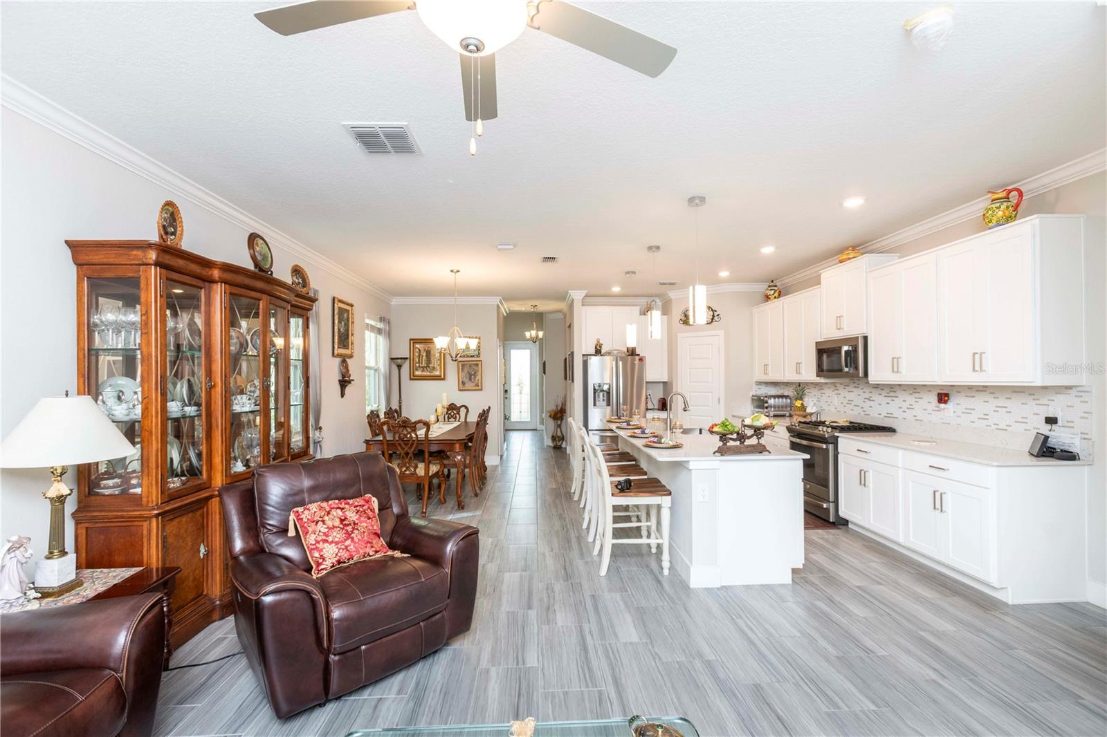 Welcome to Bryant Square! This 2021 Lennar-built Massachusetts model combines thoughtful design, modern finishes, and an unbeatable location—all in pristine, move-in ready condition. With 5 bedrooms, 3.5 baths, and a 2-car garage, there’s plenty of room to live, work, and unwind. Step inside to a bright and open layout. To the left, the kitchen is a chef’s dream, showcasing a gas range, quartz countertops, microwave, and a large island with seating for four. To the right, the dining area comfortably accommodates a full dining set. Continue into the spacious living room, accented with elegant crown molding and finished with sleek 12x24 ceramic tile. The primary suite is located on the main floor, featuring dual sinks, a walk-in closet, and a private bath designed for relaxation. The screened, tiled porch offers the perfect extension of the living space, ideal for entertaining or simply enjoying the Florida breeze. Thoughtful details like double-pane windows, a gas water heater and dryer, and a whole-house water softener enhance efficiency and convenience. A tucked-away desk area and half bath on the main level add extra flexibility. Upstairs, you’ll find four additional bedrooms, 2 with walk in closets, plus two full baths and a versatile loft that can serve as a media room, home office, or second living area. Enjoy resort-style amenities—a clubhouse with a large pool, lounge areas, shaded tables, BBQ facilities, winding walking paths, and recreation spaces for outdoor activities. Minutes from hospitals, Trinity College, shopping, and dining, with Tampa only 40 minutes away and pristine Gulf beaches 30 minutes.