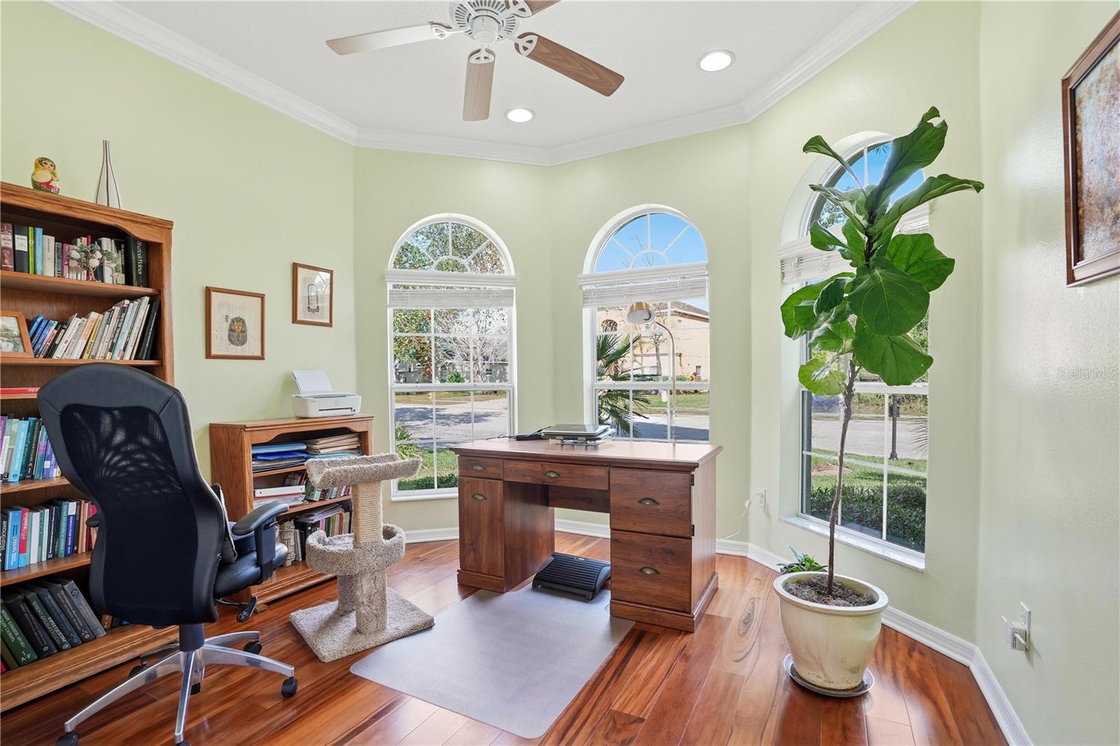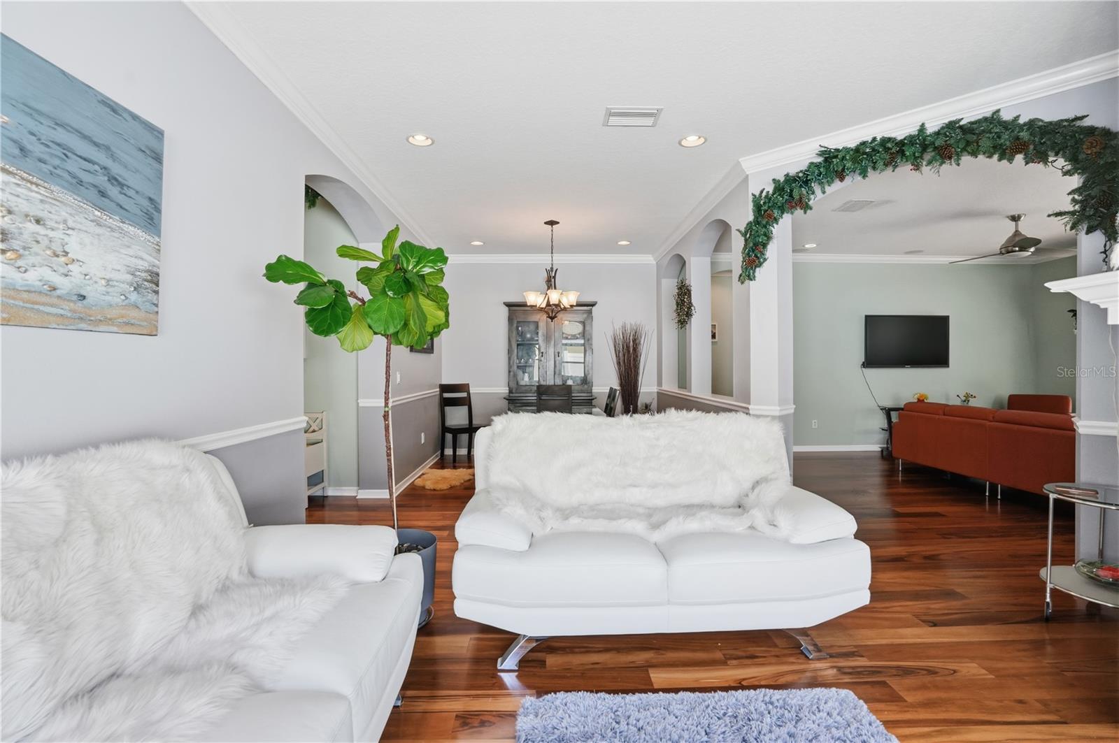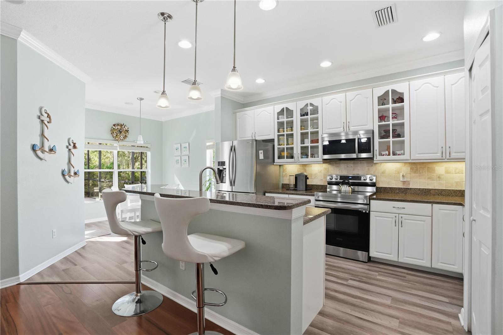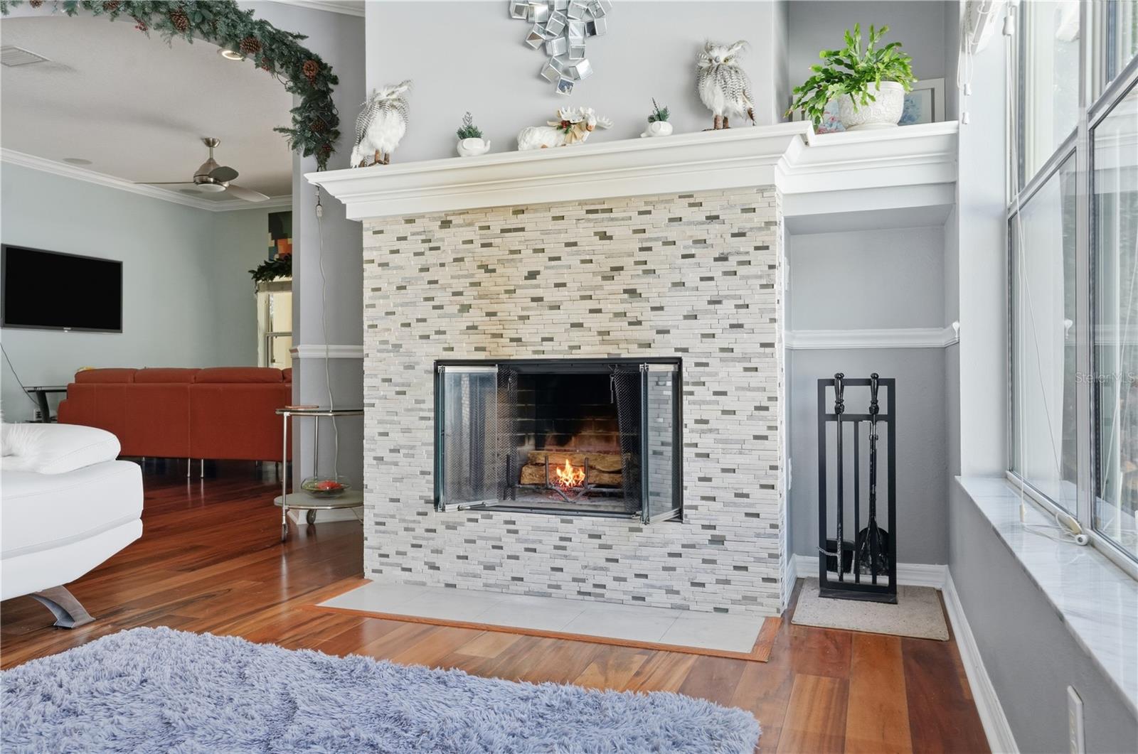 Heated Pool !!!! Low HOA NO FLOOD Welcome to this stunning 4bed 3 Bath 3 car garage home located in a quiet, no-outlet road within the highly desirable gated community of Waters Edge . An open floor plan, soaring high ceilings, elegant crown molding, and engineered hardwood flooring throughout the main living areas. At the heart of the home is a custom-built kitchen complete with quality cabinetry, ample storage, and a charming breakfast nook overlooking the screened-in pool area. With a spacious Family room that also overlooks the pool allowing greater visual access for safety and creating a seamless indoor-outdoor feel for family fun and relaxation. This home also boast a showcase custom fireplace in Formal living room that adds warmth and character. The bedrooms are is split two in front and 2 with the primary bed and 3rd bedroom connected by a dual entry primary bath making this a truly family friendly home. Primary bed also has outside access to pool area. Step outside to your private outdoor oasis, where a screen-enclosed, built-in pool provides the perfect space to relax and entertain—NO rear neighbors for added privacy. AC is 2022 Hot water Heater 2025 and Roof 2010 With a 5 year Certification available Located in a family-friendly subdivision, this community offers exceptional amenities including a clubhouse, pool, gym, basketball court, and a large fishing lake with a dock. Lots of planned community events. Enjoy peaceful living with the security of a gated entrance and easy access to nearby conveniences. This beautifully maintained home truly offers the best of Florida living.
