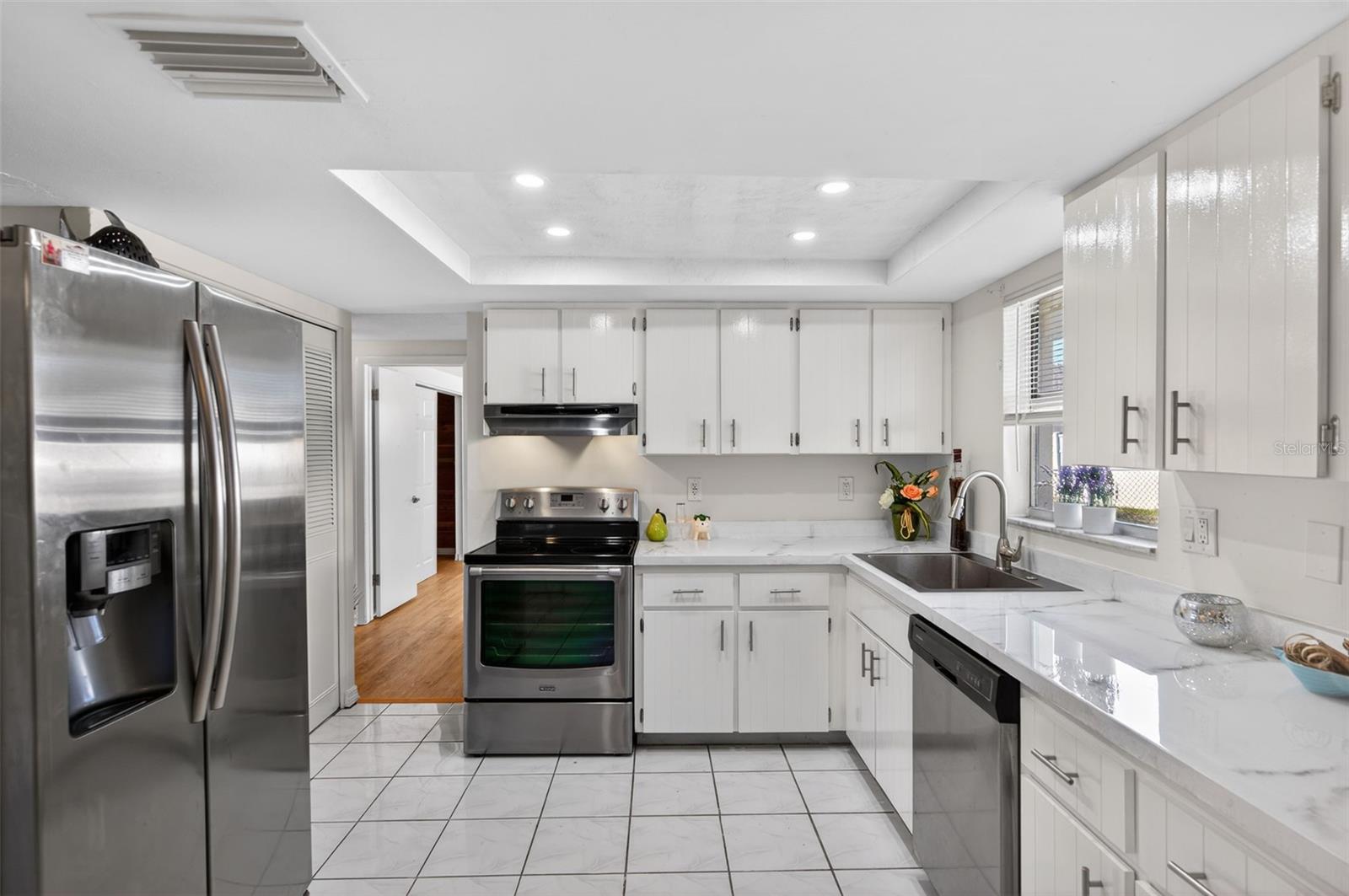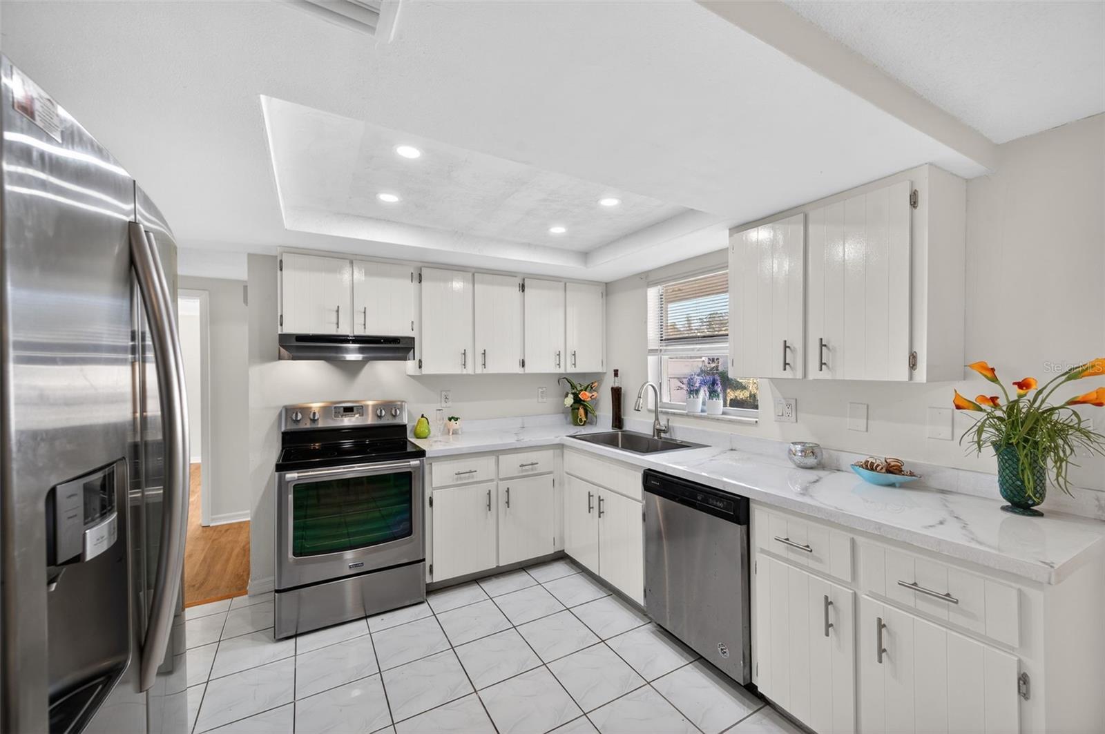 WELCOME TO YOUR TROPICAL PARADISE at 7547 Cumber Dr, New Port Richey, FL in the established Magnolia Valley subdivision in Pasco County. This FANTASTIC home consists of 3 bedrooms, 2 bathrooms & 1 car garage in a NO HOA or NO CDD zone. Key exterior features are low maintenance front lawn with a MAJESTIC shade tree as its centerpiece, raised garden planter, carriage lights, rain gutters, concrete long driveway & walkway as well as a covered front porch. As you step through the front door, you'll LOVE the dedicated foyer with coat closet & the FRESH interior paint in a CRISP CLEAN COLOR! LUXURY VINYL floors have just been installed in the living room & all 3 bedrooms (1/2026) & the kitchen, dining room & bathrooms feature ceramic tile (NO CARPET ANYWHERE). The AMAZING kitchen consists of updated appliances (stainless steel side-by-side fridge with icemaker, smooth-top range, range vent & dishwasher), DEEP stainless steel farmhouse-style NEW sink with gooseneck faucet, plentiful cabinets with MODERN hardware, pantry closet & SUPER COOL epoxied counters for an artistic flair. Off the dining area is the primary bedroom with ceiling fan, closet, access to the screened lanai & private en-suite. The primary bathroom features newer vanity with sink, toilet & step-in shower. In this split bedroom plan, the 2nd & 3rd bedrooms are found on the opposite side of the home with the full bathroom nearby. These SPACIOUS bedrooms have ceiling fans & cedar closets with new sliding closet doors. The guest bathroom features 2 mirrored medicine chests, tray ceiling, recessed lights, UPDATED vanity with cultured marble counter & tub/shower combo. There is a CONVENIENT oversized linen closet in the hall. More details to LOVE about the home: the windows have blinds for added privacy, the backyard is FULLY FENCED with a chain link fence & the covered & screened lanai has a carriage light & painted concrete floor. The garage, with freshly painted floor, has attic access, side door exit & laundry hookups. Your STELLAR home is located close to restaurants, shopping, medical/professional offices, festivities & tourist attractions! MAKE THIS YOUR FUTURE HOME!