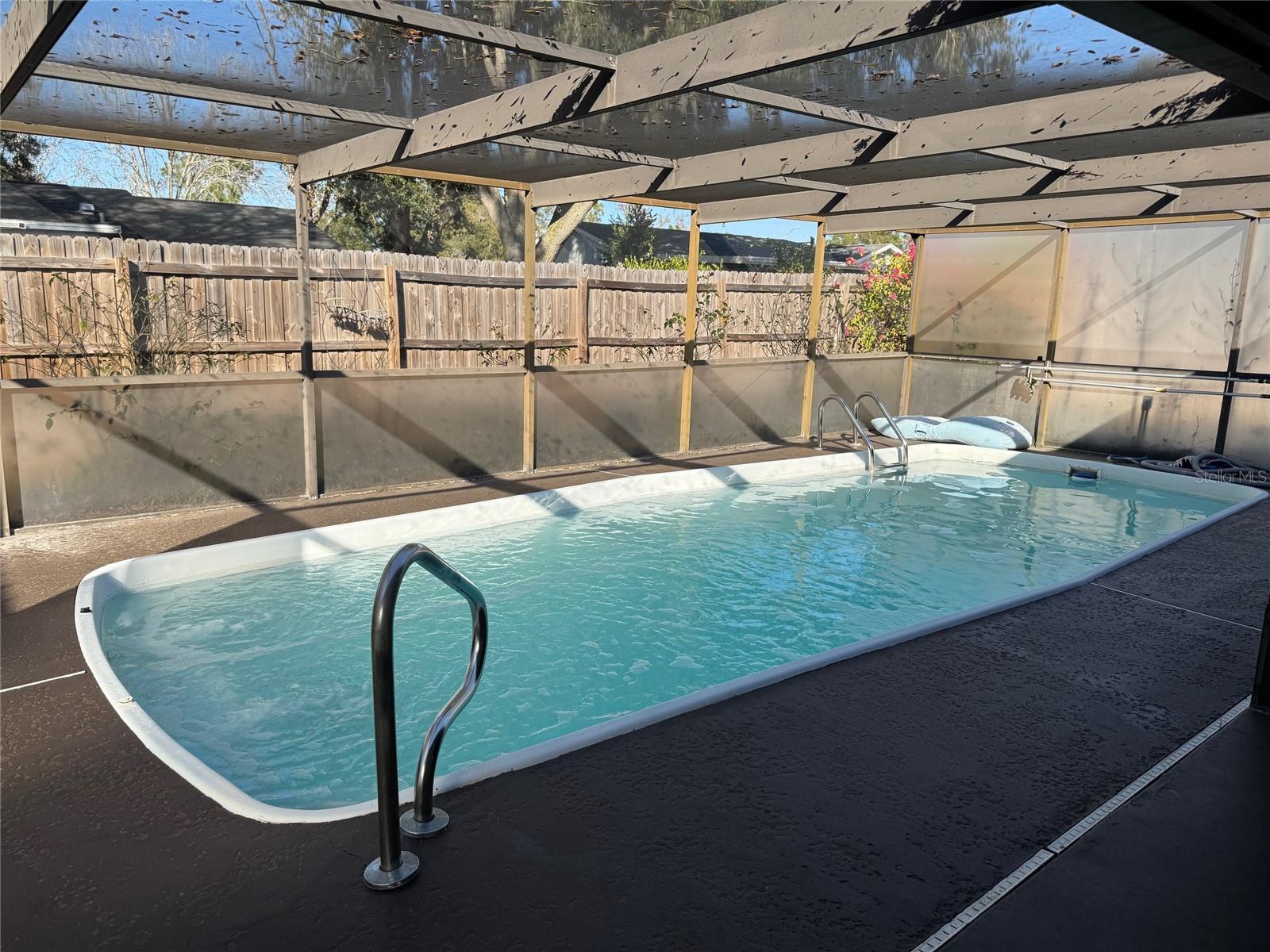 2/2/1 - POOL HOME - 12X24 DETACHED GARAGE/WORKSHOP BUILT IN 2020. - This home features a NEW ROOF installed in 2021 and a NEW FRONT DOOR added in 2024. It boasts laminate flooring throughout, an UPDATED guest bathroom, REMODELED kitchen cabinets and countertops, as well as a NEW refrigerator. There is NO HOA and it is located in a NO FLOOD ZONE. The oversized back porch is equipped with privacy screening, providing ample outdoor space for entertaining, outdoor cooking, or enjoying your morning coffee in the warm FLORIDA SUNSHINE. Schedule an appointment to see this home, you won't be disappointed.