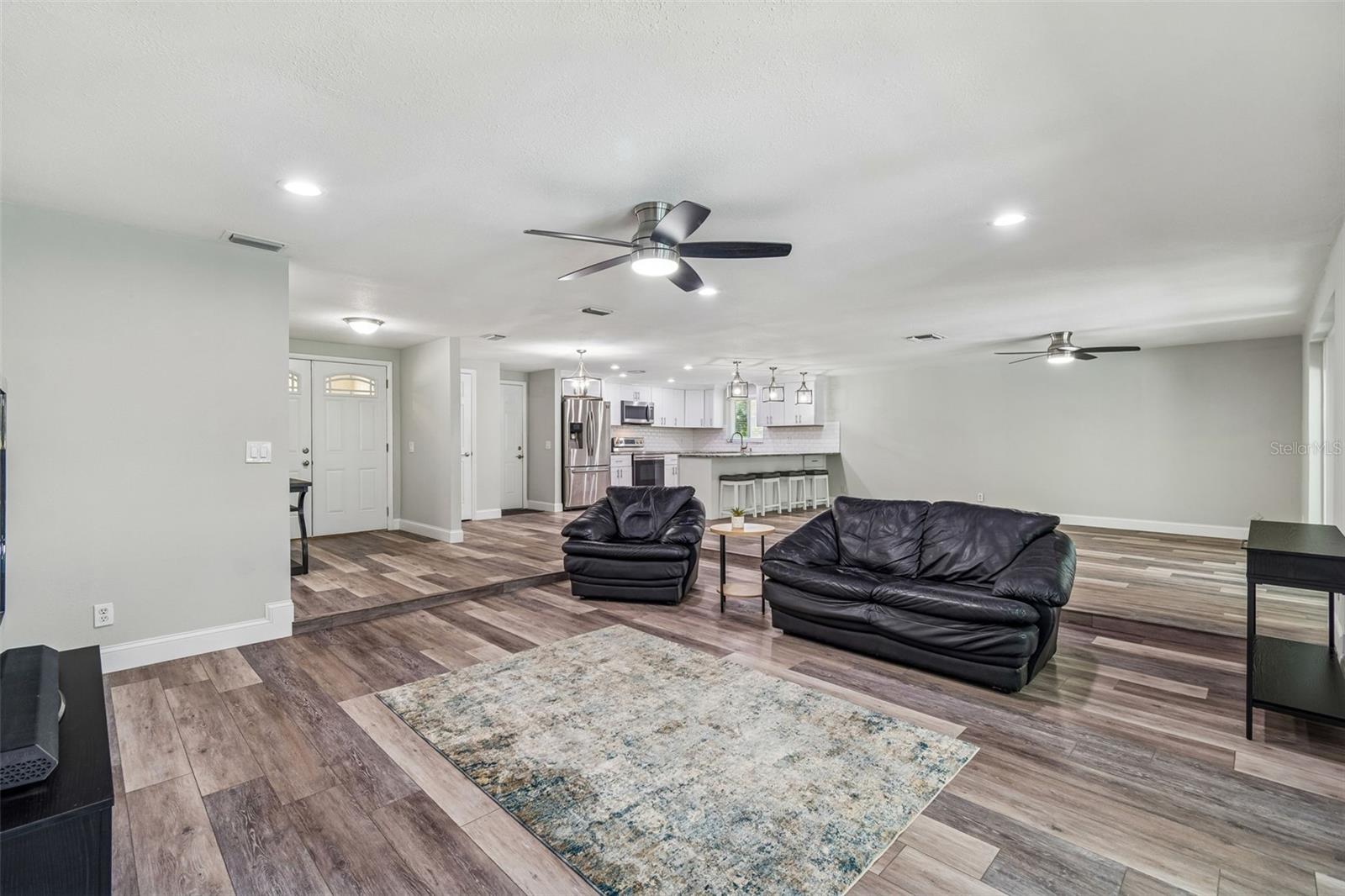 Welcome to Golden Acres, where privacy, space, and modern updates come together beautifully. This fully remodeled 3 bedroom, 2 bath pool home offers exceptional curb appeal with mature trees, fresh landscaping, brand-new exterior paint, a new roof, newer windows, and a spacious 2 car garage. Inside, you’ll find a bright and open floor plan with expansive living areas and flexible layout options. The remodeled kitchen features white soft close wood cabinetry, fantasy brown granite countertops, and abundant workspace, flowing seamlessly into the main living space. The split bedroom layout includes two generously sized secondary bedrooms and a beautifully updated hall bath with new tile and modern finishes. The oversized primary suite easily accommodates a king sized bed, offers a walk in closet, double French doors leading to the pool area, and a private bath with double vanity and updated shower. Step outside to your private backyard retreat featuring an expansive covered patio spanning nearly the entire length of the home, complete with ceiling fans and lighting, plus a large swimming pool ideal for entertaining. The lot provides excellent privacy with wooded surroundings and generous side yard space, and includes a matching storage shed. This move in ready Golden Acres pool home offers space, style, and privacy — all in one exceptional property. (ROOF-2007)(A/C-2026)(W/H-2015)