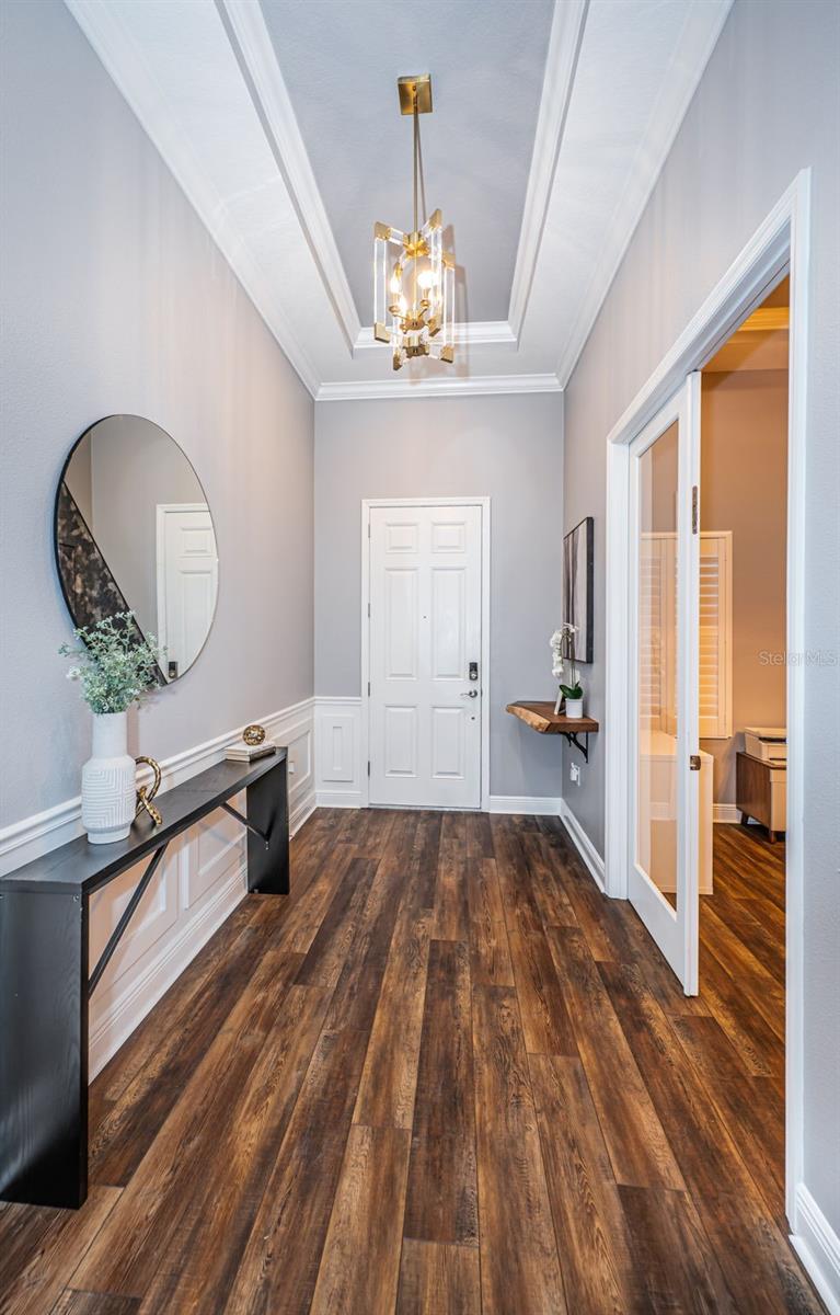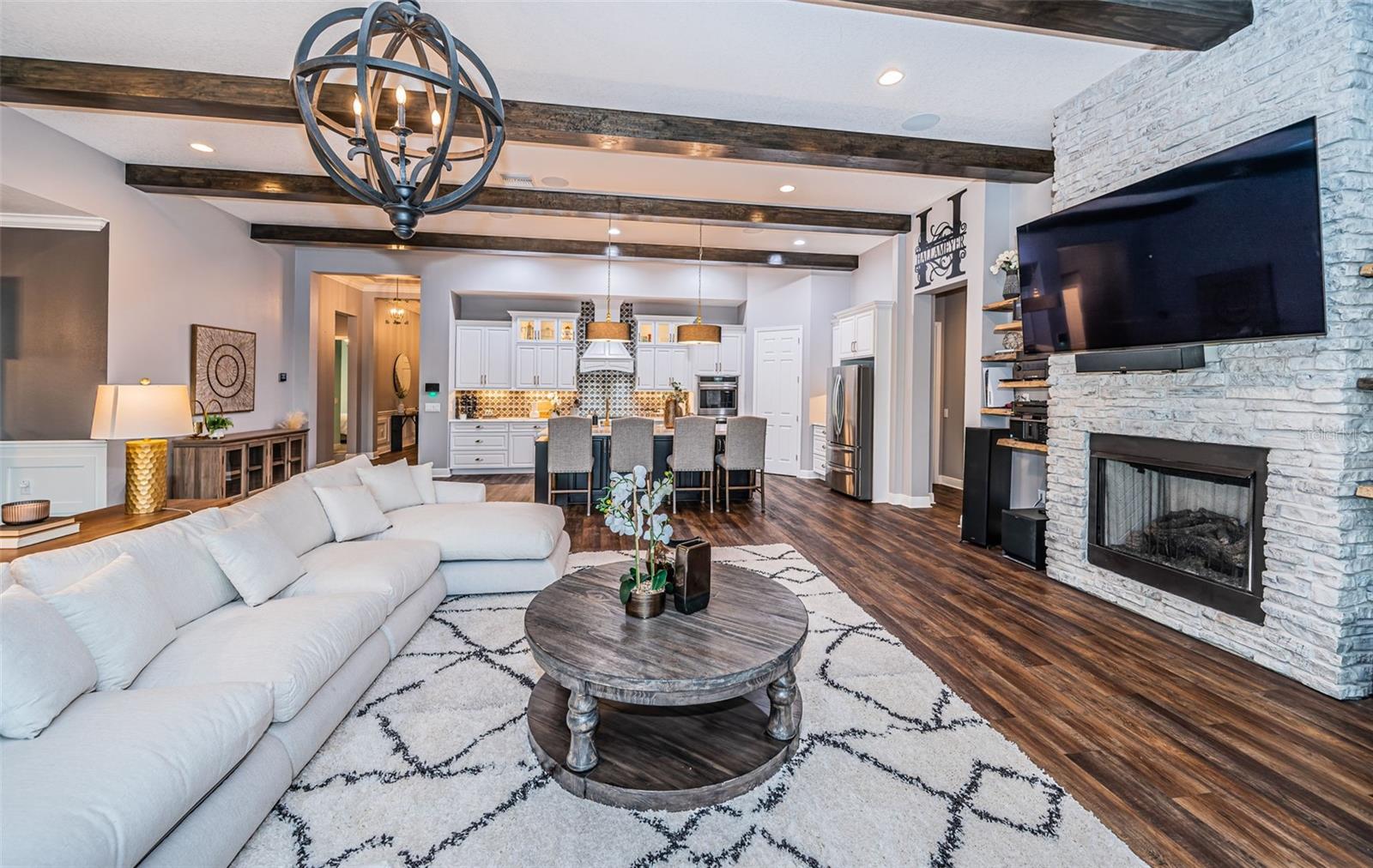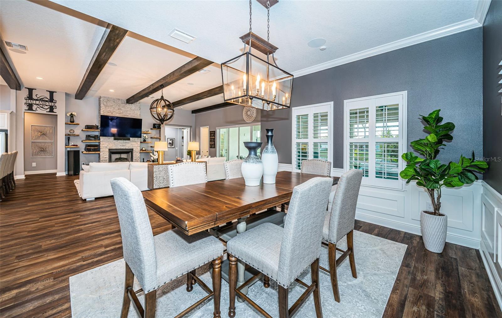 This home is perfectly positioned to capture serene water views and golden sunset skies, this exceptional 4-bedroom, 3-bath pool home is a masterclass in refined Florida luxury within the coveted gated Longleaf Woodlands Community. From the moment you enter, architectural wood beams, curated designer lighting, and custom plantation shutters create an ambiance that is both sophisticated and inviting. The heart of the home is a chef-inspired kitchen appointed with premium GE Café appliances, beautiful upgraded cabinetry, and elegant finishes—seamlessly flowing into expansive living spaces anchored by a striking fireplace. The primary suite is a private sanctuary designed for indulgence. A spa-caliber bath showcases a freestanding soaking tub, walk-in glass shower, and elevated finishes that evoke a five-star resort. The custom-designed walk-in closet offers both form and function with impeccable organization. Designed for modern living, the flexible fourth bedroom serves beautifully as a private executive office. An oversized laundry and mudroom enhance everyday living, while the three-car garage provides generous space for vehicles and storage. Step outdoors to your private resort: a sparkling pool overlooking tranquil water views, creating an idyllic backdrop for entertaining or peaceful evenings under the Florida sky. Solar enhancements add efficiency without compromising elegance. Life in The Woodlands offers access to amenities including a clubhouse, community pool, parks, playgrounds, basketball, pickleball, tennis, and volleyball courts. Enjoy close proximity to shopping, top-rated schools, medical facilities, scenic trails at Jay B. Starkey Wilderness Park, and the beloved local destination Starkey Market. This is not simply a residence — it is a statement of lifestyle, comfort, and elevated design.