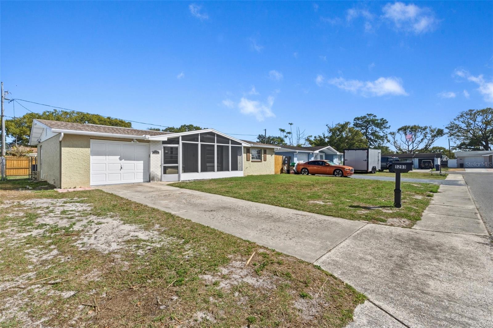 WELCOME TO YOUR SUPERB HOME at 5203 Manor Dr, New Port Richey, Pasco County, FL. This LOVELY home features 3 bedrooms, 1.5 bathrooms & 1 car garage located in a NO HOA, NO CDD & NO FLOOD ZONE. Key exterior features are long driveway, screened & covered front porch where you can meet & greet your neighbors, BEAUTIFUL front elevation with brick accents & decorative shutters, rain gutters, carriage lights, easy breezy tropical landscaping & FULLY FENCED yard. The house systems have all been replaced: AC installed 7/2018, water heater manufacture date is 5/2016 & roof installed 4/2014. The entire septic system was replaced around 2 years ago - new tank, new pipes, new leach/drain field and pumps. As you step inside, you'll LOVE the OPEN FLOOR PLAN consisting of the kitchen, dining & living rooms! The neutral color on the walls BRIGHTENS the interior while the laminate or ceramic tile floors throughout the home provide fluidity of design making the space feel larger & brighter (no carpet anywhere!). NATURAL SUNSHINE streams through the windows ILLUMINATING the house together with the various light fixtures. The RENOVATED kitchen features stainless steel appliances (range, dishwasher, disposal, microwave & French door fridge with water & ice maker), gray shaker cabinets with jet black MODERN hardware & soft-close hinges, complimentary light fixture, EXQUISITE GRANITE counters, deep double sink with gooseneck faucet, pantry & access to the garage. Create PRECIOUS memories during mealtimes in dining room featuring a ceiling fan & chair/box molding accents on the wall & then wind down in the LARGE living room. The primary bedroom can easily fit king-size furniture & has a cedarwood closet. The second bedroom also has a cedarwood closet. The 3rd bedroom features an armoire closet, wall AC unit & direct access to the backyard. This REMODELED bathroom consists of CRISP white shaker cabinet with contemporary hardware, cultured marble vanity with rectangular sink, framed mirror, built-in medicine cabinet, storage cabinet over toilet, newer toilet with bidet, gray subway tiled backsplash, towel bars, recessed lights, chair molding & combo tub/shower with safety grip handles. The second bedroom with shower & toilet is located in the garage. There is a linen closet in the hall for additional storage. In the OVERSIZED garage with newer garage door & epoxy floor, the laundry with INCLUDED WASHER & DRYER MACHINES, automatic garage door opener, attic access & side door exit are all found here. MORE SWEET features include new smoke detectors, custom blinds on some of the windows, metal rods with curtains, newer 6-panel interior doors, very nice sturdy mailbox & a big open, pavered patio in the back yard which is IDEAL for entertaining. Location is PERFECT near schools, restaurants, shopping plazas, medical facilities, places of worship, beaches & tourist attractions. MAKE THIS YOUR FUTURE HOME!