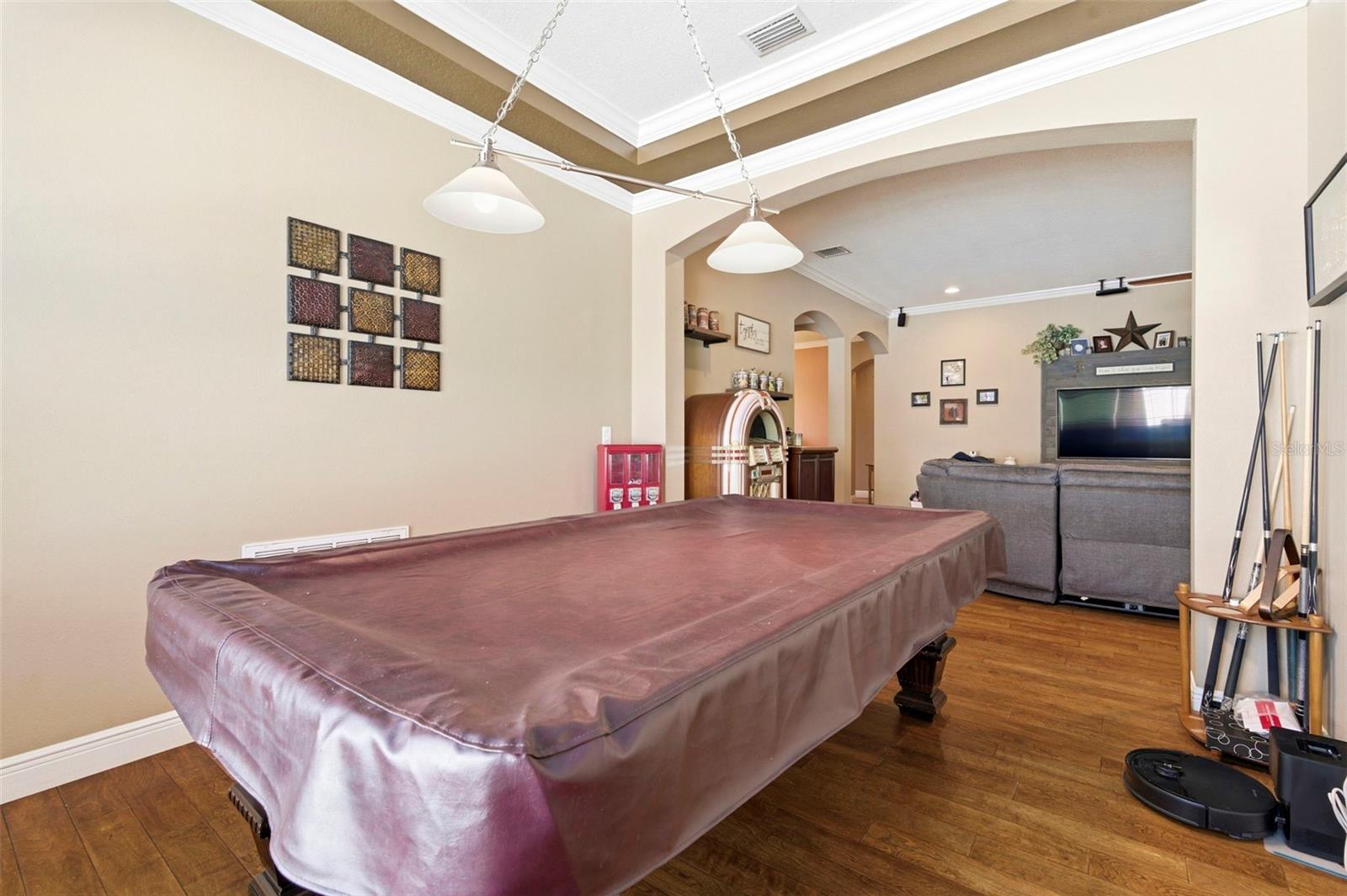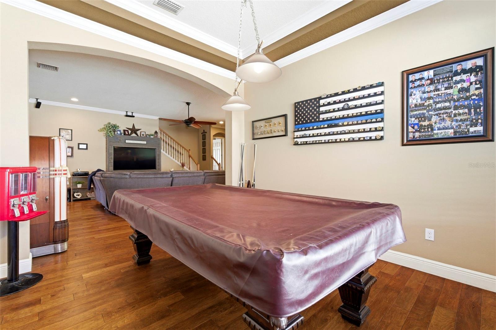 WELCOME TO YOUR EXECUTIVE, LAKEFRONT HOME at 8743 New Alexandria Loop, New Port Richey in the UPSCALE, GATED COMMUNITY of Waters Edge. This RARE Carmel model built by Ryland in 2010 features 5 bedrooms + den + loft, 3 bathrooms & 3 car garage with nearly 3,400 sqft & 4,451 total sqft. STUNNING exterior features are Mediterranean tile roof, stacked stone with stucco, FRESH exterior paint, expansive driveway, accent lighting, courtyard porch & a MAGNIFICIENT magnolia tree as the focal point in the front yard. The meticulous homeowners built this GORGEOUS home & added optional features like EXTRA INSULATION in the walls & roof systems as well as foam insulation blown into the blocks for energy efficiency. The BEST PART of the exterior is your DREAM, LAKEFRONT OASIS, featuring a CUSTOM, IN-GROUND SWIMMING POOL WITH SUN SHELF as well as an OUTDOOR KITCHEN enclosed within a screened & pavered lanai. There is also an open patio with a pergola & firepit for you to enjoy on cool evenings as you watch the sunset paint the sky VIBRANT colors over the LAKE. Stepping inside, you'll LOVE the cathedral ceilings, tile laid diagonally, arched entryways & SUNSHINE streaming through the multiple windows ILLUMINATING the interior together with the upgraded light fixtures. The first level consists of the foyer, kitchen, dinette, dining & living rooms, den (currently set up as the billiards/game room), primary bedroom with en suite, guest bedroom with bathroom & laundry room with utility sink. The GOURMET kitchen features granite counters, premium wood cabinets with hardware & upper trim, subway tile backsplash, walk-in pantry closet, breakfast bar/island, recessed & pendant lights & stainless steel appliances. The grand family room has a custom media wall for the TV & electric fireplace. Retreat to the owner's suite featuring plush carpet, ceiling fan & en-suite. The private bathroom has split sink vanities, soaking garden tub, separate shower, private toilet room & walk-in closet with custom built-ins. A second bedroom & bathroom with tub/shower combo located near the front door on the 1st floor is a perfect spot for guests. Upstairs, you'll find the spacious loft, full bathroom & bedrooms 3, 4 & 5. The 5th bedroom/bonus room is currently set up as the THEATER CENTER. This OVERSIZED media room consists of raised seating for watching movies, closet, ceiling fan & double French doors. The remaining bedrooms are all generous in size & share the 3rd bathroom with tub/shower combination. More details to love in this BEAUTIFUL HOME are: Both newer Trane AC units (2025 & 11/2024), water softener, fenced yard, crown molding, tray ceilings, warm paint colors, ceiling fans, security system, window blinds, curtain rods & high baseboards. The low HOA fee includes cable, internet, reclaimed water for irrigation, trash 2X week with recycling, security & community amenities. LAKEFRONT owners at Waters Edge enjoy lake privileges including motorized boating & using the boat launch/dock. Take a dip in the community pool, use the gym or meet your fellow neighbors at the next social event within Waters Edge. Amenities are 9000sqft clubhouse, grand swimming pool, kiddie pool, basketball/pickleball court, playground, dual fishing piers & boat dock leading to the SPECTACULAR 70-acre lake at its center. Location is IDEAL near schools, beaches, medical plazas, shopping centers, restaurants, places of worship, airport & tourist attractions. MAKE THIS YOUR FUTURE HOME!