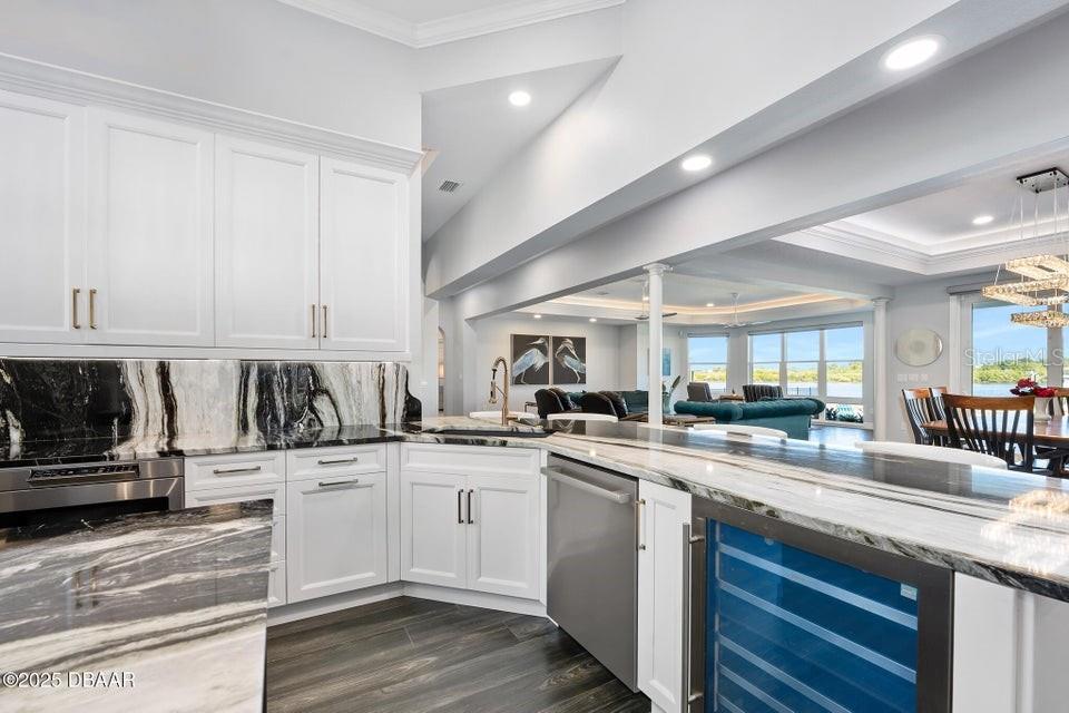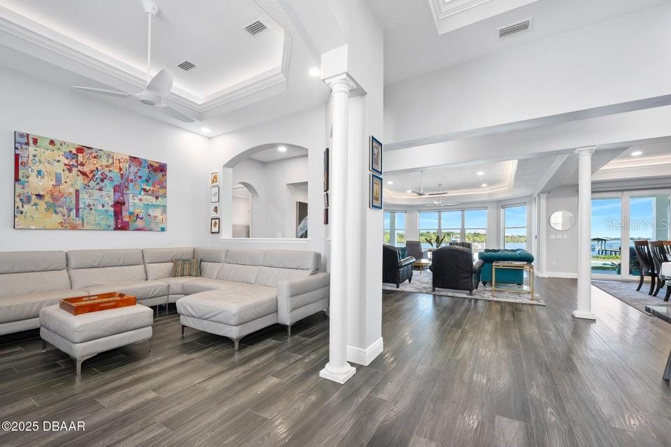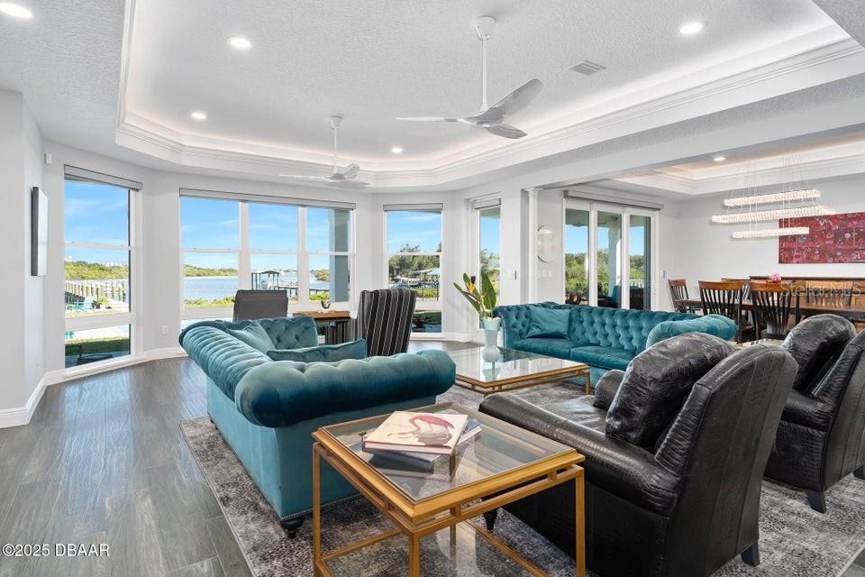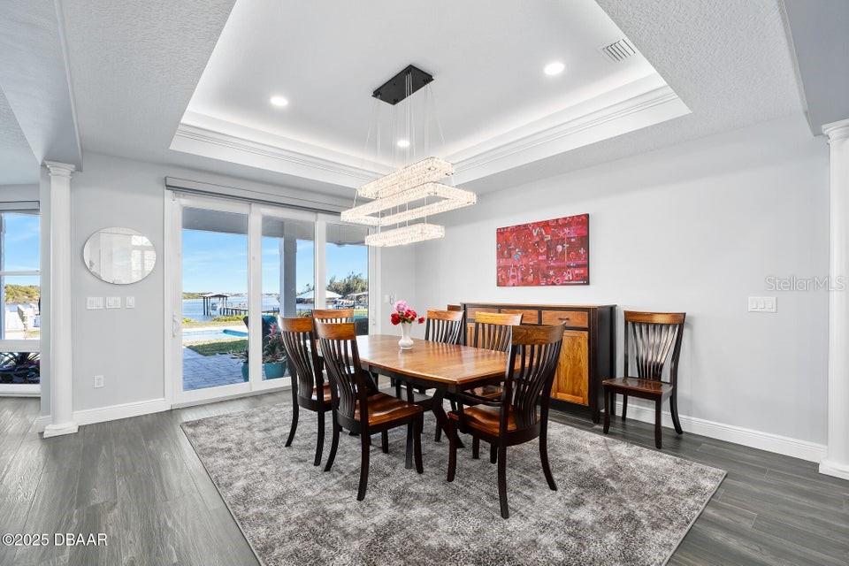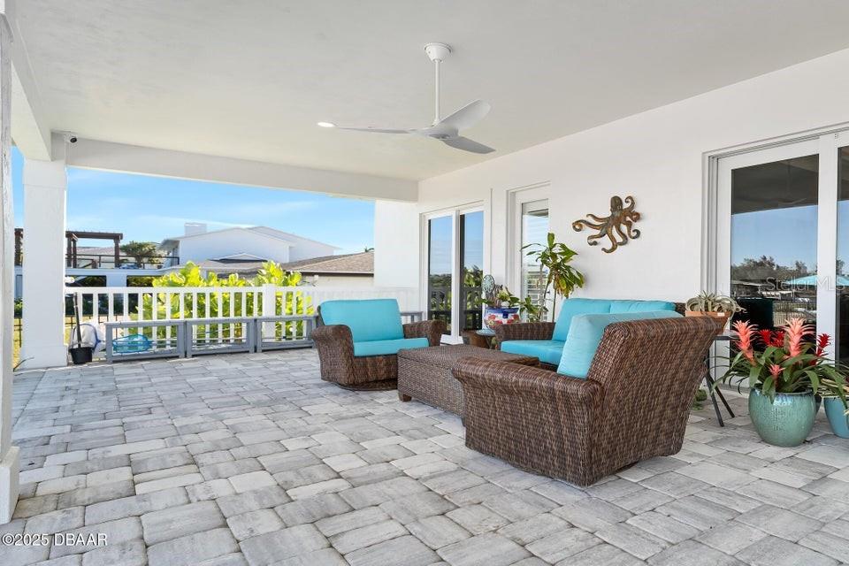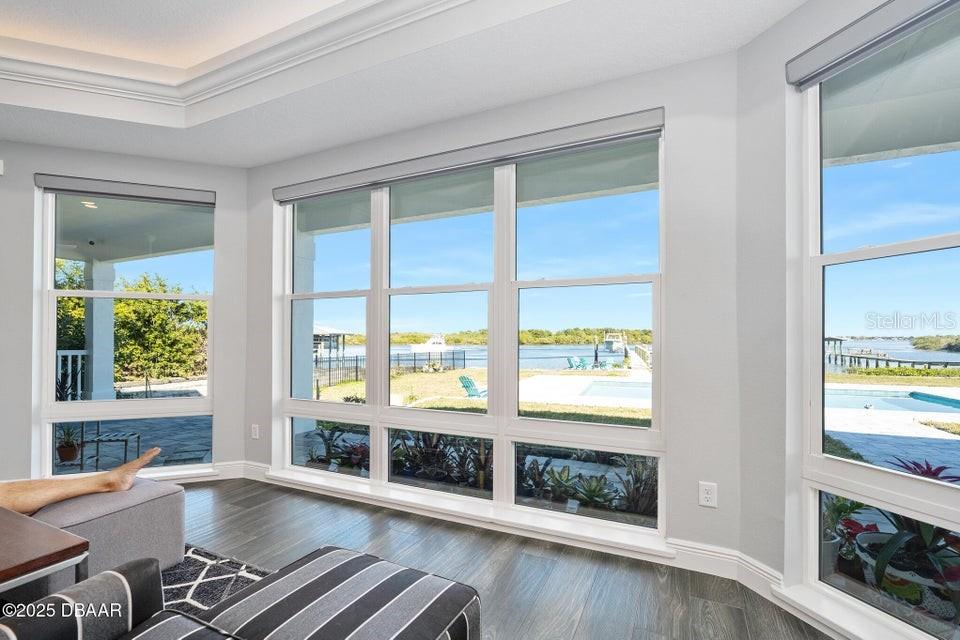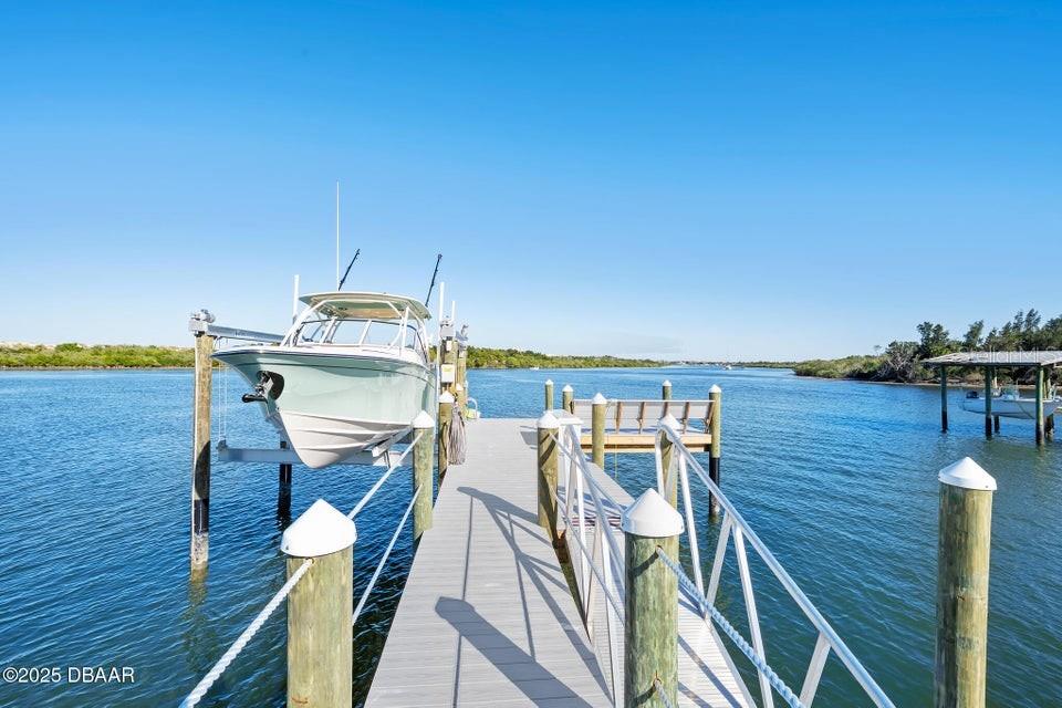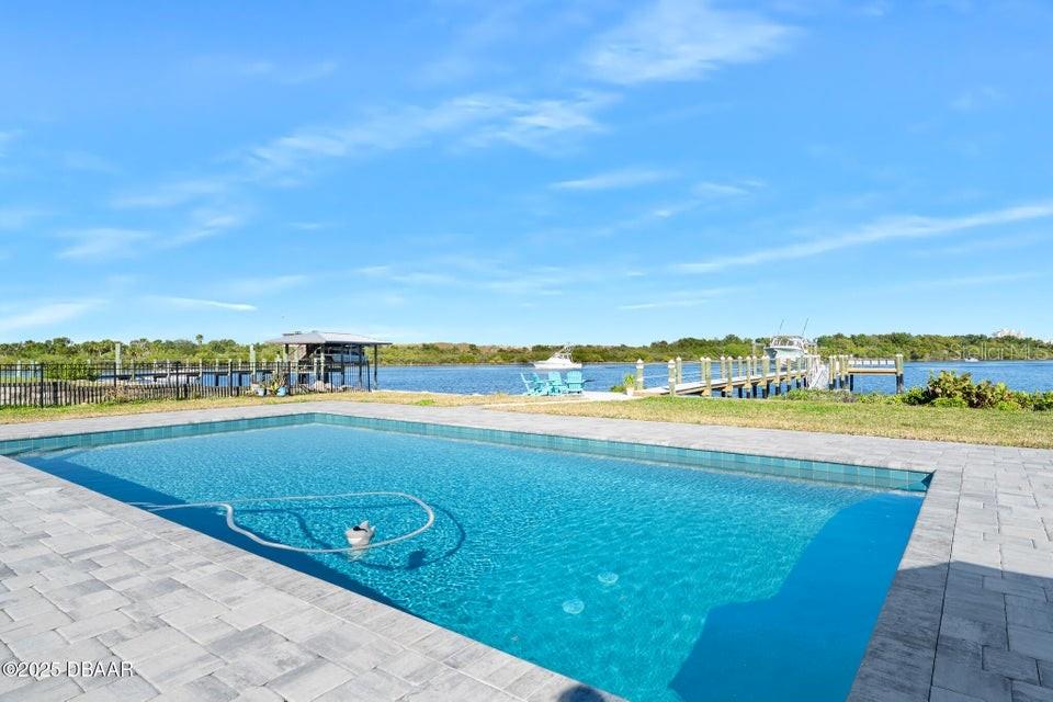 New Smyrna Beach deepwater at it's very best. Arguably the most sought after parcel in the beloved Inlet Shores community, this point lot gives way to long range water views down the Intracoastal and provides a front row seat to the wildlife and boat traffic that parade by daily. The custom 4 bedroom, 3 bath home with 3 car garage is perched on a gentle bluff with a fabulous waterfront lanai that serves as the owners' outdoor living room just above the pool, sprawling green lawn and new dock. Over the last year the owners have made a significant investment while the home underwent a complete interior and exterior renovation. The photos are lovely, but this property must be seen in person to be appreciated as no stone was unturned while contractors embarked on the tremendous task under the direction of a talented designer. Enter the home to be immediately greeted with panoramic water views through oversized windows and doors that create a wall of glass under volume ceilings. The main living and dining areas are all situated around the spectacular custom kitchen with stunning quartzite appointed over custom cabinetry complimenting the coastal contemporary interior spaces with a layout that is ideal for day to day relaxation or entertaining a crowd. The waterfront owners' suite is a true retreat with direct access to the covered patio and private spa. A cavernous walk-in with custom closet systems is just adjacent to the fantastic built-in wardrobe which sits just inside of the new luxury bath. Bedroom two is currently used as a home office and exercise room with a convenient optional door just off of the primary bath. A poolside waterfront guest suite is tucked into a quiet corner of the home with glass doors that open onto the covered patio and pool beyond. An adjacent bath services the guest room and doubles as a pool bath with an exterior door. The generous fourth bedroom is opposite a beautiful common bath. The architect left plenty of room for the imagination with a staircase leading to an unfinished bonus room above the garage that is currently vast storage, but could easily be finished as a 5th bedroom, game room or den. Step outside for unparalleled views of the water where the Intracoastal Waterway and Hunter Creek intersect and two natural mangrove shorelines create a serene backdrop that will never be developed. Truly an ideal position for a boater, sailor or yachtsman just inside of Ponce Inlet with a direct shot to the Atlantic Ocean through Rock House Creek in an outboard or a slightly lengthier course via the marked channel. The newly constructed and highly engineered dock with 16000lb lift and floating staging dock below has over 10' of water at low tide. On a falling tide, the baitfish from the estuary of Hunters Creek mingle with the larger river directly in front of the dock and it is not uncommon to see the surface of the water explode in a feeding frenzy. Whether fishing the mangroves, relaxing on Disappearing Island or heading out the inlet on the way to The Bahama Islands, there is not a more perfect location in this part of Florida than 59 Cunningham Drive. This 2009 built solid concrete block home warrants a personal visit to be appreciated and to realize the high level of renovations that include the entire interior with top of the line appointments, new impact windows and doors, new air conditioning systems, roof, dock and newly renovated paver appointed, heated, saltwater 30,000 gallon pool.