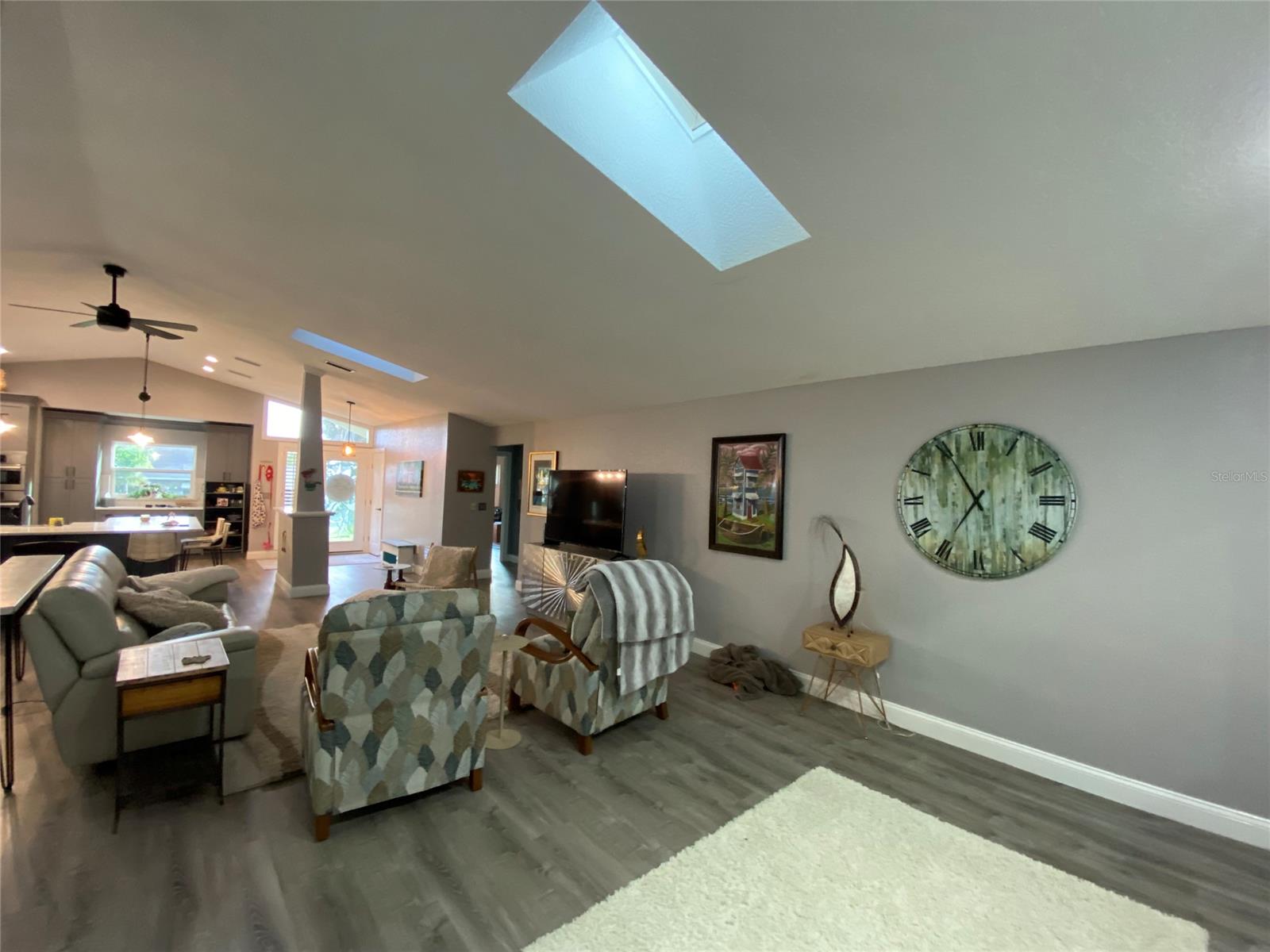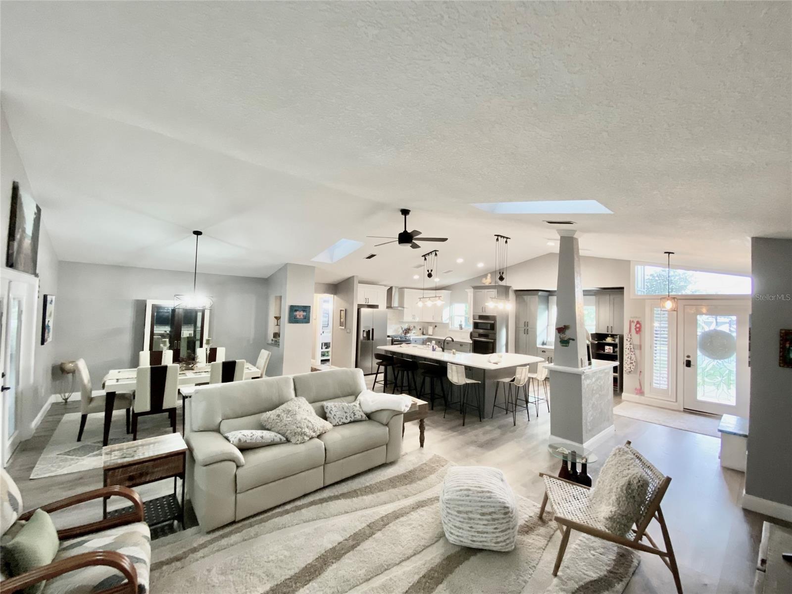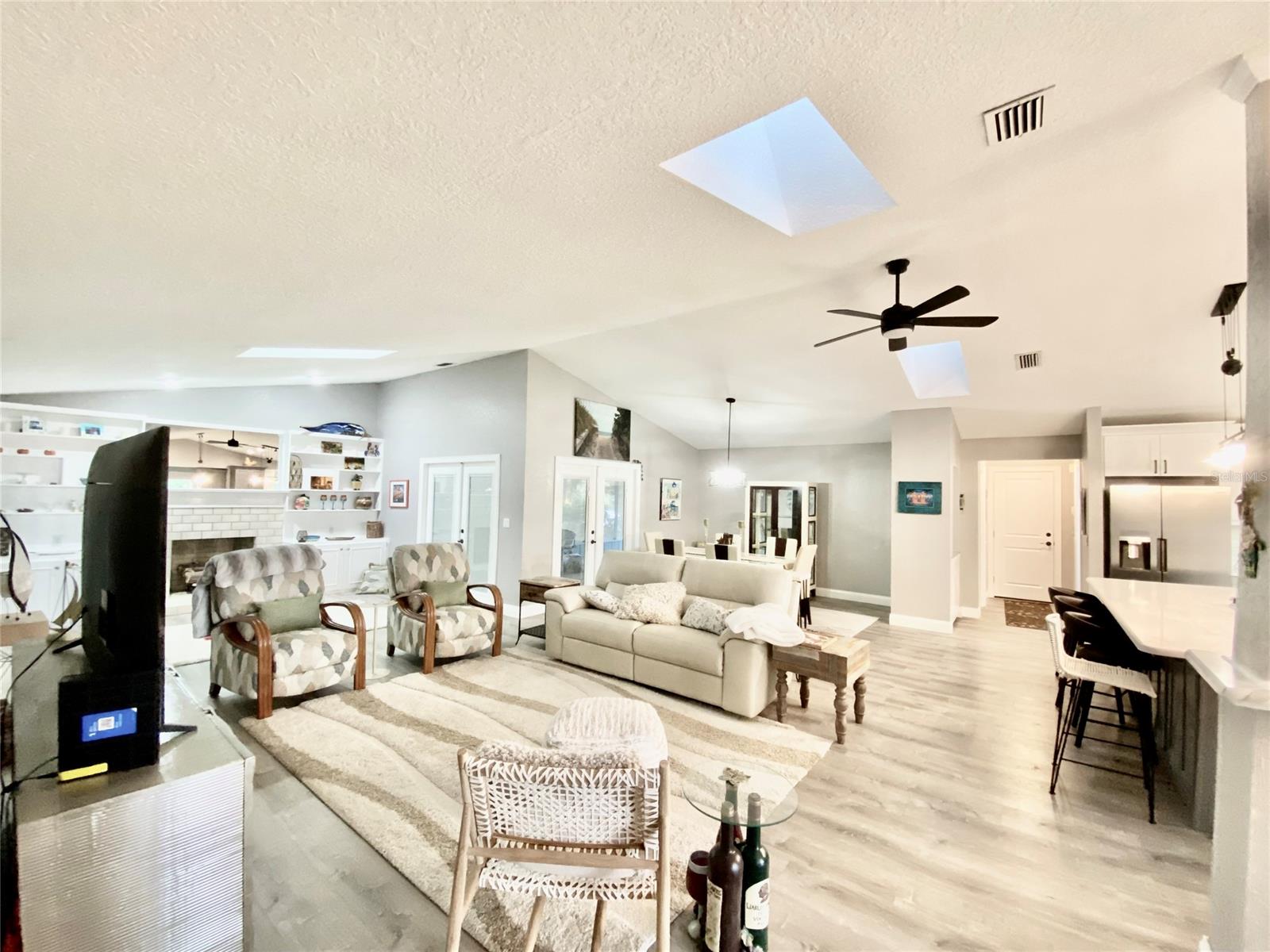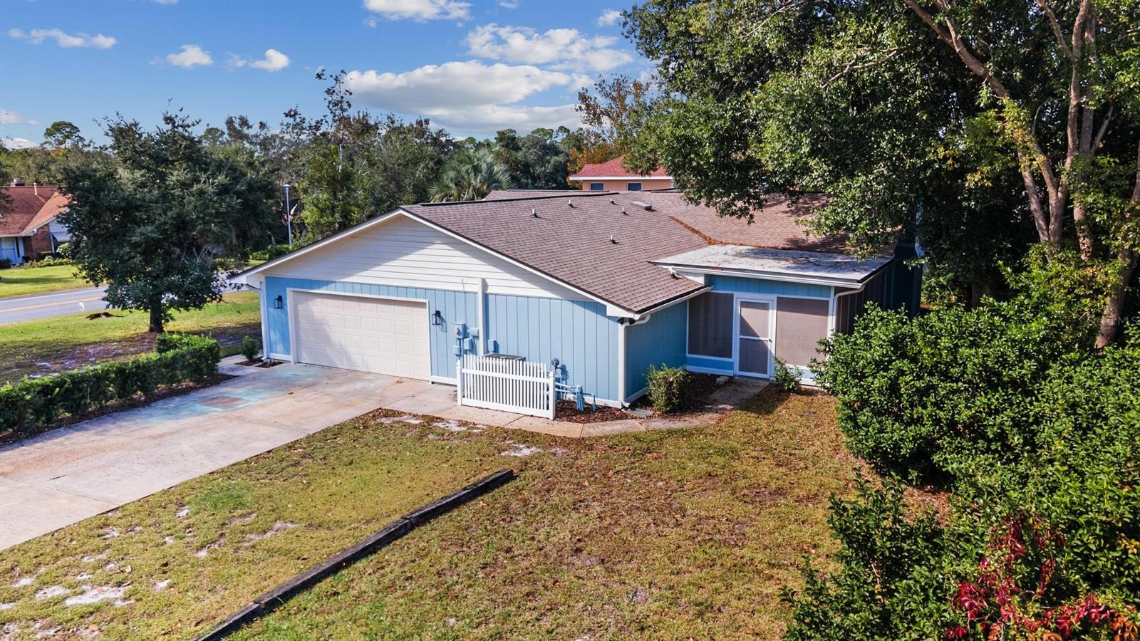 Welcome to 1031 Club House Boulevard, located in the desirable Sugar Mill Country Club neighborhood of New Smyrna Beach. This beautiful one-story home offers 2168 sqft of living space with 3 bedrooms and 2 full & 2 half baths on a 105x125 corner lot. Oversized 2 car garage with new opener and a NEW ROOF Oct 2023! Stepping inside you’ll be impressed by the gourmet kitchen complete with Quartz countertops, farm sink, stainless appliances and wood cabinetry with a huge island and bar offering convenience when entertaining guests or family gatherings alike! The high vaulted ceilings, ceiling fans, built in shelves and gas fireplace create a warm atmosphere throughout while luxury vinyl tile flooring adds modern style underfoot. Oil bronze fixtures and new panel doors provide luxurious detail throughout as well as two skylights adding natural light from above. Plus there's even more convenience found in the adjacent laundry room complete with half bathroom so no need to travel far when doing chores around the house! Windows and French doors have been updated for added protection all around. The exterior of this property boasts an irrigation system with well and new pump for easy lawn maintenance, plus plenty of room to add a pool if desired or mature foliage for privacy. The rear screened porch is perfect for enjoying peaceful outdoor living year round and French doors allow natural light to flow into the main living space within and a peak of the golf course view. Pool rendering provided by Bob Harold All Seasons pool (has not been approved by HOA but sole purpose to provide ideas if someone is interested in a pool). Gas Water Heater 2022, AC 2009, Roof Oct 2023, termite contract through Ryan's Pest Control, Transferrable Home Warranty through 2-10 Home Buyer Warranty
