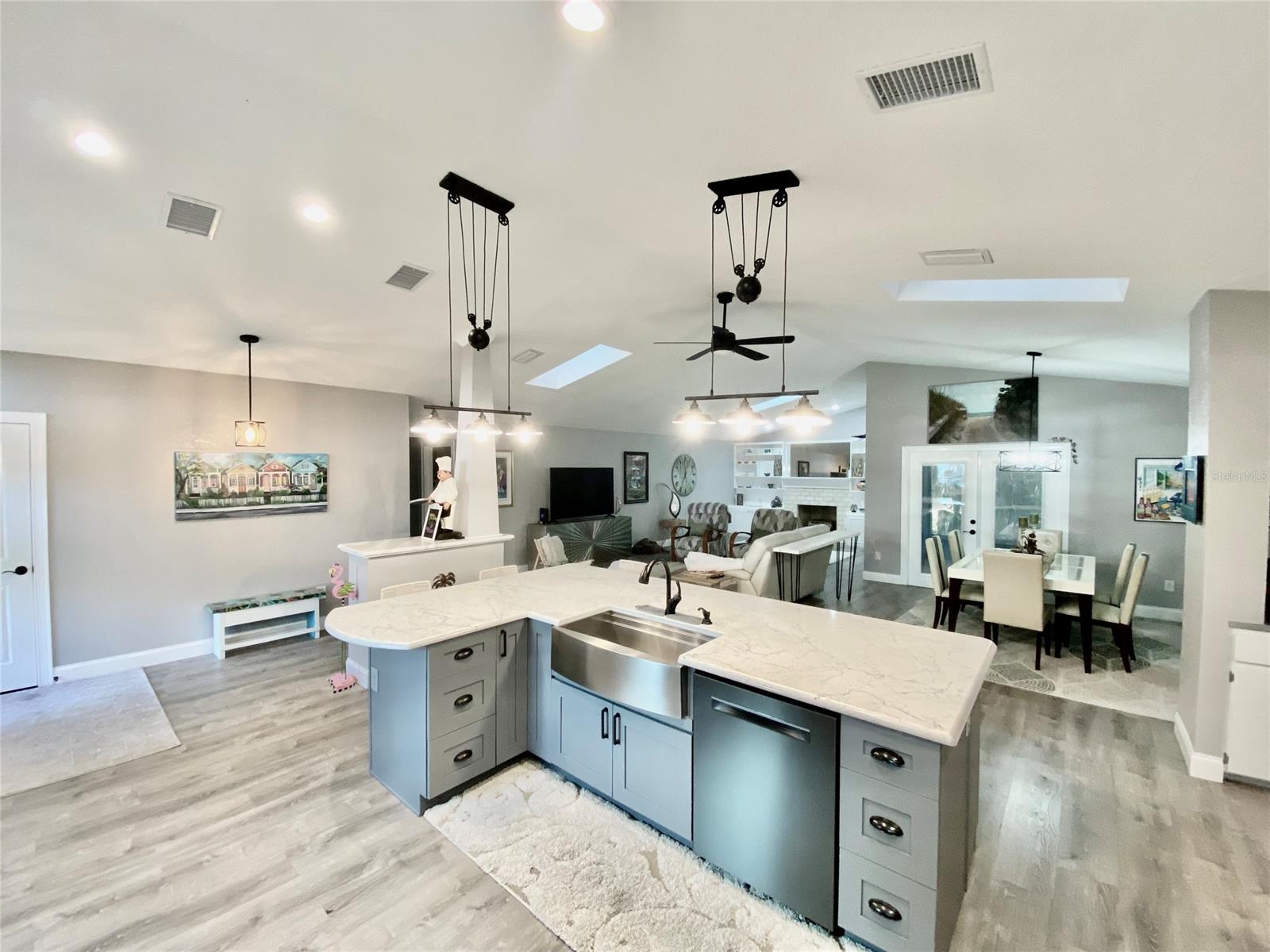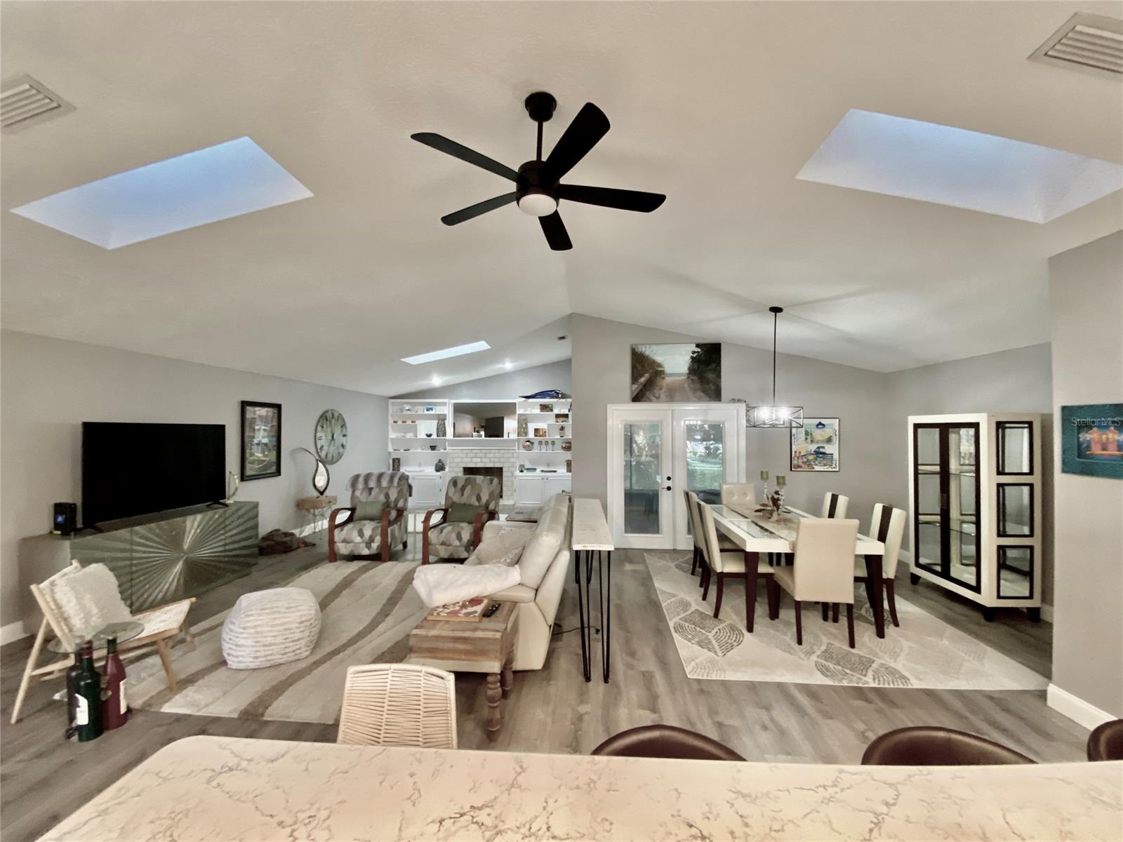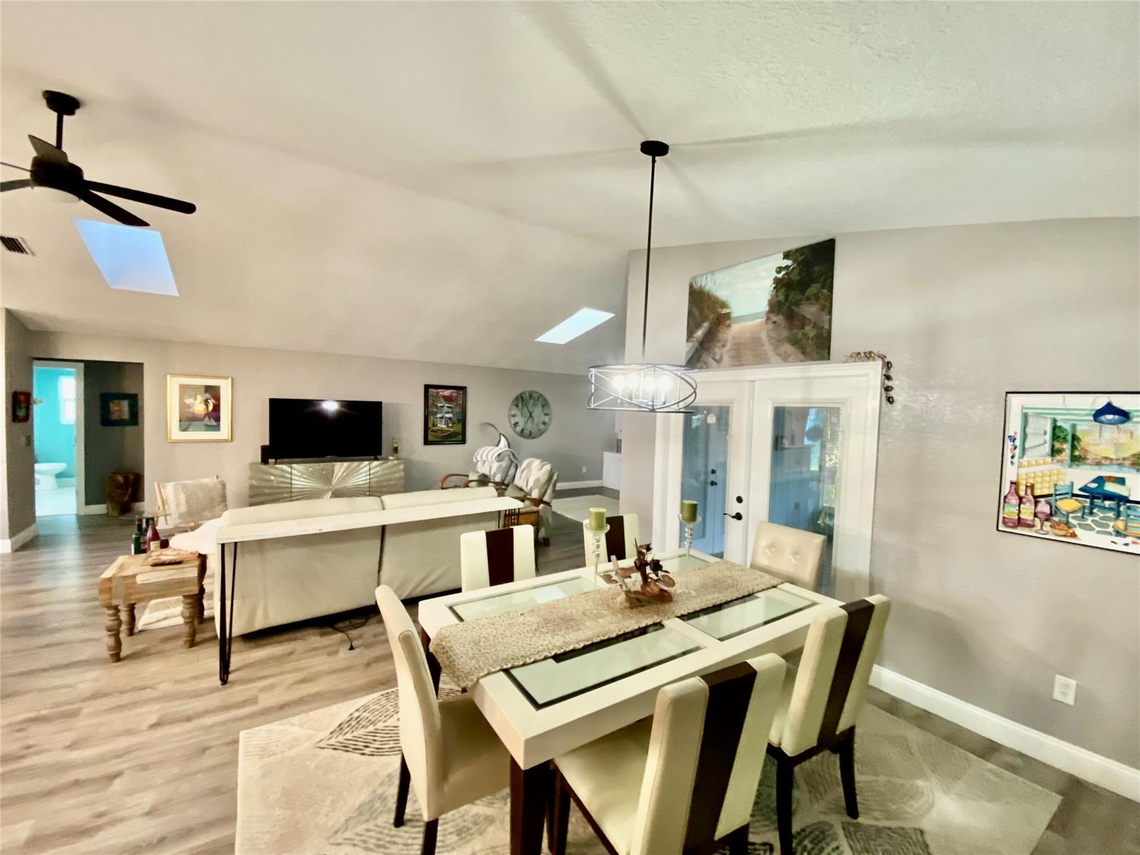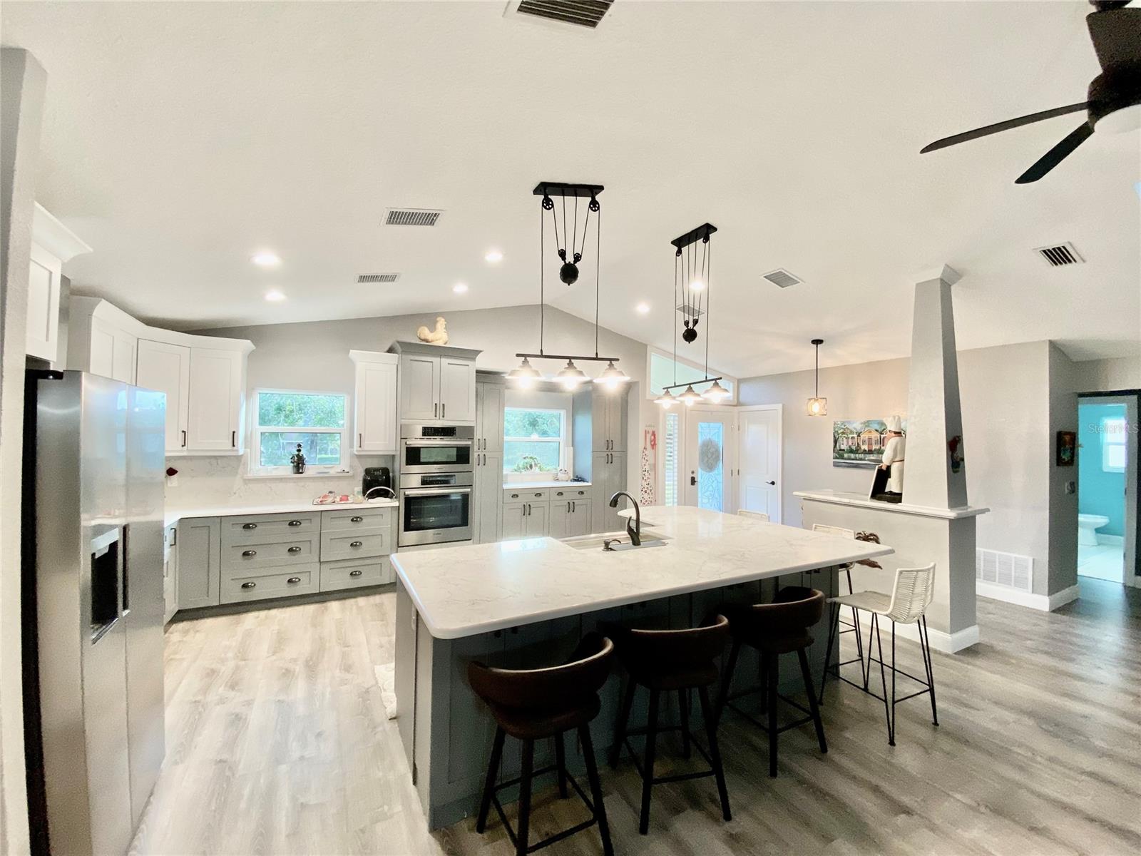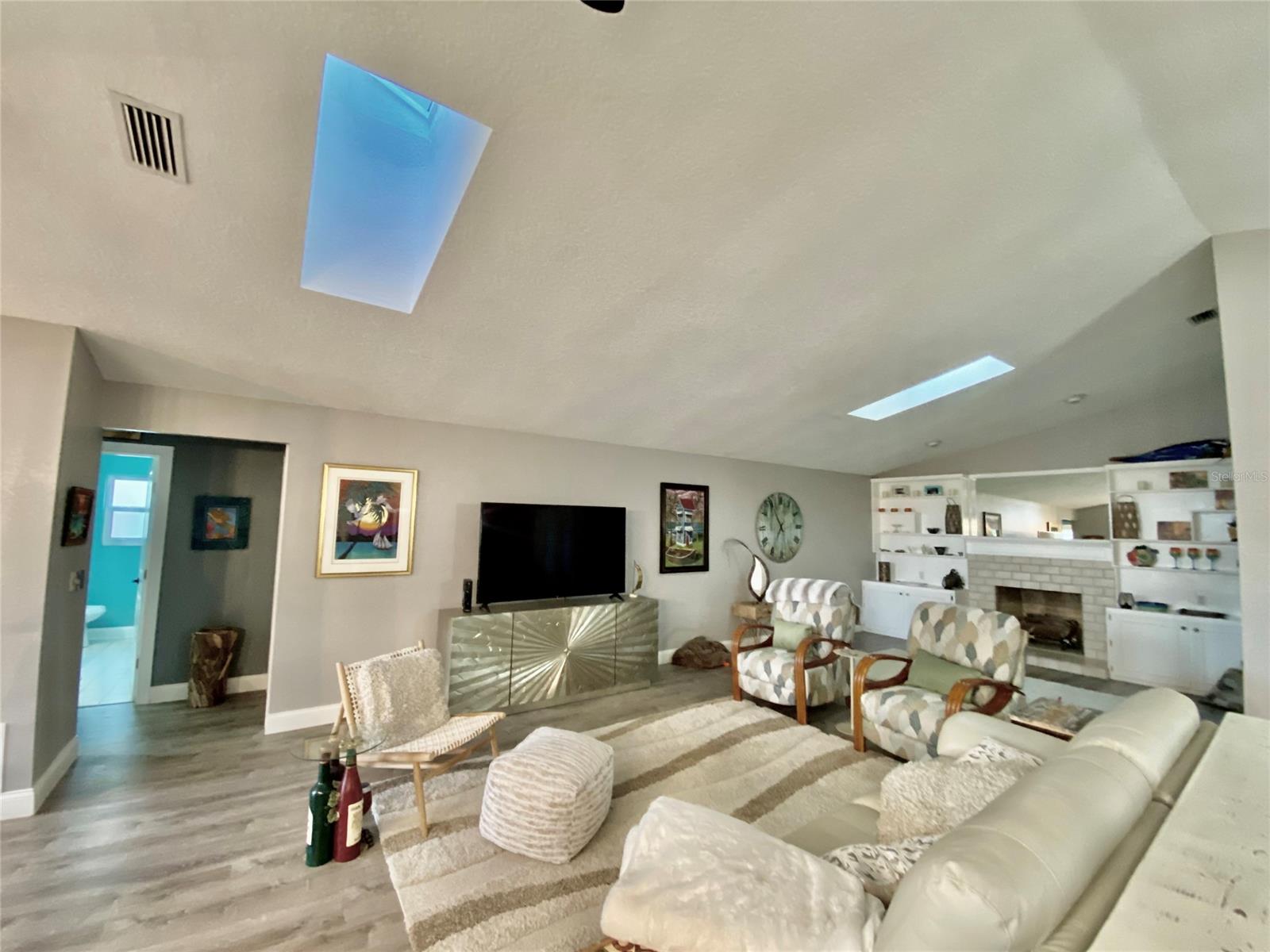 Welcome to 1031 Club House Boulevard, located in the desirable Sugar Mill Country Club neighborhood of New Smyrna Beach. This beautiful one-story home offers 2168 sqft of living space with 3 bedrooms and 2 full & 2 half baths on a 105x125 corner lot. Oversized 2 car garage with new opener and a NEW ROOF Oct 2023! Stepping inside you’ll be impressed by the gourmet kitchen complete with Quartz countertops, farm sink, stainless appliances and wood cabinetry with a huge island and bar offering convenience when entertaining guests or family gatherings alike! The high vaulted ceilings, ceiling fans, built in shelves and gas fireplace create a warm atmosphere throughout while luxury vinyl tile flooring adds modern style underfoot. Oil bronze fixtures and new panel doors provide luxurious detail throughout as well as two skylights adding natural light from above. Plus there's even more convenience found in the adjacent laundry room complete with half bathroom so no need to travel far when doing chores around the house! Windows and French doors have been updated for added protection all around. The exterior of this property boasts an irrigation system with well and new pump for easy lawn maintenance, plus plenty of room to add a pool if desired or mature foliage for privacy. The rear screened porch is perfect for enjoying peaceful outdoor living year round and French doors allow natural light to flow into the main living space within and a peak of the golf course view. Pool rendering provided by Bob Harold All Seasons pool (has not been approved by HOA but sole purpose to provide ideas if someone is interested in a pool). Gas Water Heater 2022, AC 2009, Roof Oct 2023, termite contract through Ryan's Pest Control, Transferrable Home Warranty through 2-10 Home Buyer Warranty