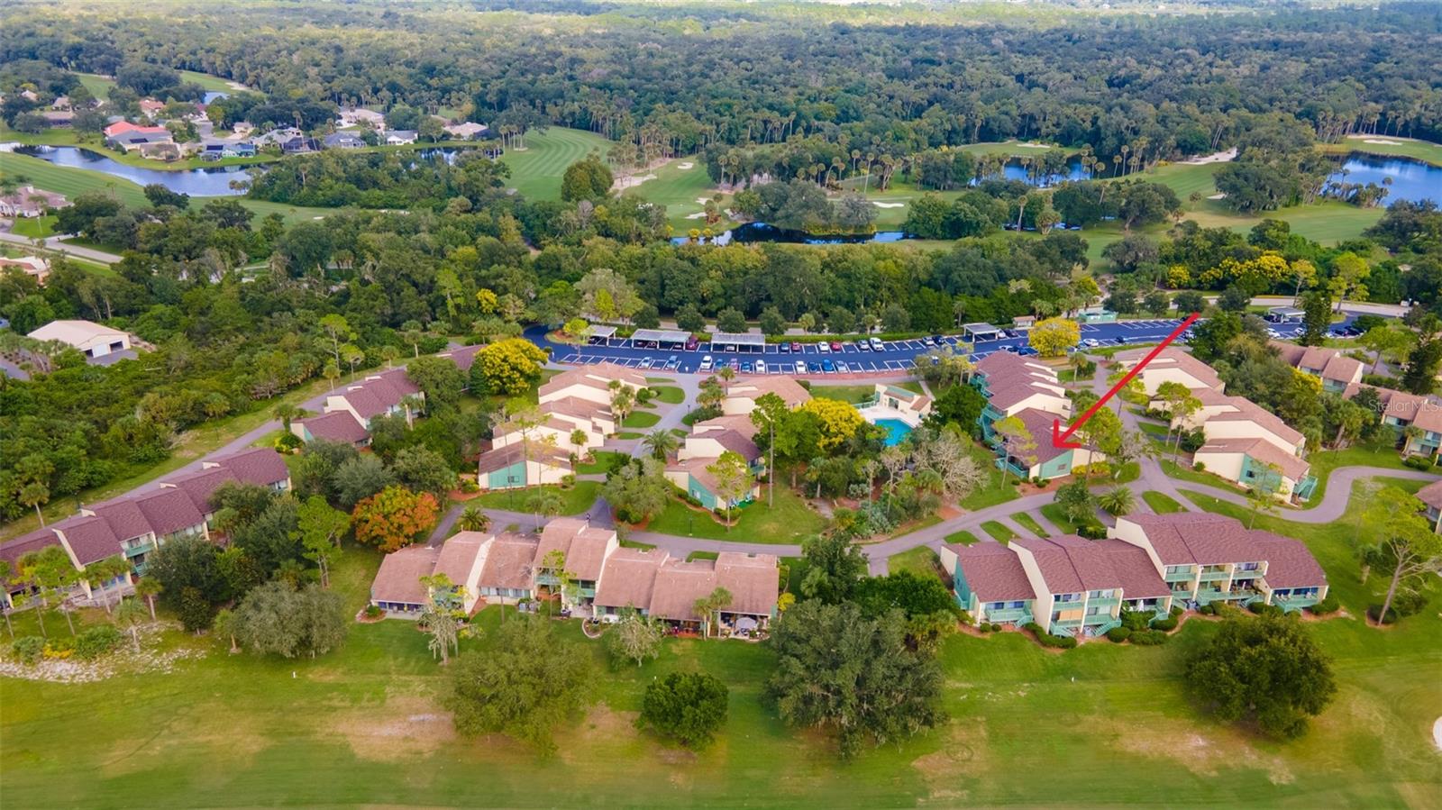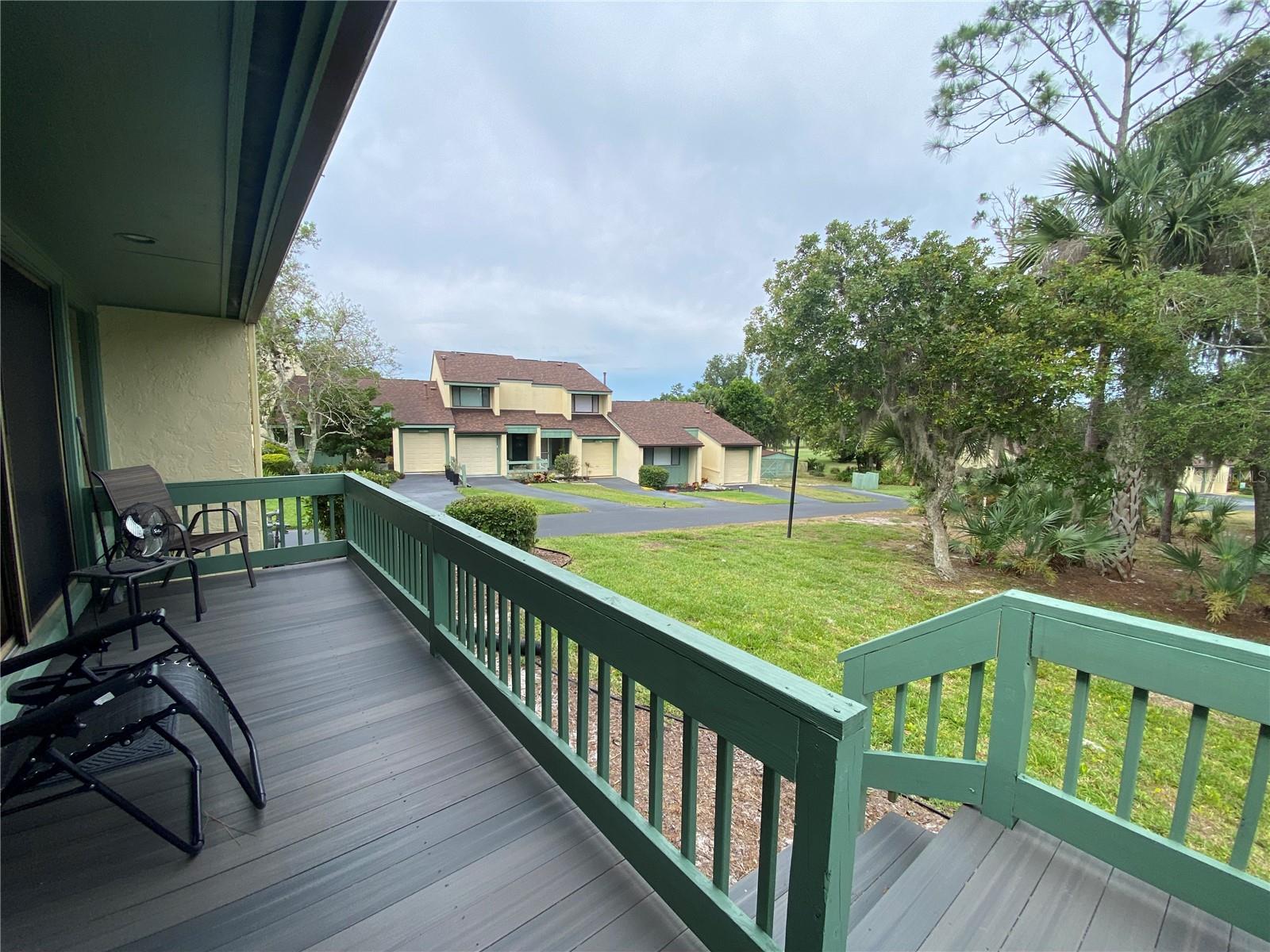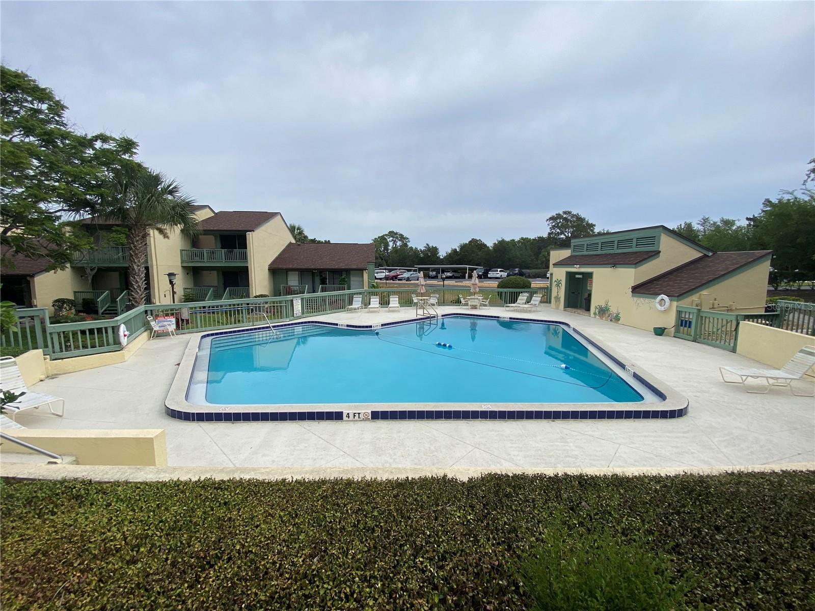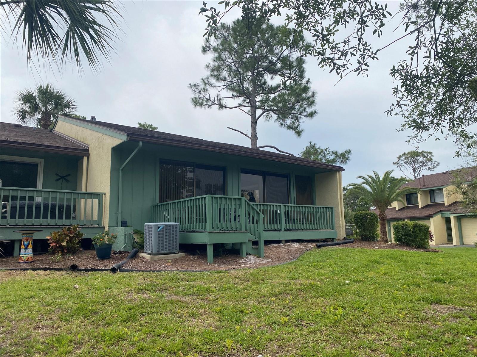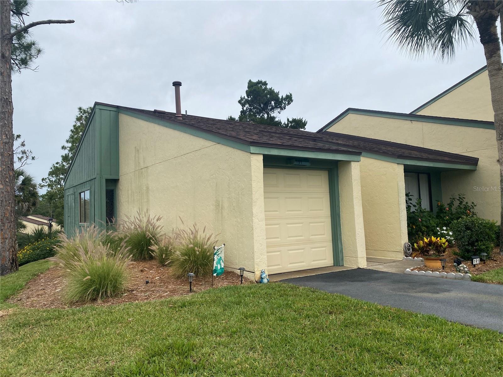 Perfect direct pool front unit at Pine Valley in Sugar Mill CC. 1 story end unit with vaulted ceiling and plenty of extra light coming from the side window detailed with window seat. Kitchen features white cabinetry and appliances, detailed tile counters with breakfast bar and trendy fixtures and lighting. Spacious living area has room for dining area if preferred. Engineered hardwood flooring in living and bedroom. 2 sliding glass doors exit to the newer composite deck to enjoy the direct view of the pool and partial view of the golf course. Part of living area set as a den with built in closet but could be converted to an add'l bedroom. Bathroom is unique with 2 separate powder rooms and share the tub/shower area. Inside laundry room with add'l storage. Golf cart garage has the HVAC (w/ gas heat) 2018 and gas water heater. Easy walk to the community pool of Pine Valley. Sugar Mill CC is a private country club and golf course, amenities include dining, fitness, pool, clubhouse, tennis, pickleball and golf - membership options available. Please inquire within. Sugar Mill is a gated community offering 24 hour guard service.