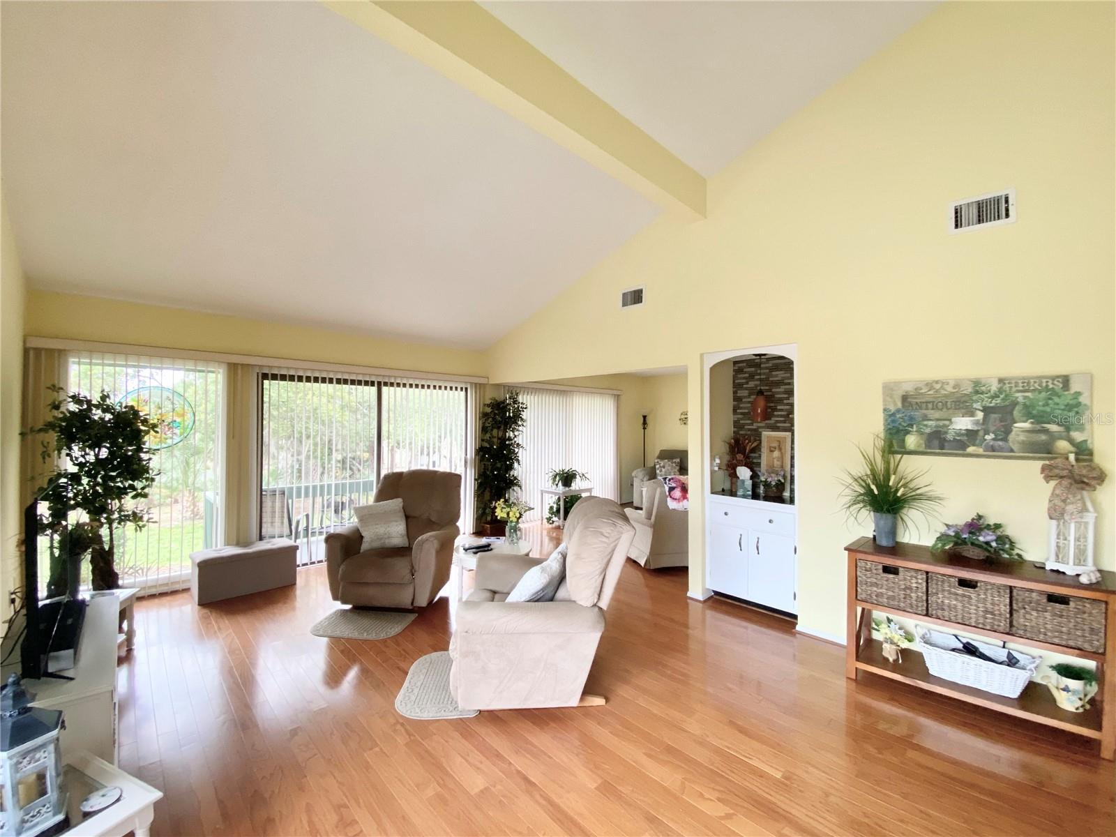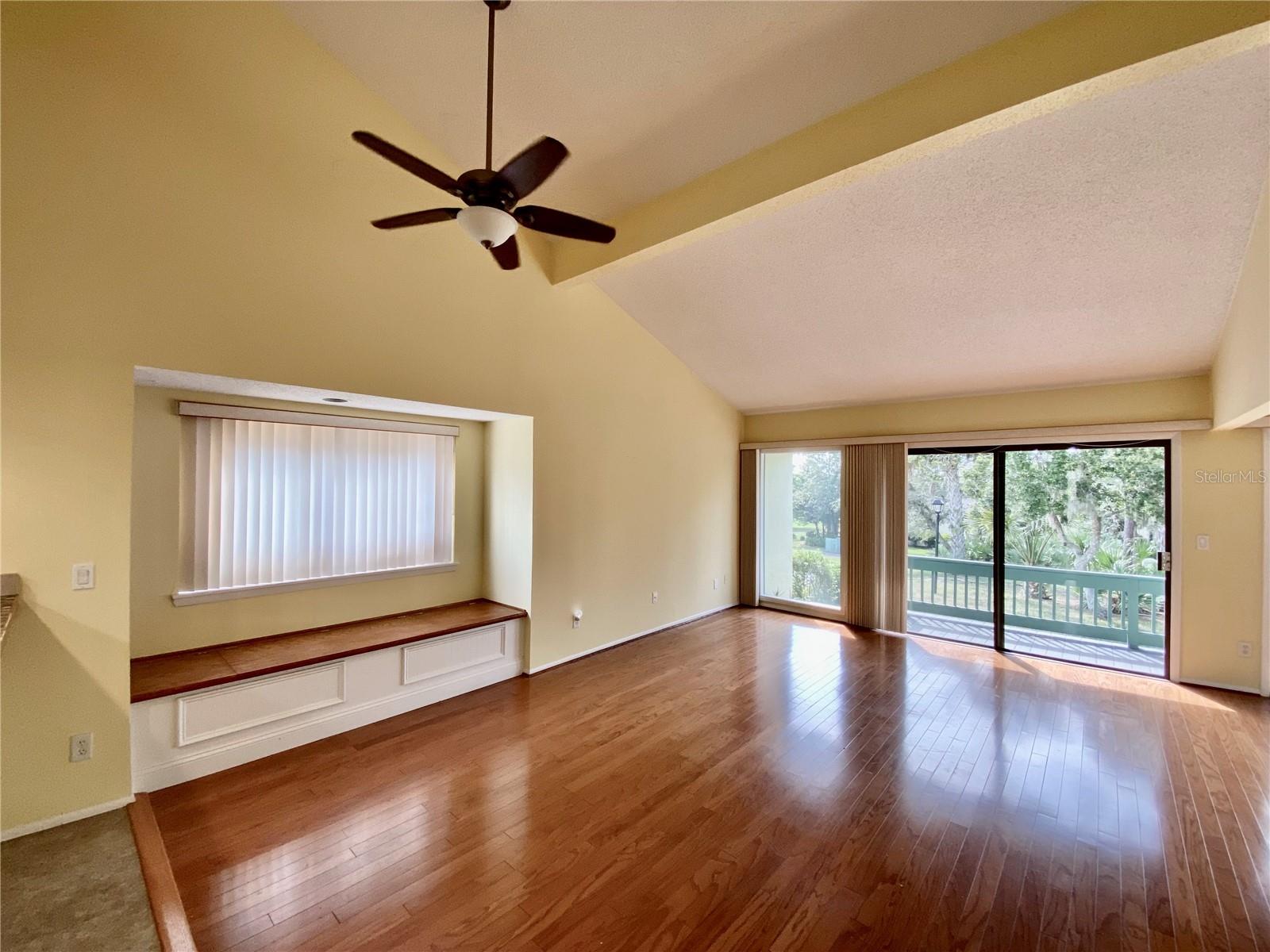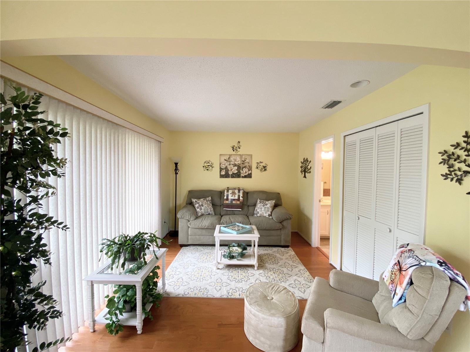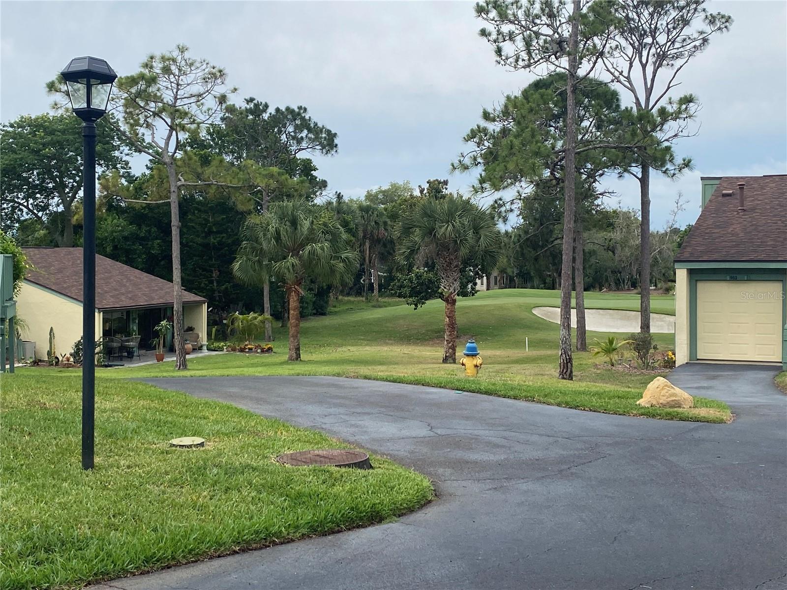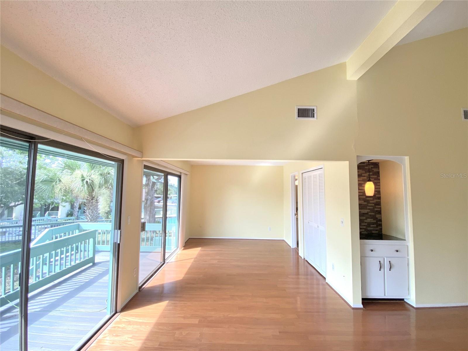 Perfect direct pool front unit at Pine Valley in Sugar Mill CC. 1 story end unit with vaulted ceiling and plenty of extra light coming from the side window detailed with window seat. Kitchen features white cabinetry and appliances, detailed tile counters with breakfast bar and trendy fixtures and lighting. Spacious living area has room for dining area if preferred. Engineered hardwood flooring in living and bedroom. 2 sliding glass doors exit to the newer composite deck to enjoy the direct view of the pool and partial view of the golf course. Part of living area set as a den with built in closet but could be converted to an add'l bedroom. Bathroom is unique with 2 separate powder rooms and share the tub/shower area. Inside laundry room with add'l storage. Golf cart garage has the HVAC (w/ gas heat) 2018 and gas water heater. Easy walk to the community pool of Pine Valley. Sugar Mill CC is a private country club and golf course, amenities include dining, fitness, pool, clubhouse, tennis, pickleball and golf - membership options available. Please inquire within. Sugar Mill is a gated community offering 24 hour guard service.