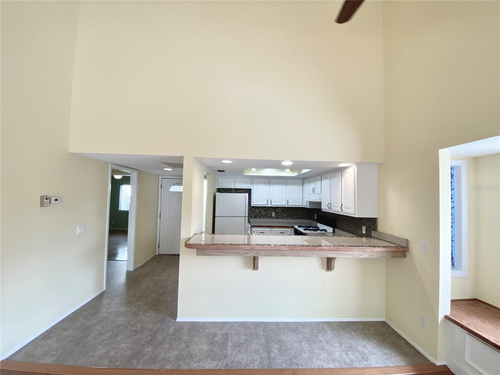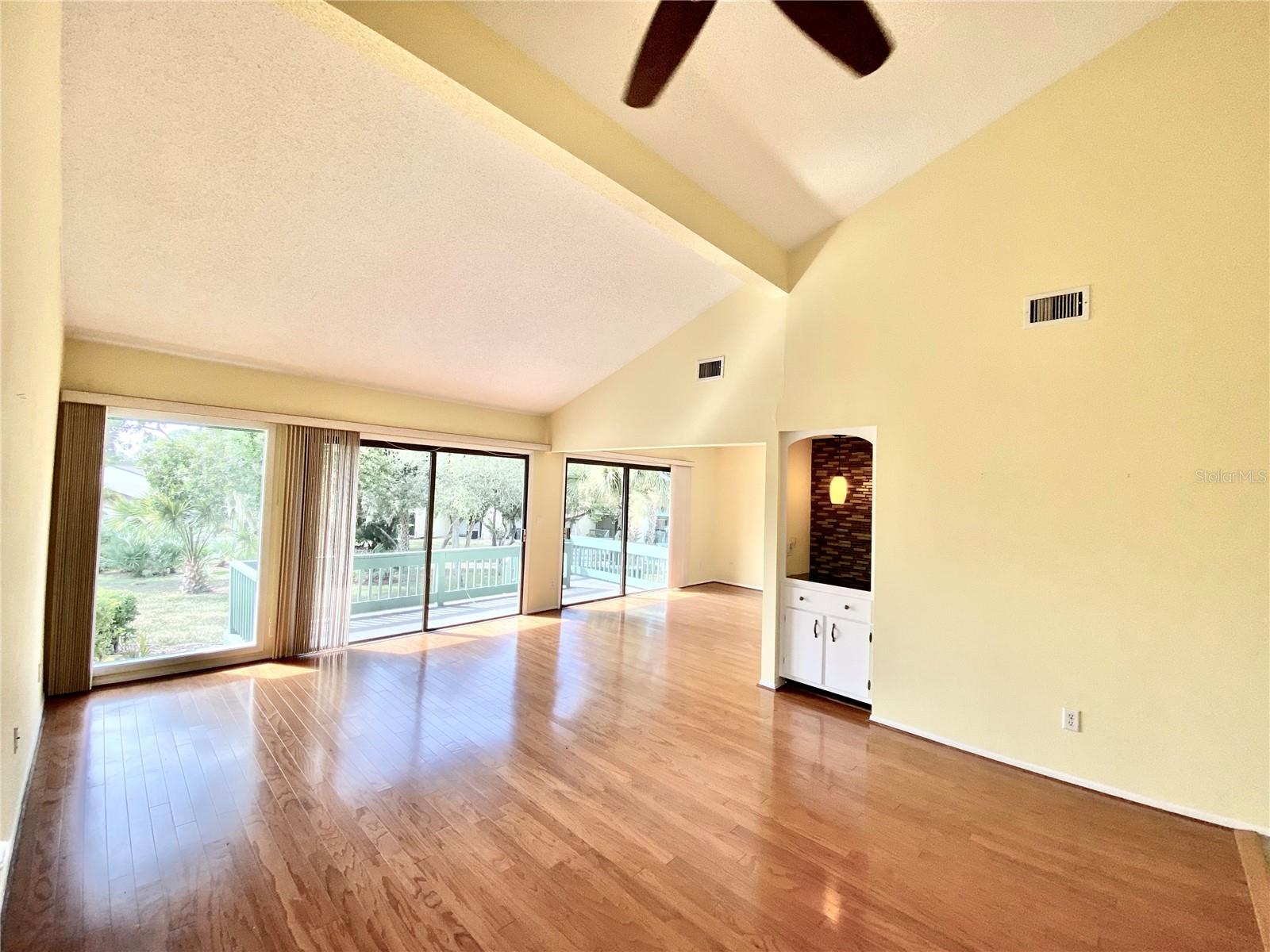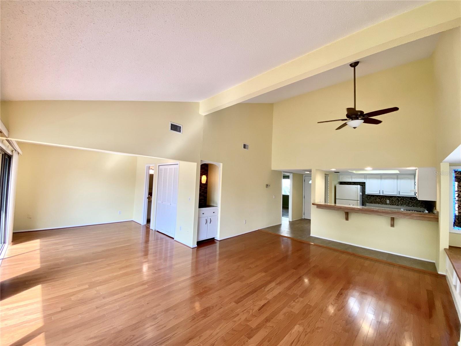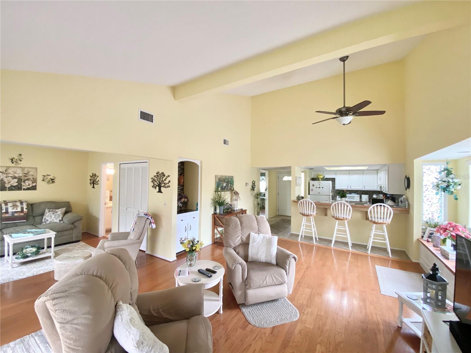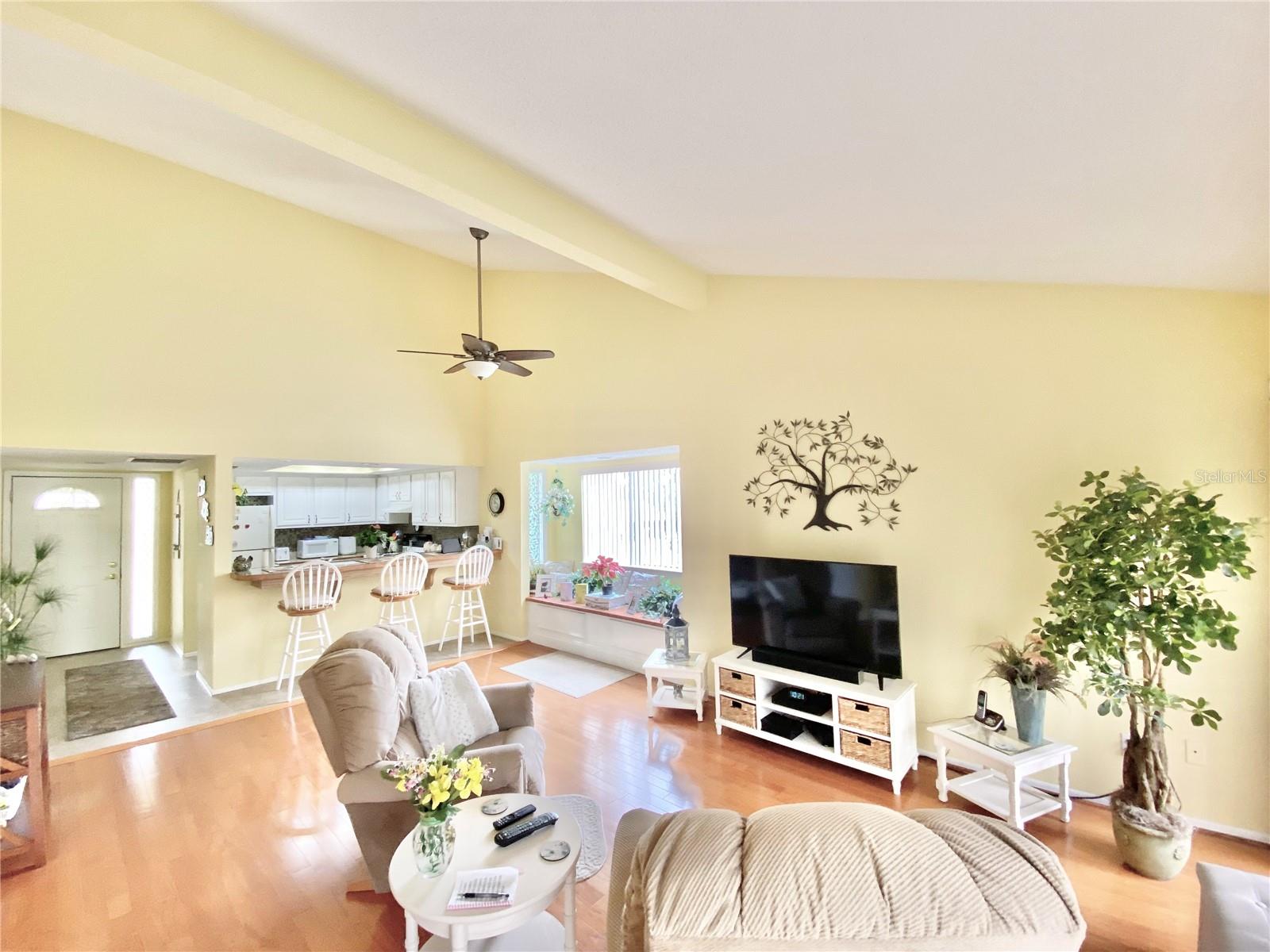 Perfect direct pool front unit at Pine Valley in Sugar Mill CC. 1 story end unit with vaulted ceiling and plenty of extra light coming from the side window detailed with window seat. Kitchen features white cabinetry and appliances, detailed tile counters with breakfast bar and trendy fixtures and lighting. Spacious living area has room for dining area if preferred. Engineered hardwood flooring in living and bedroom. 2 sliding glass doors exit to the newer composite deck to enjoy the direct view of the pool and partial view of the golf course. Part of living area set as a den with built in closet but could be converted to an add'l bedroom. Bathroom is unique with 2 separate powder rooms and share the tub/shower area. Inside laundry room with add'l storage. Golf cart garage has the HVAC (w/ gas heat) 2018 and gas water heater. Easy walk to the community pool of Pine Valley. Sugar Mill CC is a private country club and golf course, amenities include dining, fitness, pool, clubhouse, tennis, pickleball and golf - membership options available. Please inquire within. Sugar Mill is a gated community offering 24 hour guard service.