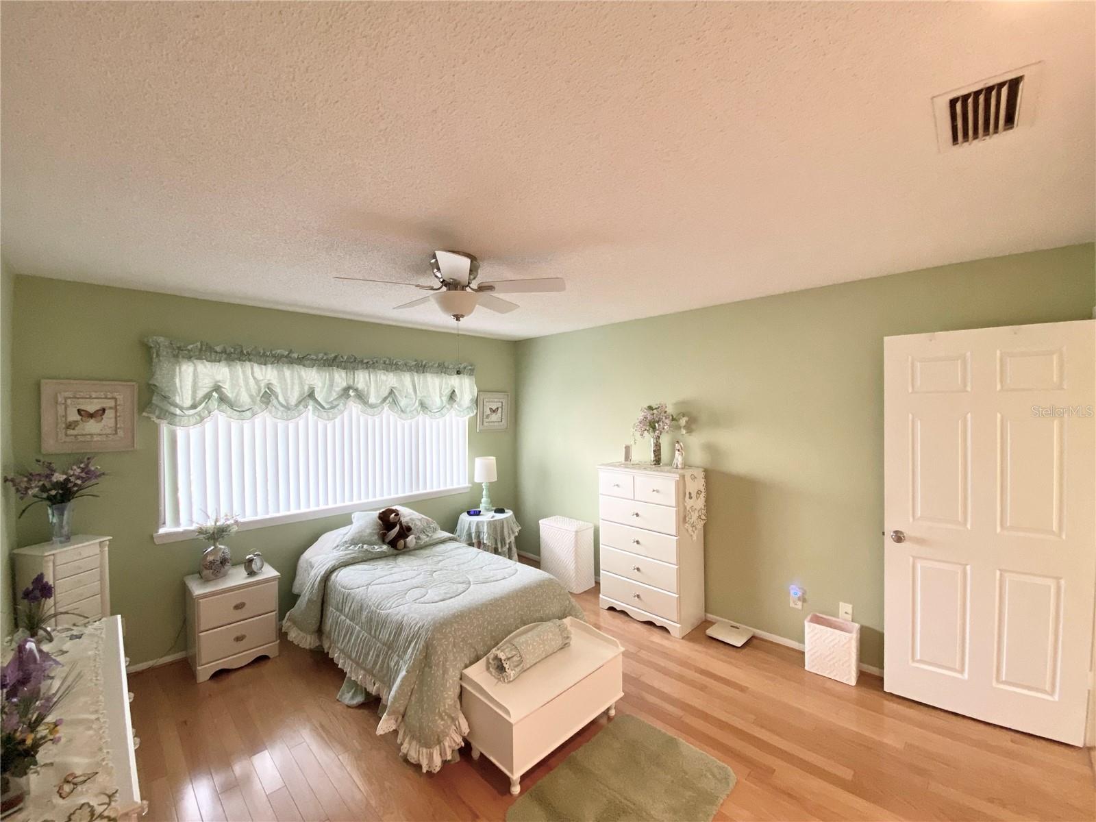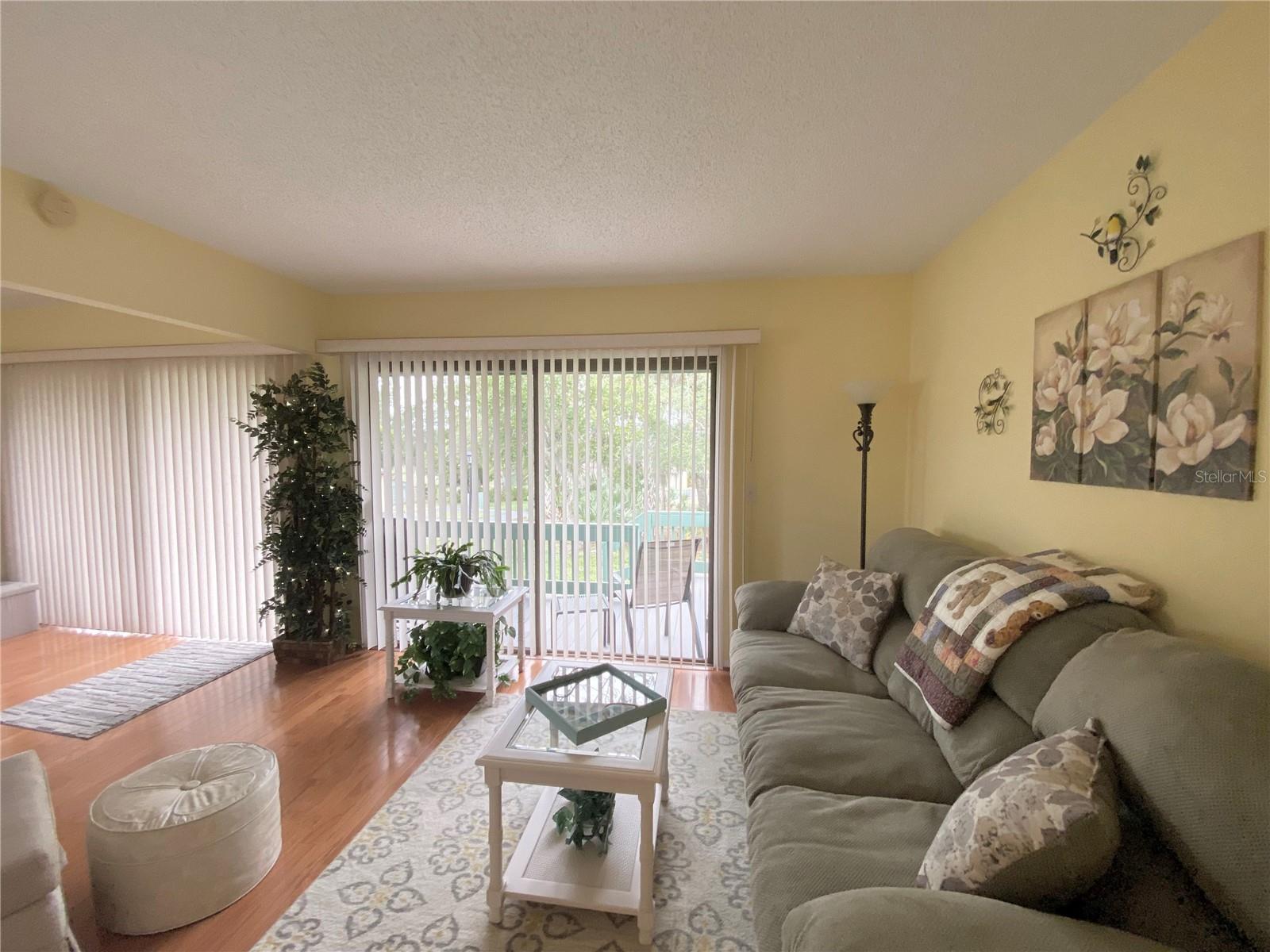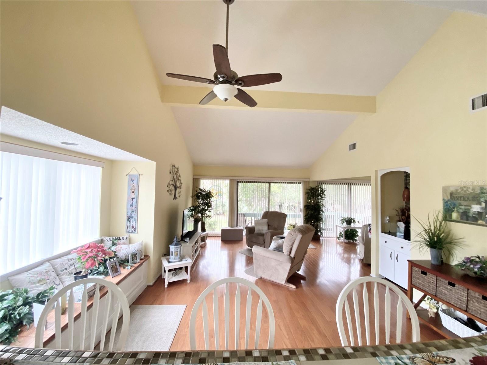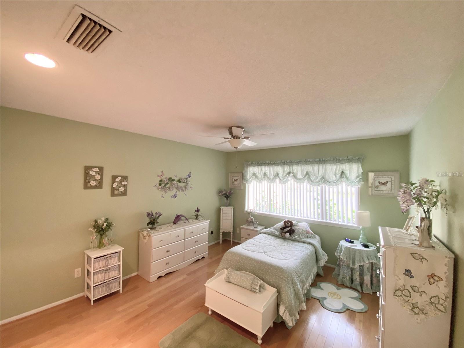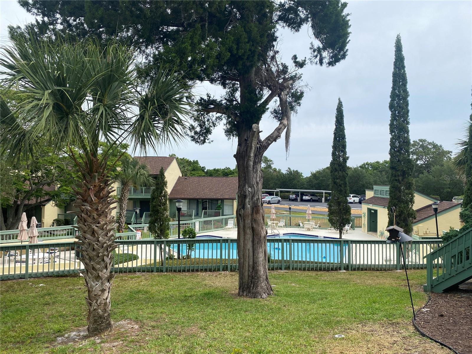 Perfect direct pool front unit at Pine Valley in Sugar Mill CC. 1 story end unit with vaulted ceiling and plenty of extra light coming from the side window detailed with window seat. Kitchen features white cabinetry and appliances, detailed tile counters with breakfast bar and trendy fixtures and lighting. Spacious living area has room for dining area if preferred. Engineered hardwood flooring in living and bedroom. 2 sliding glass doors exit to the newer composite deck to enjoy the direct view of the pool and partial view of the golf course. Part of living area set as a den with built in closet but could be converted to an add'l bedroom. Bathroom is unique with 2 separate powder rooms and share the tub/shower area. Inside laundry room with add'l storage. Golf cart garage has the HVAC (w/ gas heat) 2018 and gas water heater. Easy walk to the community pool of Pine Valley. Sugar Mill CC is a private country club and golf course, amenities include dining, fitness, pool, clubhouse, tennis, pickleball and golf - membership options available. Please inquire within. Sugar Mill is a gated community offering 24 hour guard service.