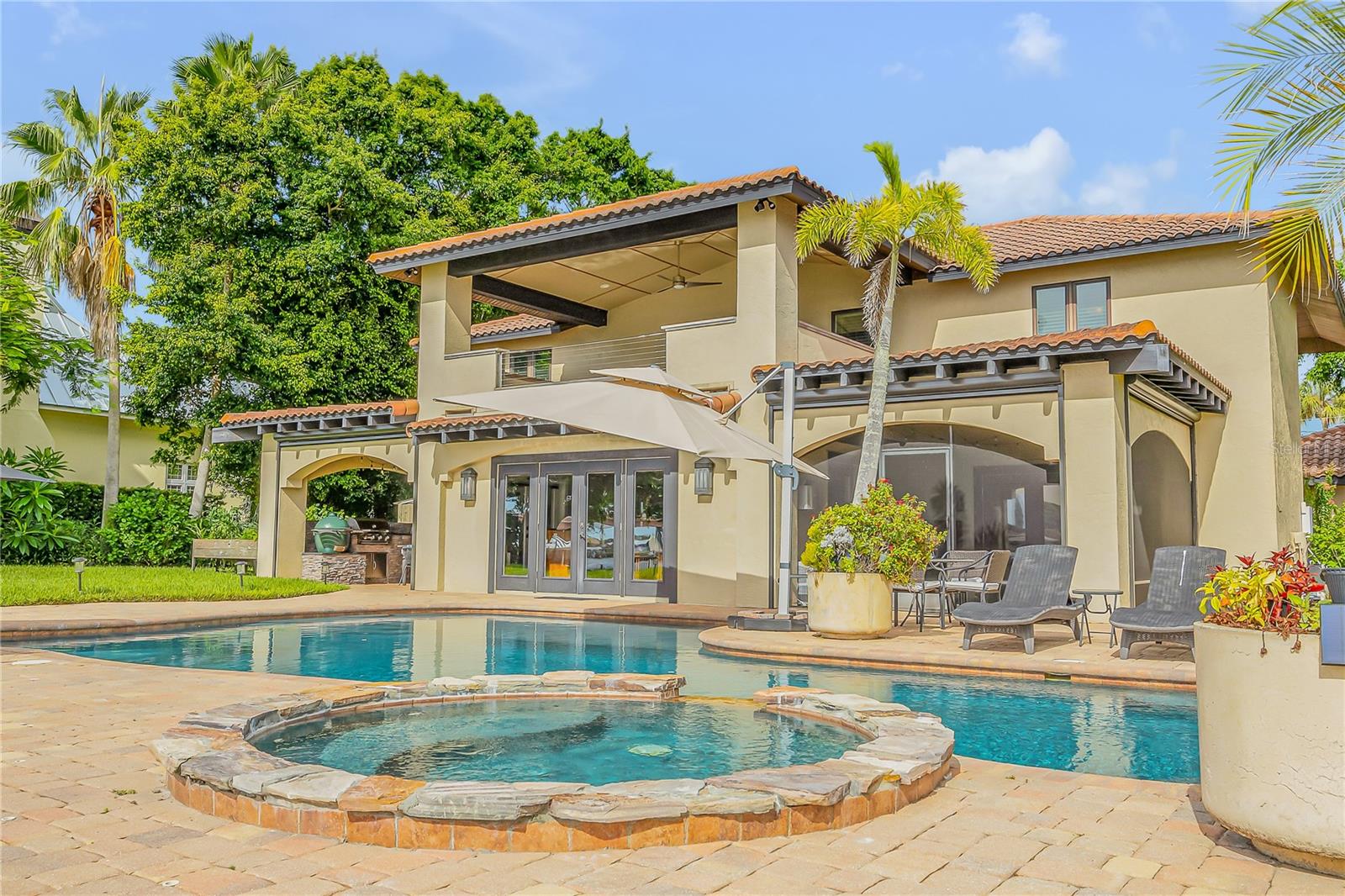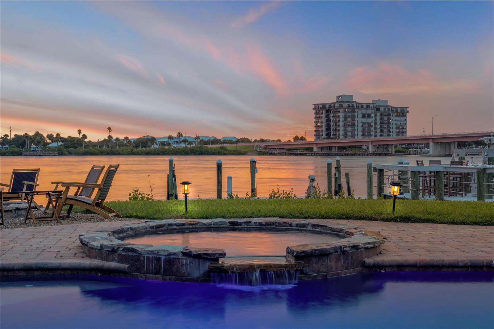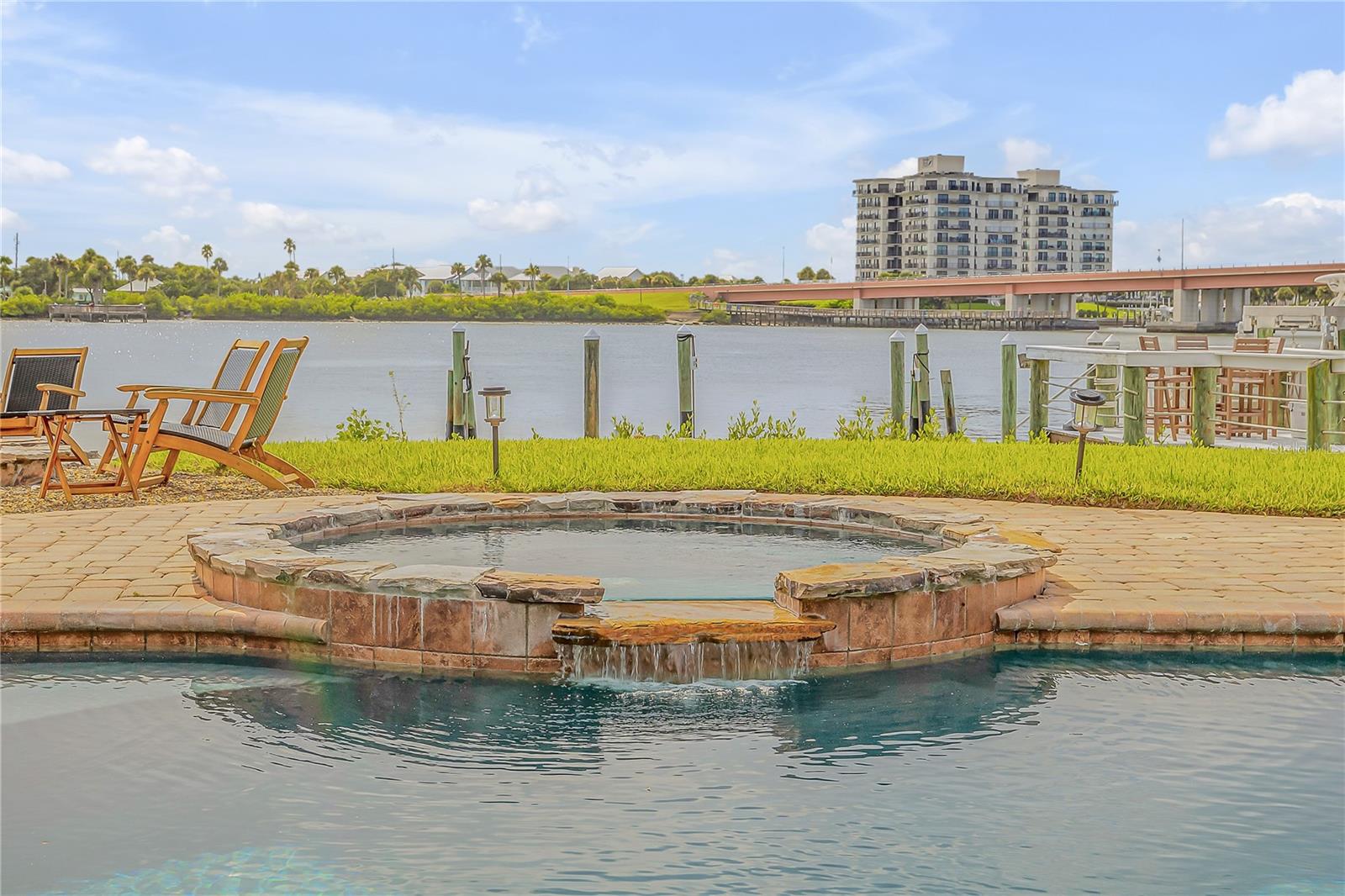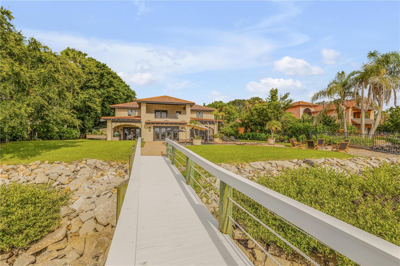 Welcome to waterfront luxury living at its finest in New Smyrna Beach! This stunning Intracoastal Tuscan style pool home boasts a 55' dock, 100' of river frontage, and unparalleled location in the coveted area of NSB’s North Beach. An entertainer’s delight and boater’s paradise, this home boasts an impressive deep water dock, directly on the Intracoastal, capable of accommodating up to an 80' yacht or multiple vessels, and the convenience of electric, water, and a boat lift. Enter thru the private courtyard to over 4000 sf of living space w 4 bedrooms, 3 full baths, as well as a detached studio/mother-in-law suite w full kitchen, bedroom, and bathroom. Set on a huge 1/2-acre lot, this home's outdoor oasis features a stunning pool/spa, a cozy gas fire pit, 2 screened patios, and the most amazing sunset views over the water. Thru the gorgeous custom front doors you'll admire an open floorplan, soaring ceilings up to the 2nd story, and a large comfy family room sitting right off of the kitchen and dining room. The gourmet kitchen is a chef's dream, featuring a gas range, premium SS appliances, elegant white cabinetry, granite countertops, all enhanced by stylish breakfast bar seating. The adjacent formal dining room w french doors, offers beautiful views of the water and leads directly to 1 of the 2 large patios. The family room/Florida room features a sophisticated bar, cozy fireplace, and panoramic views of the lush backyard and river making it the ultimate entertainment space. You’ll also find a cozy office space featuring a custom wine cabinet and amazing views. Follow thru the barn doors to a private guest suite/bedroom w full bath. Upstairs, you’ll discover the elegance of exquisite wrought iron railings, French doors, and 3 additional bedrooms. The master retreat features a newly renovated bath w classic clawfoot tub, stone vanity, and expansive tile work. A versatile bonus room or gym includes a custom wood sauna and leads to one of the most prized features of this home - the spacious, inviting balcony adorned w gas fire lamps and absolutely stunning sunset views over the ICW. You'll also find 2 additional bedrooms—1 w a private balcony overlooking the front courtyard and the other with serene water views. Other notable features include a large inside utility room, commercial-grade LVP flooring, a whole-house generator, and 2 recently upgraded HVAC systems. The outdoor space is a true sanctuary featuring 2 separate pavered patios w automatic roll down screens, stunning tongue-and-groove ceilings, an exceptional outdoor kitchen equipped w a grill and a Green Egg, and seamlessly transition to the resort-like pool area. The pool itself showcases a Pebble Tec bottom, soothing spa, tanning deck, and built-in table w seating and an umbrella, creating an idyllic setting for relaxation and entertaining. The detached studio apartment, ideal for guests or in-laws, features a chic kitchen w coastal blue cabinetry, LVP flooring, full bath, and sliding doors leading to a charming pavered porch w water views. Located just steps away from Flagler Ave, you'll find yourself immersed in the vibrant beachside scene. Whether you're seeking a boaters dream home or the perfect river front vacation home, this waterfront haven is not just a house; it's a lifestyle.
