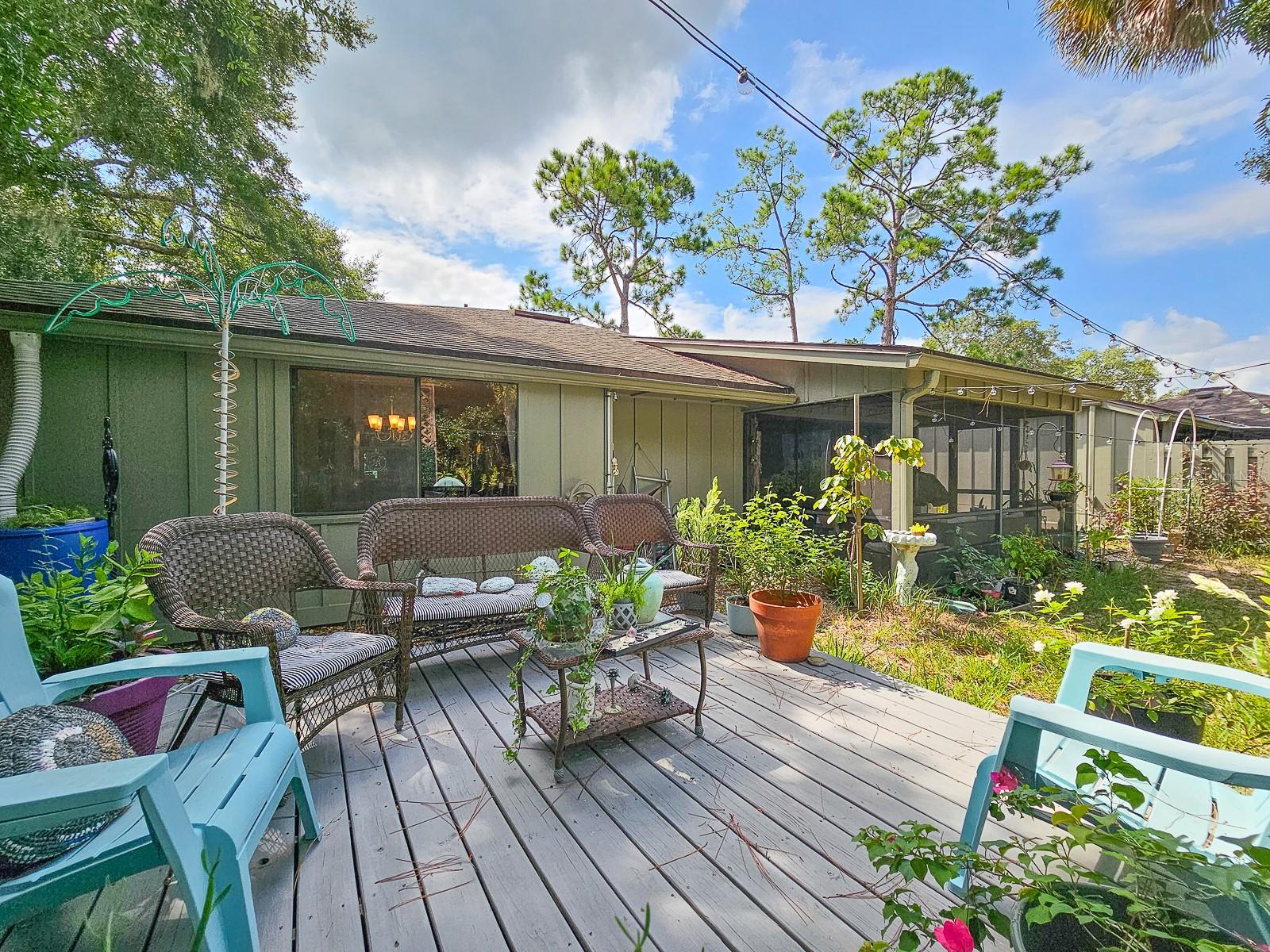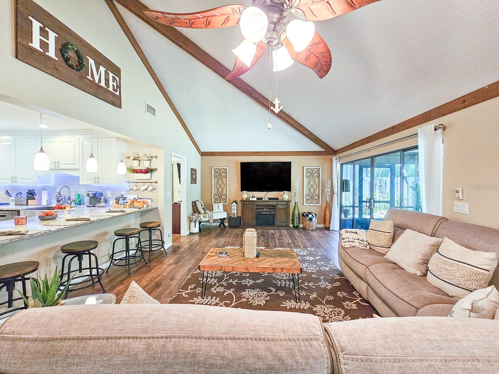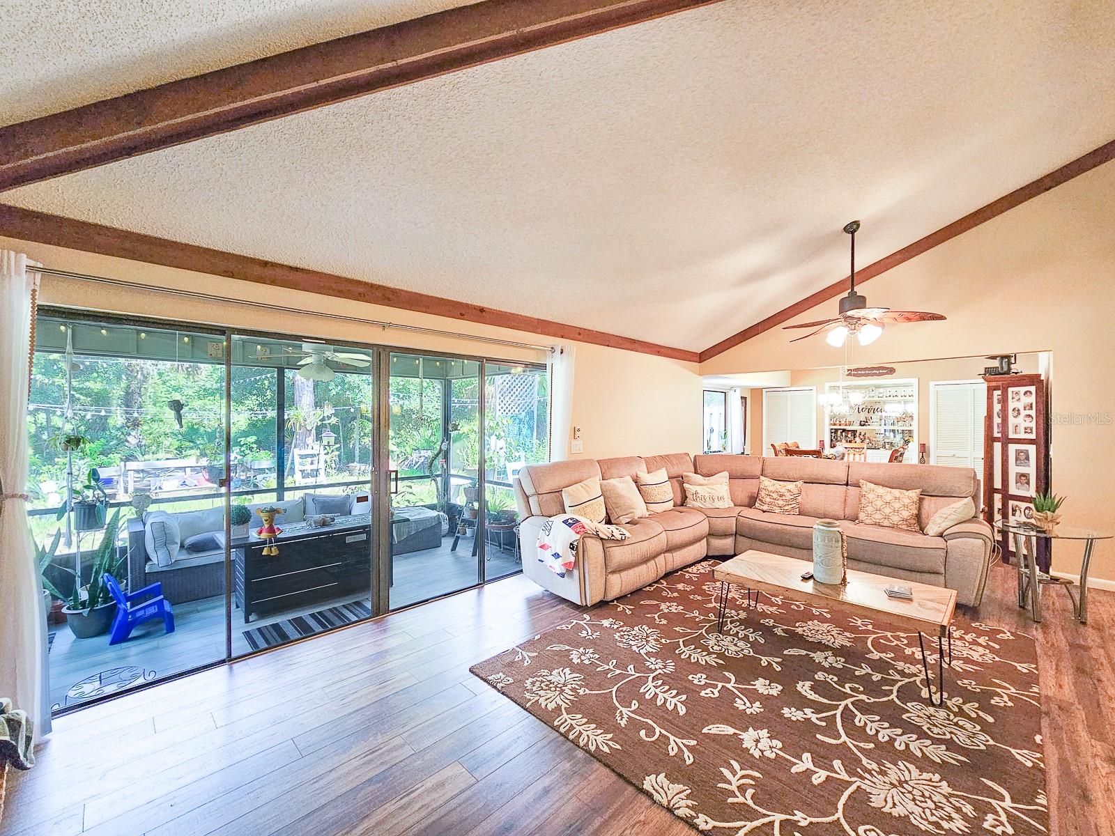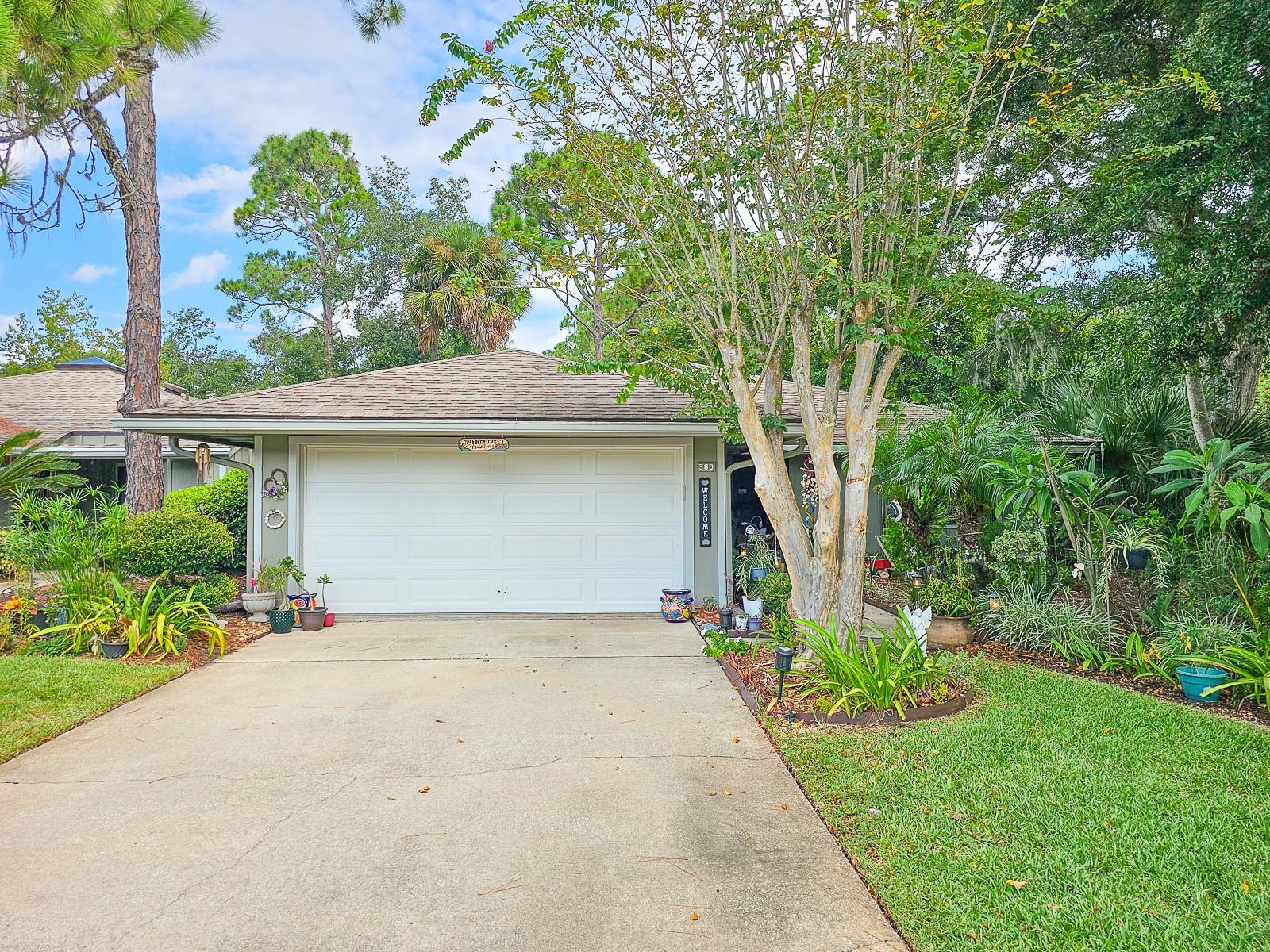 PRICE REDUCED! Owner is Motivated! Beautiful home in Sugar Mill Country Club, a private gated community. Updated, well maintained home in desirable Brae Burn. Luxury wood flooring throughout. Open floor plan with glass sliders from living room to Florida room. Florida room fully screened, opens to backyard with beautiful tropical garden, wood deck, outdoor shower and rain catchment barrel for watering plants. Kitchen updated 2019 with granite countertops, soft close wood cabinets, gas stove with griddle, farm sink, breakfast bar, pantry, recessed lighting and GE appliances. Dining room was Third Bedroom with closets and can be easily converted back! Master bedroom with ceiling fan and master bath with ceramic tile flooring, ceramic tile shower stall, Corian vanity and skylight. Second bedroom perfect for guests or office. Second bath has ceramic tile flooring, ceramic tile shower stall and Corian vanity. Attached garage with ceiling fan and AC. New roof in 2016, AC 2022/2018, water heater 2018 and water softener system. Brae Burn community enjoys three pools, pool two is heated for winter enjoyment, HOA fees also cover maintenance of front yard and sprinklers, exterior home painting every six years and roof maintenance of clearing of debris and gutters four times a year.
