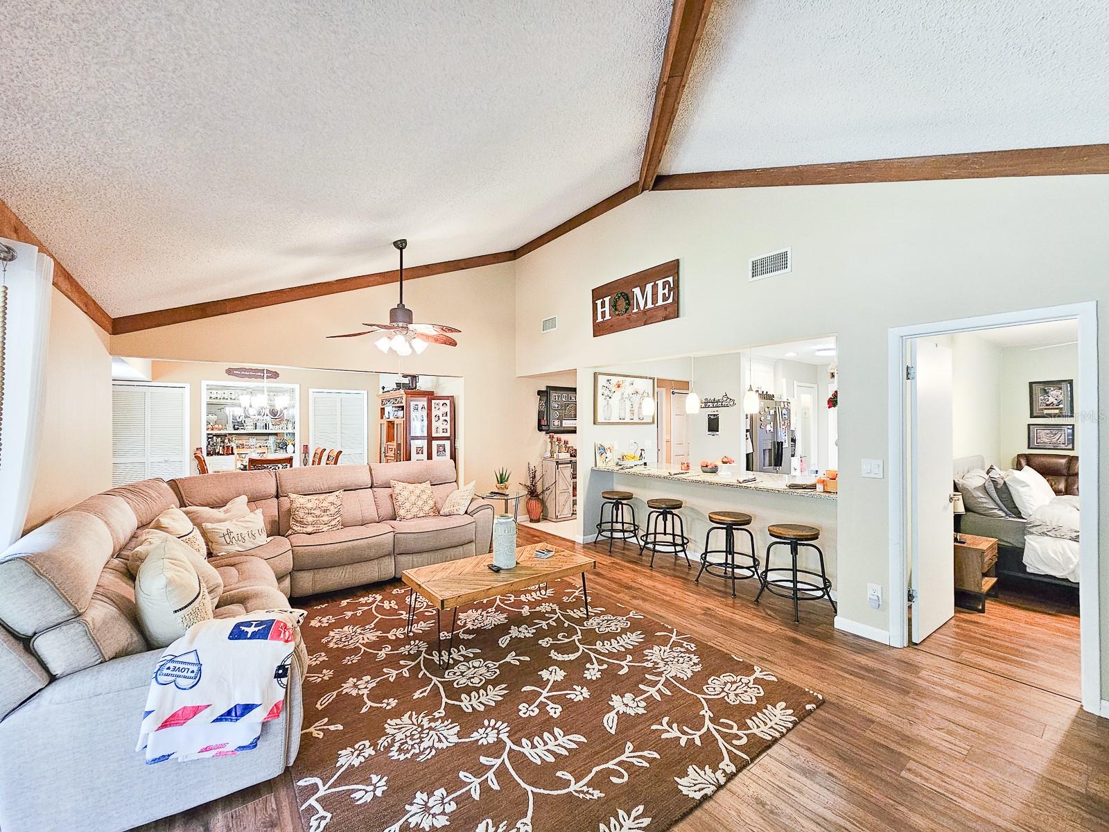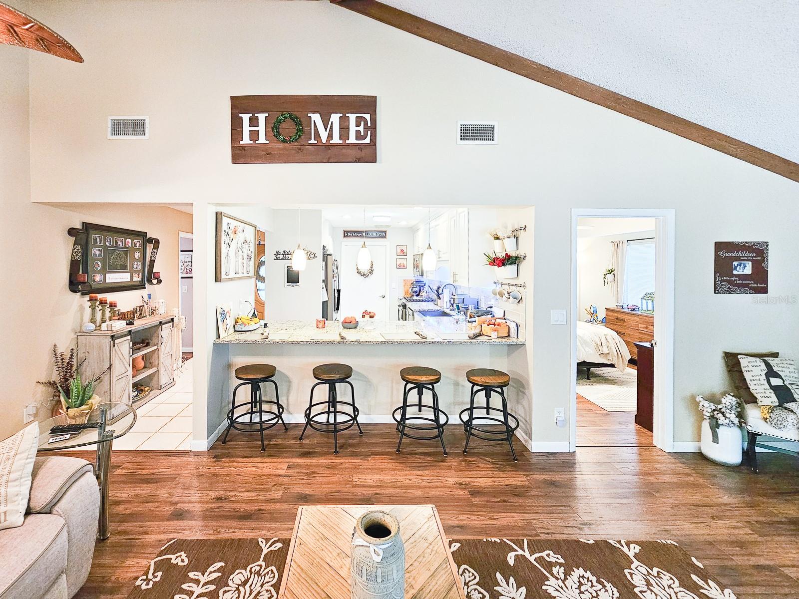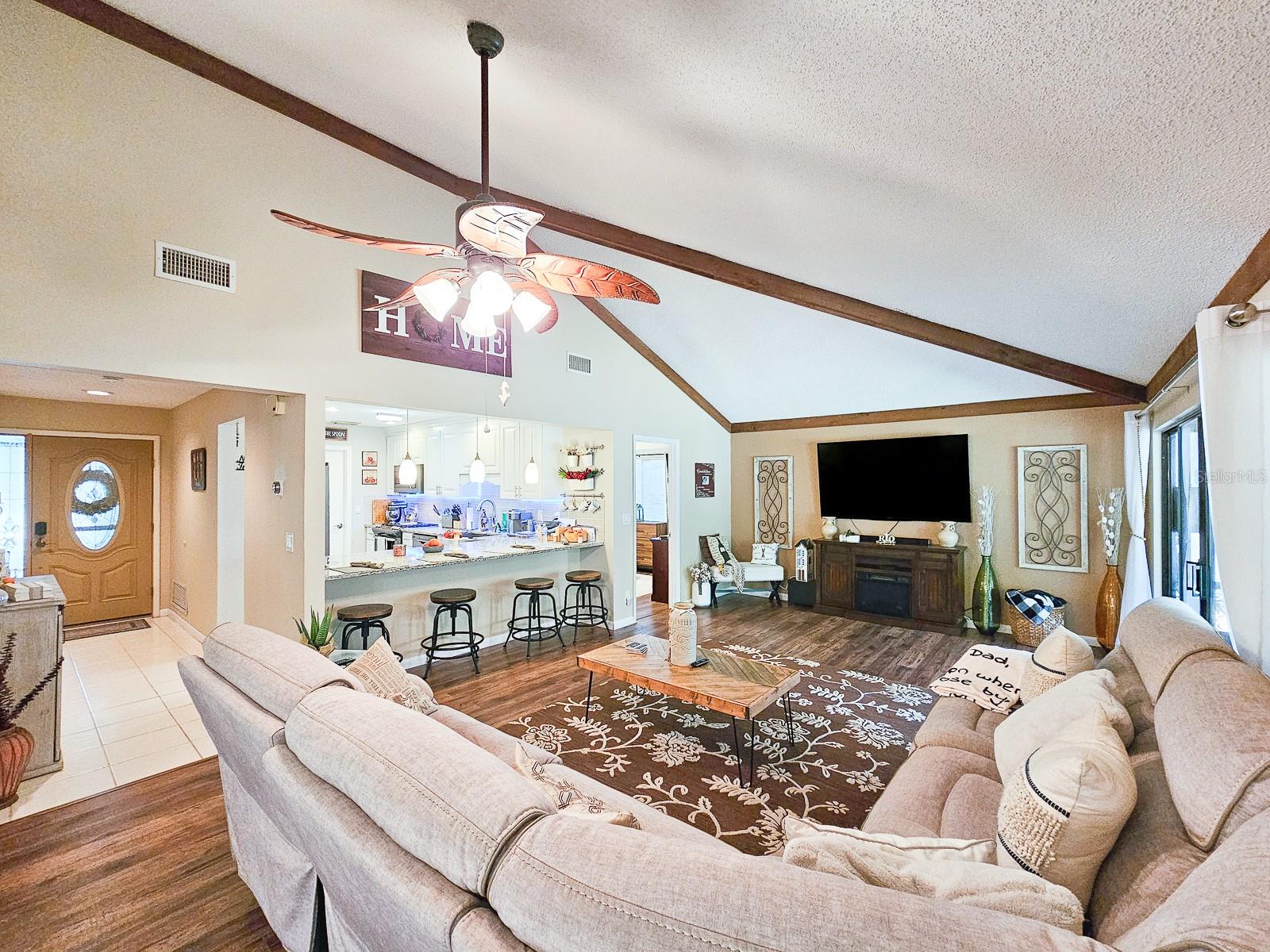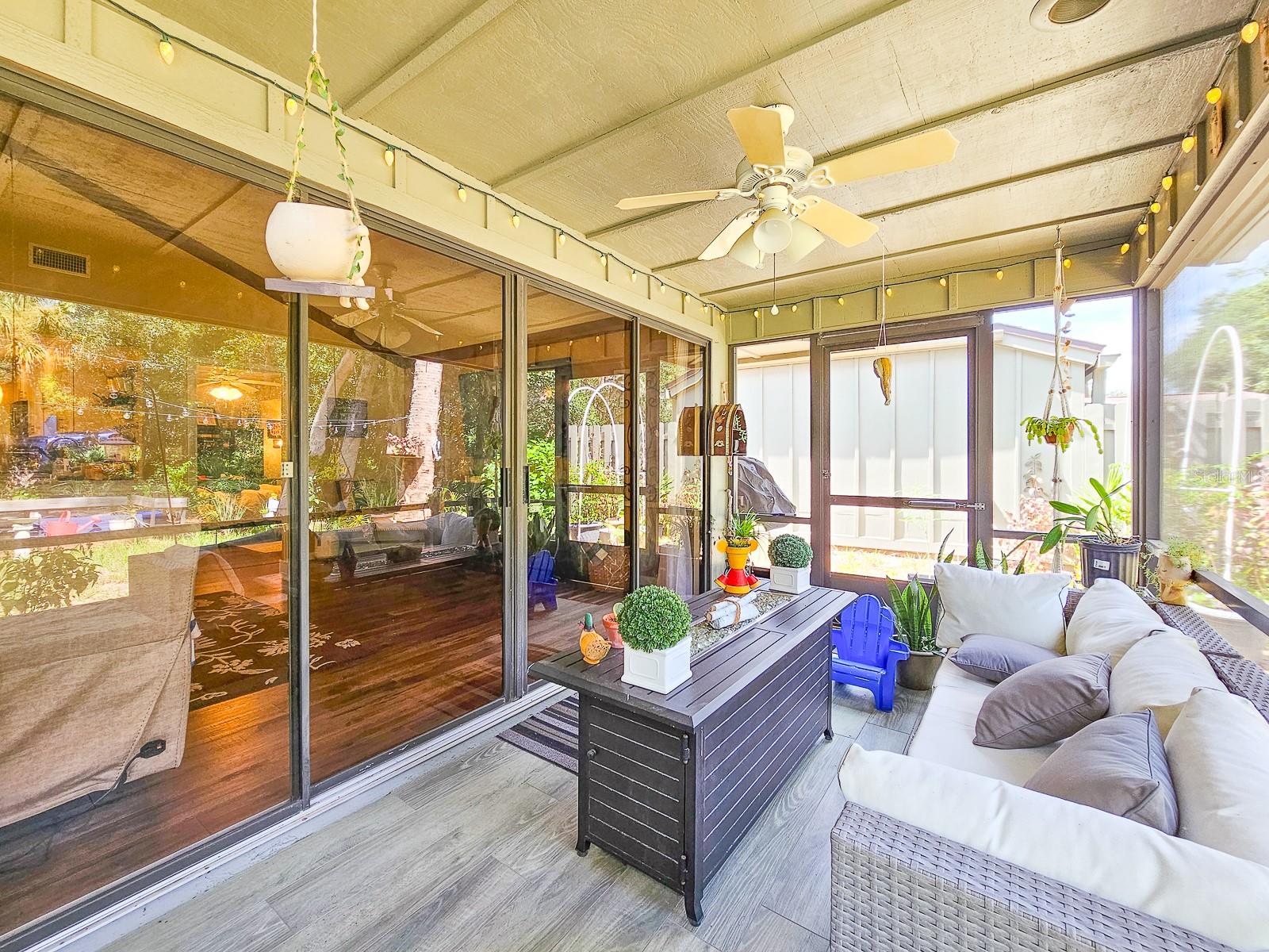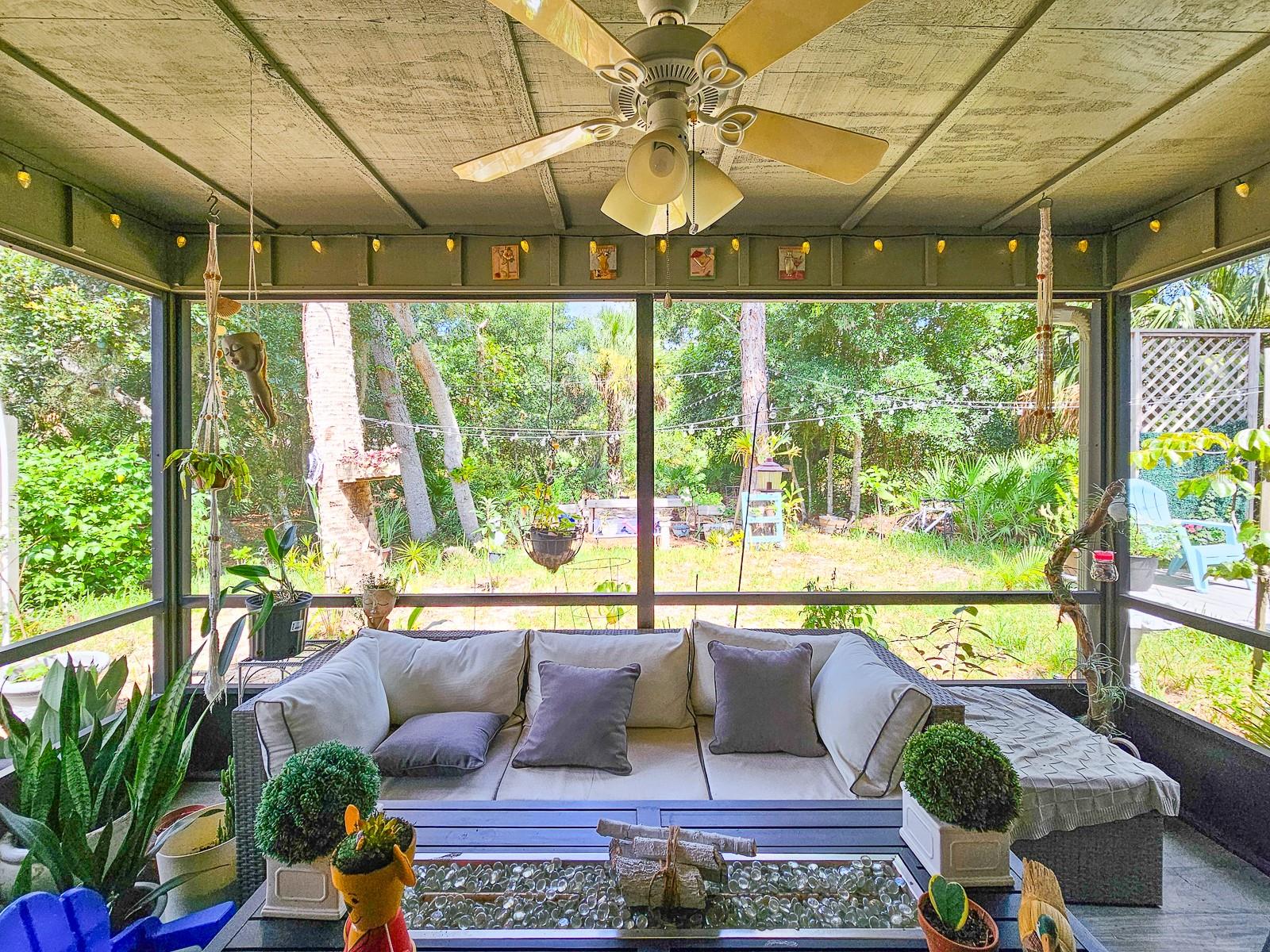 PRICE REDUCED! Owner is Motivated! Beautiful home in Sugar Mill Country Club, a private gated community. Updated, well maintained home in desirable Brae Burn. Luxury wood flooring throughout. Open floor plan with glass sliders from living room to Florida room. Florida room fully screened, opens to backyard with beautiful tropical garden, wood deck, outdoor shower and rain catchment barrel for watering plants. Kitchen updated 2019 with granite countertops, soft close wood cabinets, gas stove with griddle, farm sink, breakfast bar, pantry, recessed lighting and GE appliances. Dining room was Third Bedroom with closets and can be easily converted back! Master bedroom with ceiling fan and master bath with ceramic tile flooring, ceramic tile shower stall, Corian vanity and skylight. Second bedroom perfect for guests or office. Second bath has ceramic tile flooring, ceramic tile shower stall and Corian vanity. Attached garage with ceiling fan and AC. New roof in 2016, AC 2022/2018, water heater 2018 and water softener system. Brae Burn community enjoys three pools, pool two is heated for winter enjoyment, HOA fees also cover maintenance of front yard and sprinklers, exterior home painting every six years and roof maintenance of clearing of debris and gutters four times a year.