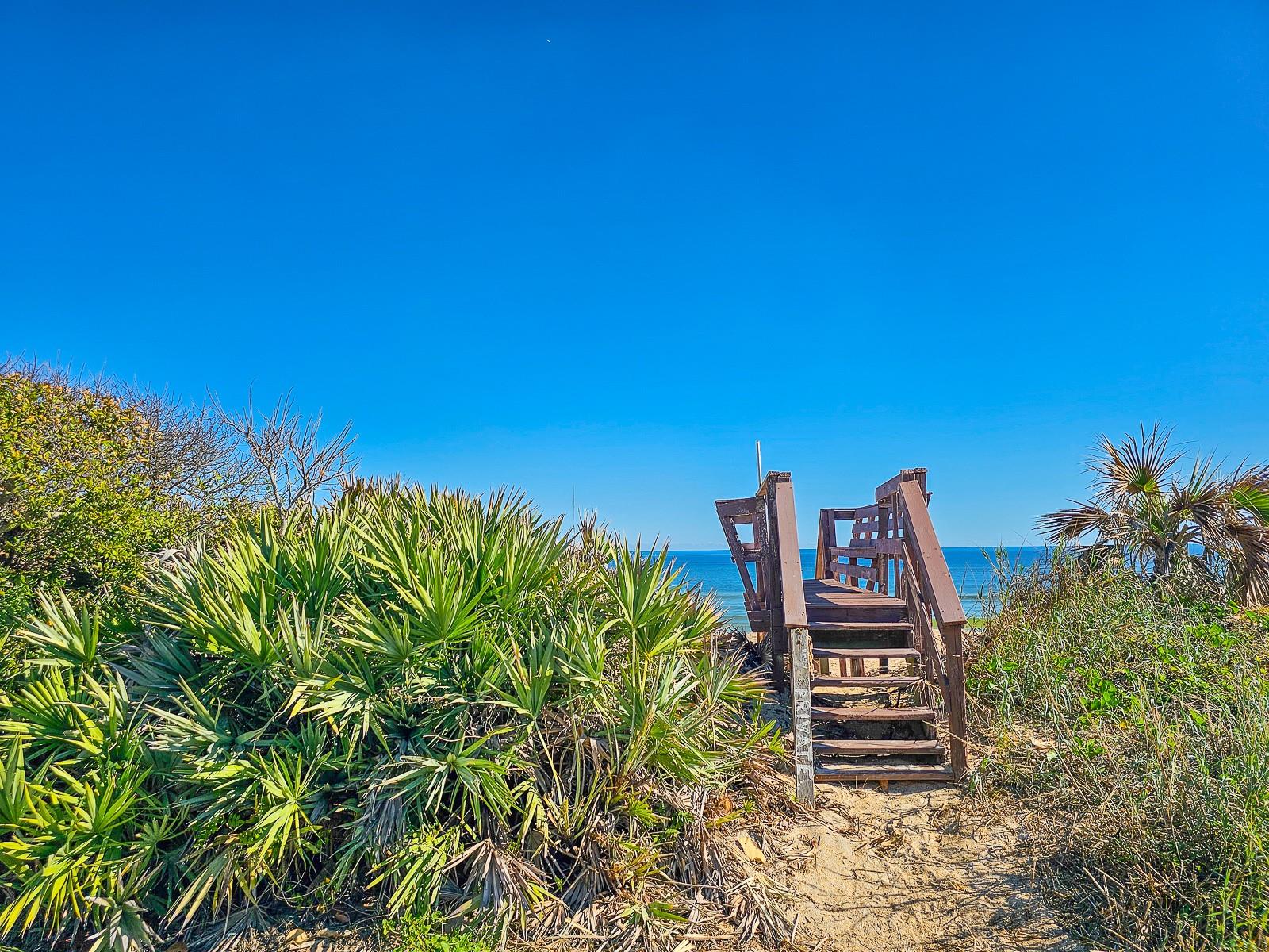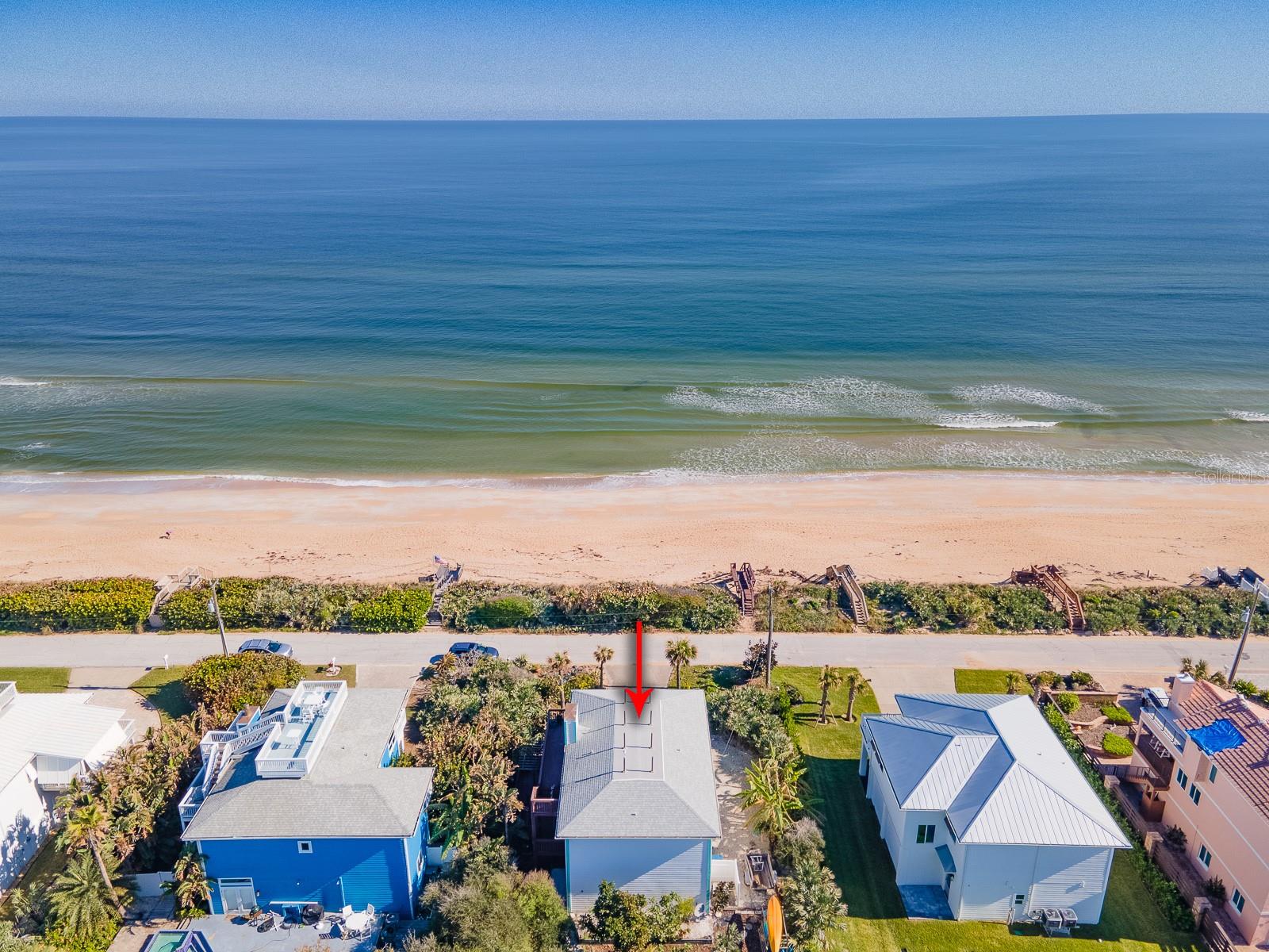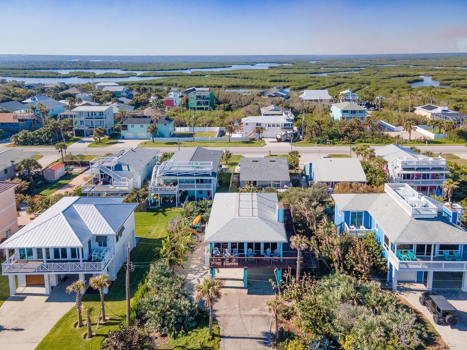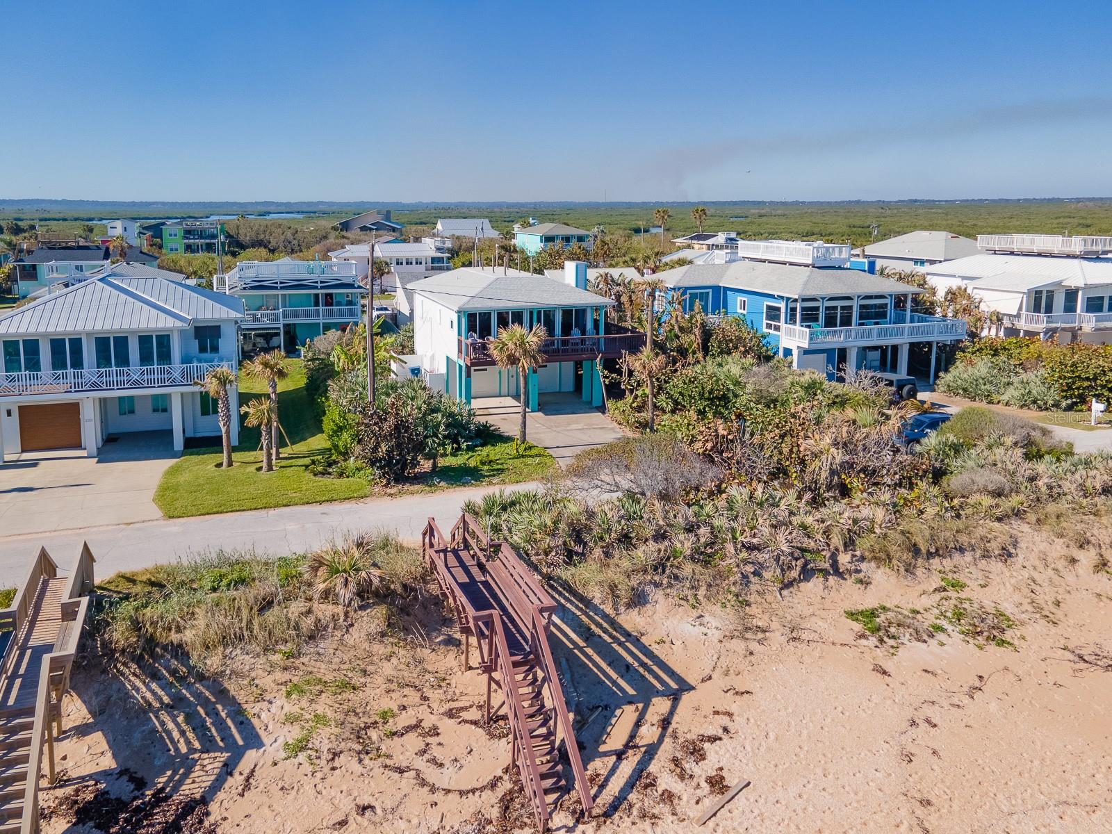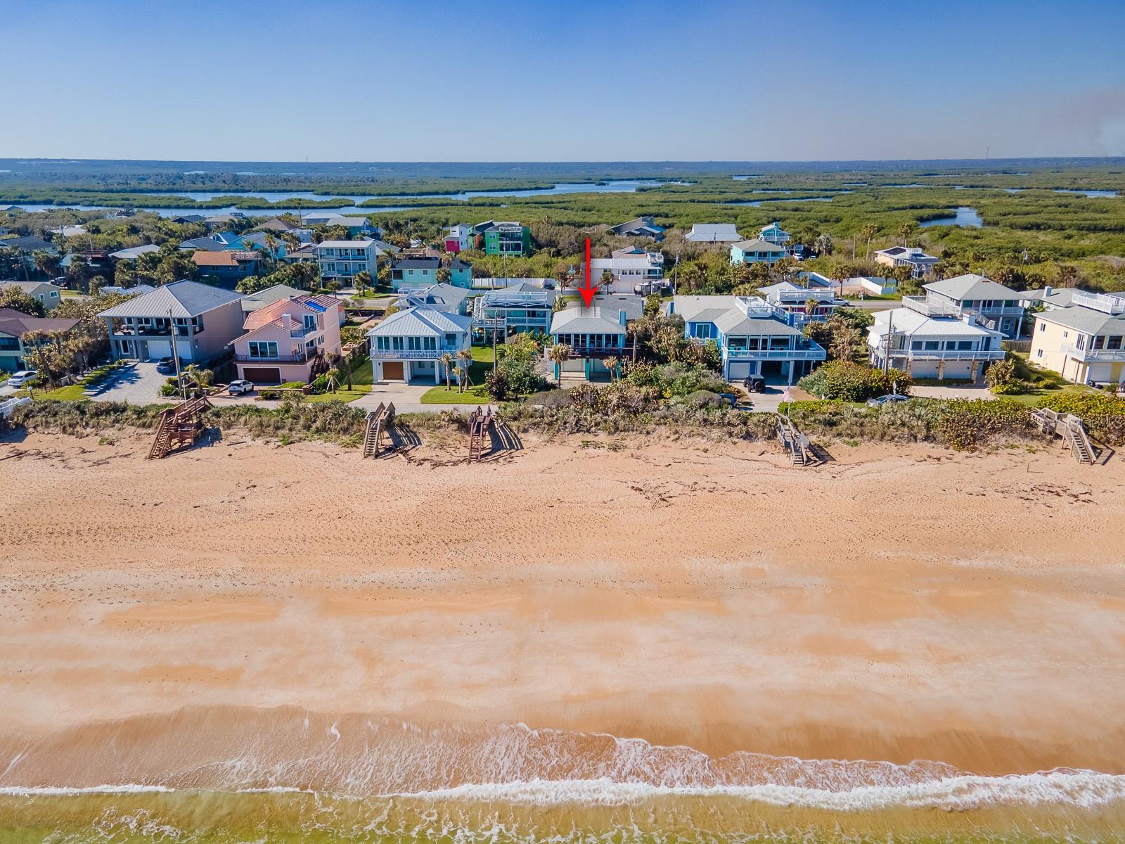 Rare opportunity to own 3 lot oceanfront home! Property is high and dry, one of highest dune elevations in New Smyrna Beach. Robust vegetation anchors the dune, making it extremely protected. The private deeded dune walkover is in the coveted, secluded beach section of Bethune Beach! Home has amazing ocean views from the large wrap-around deck along with 2 bedrooms and 2 baths and multiple built-ins. Two car garage has lift and will accommodate 3 vehicles. New roof in 2022. New HVAC in 2023, with Seer rating of 16.5. Whole house generator including auto transfer switch connected to three propane tanks and hurricane shutters. Outside propane connection on north side of garage to connect your grill. New 50 gallon hot water tank. Current termite bond. Outdoor shower. Plenty of parking with oversized driveway.